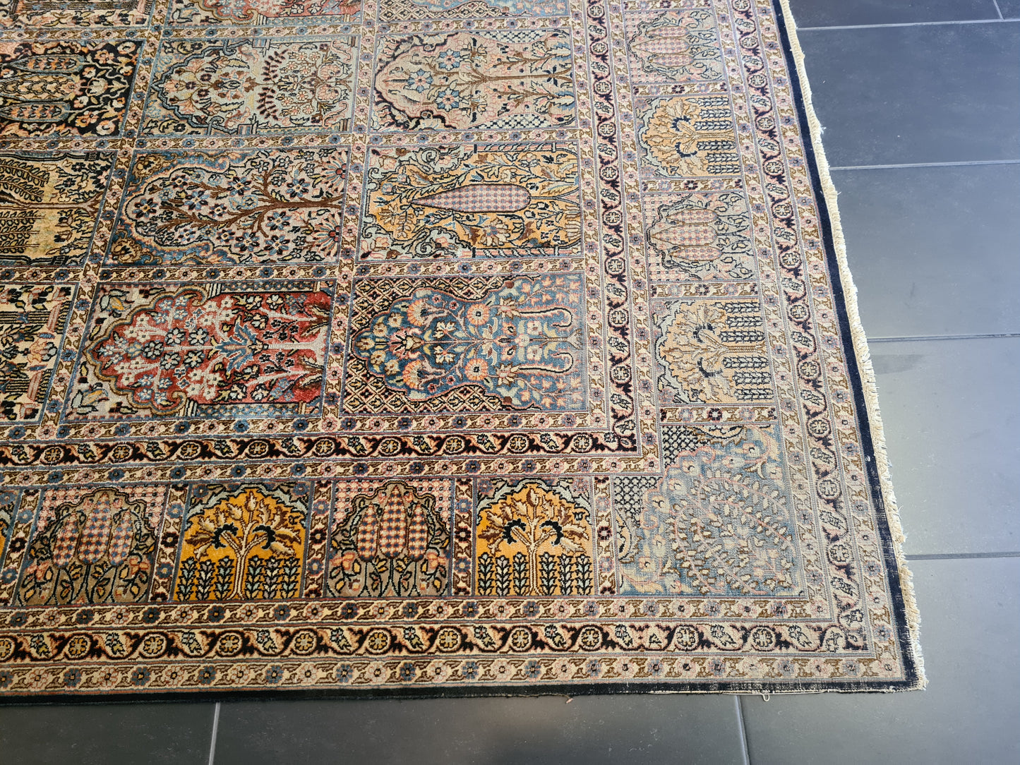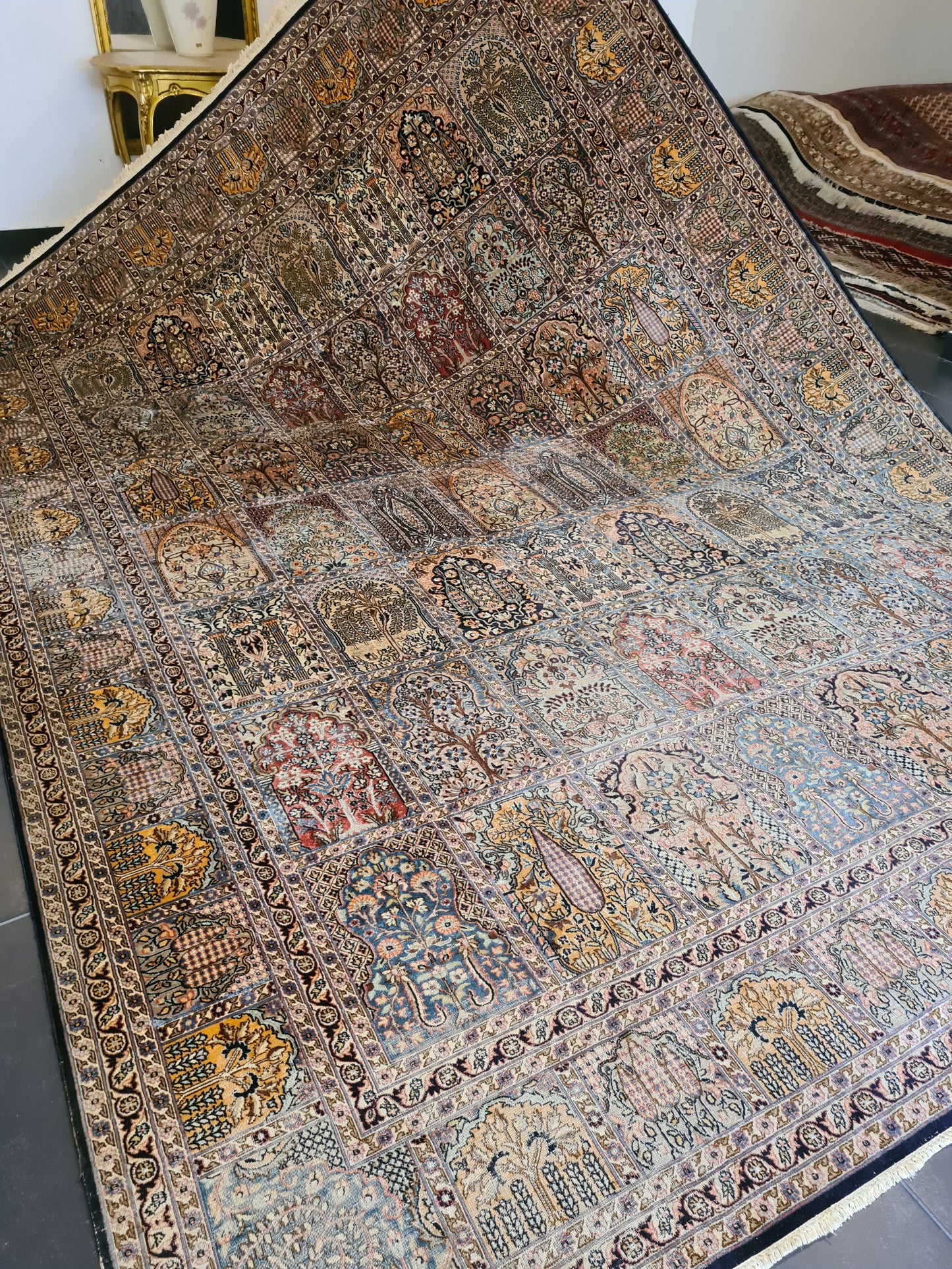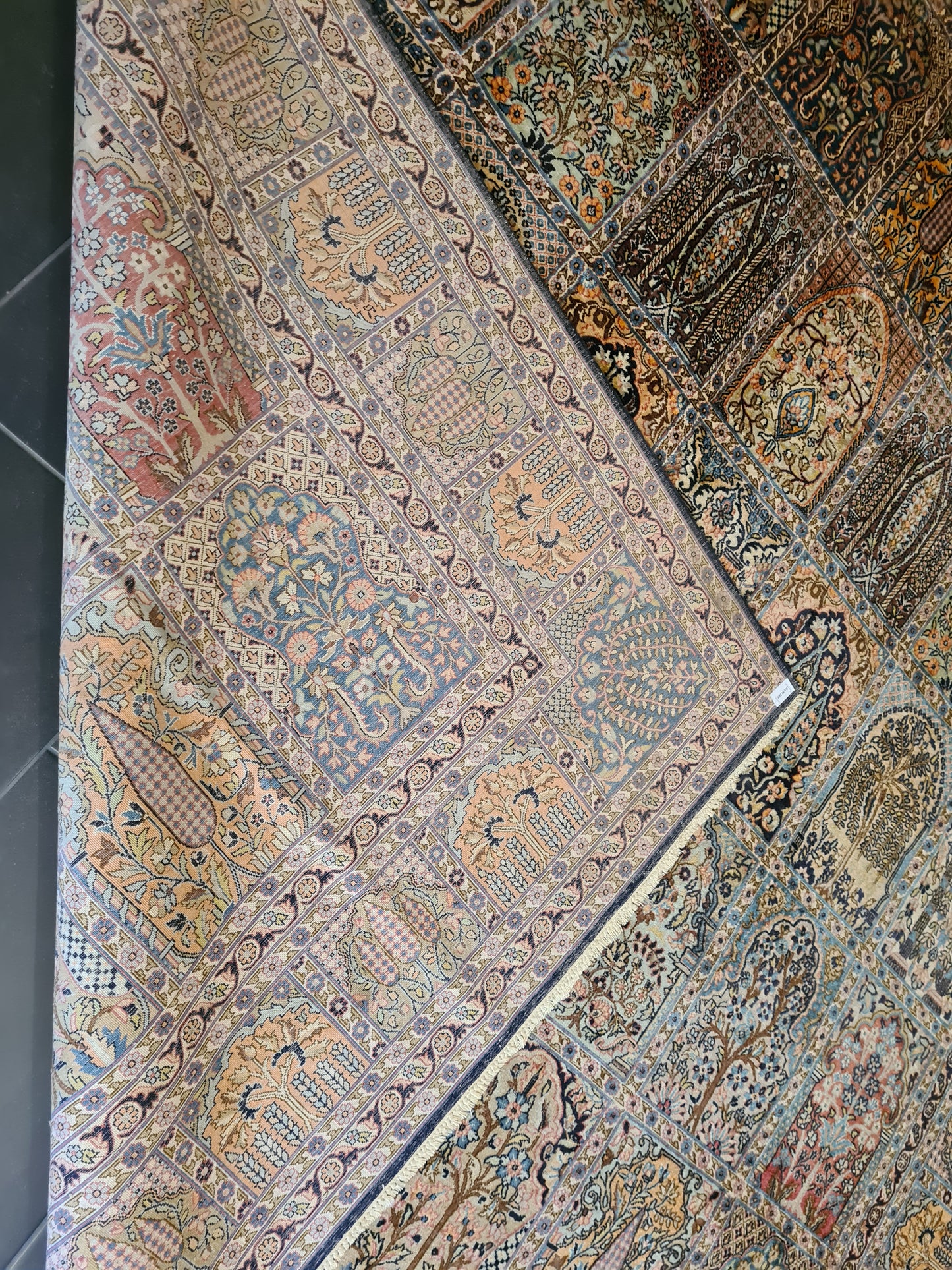 Erleben Sie Luxus und Eleganz mit diesem prächtigen handgeknüpften Seidenteppich aus Kashmir. Der Teppich besticht durch sein einzigartiges Feldergartenmuster und die Verwendung feinster Seide auf Wolle, handgefertigt mit einer außergewöhnlichen Knotendichte von 350.000 Knoten pro Quadratmeter.