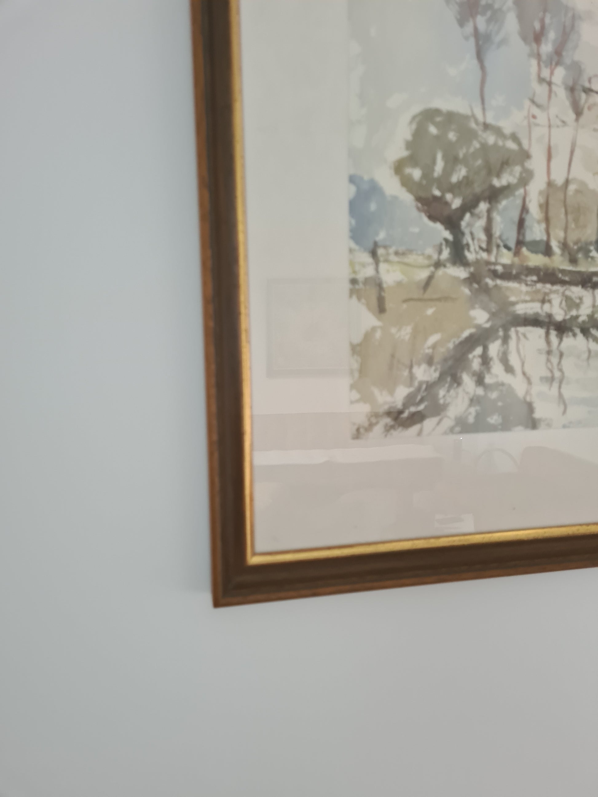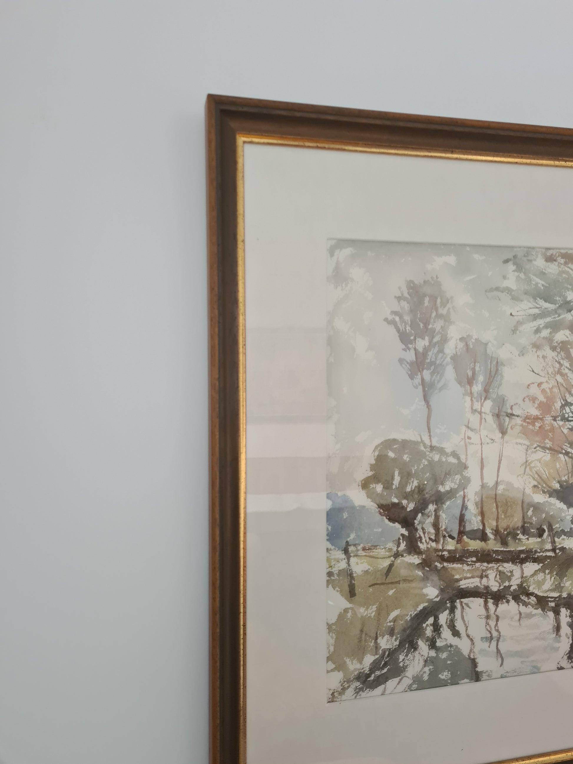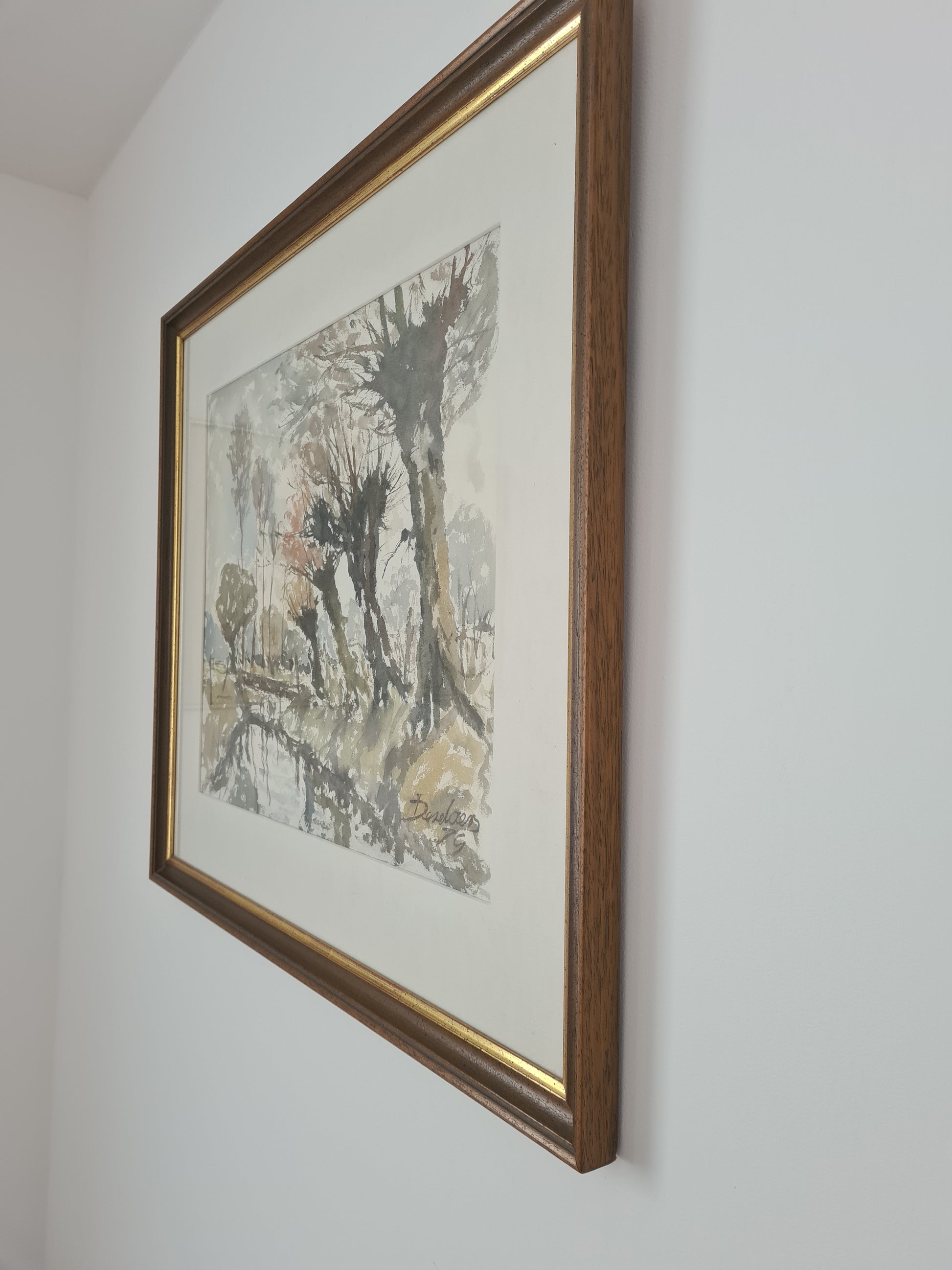 zum Verkauf steht ein stimmungsvolles Aquarellgemälde einer Waldlandschaft, ausgeführt in zarten Farbtönen mit lebendiger Lichtstimmung. Die Darstellung zeigt eine ruhige Szene inmitten der Natur mit Bäumen, Wegen und atmosphärischem Hintergrund. Das Werk ist signiert (Signatur unten sichtbar) und stammt vermutlich aus der zweiten Hälfte des 20. Jahrhunderts.