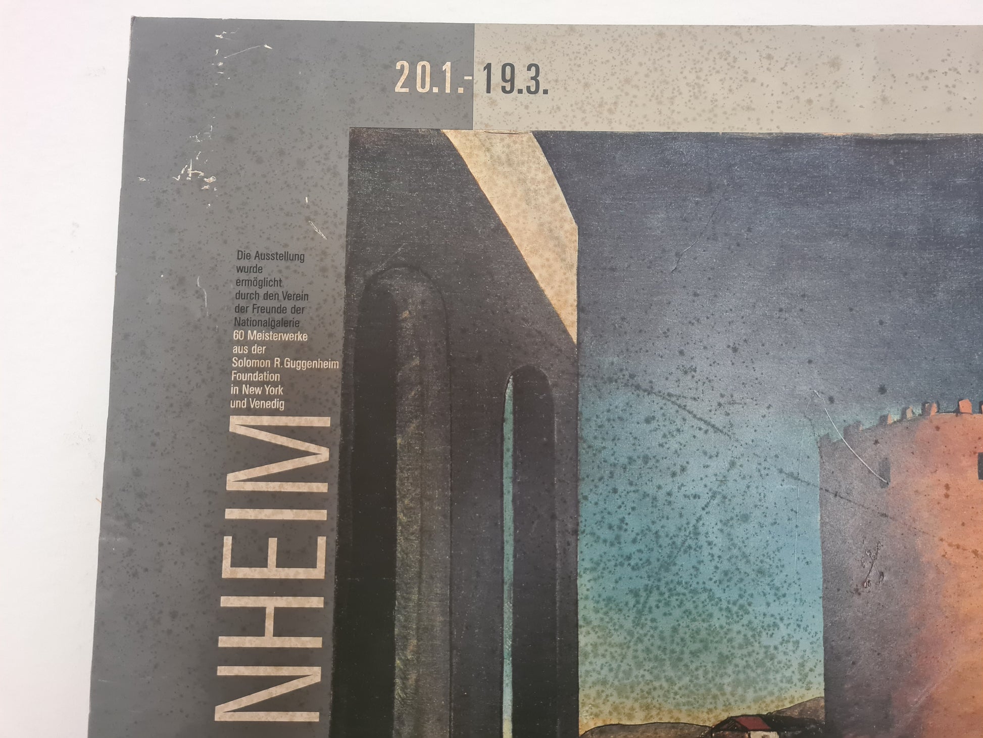 Originales Ausstellungsplakat zur Guggenheim-Ausstellung in der Nationalgalerie Berlin. Gezeigt wurde eine Auswahl von Werken aus der Solomon R. Guggenheim Foundation, New York. Das zentrale Bildmotiv stammt von Giorgio de Chirico, einem bedeutenden Vertreter der Pittura Metafisica. Die Ausstellung fand vom 20. Januar bis 19. März statt (Jahreszahl nicht angegeben, vermutlich 1990er Jahre).