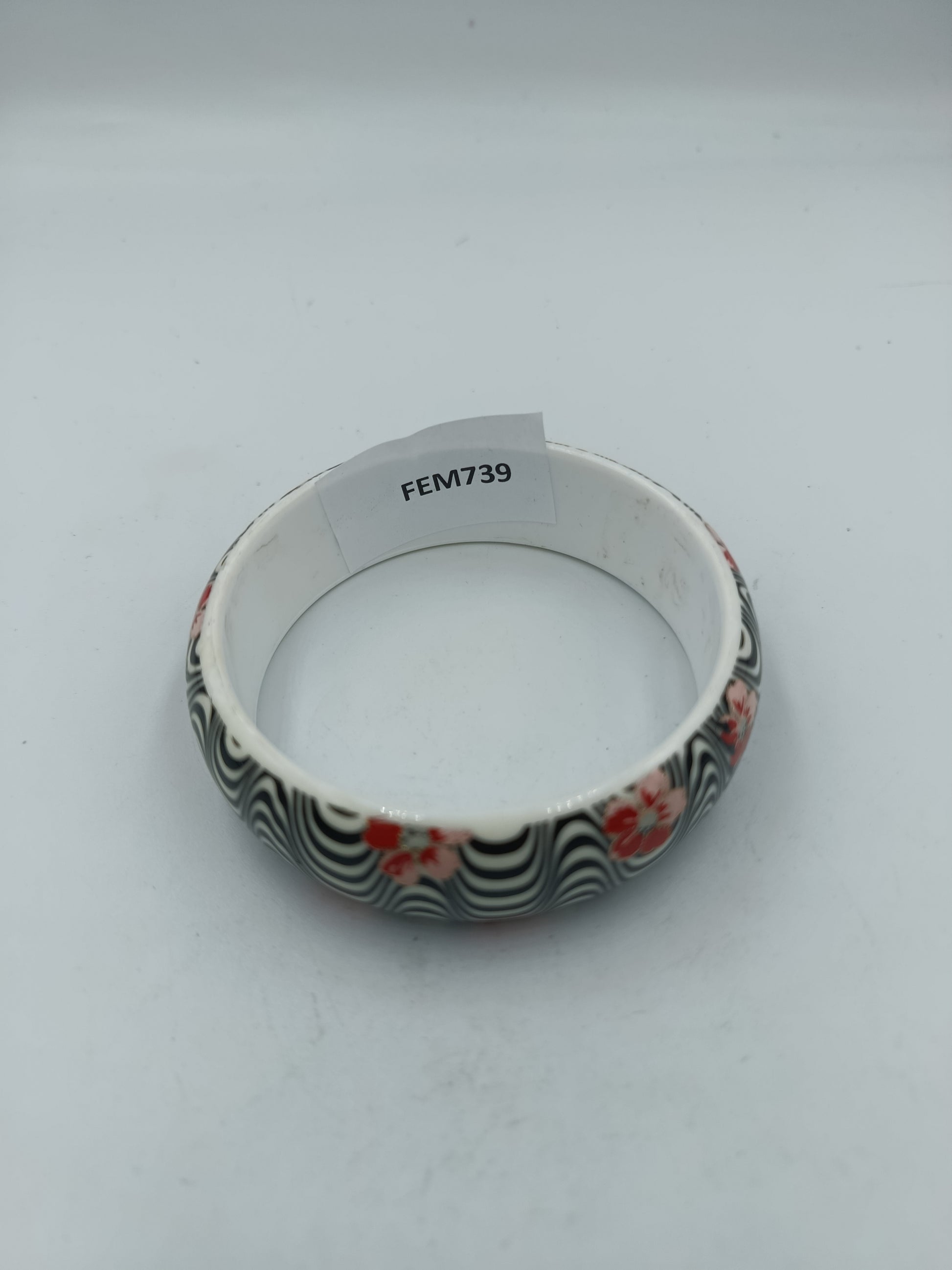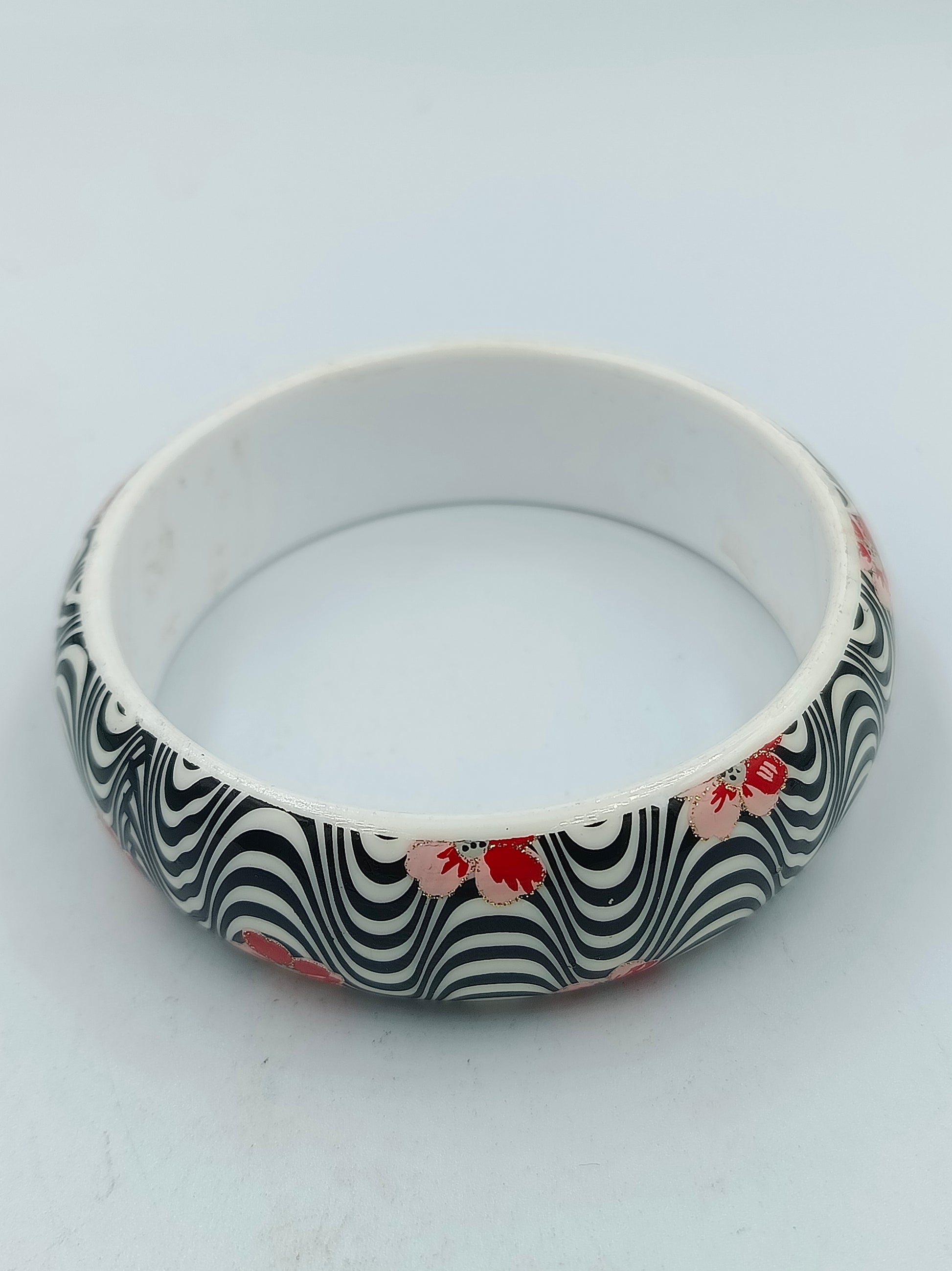 Stylischer Vintage-Kunststoffarmreif im auffälligen Retro-Muster. Die schwarz-weißen Wellenlinien werden durch zarte rote und rosa Blüten ergänzt – ein echter Hingucker für jedes Outfit!