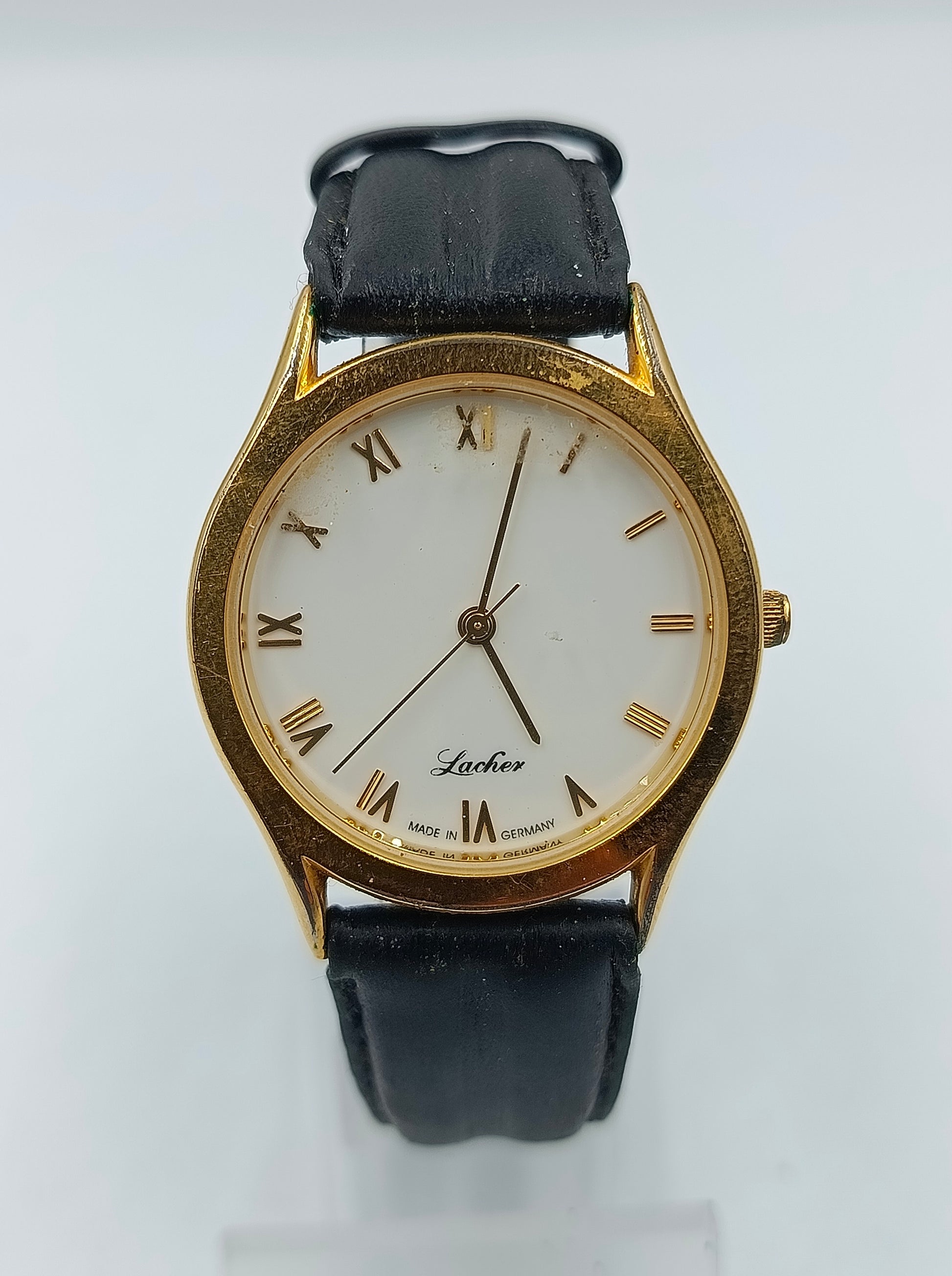 Stilvolle Lacher Armbanduhr im klassischen Design mit goldfarbenem Gehäuse und römischen Ziffern. Das schlichte weiße Zifferblatt und das schwarze Lederarmband verleihen der Uhr eine elegante, zeitlose Optik – ideal für Damen oder Herren mit Sinn für Understatement.