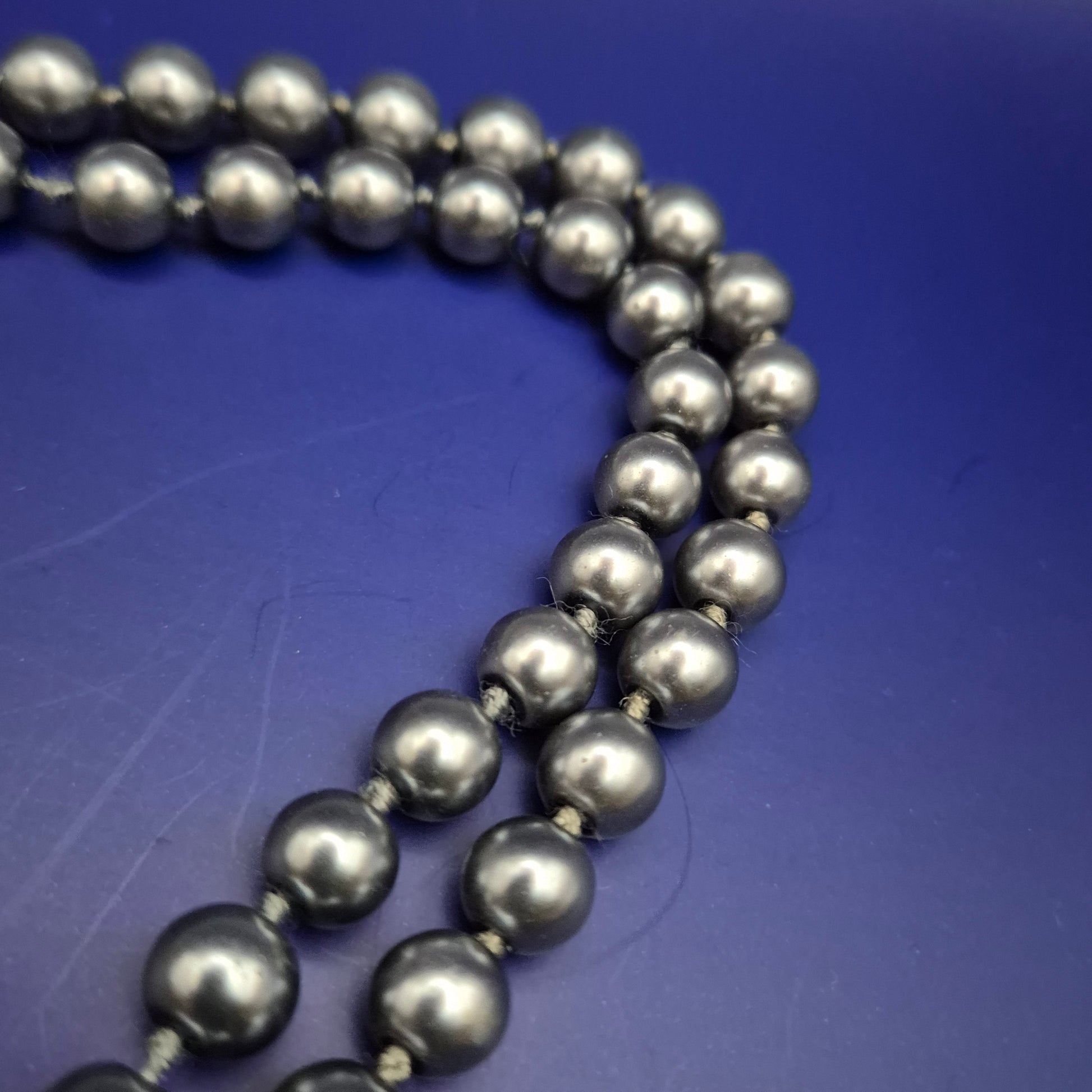 Diese lange Halskette besteht aus zwei Reihen glänzender, kleiner Hämatit-Perlen. Die Kugeln haben die charakteristische, dunkle, metallisch-graue Farbe des Hämatits und reflektieren das Licht stark. Durch die doppelte Reihe wirkt die Kette substanzieller und eleganter. Aufgrund ihrer Länge (vermutlich Opera-Länge) kann sie entweder zweifach um den Hals gelegt oder einfach als lange, elegante Kette getragen werden. Hämatit ist bekannt für seine glatte, kühle Oberfläche.
