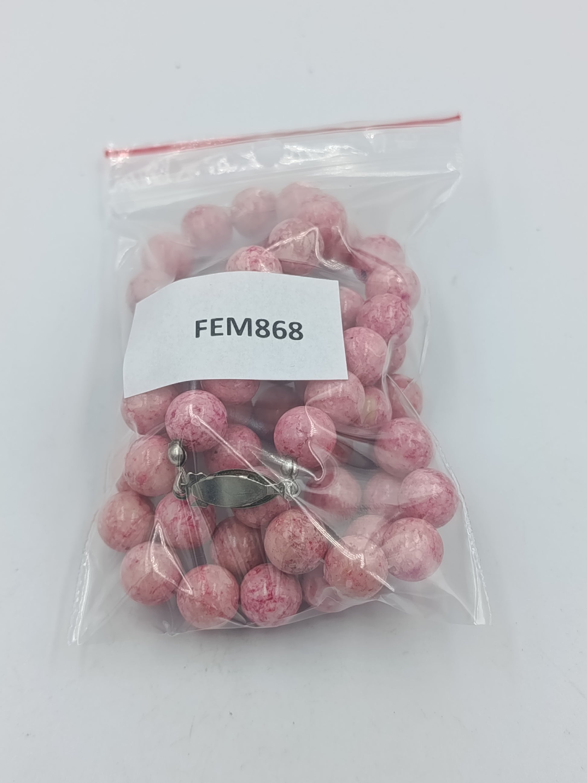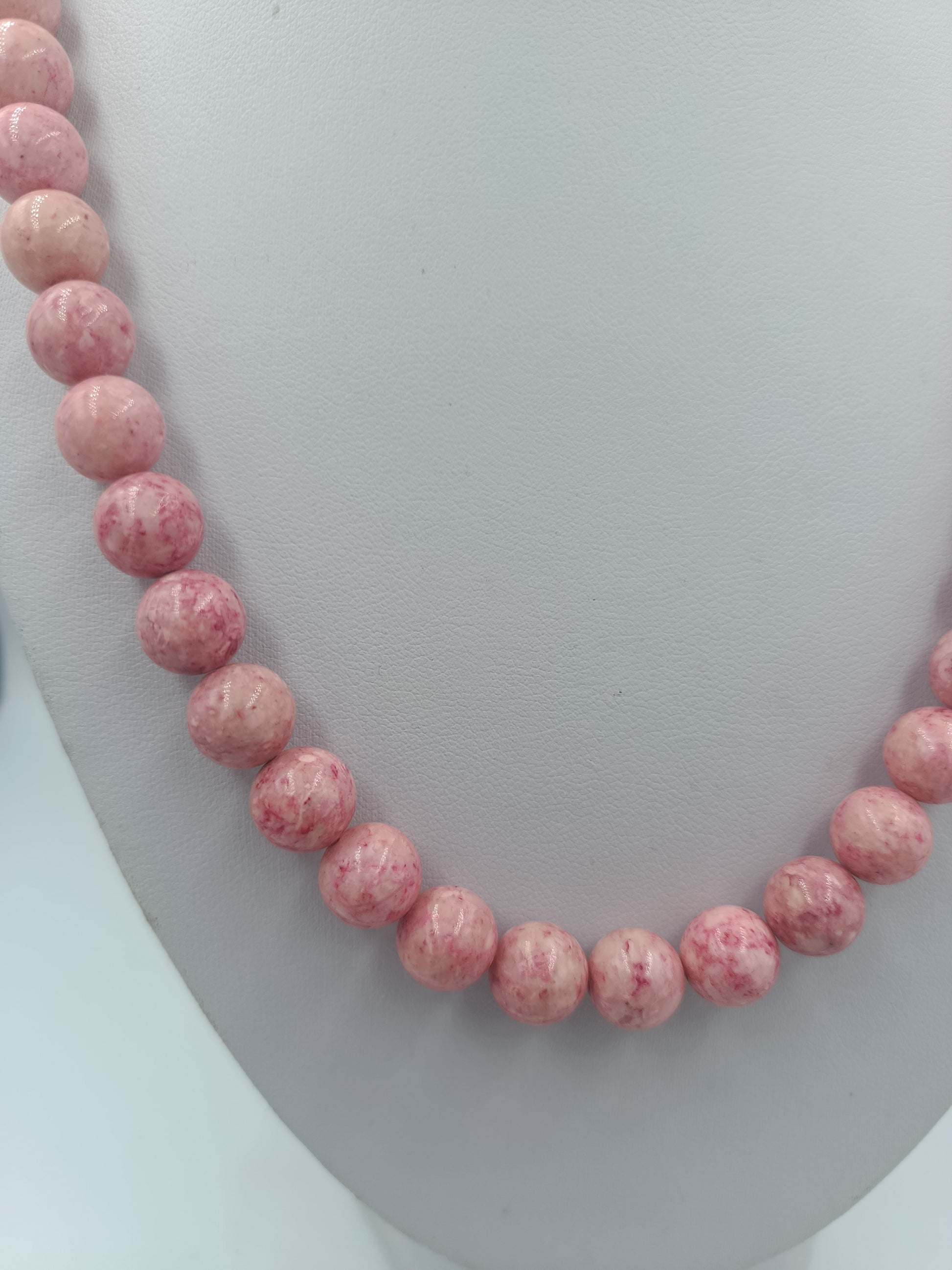 Wunderschöne Halskette aus rosafarbenen, marmorierten Rundperlen, die durch ihre natürliche Maserung und den sanften Glanz bestechen. Das klassische Design erinnert an Vintage-Schmuck und lässt sich perfekt zu hellen oder neutralen Outfits kombinieren. Mit ihrem angenehmen Gewicht liegt die Kette elegant am Hals an und sorgt für einen femininen Look.