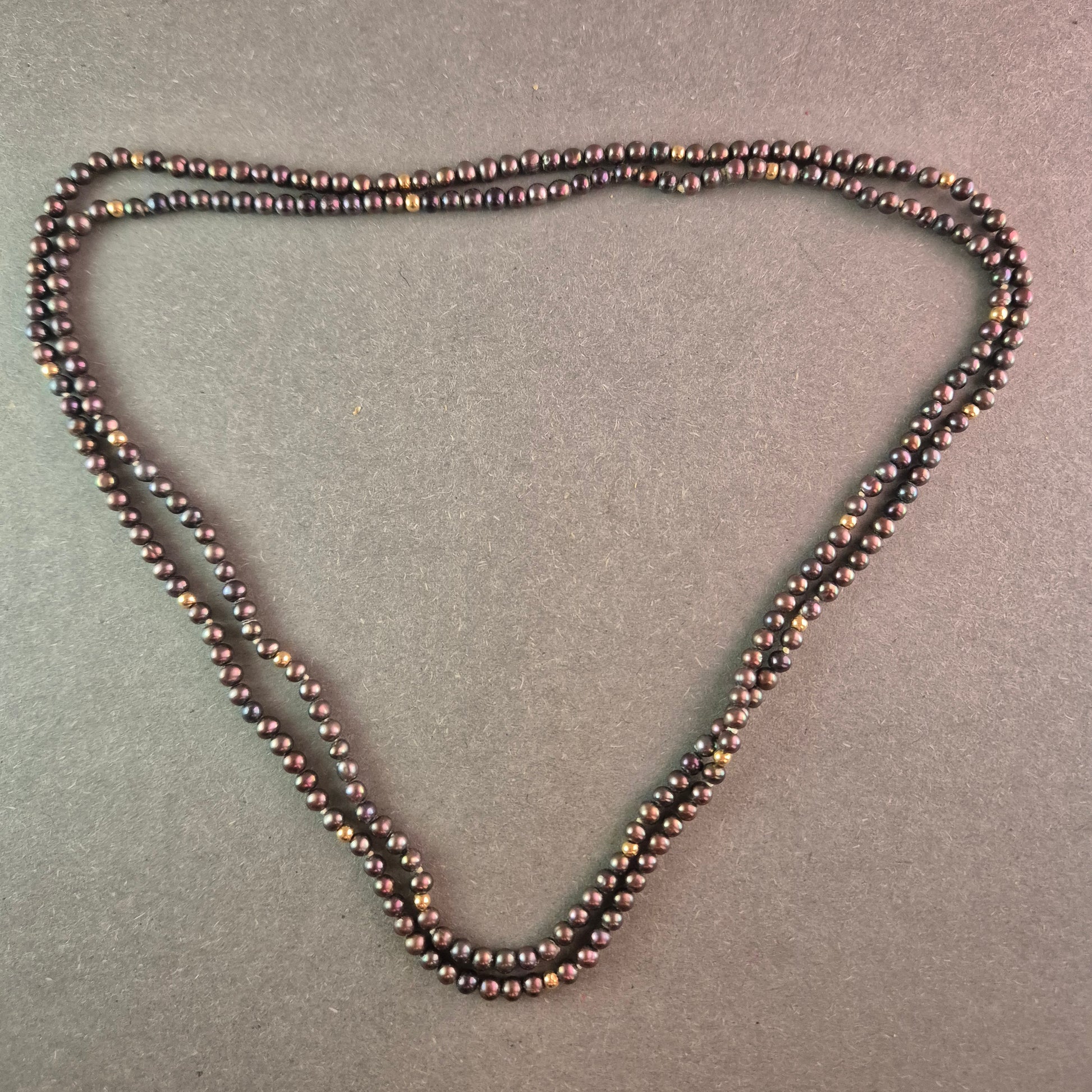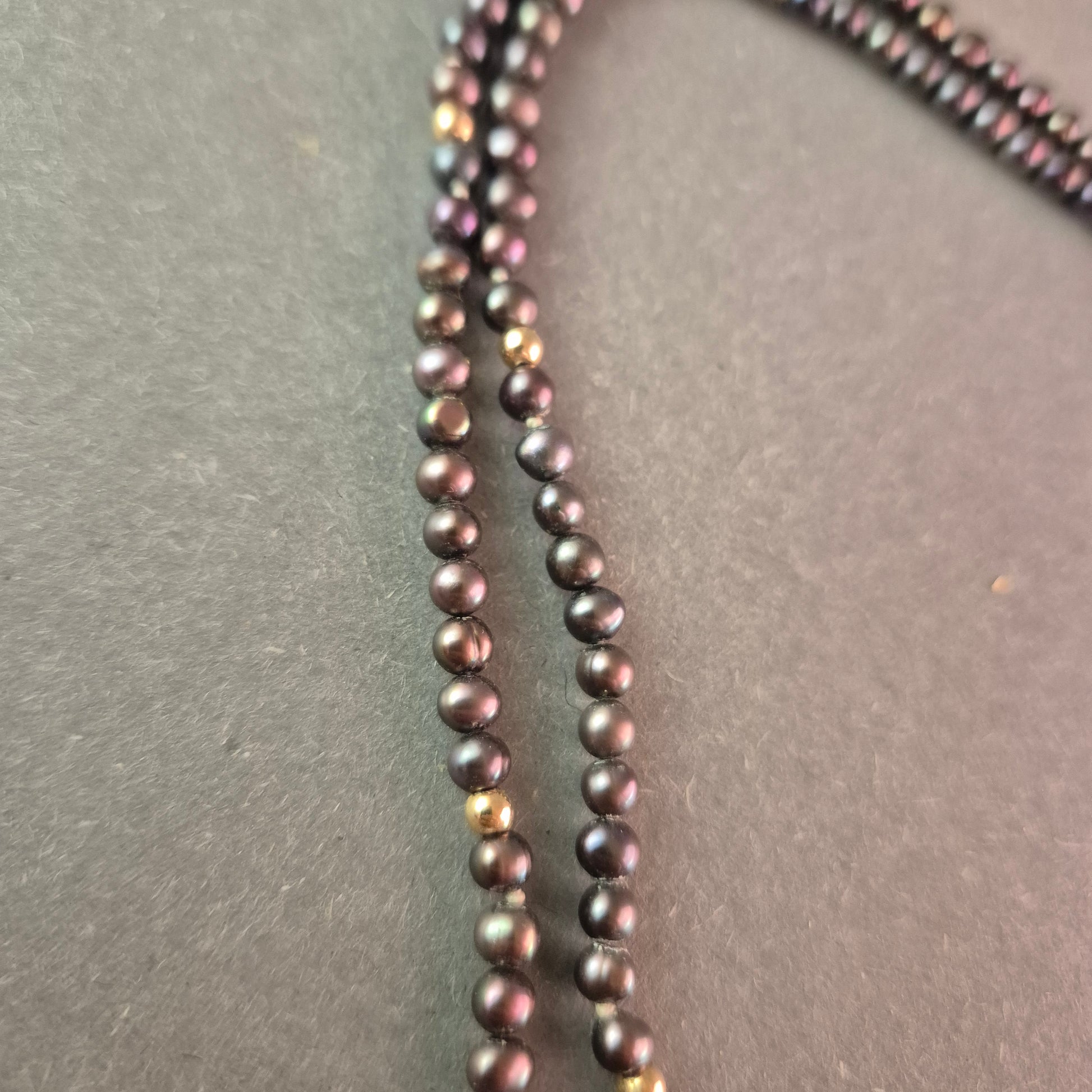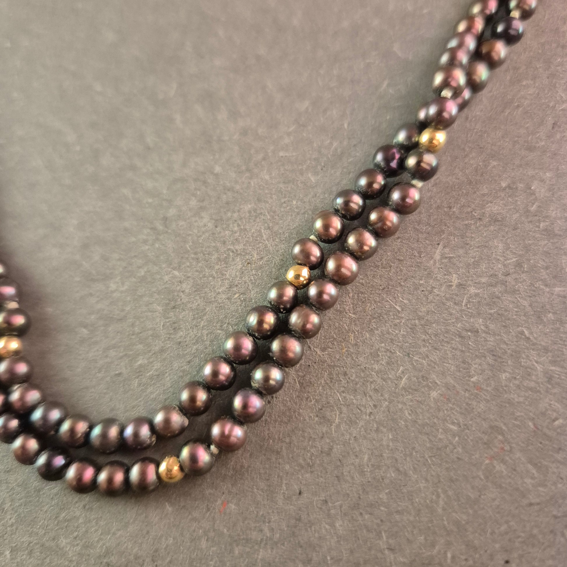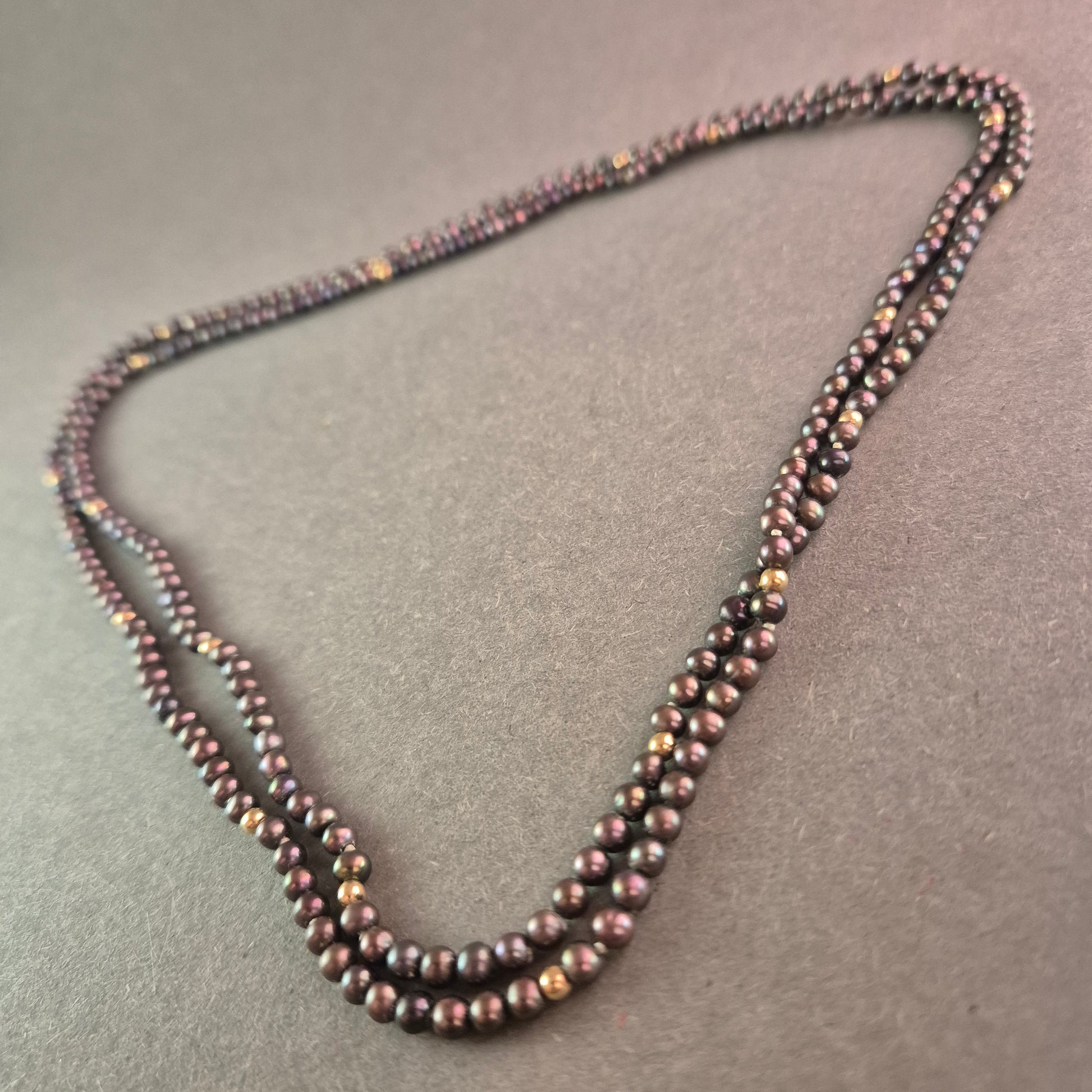Diese stilvolle, lange Perlenkette besticht durch ihre tiefschwarzen, leicht schimmernden Perlen und die edlen goldfarbenen Akzente. Das doppelte Strangdesign verleiht dem Schmuckstück eine besondere Optik und macht es zu einem perfekten Begleiter für elegante Anlässe oder als stilvolles Accessoire für den Alltag.