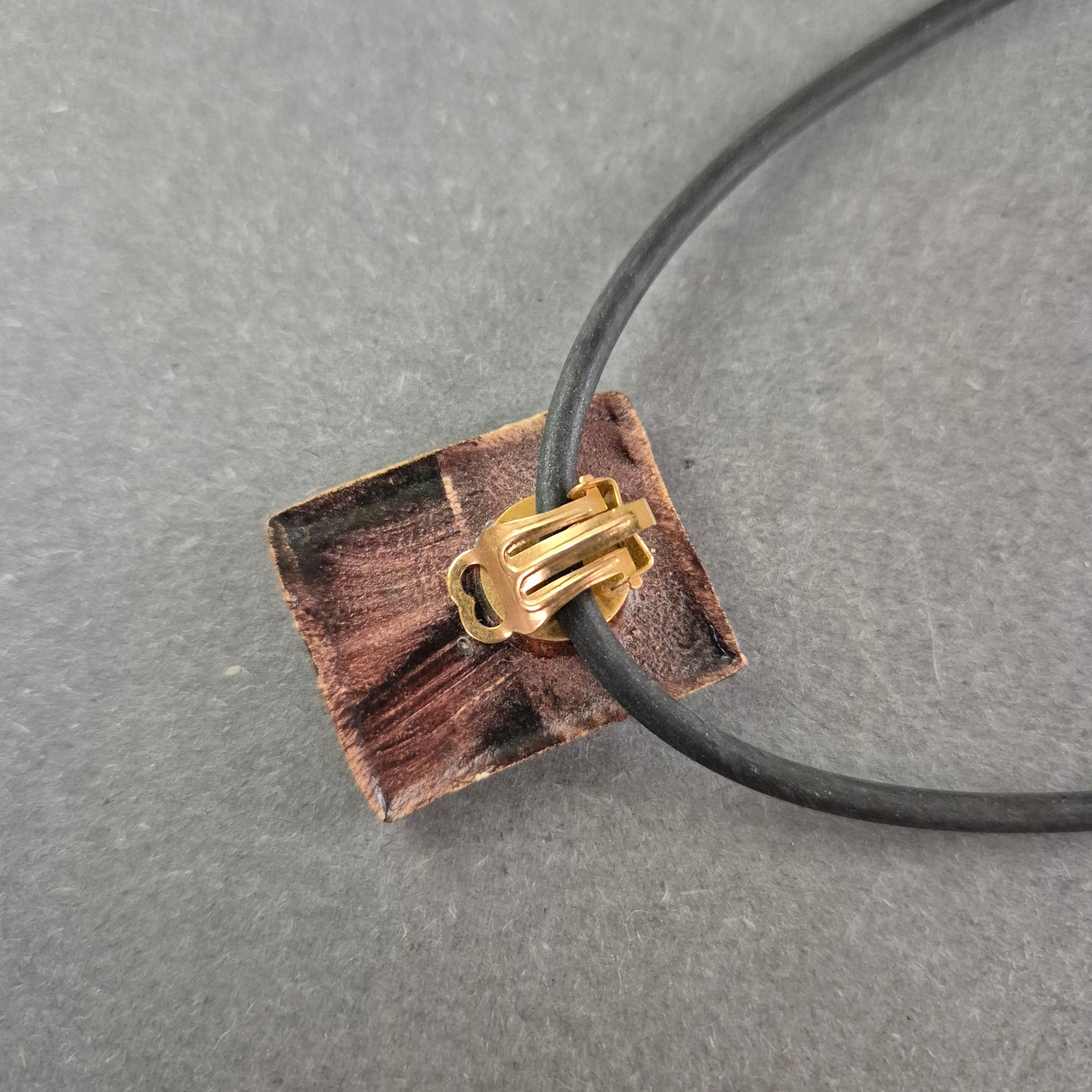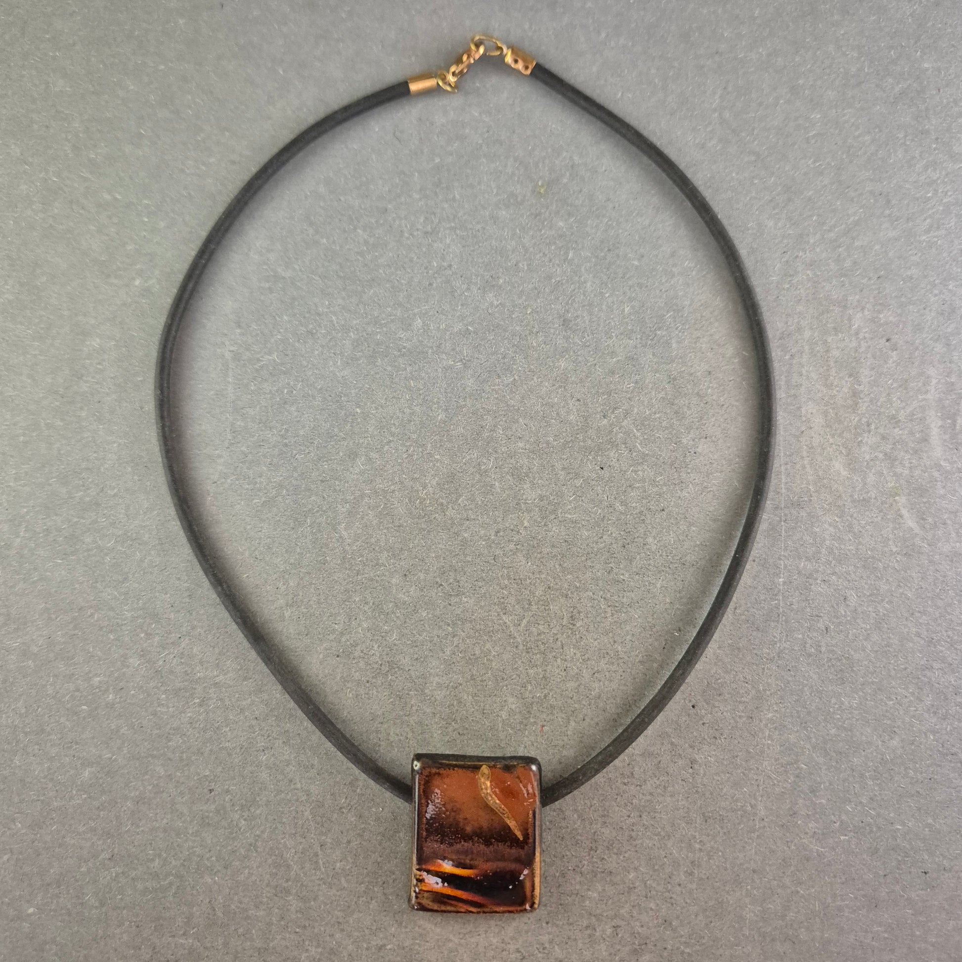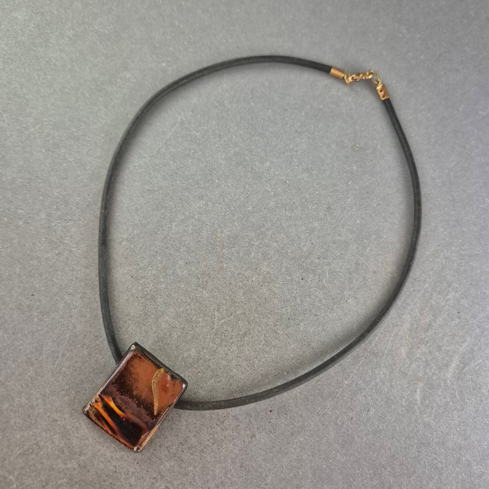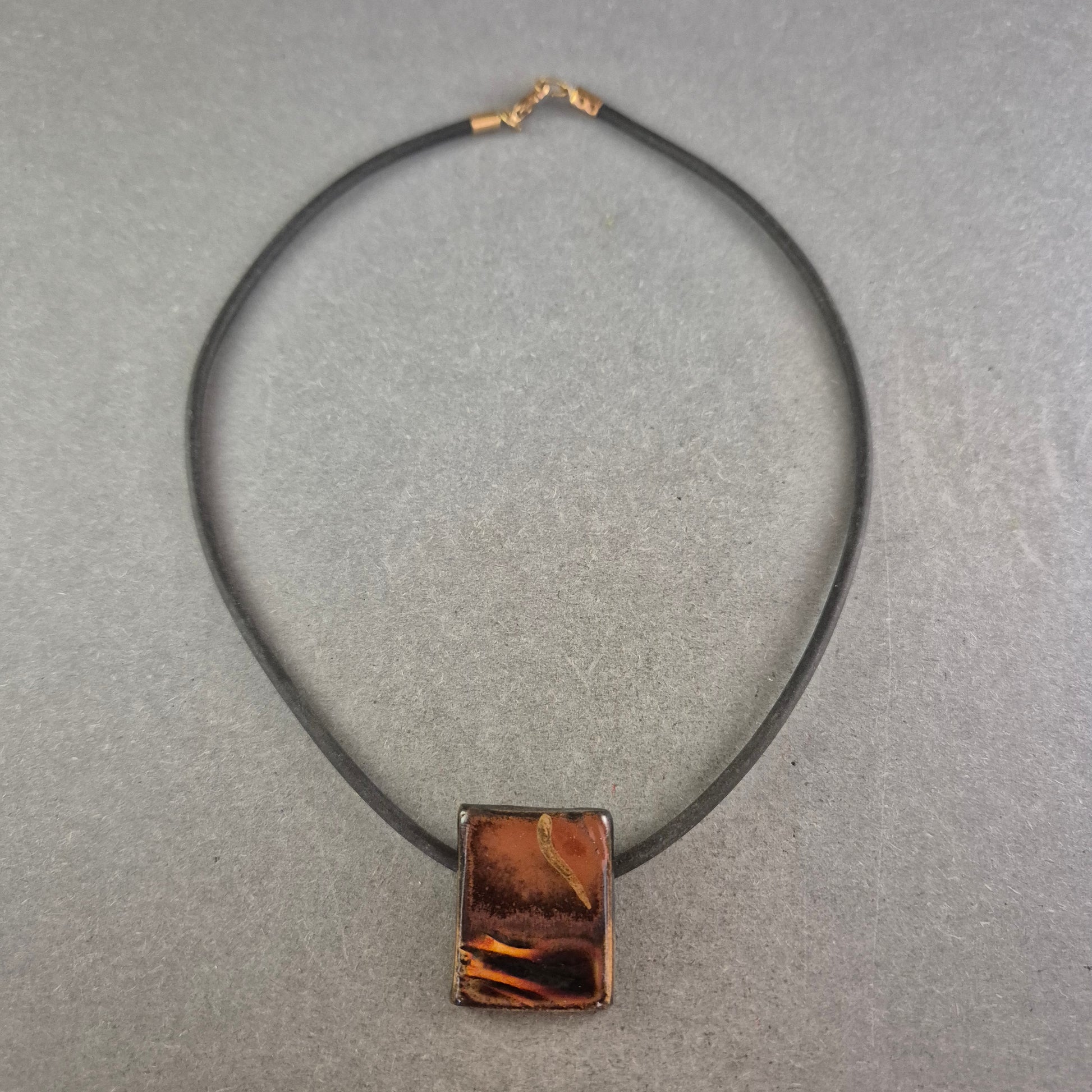 Diese moderne Halskette kombiniert ein schlichtes schwarzes Lederband mit einem auffälligen, rechteckigen Anhänger in warmen Braun- und Kupfertönen. Der glänzende Anhänger mit abstrakter Struktur wirkt wie ein kleines Kunstwerk und macht die Kette zu einem stilvollen Unikat – perfekt für alle, die Individualität lieben.