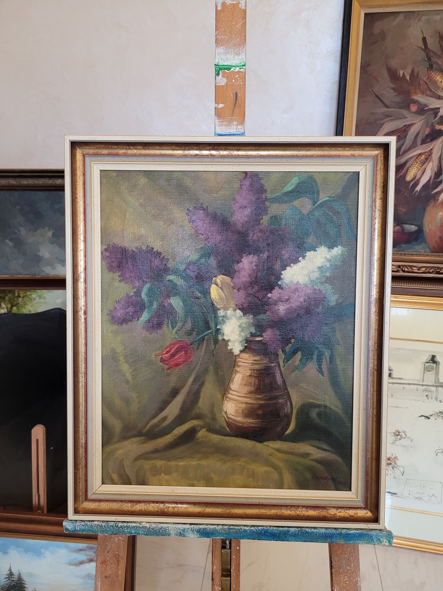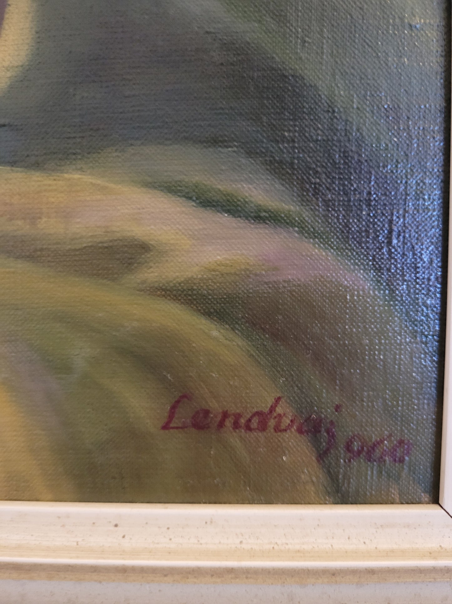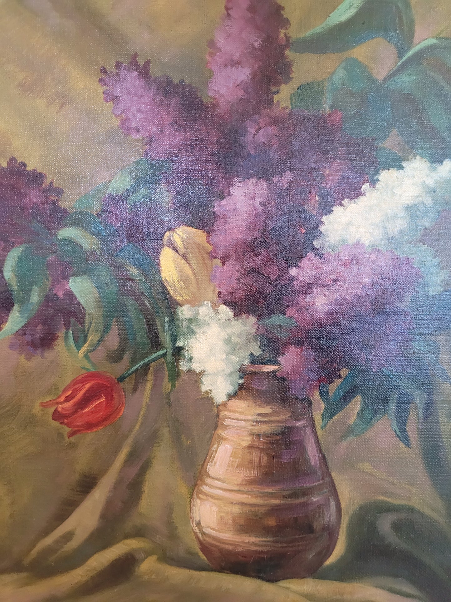 Beschreibung: Dieses bezaubernde Ölgemälde von Lendvaj präsentiert ein zartes Blumenstillleben vor dem Hintergrund einer schönen braunen Gardine. Die feinen Pinselstriche und die geschickte Anordnung der Blumen verleihen dem Gemälde eine ruhige und harmonische Atmosphäre. Die Brauntöne der Gardine setzen einen warmen Kontrast zu den lebendigen Farben der Blumen.