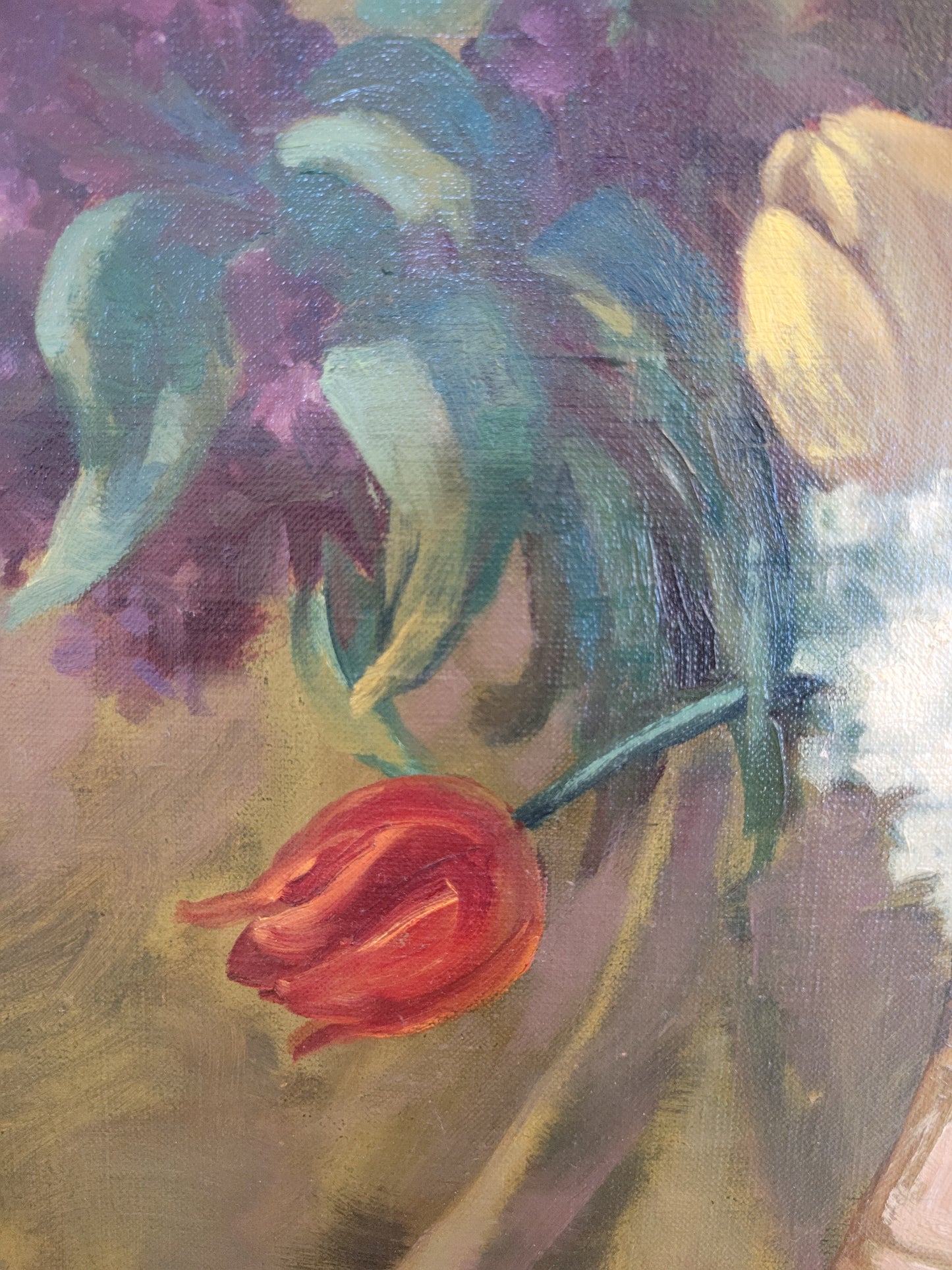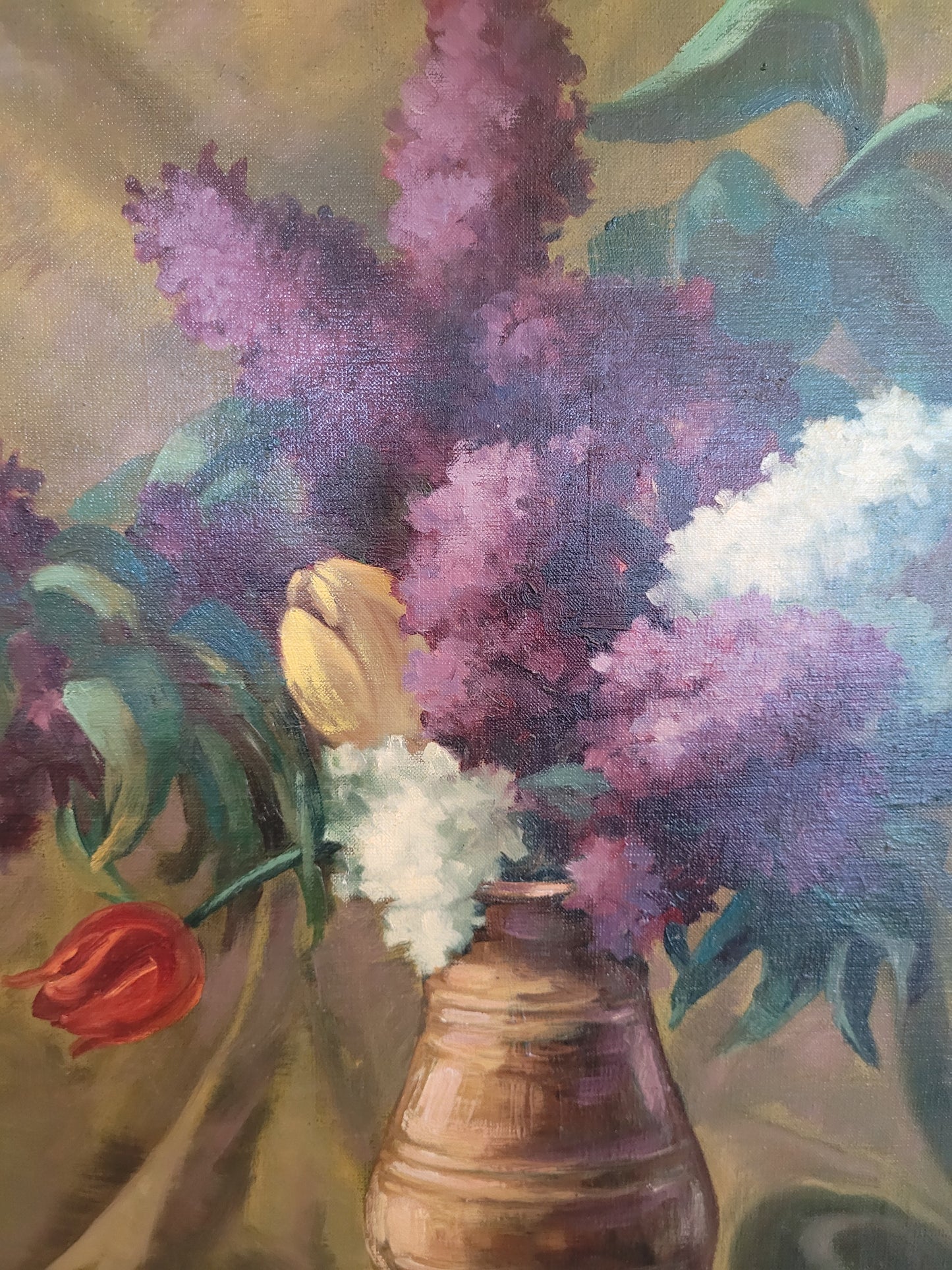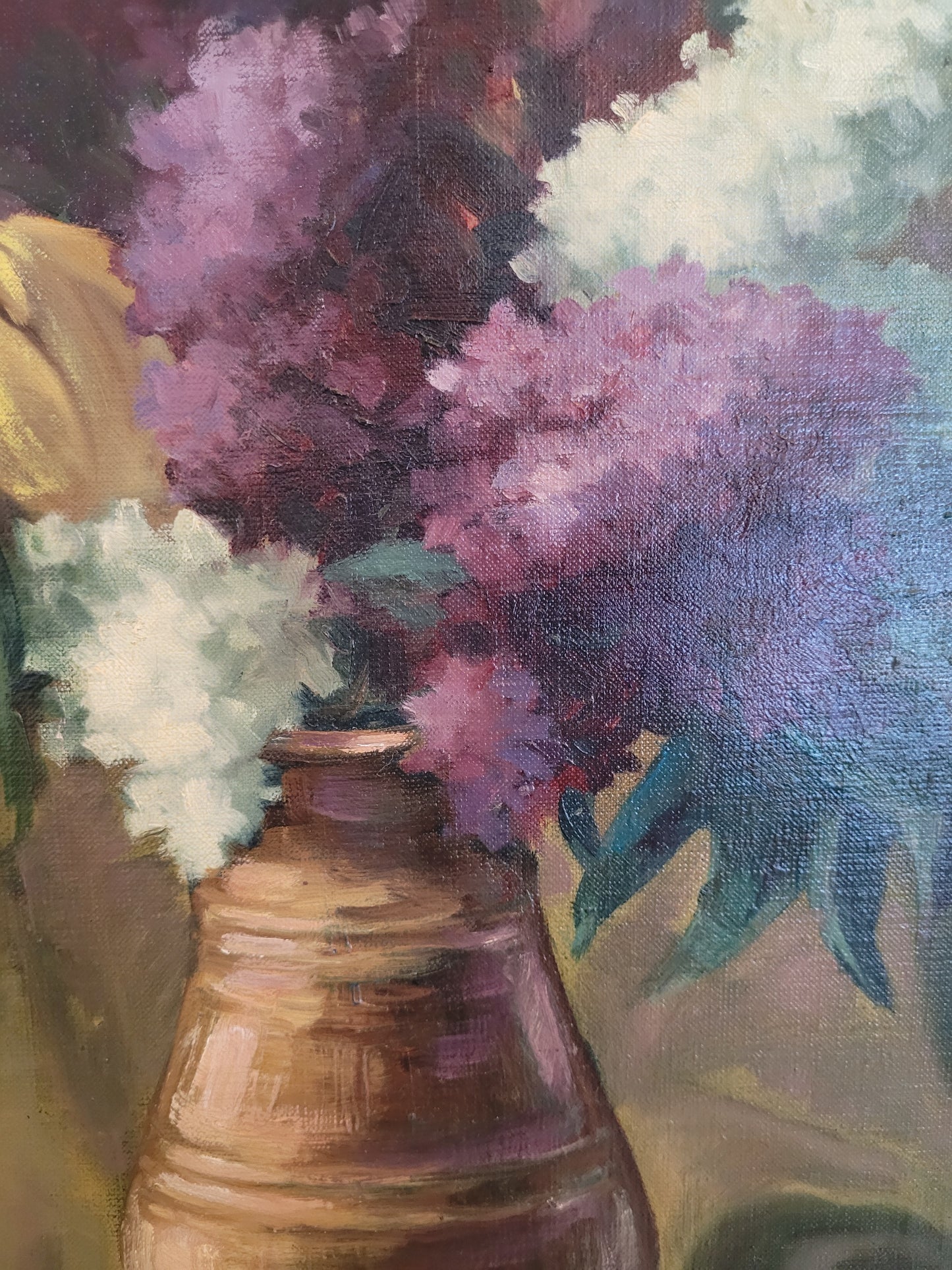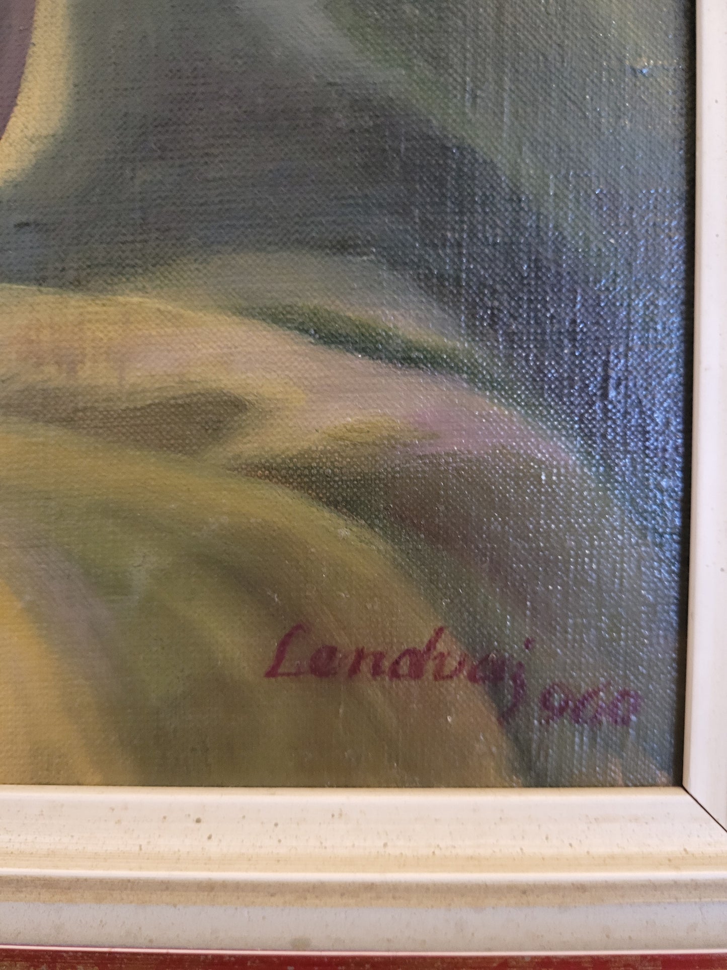 Beschreibung: Dieses bezaubernde Ölgemälde von Lendvaj präsentiert ein zartes Blumenstillleben vor dem Hintergrund einer schönen braunen Gardine. Die feinen Pinselstriche und die geschickte Anordnung der Blumen verleihen dem Gemälde eine ruhige und harmonische Atmosphäre. Die Brauntöne der Gardine setzen einen warmen Kontrast zu den lebendigen Farben der Blumen.