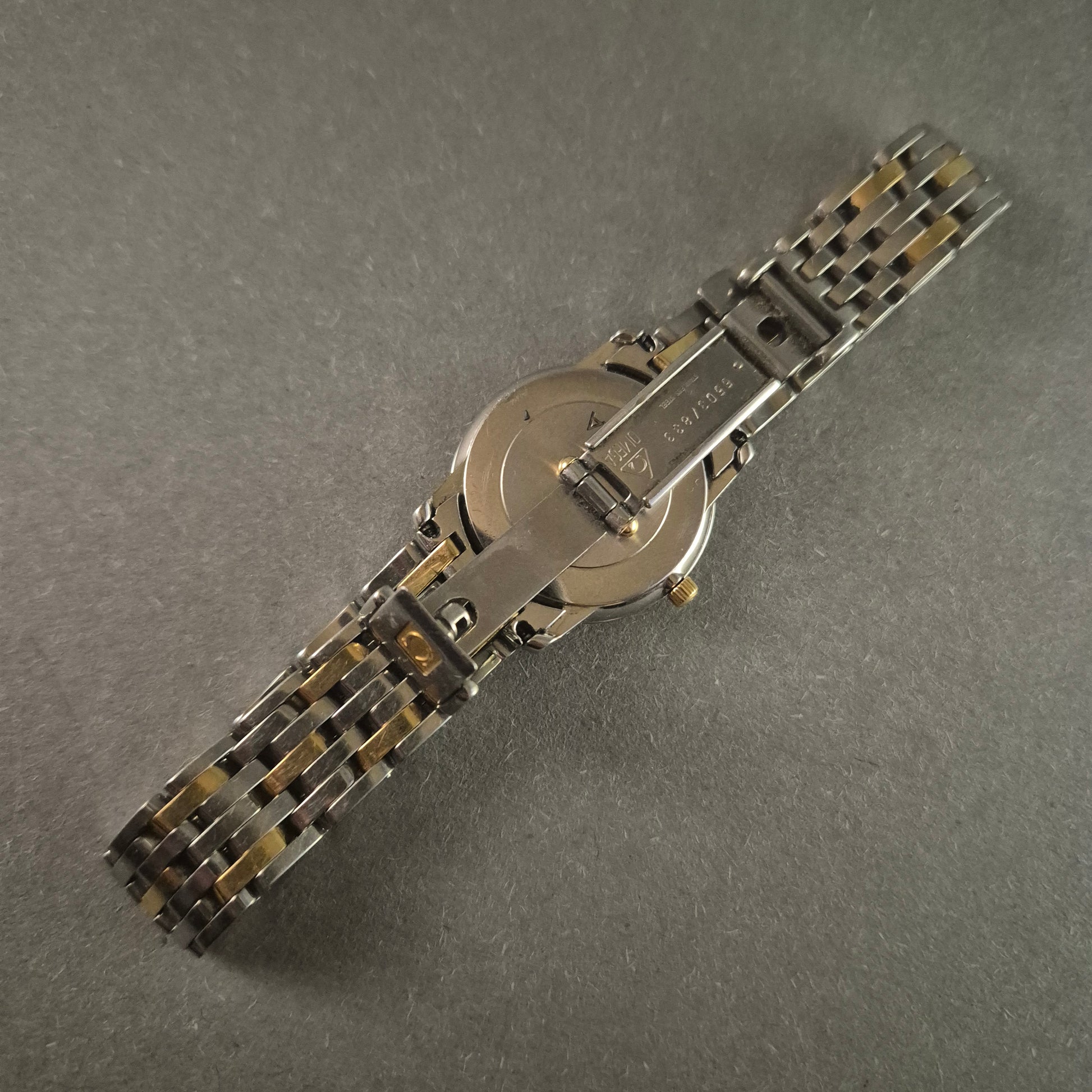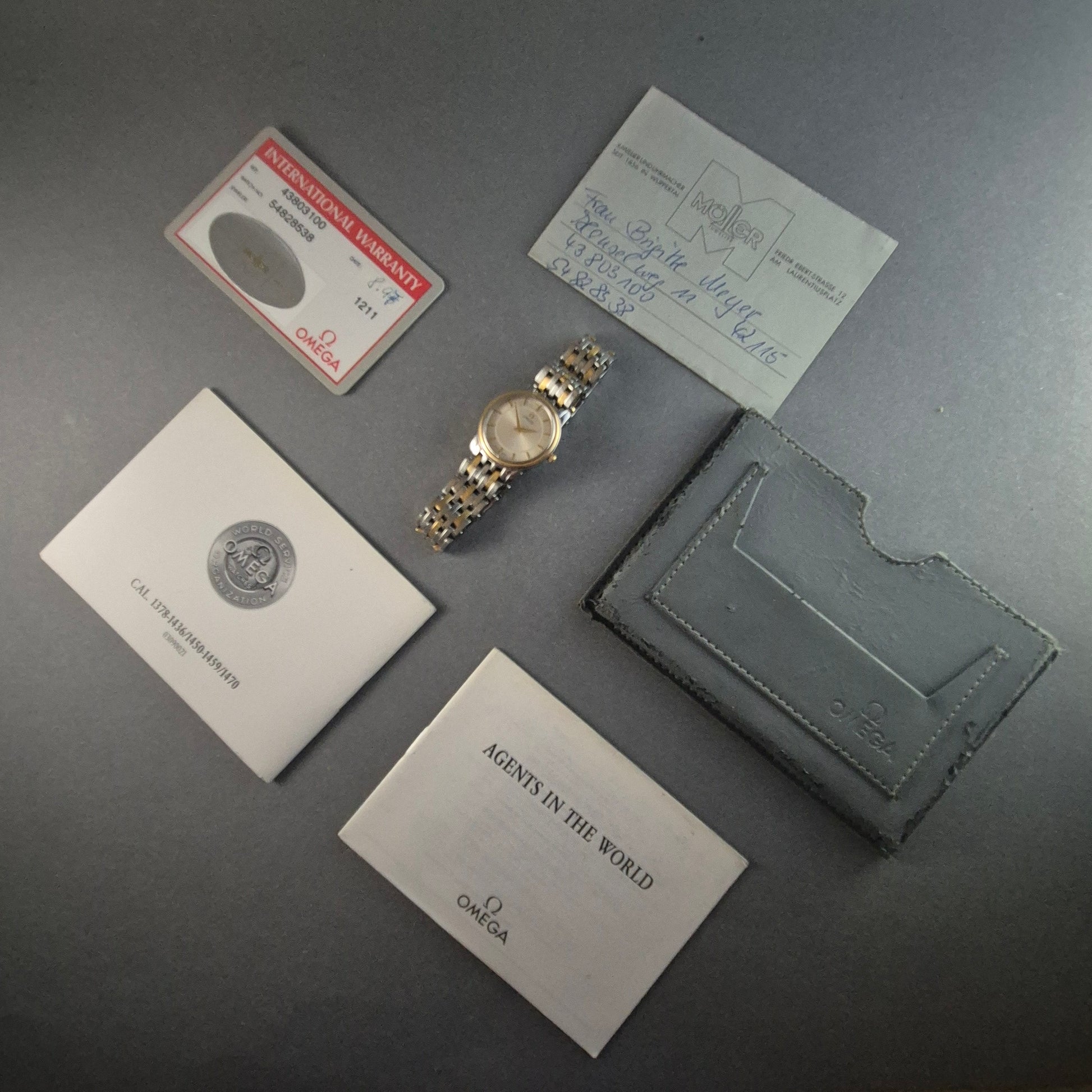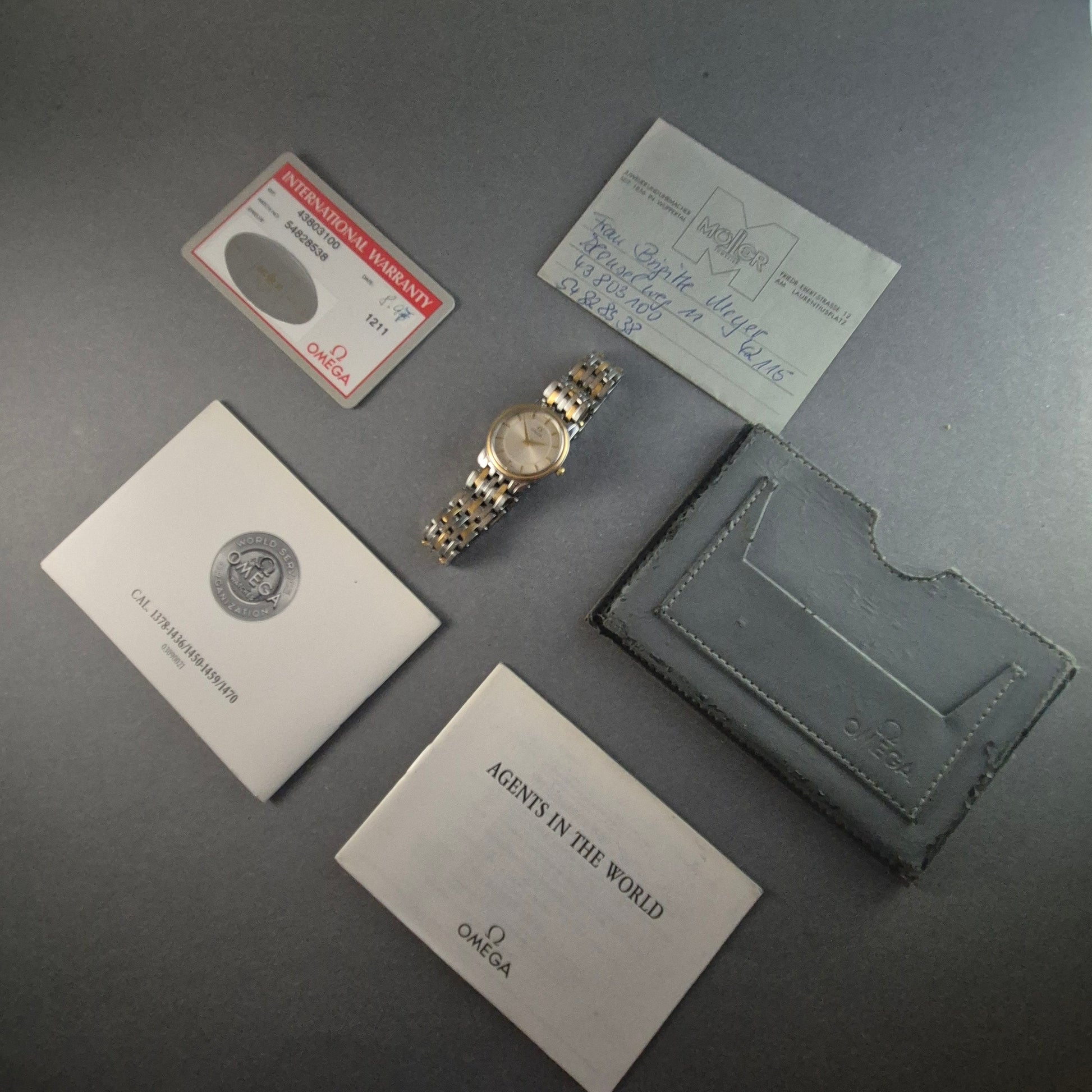 Diese edle Omega Damenarmbanduhr vereint klassisches Design mit höchster Schweizer Präzision. Das elegante Bicolor-Design aus Edelstahl und 18-Karat-Gold harmoniert perfekt mit dem silbernen Zifferblatt und goldenen Indizes. Trotz sorgfältiger Prüfung scheint die Funktionsfähigkeit des Uhrwerks aktuell nicht gewährleistet. Das Set wird inklusive Originaldokumenten, Garantiekarte und Omega-Etui angeboten – ideal für Sammler und Liebhaber hochwertiger Uhren.