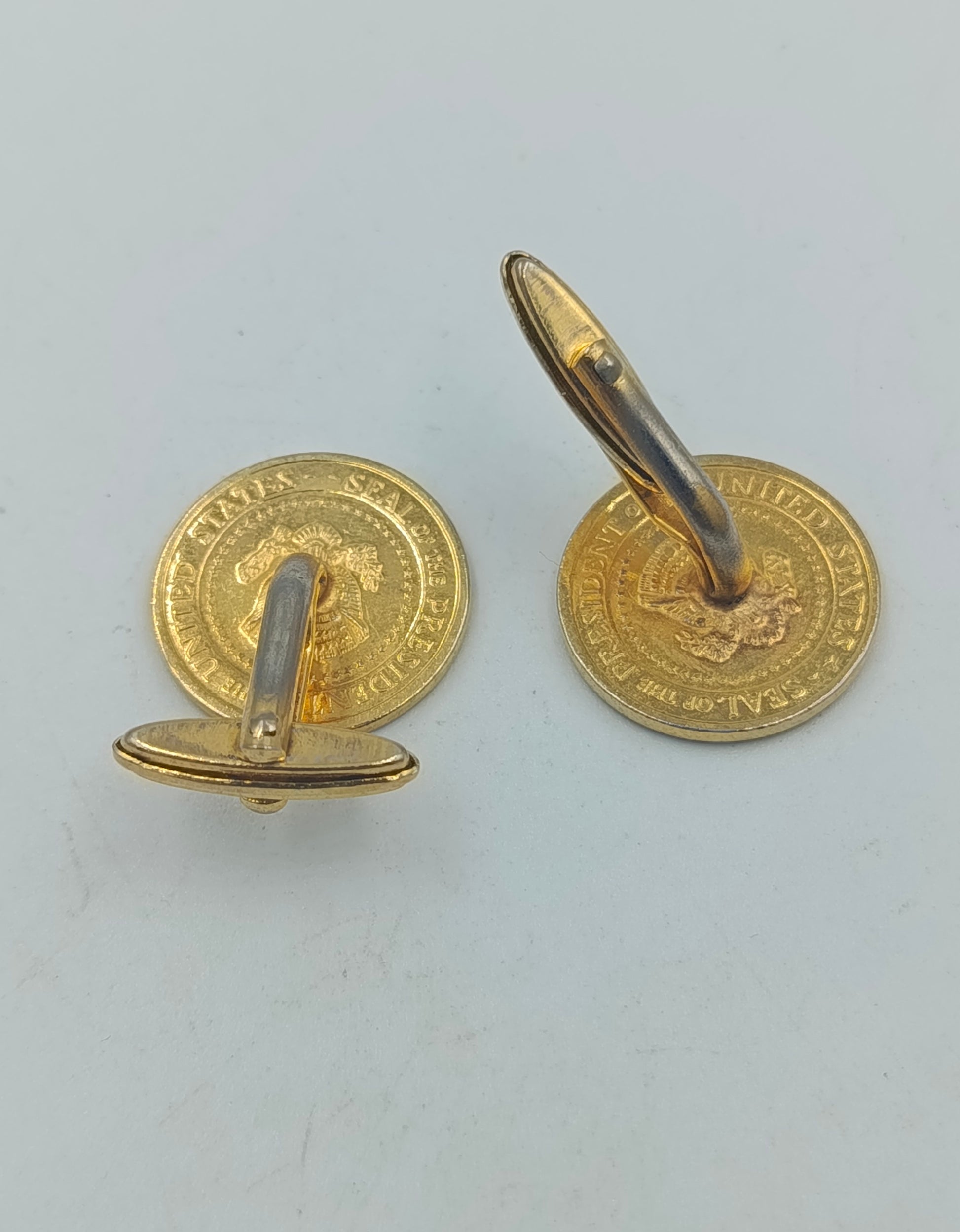 Edle Vintage-Manschettenknöpfe in goldfarbener Optik mit geprägtem John F. Kennedy Motiv (1917–1963). Die runde Form und das detailreiche Relief verleihen diesen Accessoires eine klassische, historische Note. Ideal für Sammler, Liebhaber amerikanischer Geschichte oder stilvolle Outfits mit Charakter.