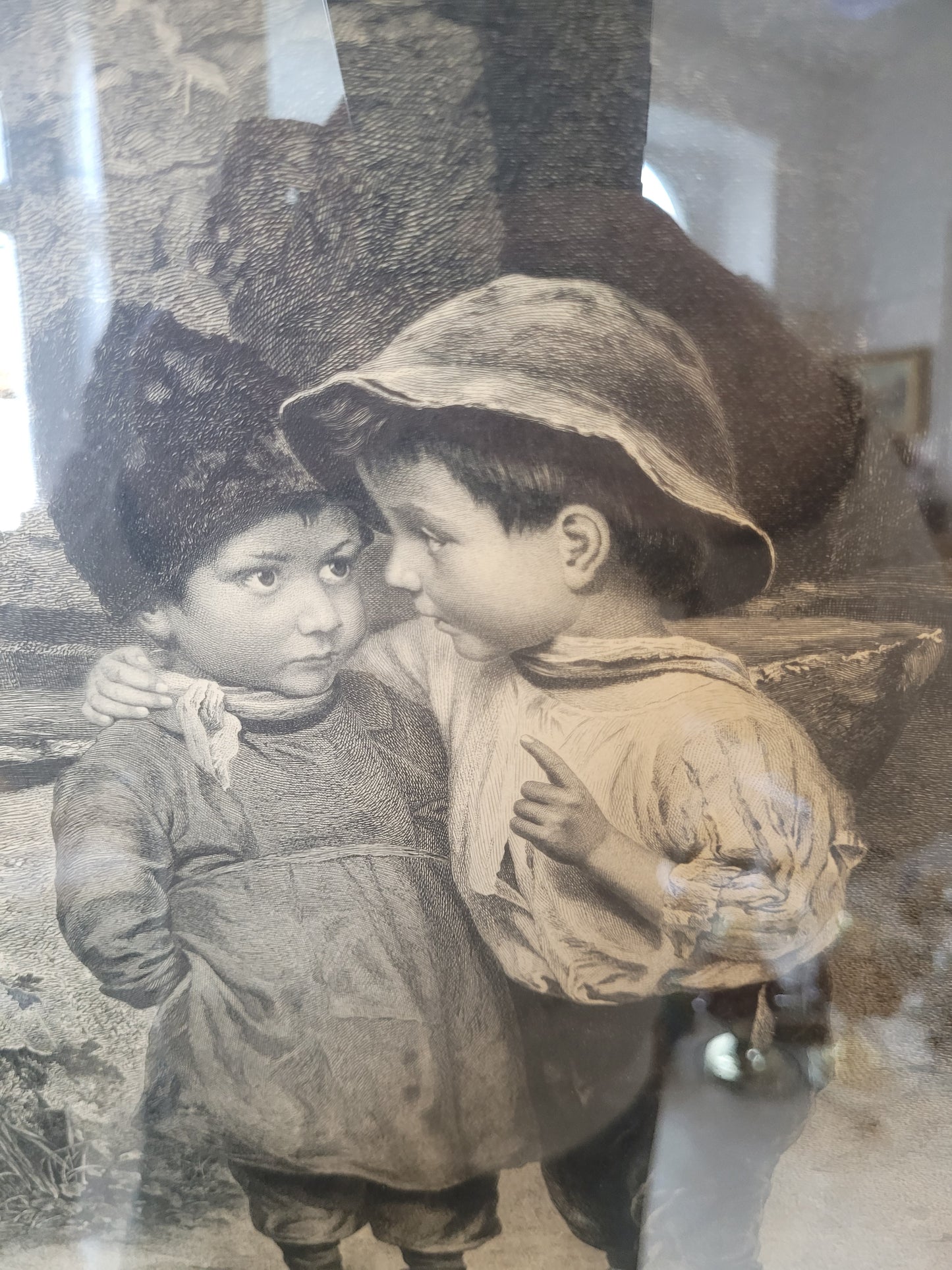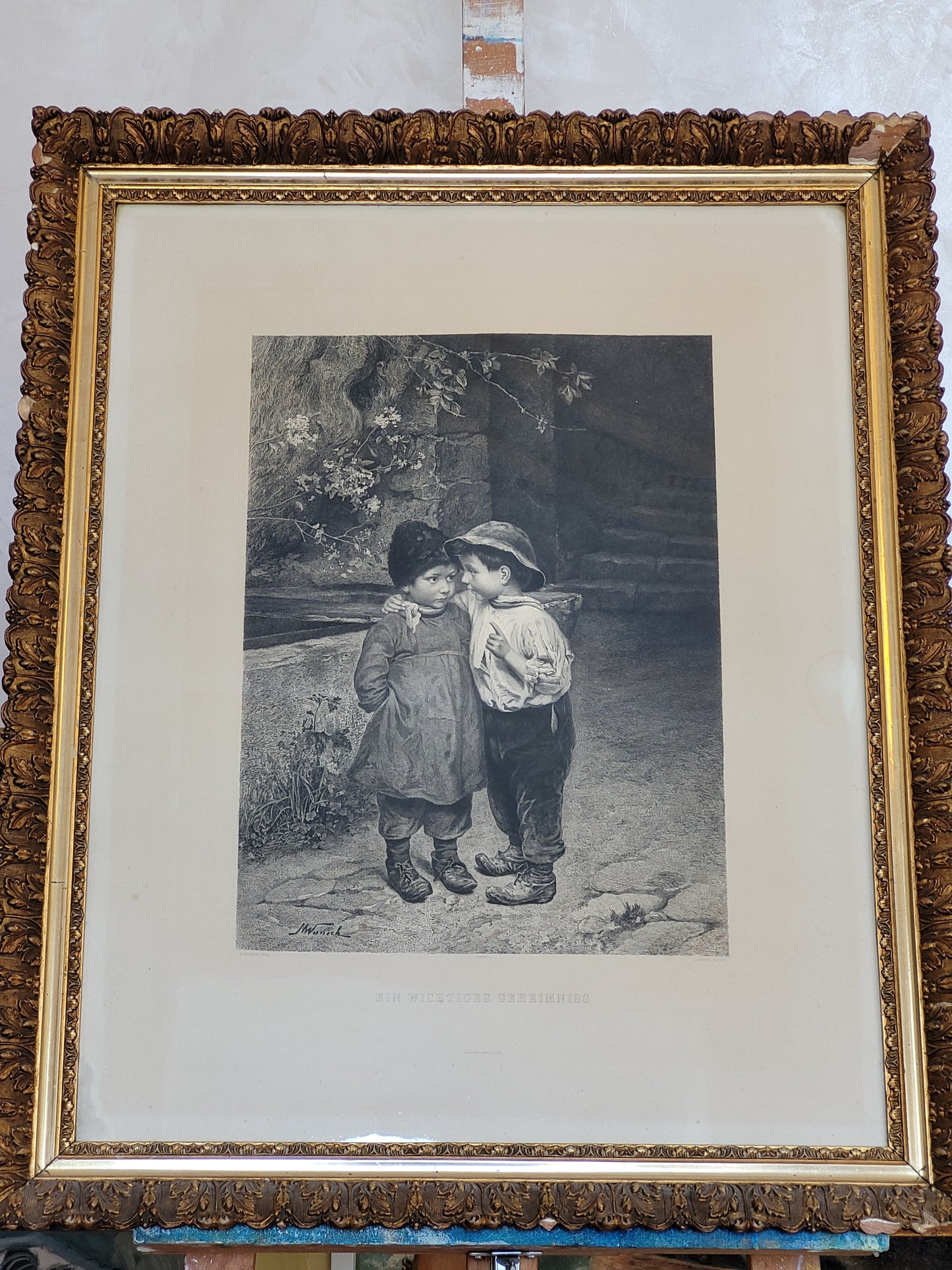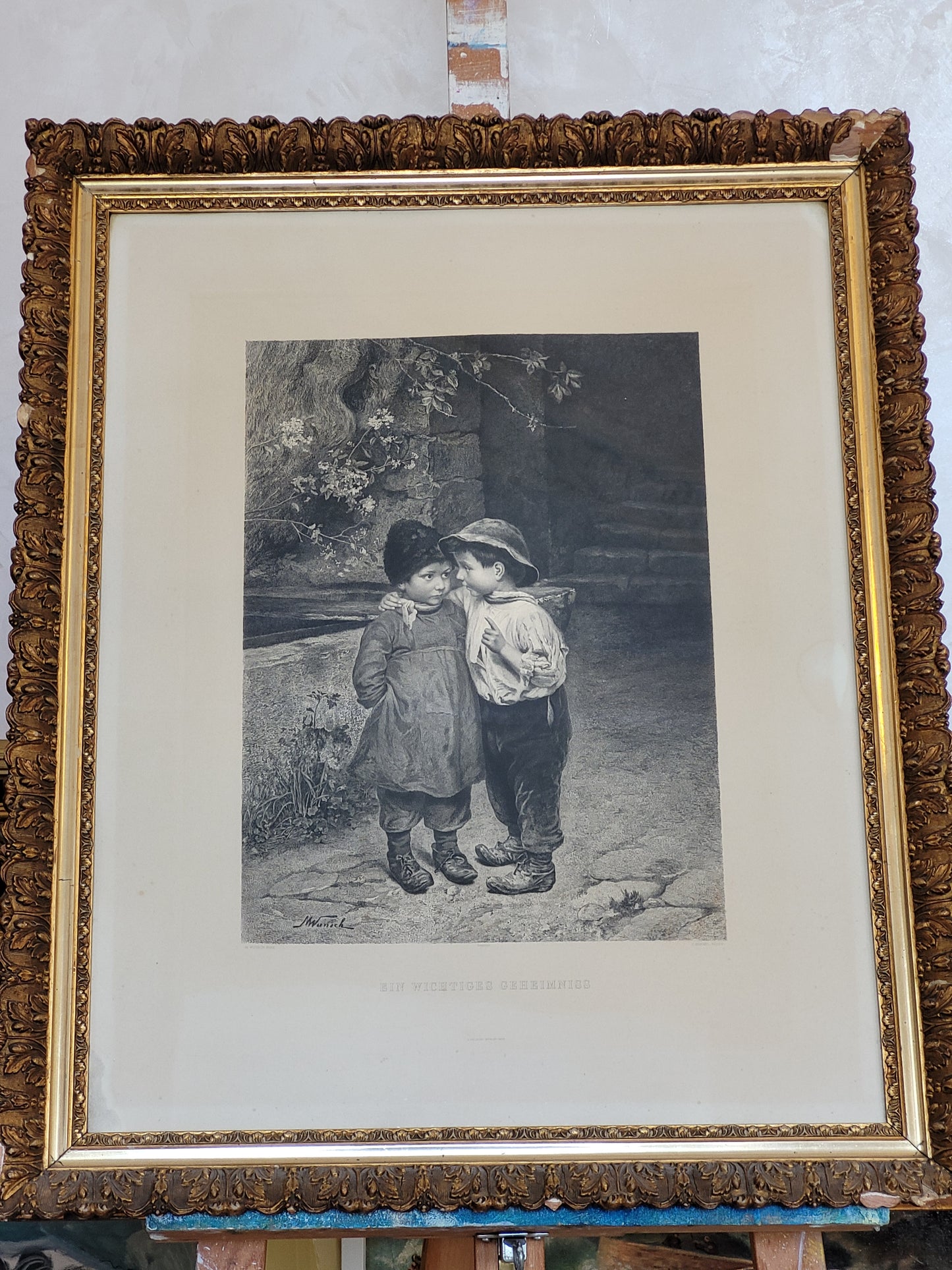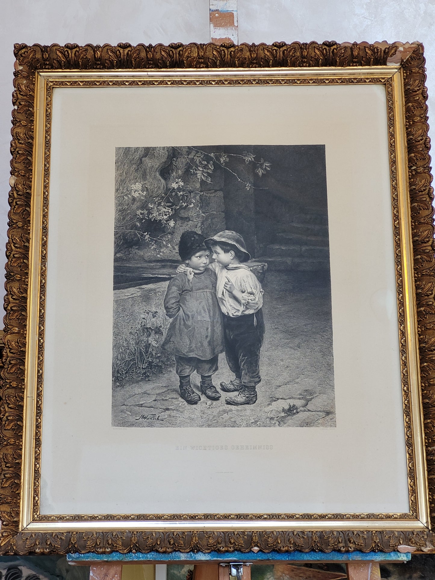 Dieser bezaubernde Kupferstich von Marie Wunsch zeigt eine intime und liebevolle Szene zweier Kinder, wobei eines dem anderen ein Geheimnis ins Ohr flüstert. Die detailreiche Darstellung und die sanfte Linienführung machen dieses Werk zu einem besonderen Highlight. Der Stich ist in sehr gutem Zustand und wird von einem eleganten Rahmen ergänzt, der die Anmut und Feinheit des Motivs unterstreicht. Ein wunderschönes Stück für Kunstliebhaber und Sammler.