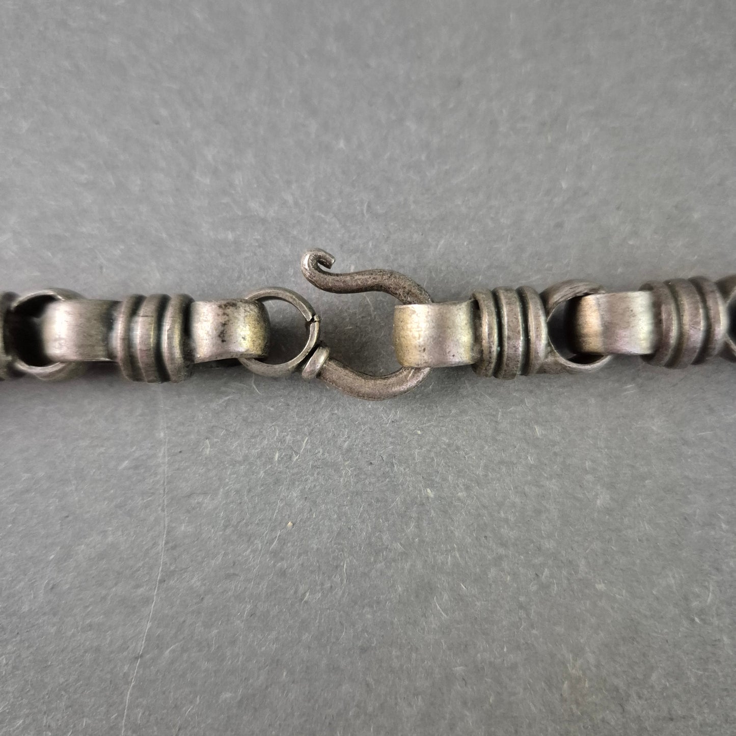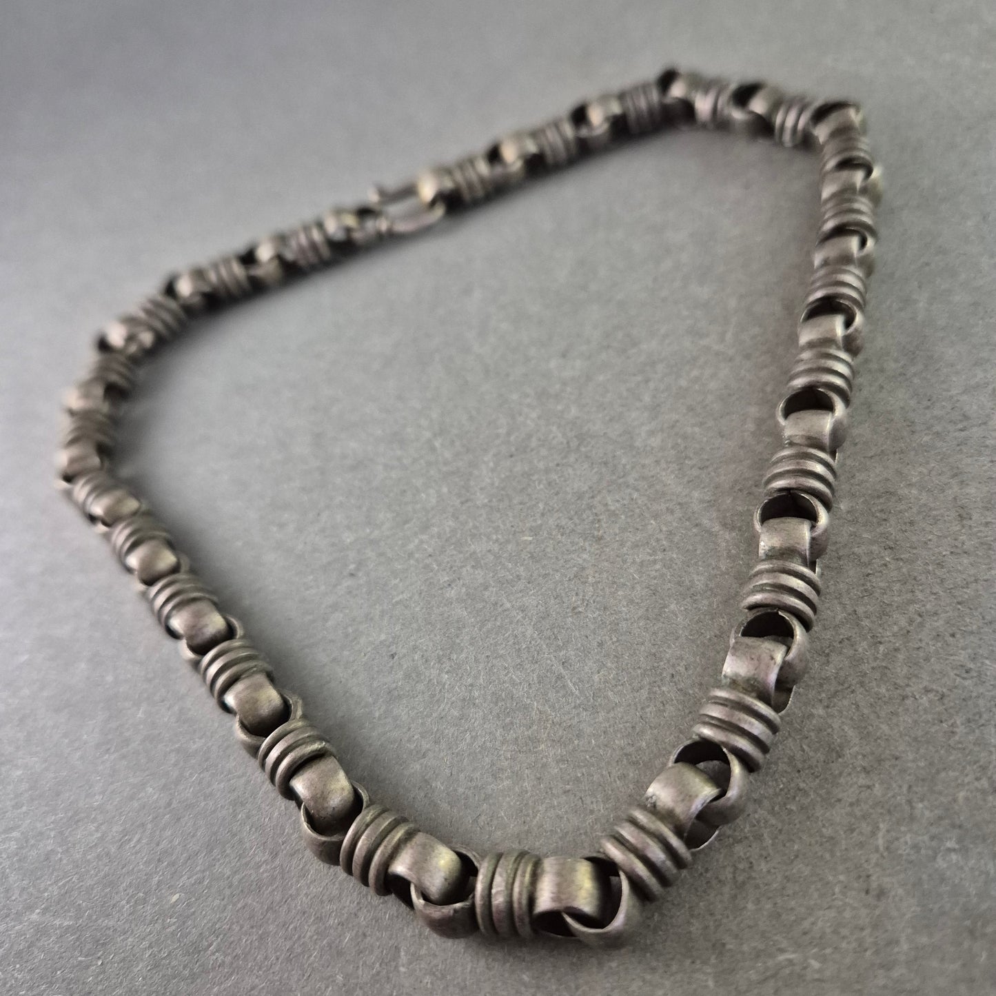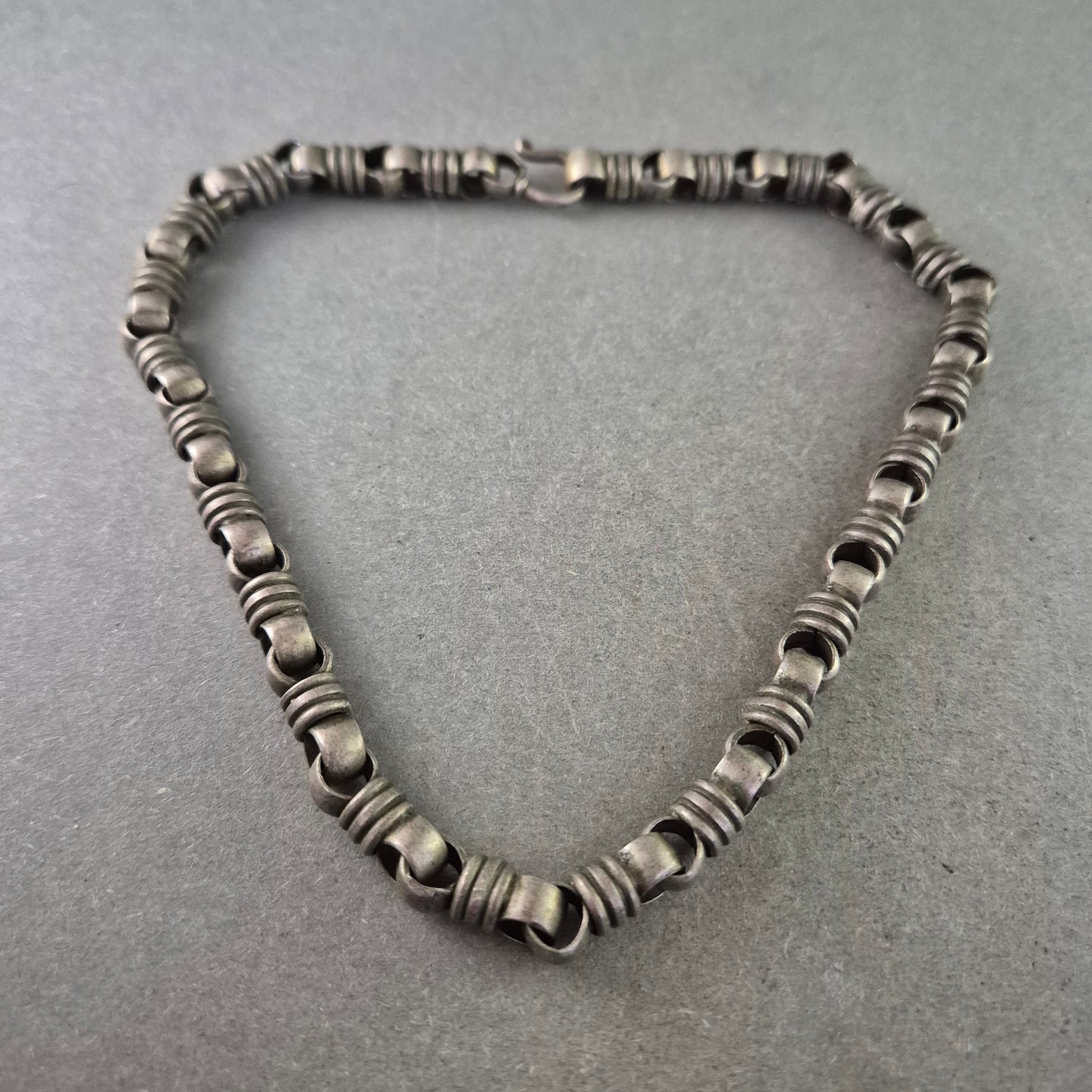 Diese robuste Halskette im Antik-Look zeichnet sich durch ihr einzigartiges Design aus: Glieder in mattem, silberfarbenem Metall mit strukturierter Wickeloptik verleihen dem Schmuckstück eine maskuline, rustikale Ausstrahlung. Ideal für Liebhaber markanter Accessoires im Vintage- oder Biker-Stil.