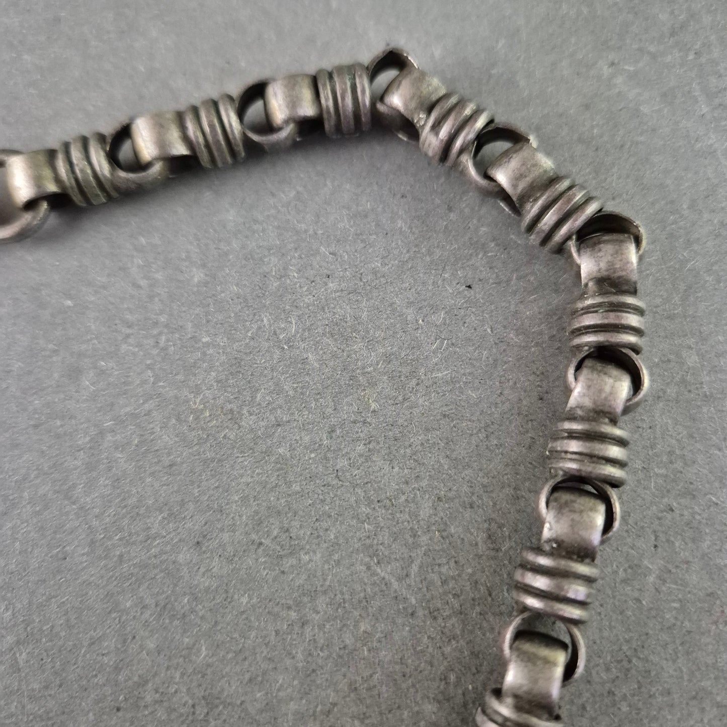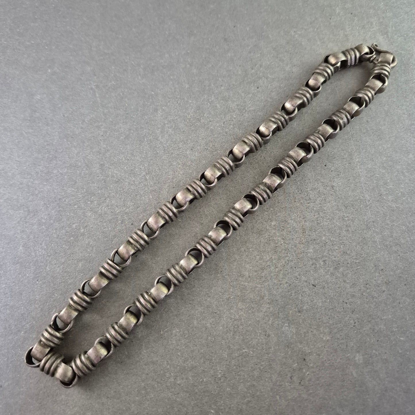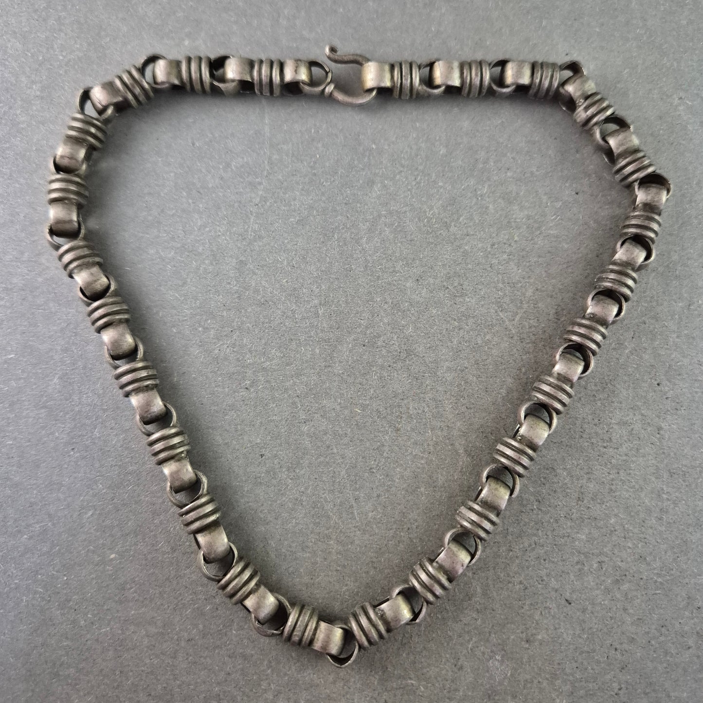 Diese robuste Halskette im Antik-Look zeichnet sich durch ihr einzigartiges Design aus: Glieder in mattem, silberfarbenem Metall mit strukturierter Wickeloptik verleihen dem Schmuckstück eine maskuline, rustikale Ausstrahlung. Ideal für Liebhaber markanter Accessoires im Vintage- oder Biker-Stil.