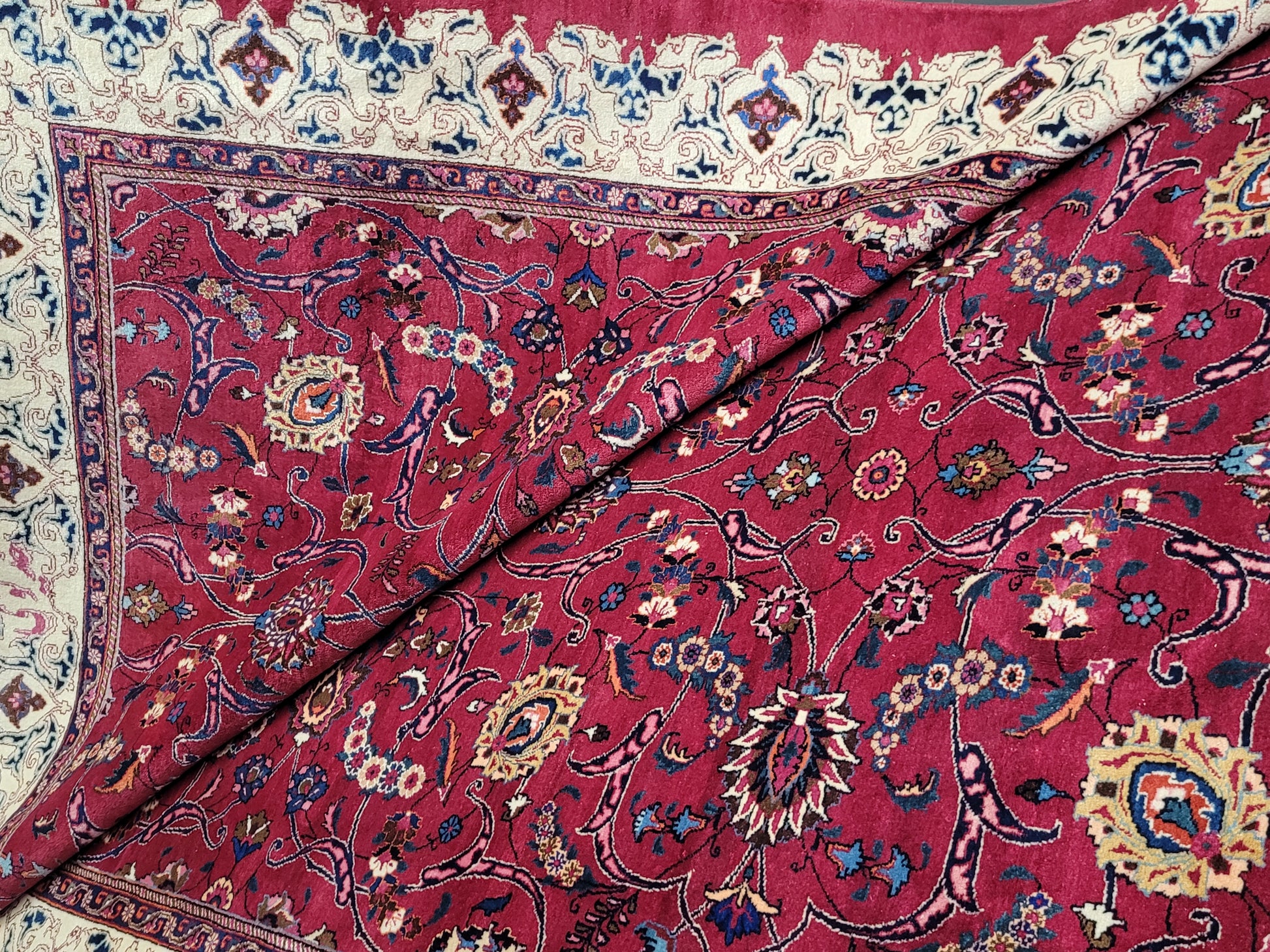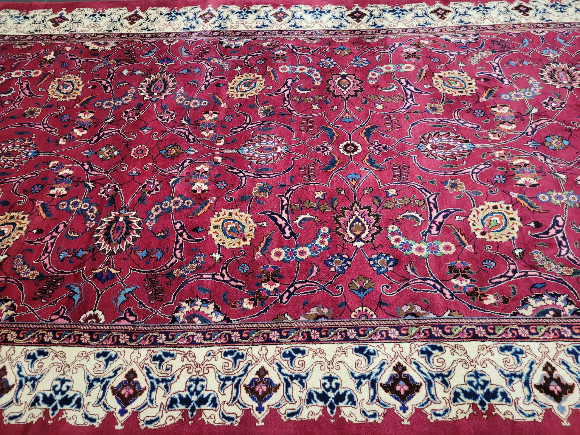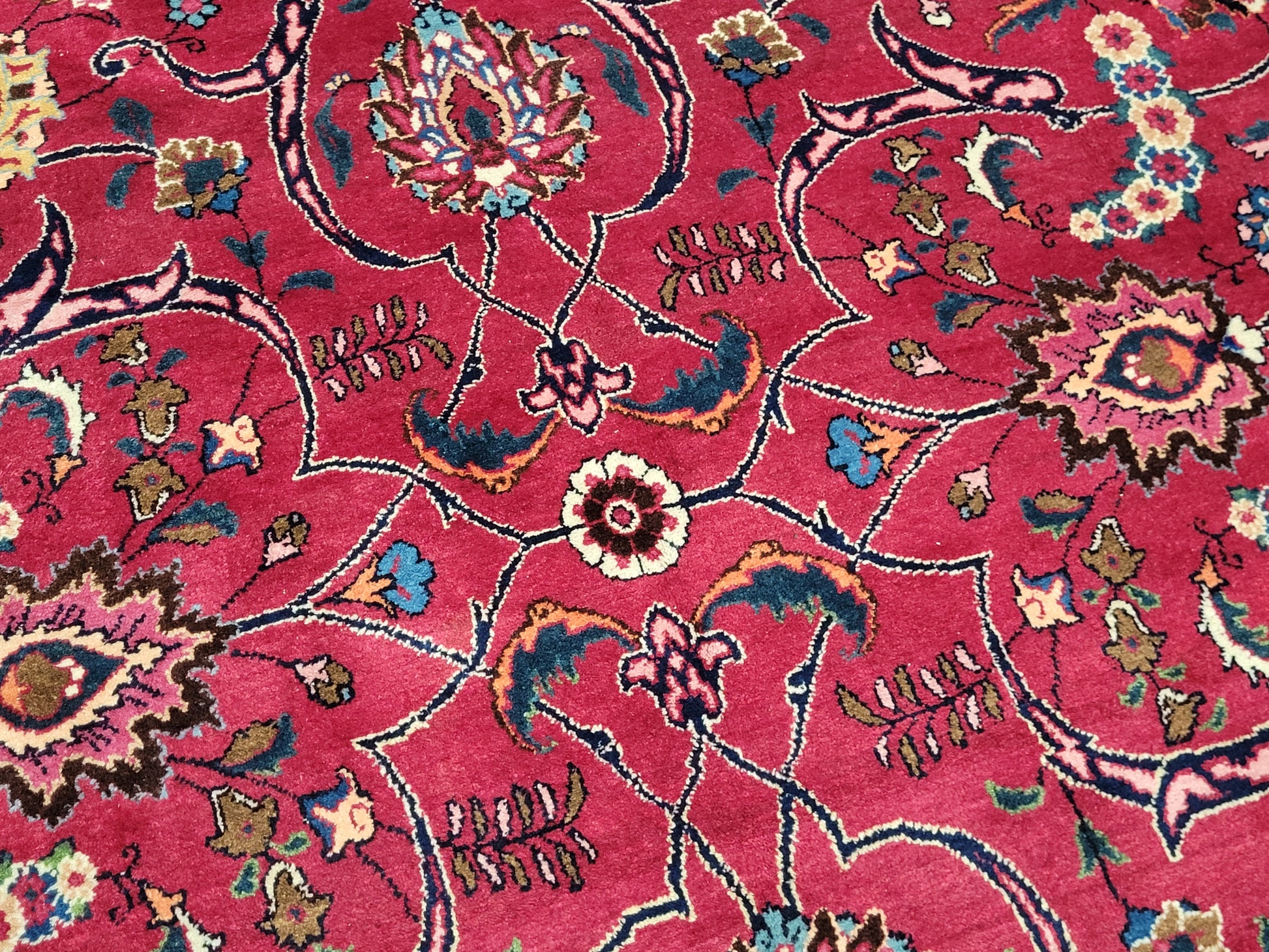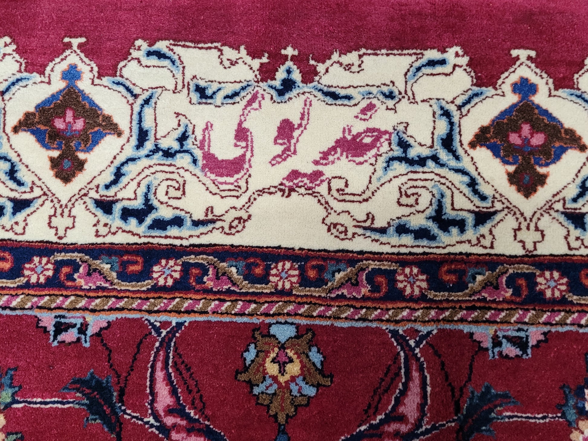 angeboten wird ein seltener, handgeknüpfter Masched Teppich aus kräftiger Wolle in klassischer Ausführung. Das prachtvolle florale Design auf intensiv rotem Fond zeigt fein geschwungene Ranken, Palmetten und Blütenornamente, die in ausgewogener Symmetrie angeordnet sind. Eine helle Bordüre mit filigranen Mustern bildet einen reizvollen Kontrast und unterstreicht die harmonische Gesamtwirkung.
