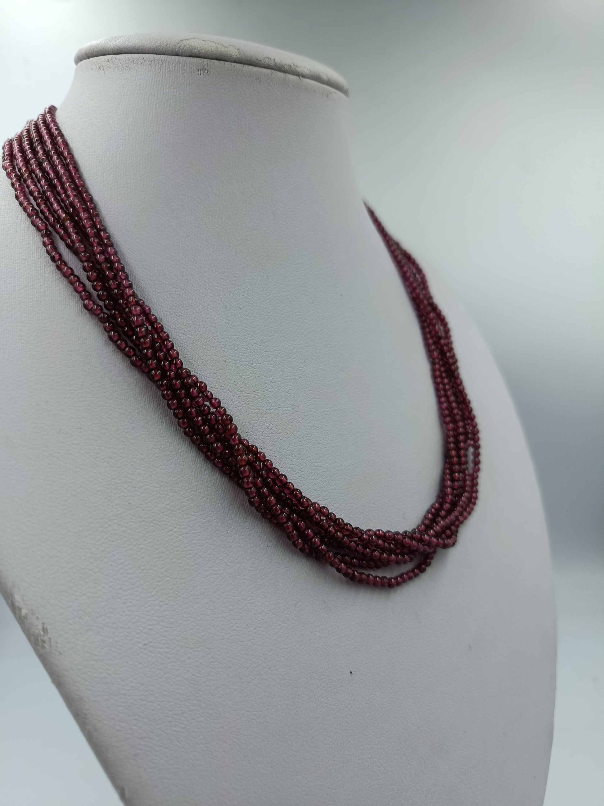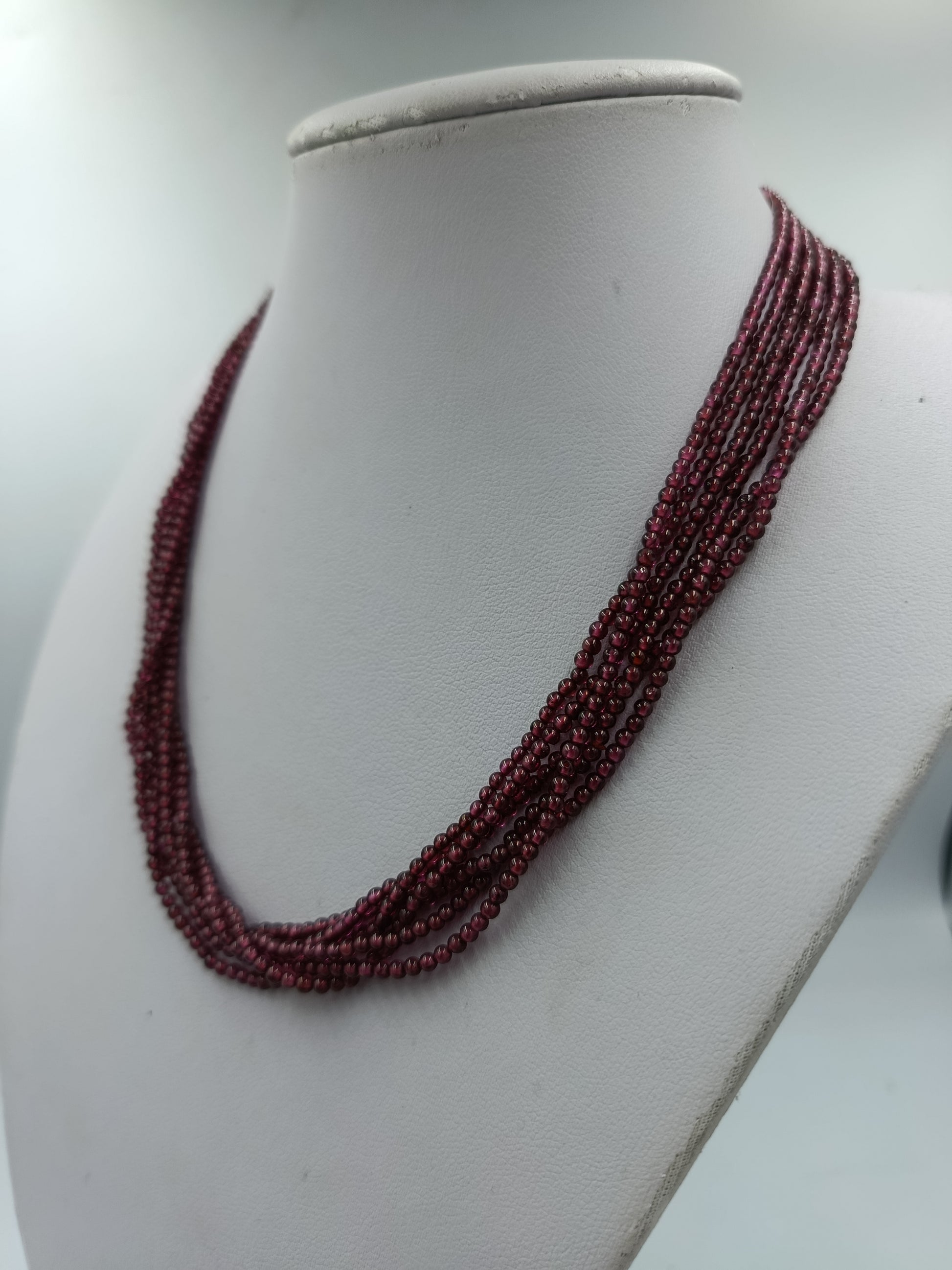 Edle mehrreihige Granatkette in tiefem Weinrot mit feinem Glanz. Die zarten, facettierten Granatperlen sind auf mehreren Strängen gefädelt und sorgen für ein besonders elegantes und volles Erscheinungsbild. Der hochwertige 925 Silberverschluss ergänzt das luxuriöse Design perfekt.
