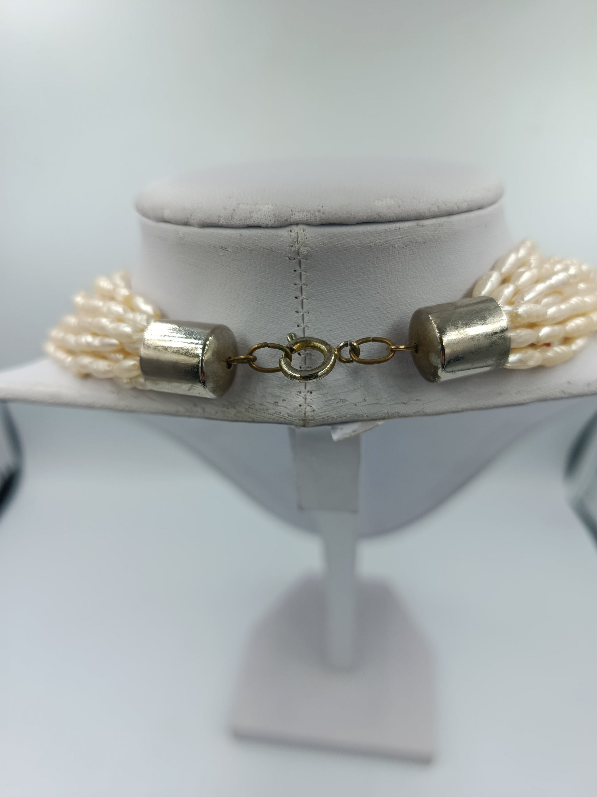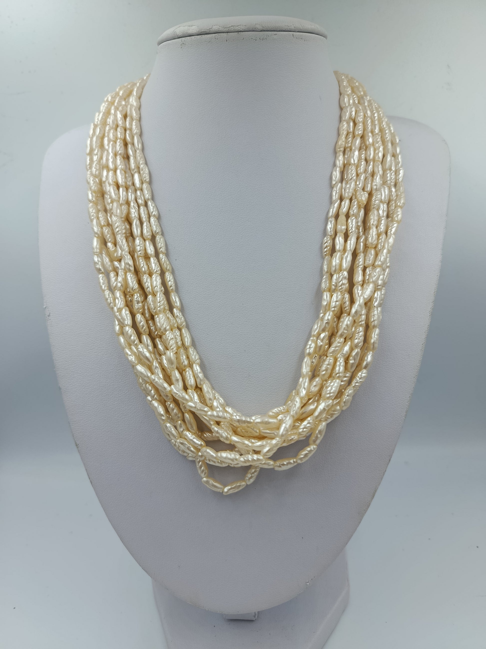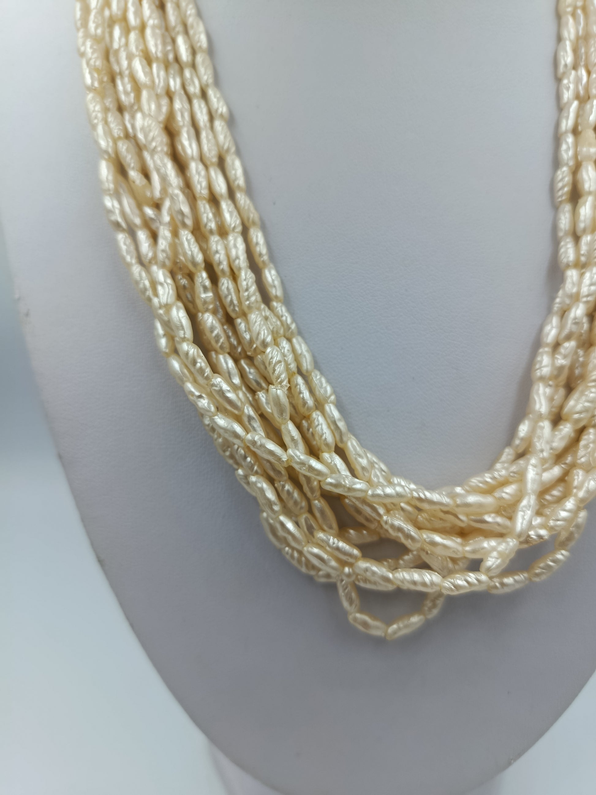 Elegante mehrreihige Perlenkette in zartem Cremeweiß, bestehend aus feinen, länglichen Perlensträngen mit wunderschönem Glanz. Durch die üppige, geschichtete Optik entsteht ein luxuriöser Look, der jedes Outfit aufwertet – ideal für festliche Anlässe oder elegante Abendgarderobe.