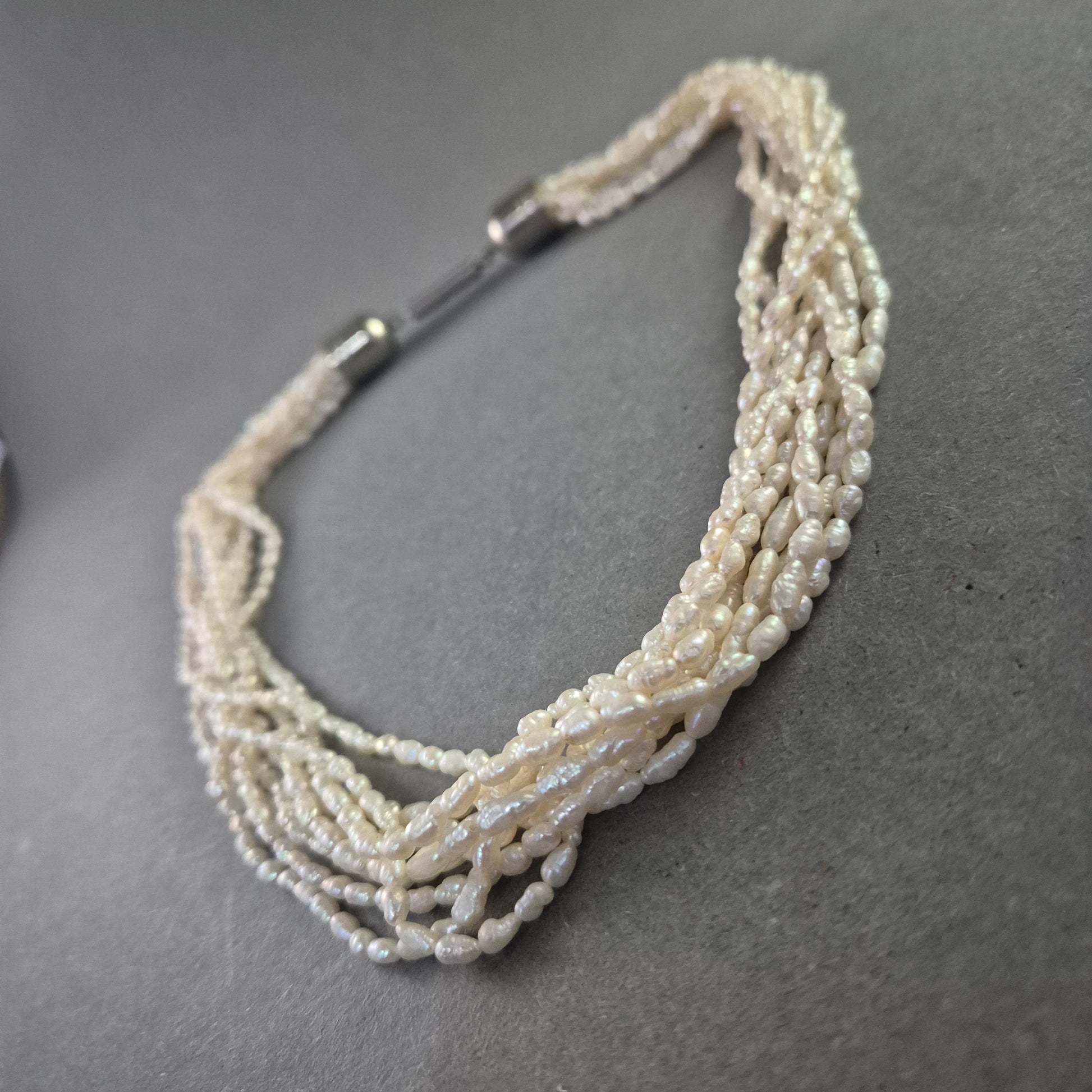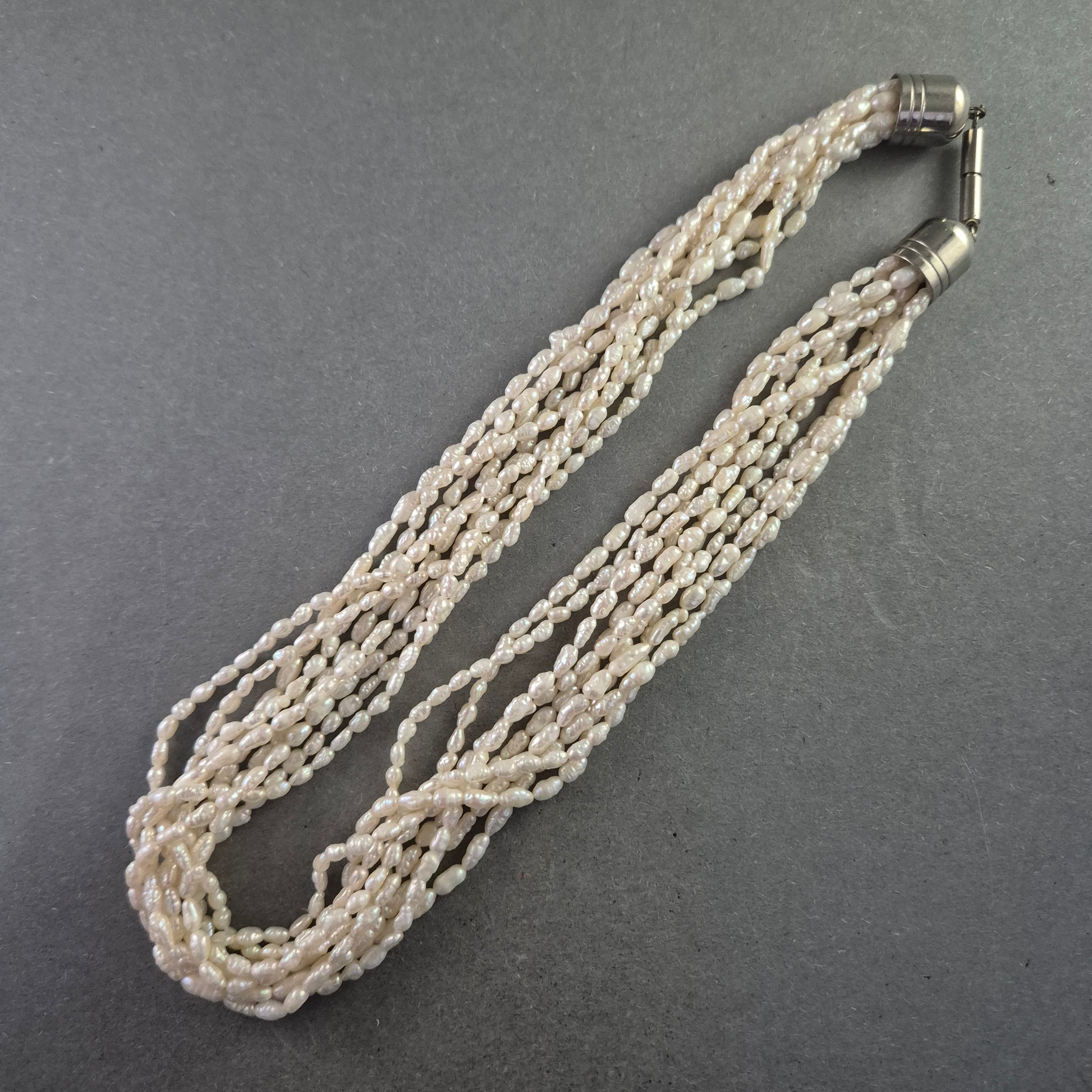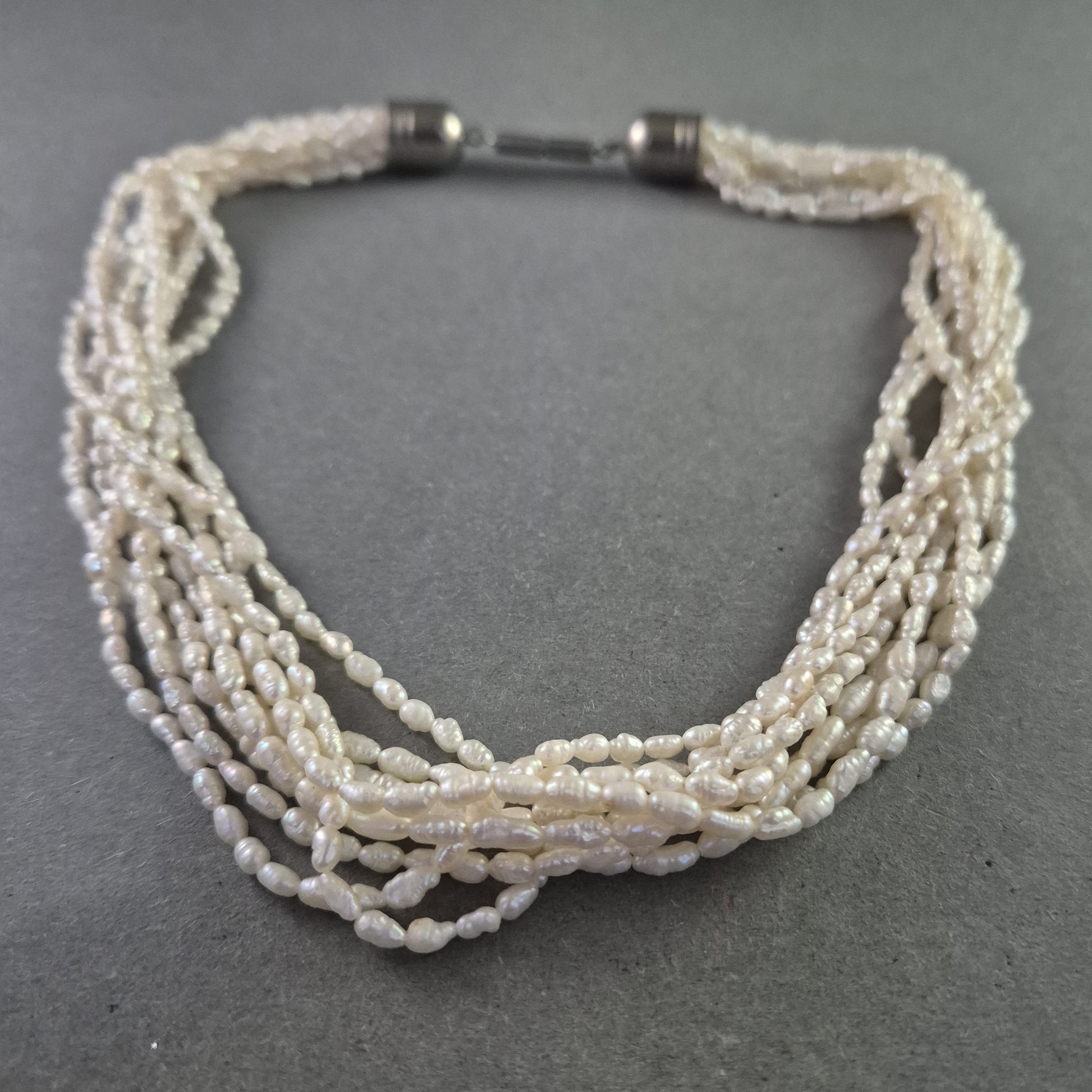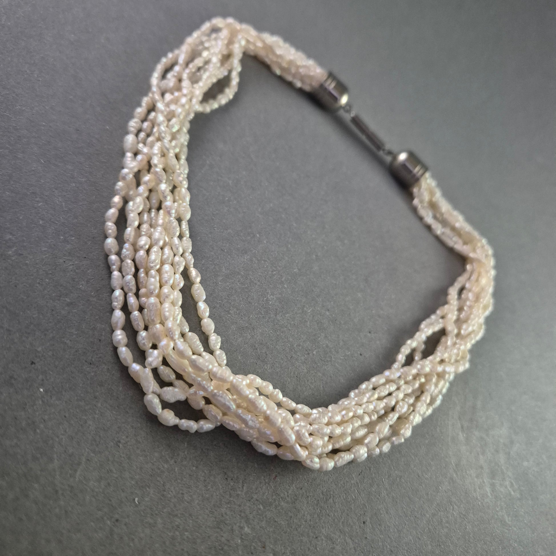 Diese mehrreihige Perlenkette besticht durch ihre raffinierte Optik aus zahlreichen feinen Strängen unregelmäßiger Süßwasserperlen. Der moderne Magnetverschluss sorgt für einfaches Anlegen und sicheren Halt. Ideal für festliche Outfits, Brautlooks oder elegante Alltagsmomente – diese Kette vereint Natur und Stil auf harmonische Weise.