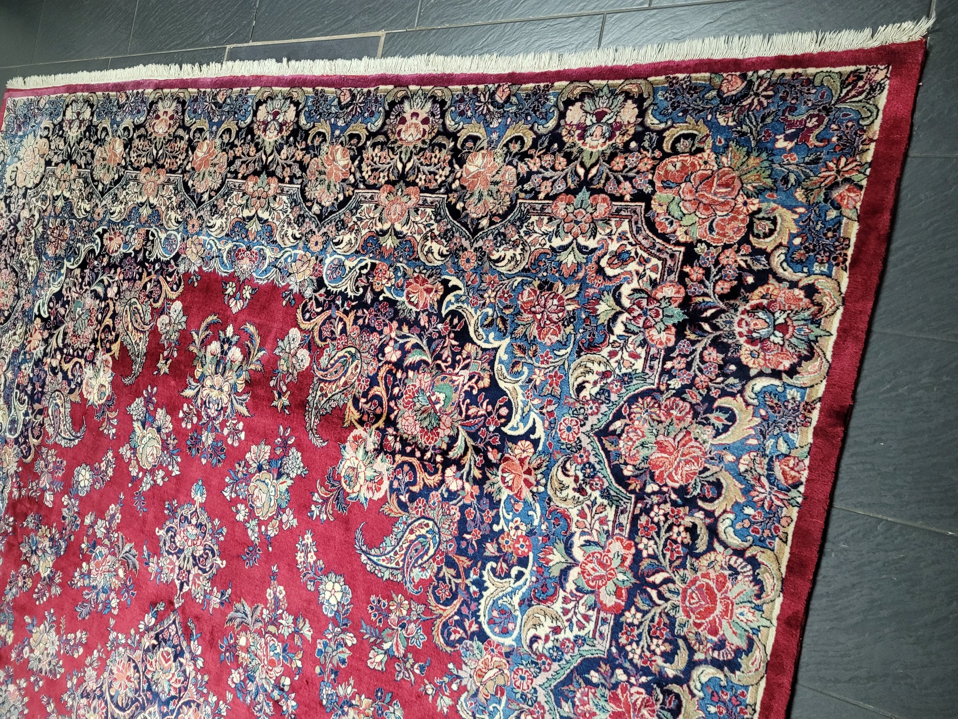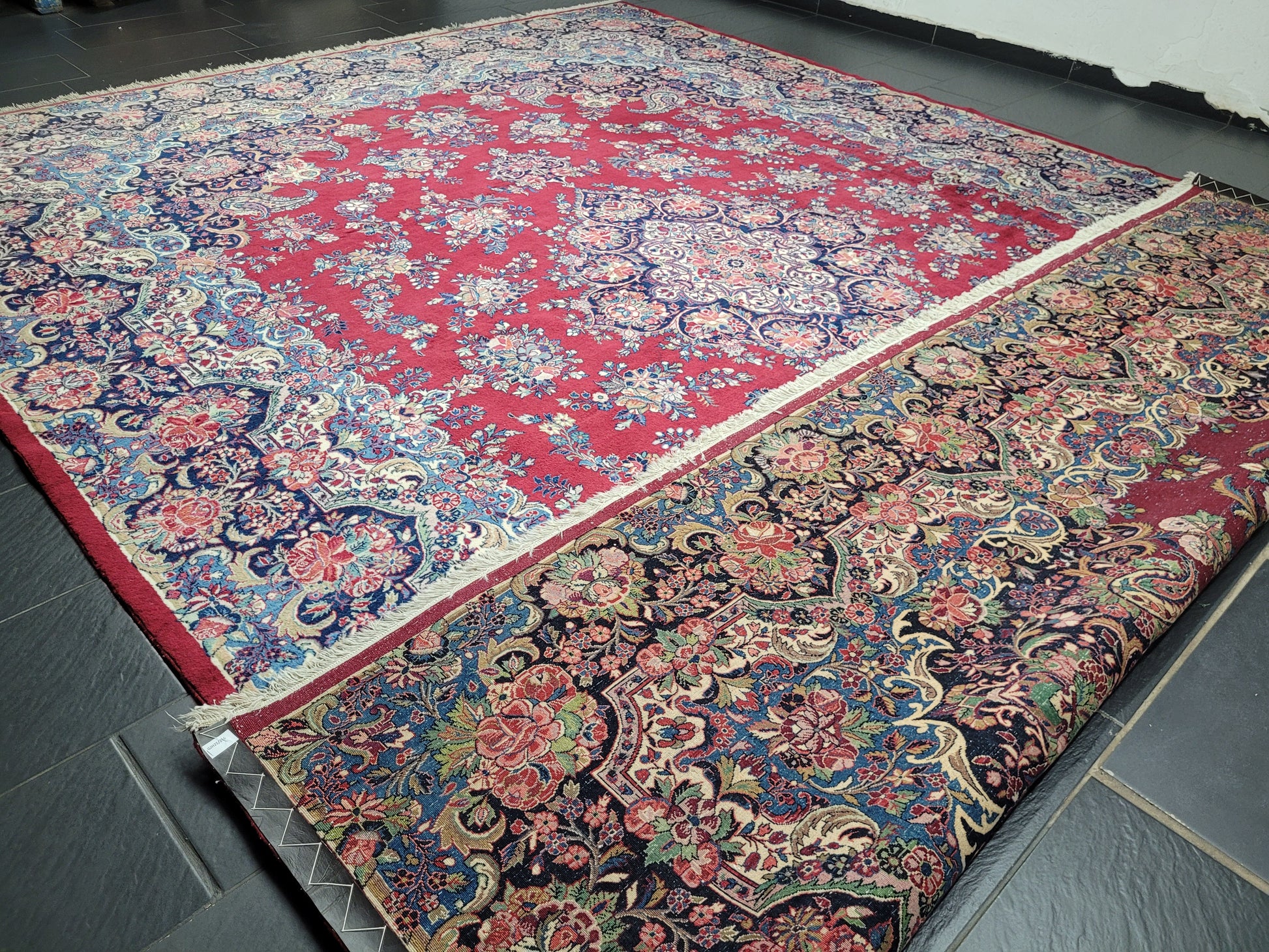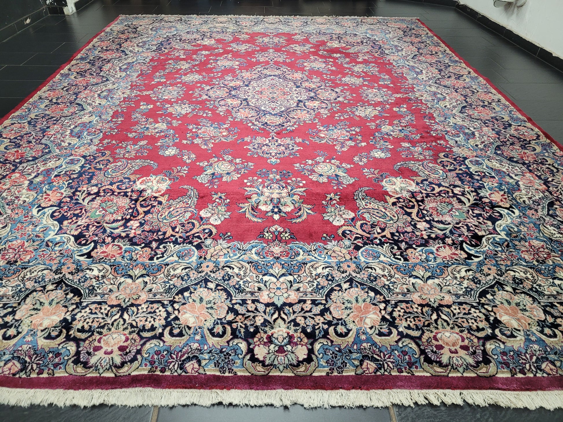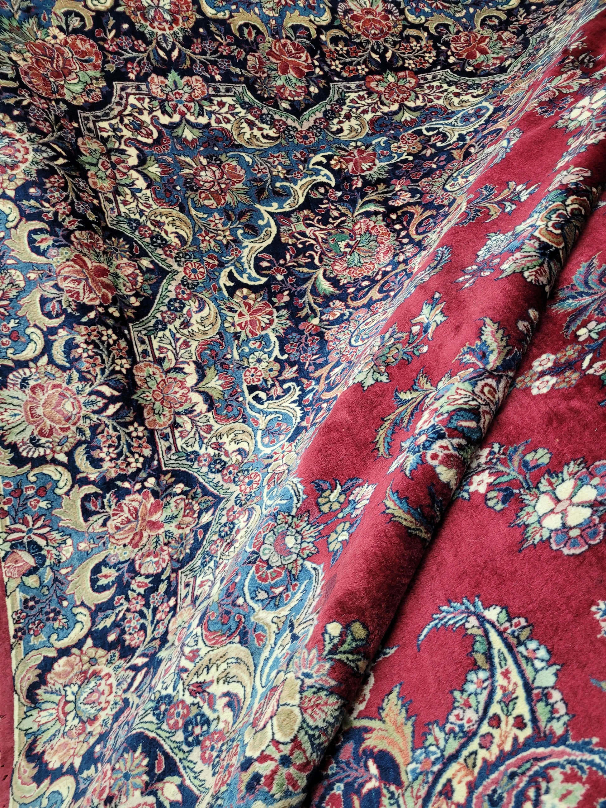 angeboten wird ein imposanter Mesched Teppich aus feinster Korkwolle, handgeknüpft in meisterlicher Ausführung. Das zentrale Medaillonmotiv wird von einem reich ornamentierten Blütenfeld auf tiefrotem Grund umrahmt. Eine detailreich gestaltete Bordüre mit floralen Ranken und zarten Farbverläufen vollendet das harmonische Gesamtbild.