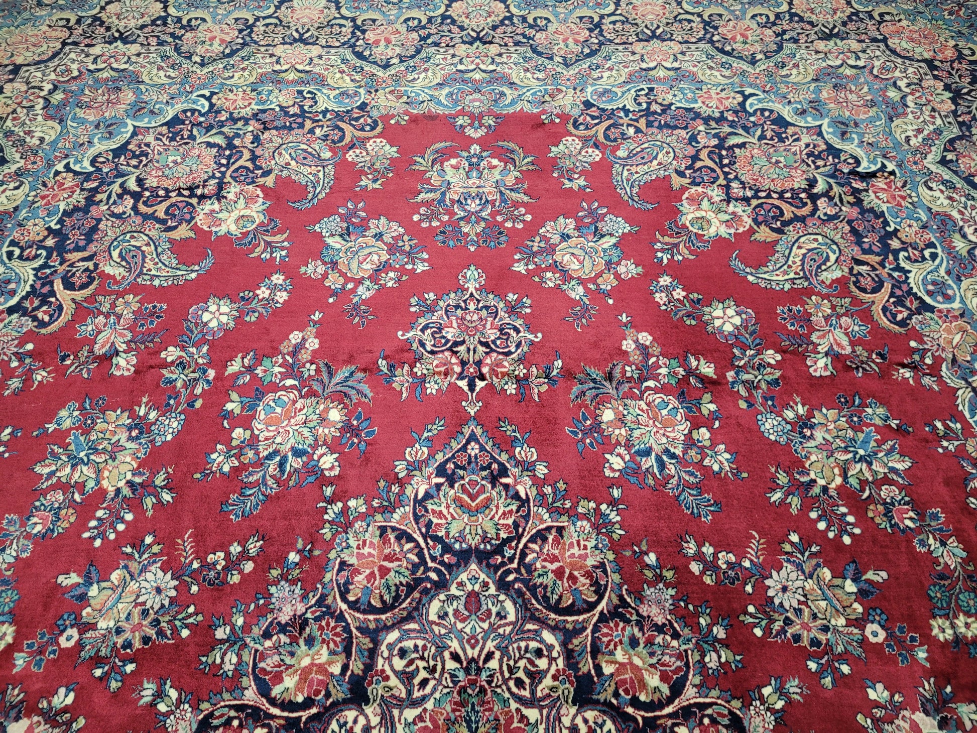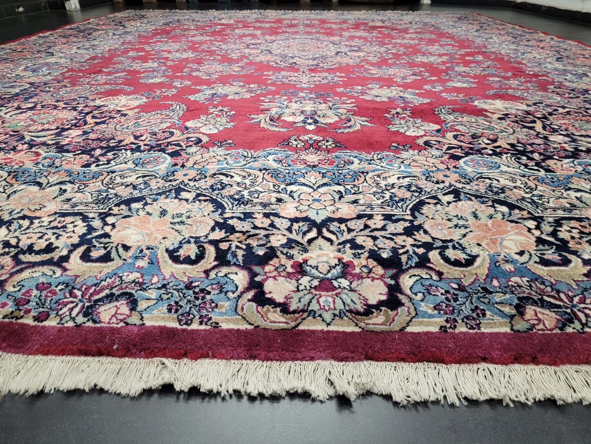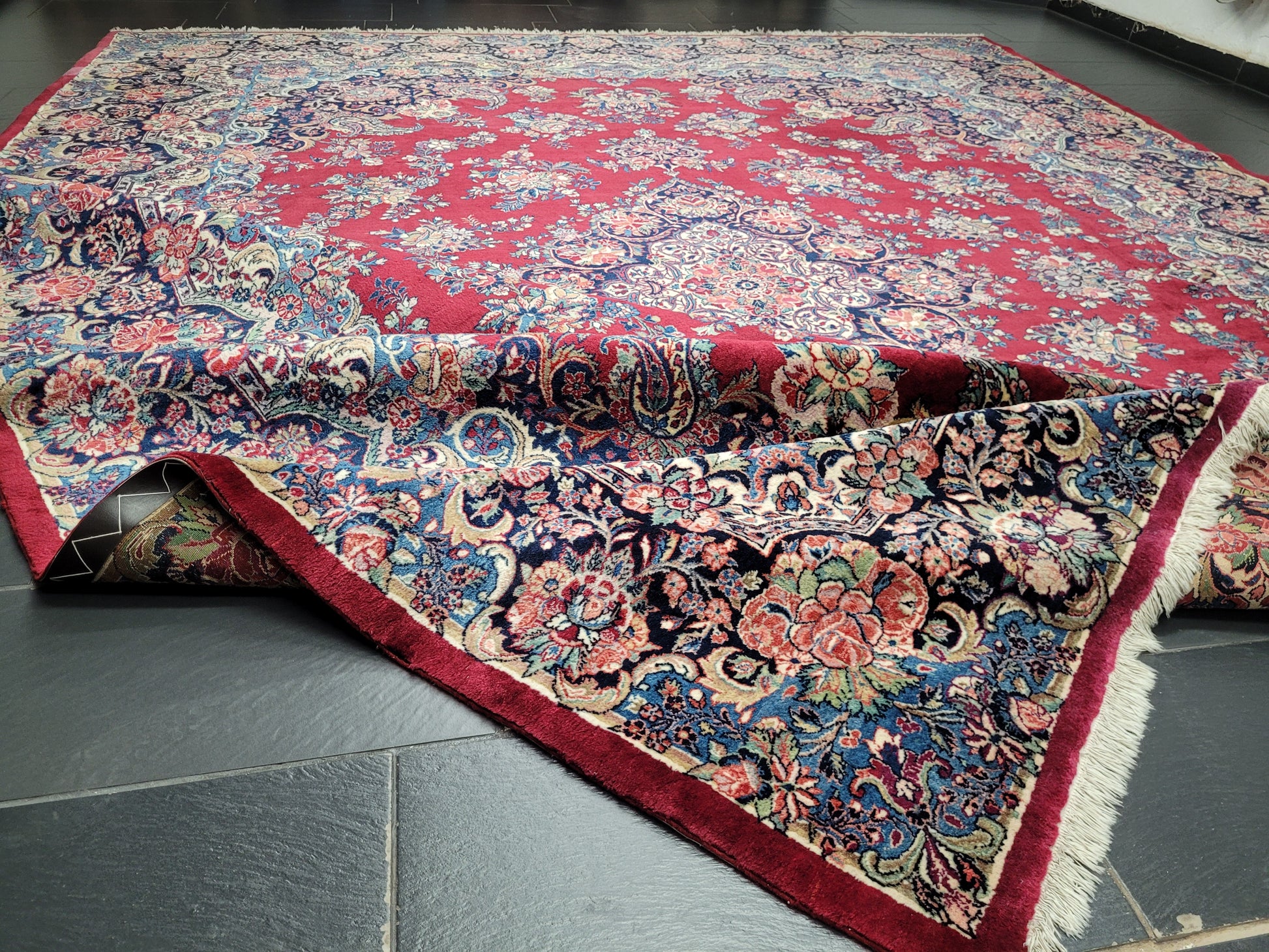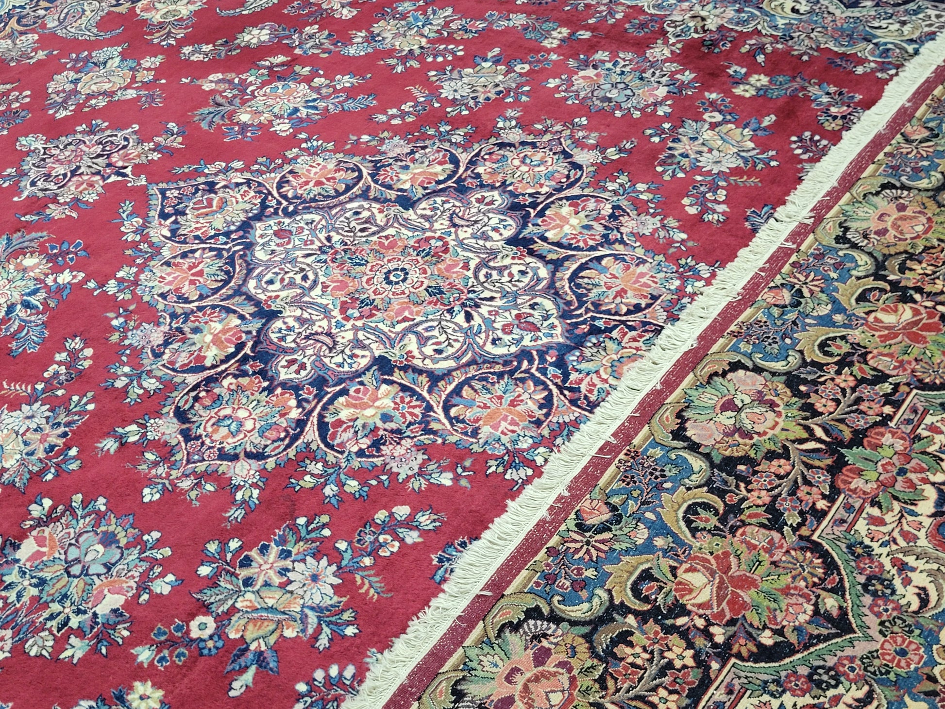 angeboten wird ein imposanter Mesched Teppich aus feinster Korkwolle, handgeknüpft in meisterlicher Ausführung. Das zentrale Medaillonmotiv wird von einem reich ornamentierten Blütenfeld auf tiefrotem Grund umrahmt. Eine detailreich gestaltete Bordüre mit floralen Ranken und zarten Farbverläufen vollendet das harmonische Gesamtbild.