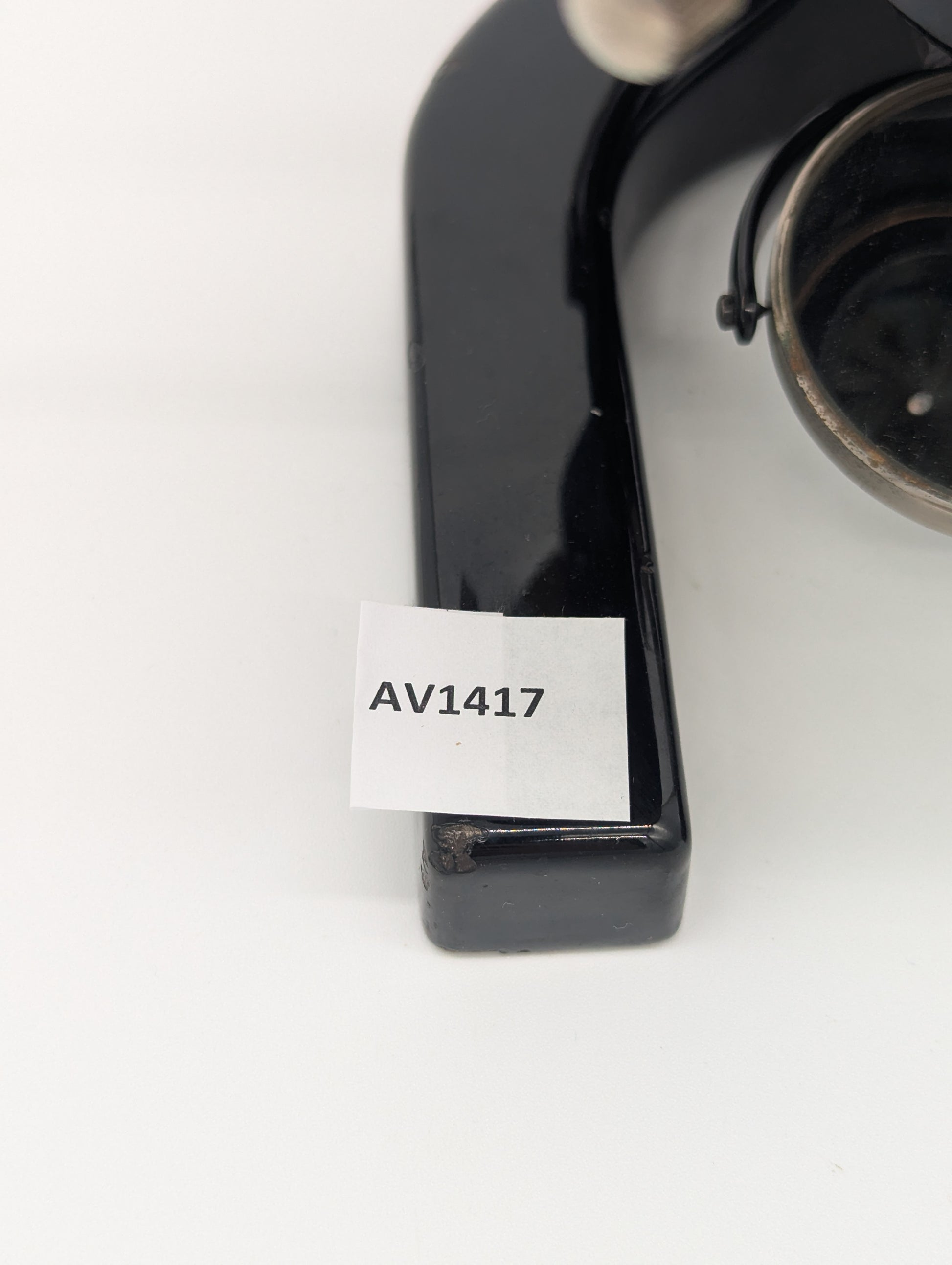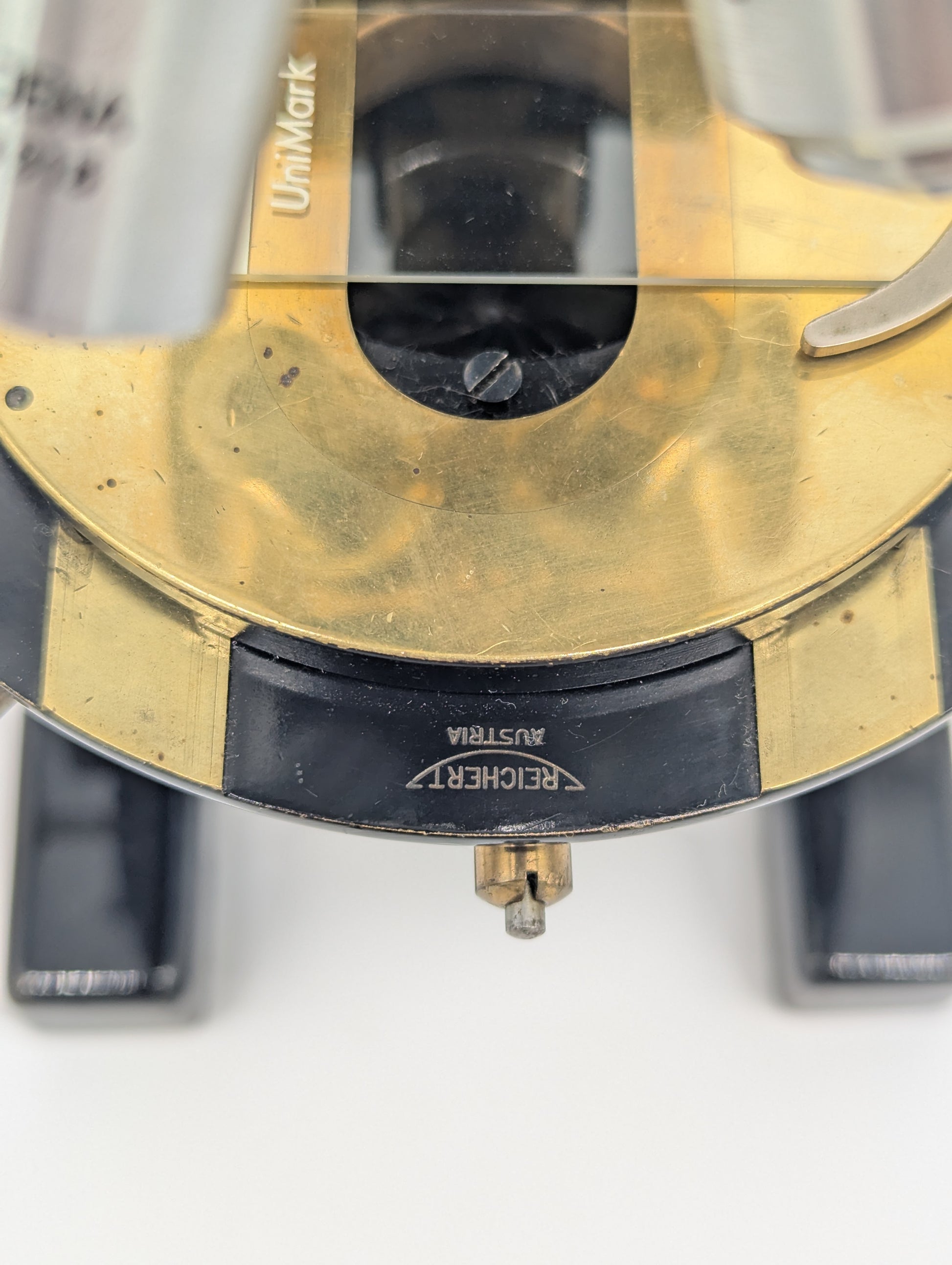 Dieses Mikroskop der Marke Reichert Austria ist ein klassisches Präzisionsinstrument und zugleich ein schönes Sammlerstück. Mit seinem soliden Metallkörper, kombiniert aus schwarz lackierten und messingfarbenen Elementen, verkörpert es die hochwertige Verarbeitung vergangener Jahrzehnte.