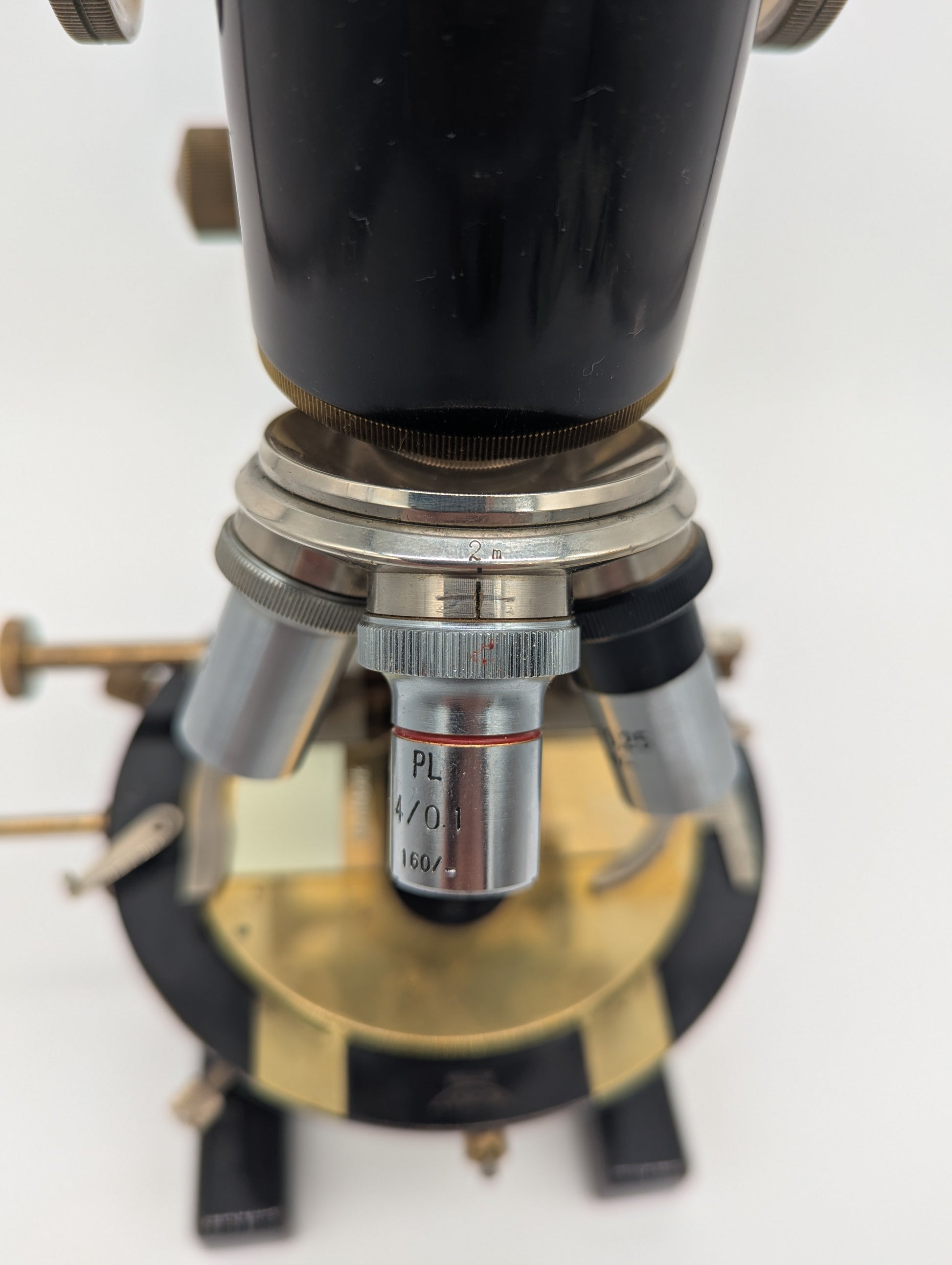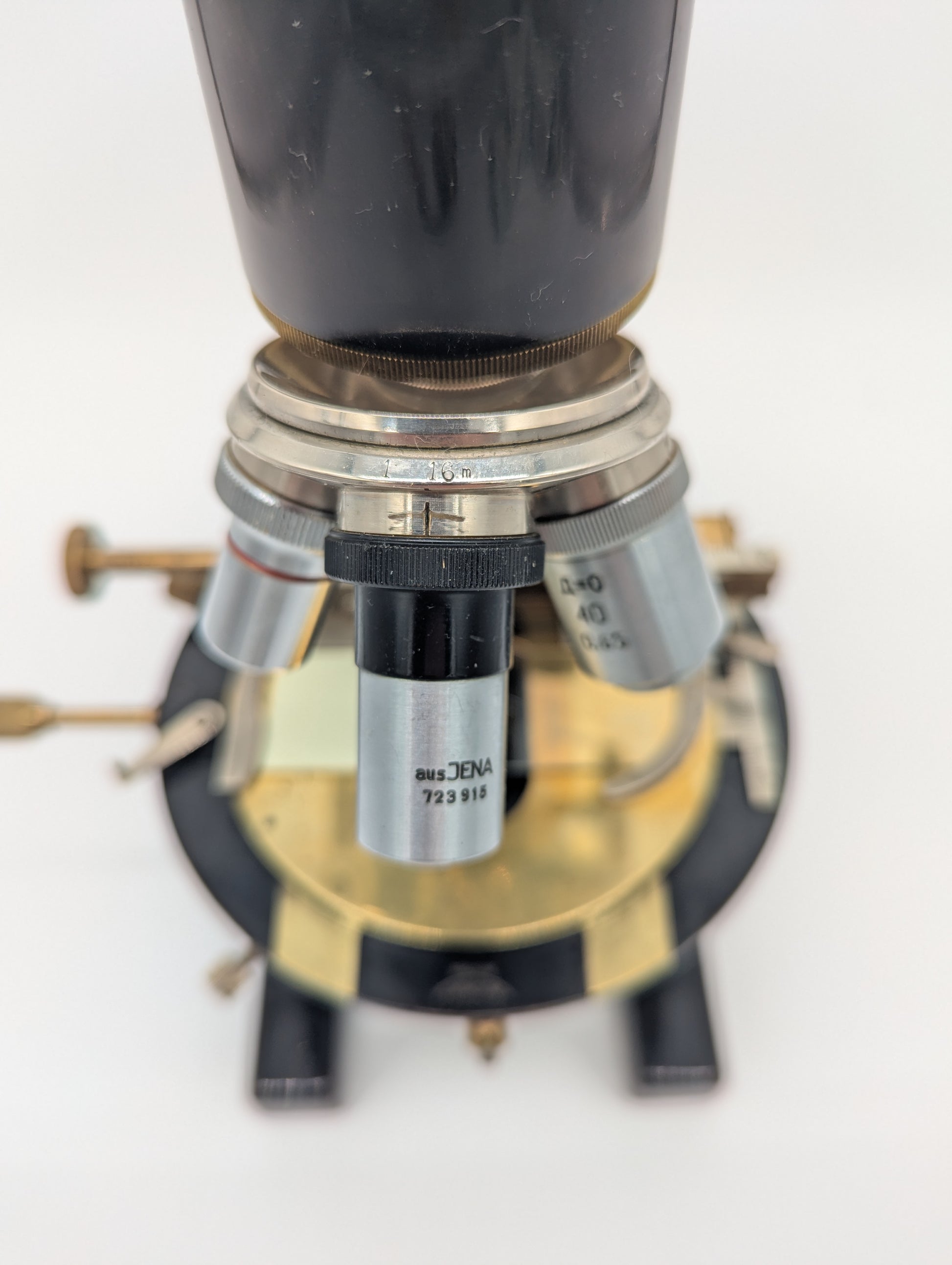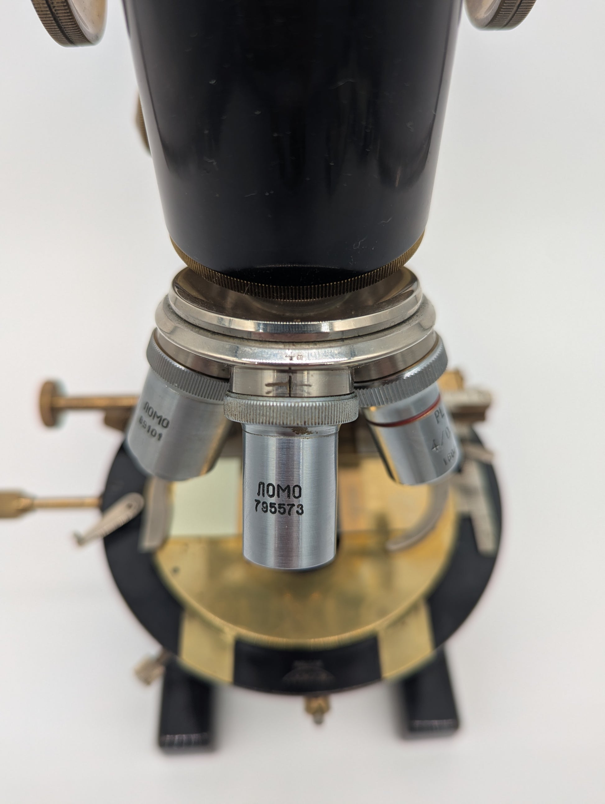 Das Mikroskop ist mit einem drehbaren Objektivrevolver ausgestattet, bestückt mit mehreren Objektiven (u. a. Jena und Lomo), die verschiedene Vergrößerungen ermöglichen. Ein stabiler Kreuztisch mit Führungen sorgt für exakte Positionierung der Präparate, während ein Spiegel unterhalb des Tisches zur Beleuchtung dient. Die Feineinstellung erfolgt über seitliche Stellräder, die eine präzise Scharfstellung ermöglichen.