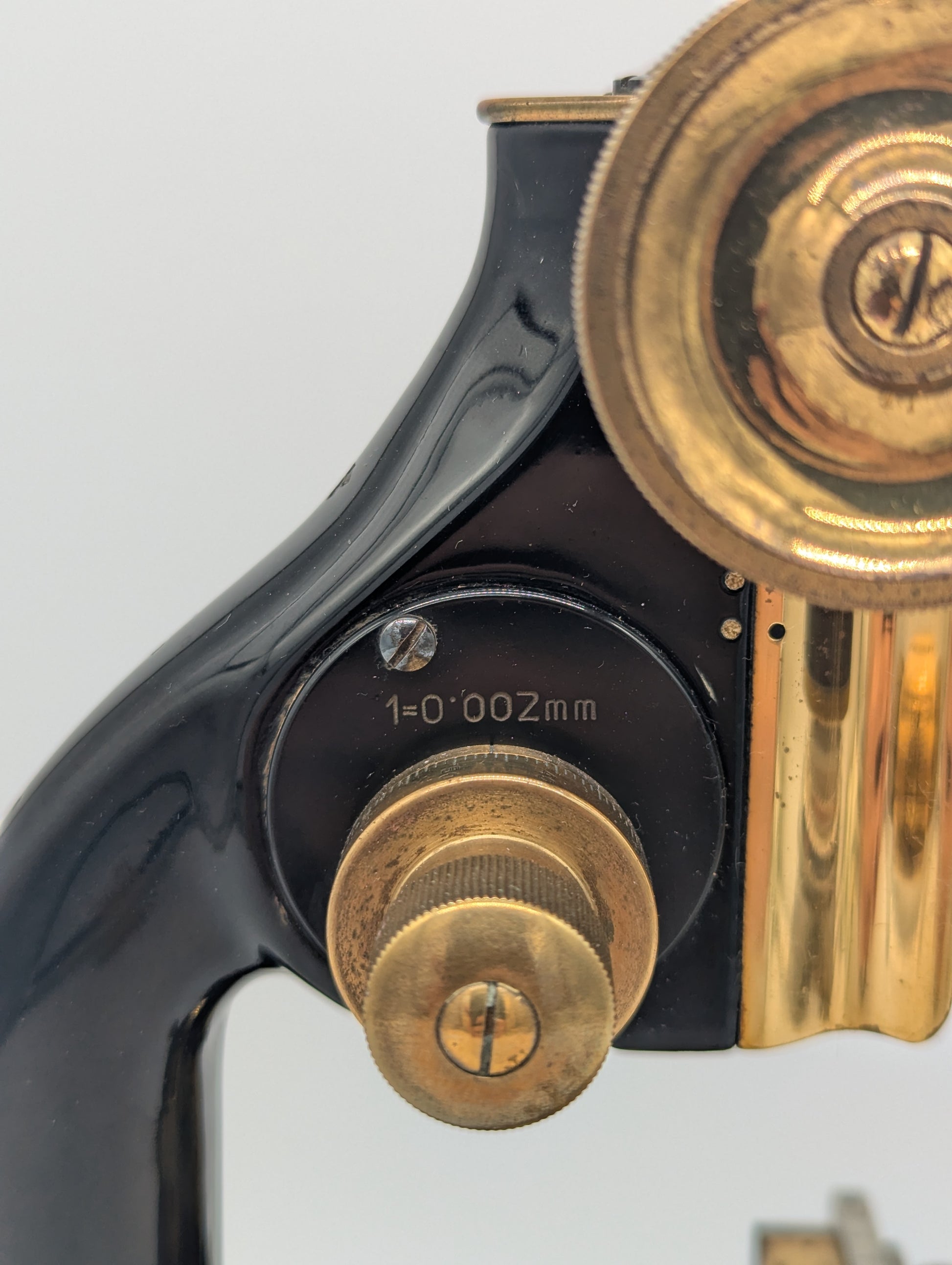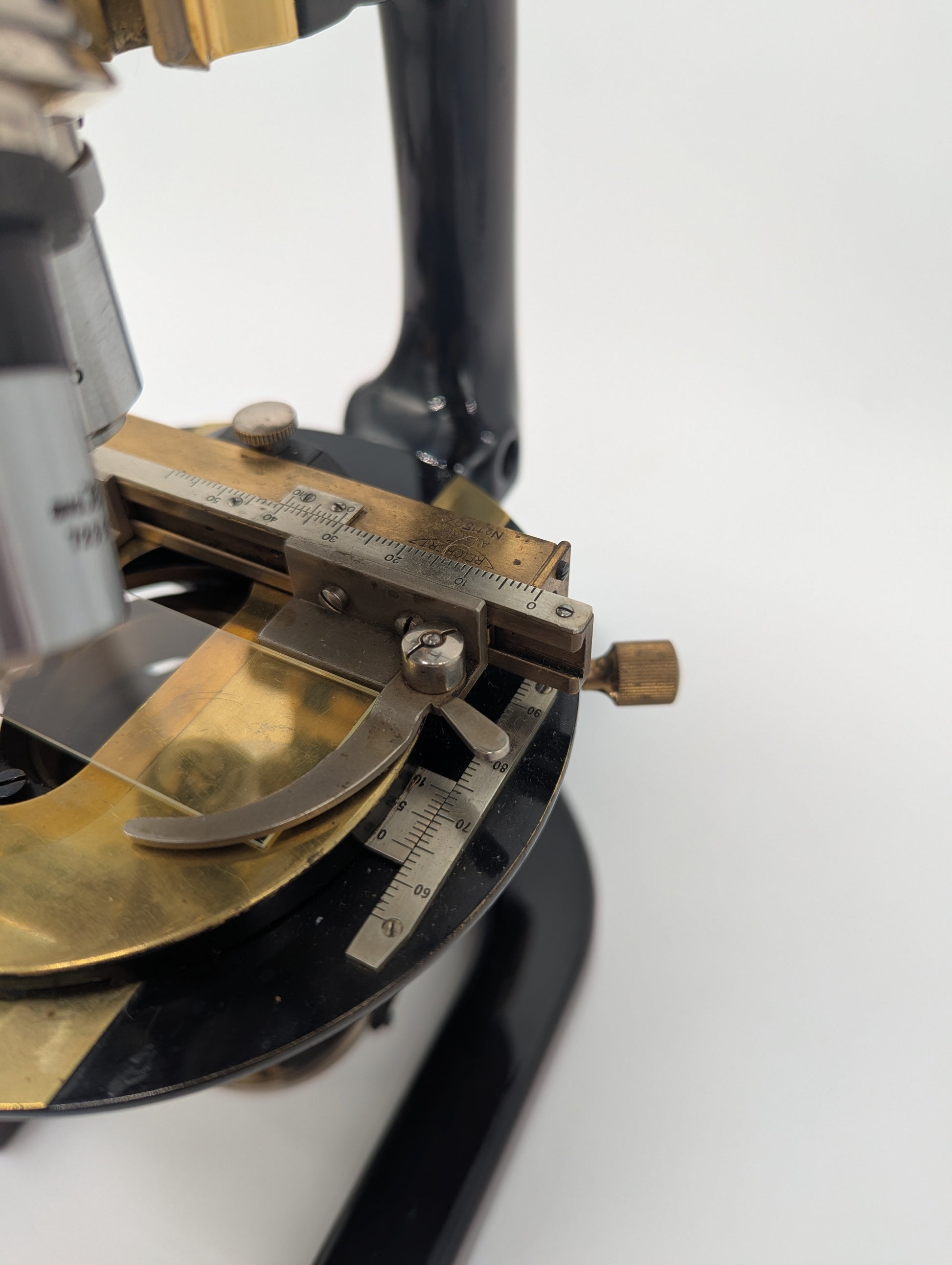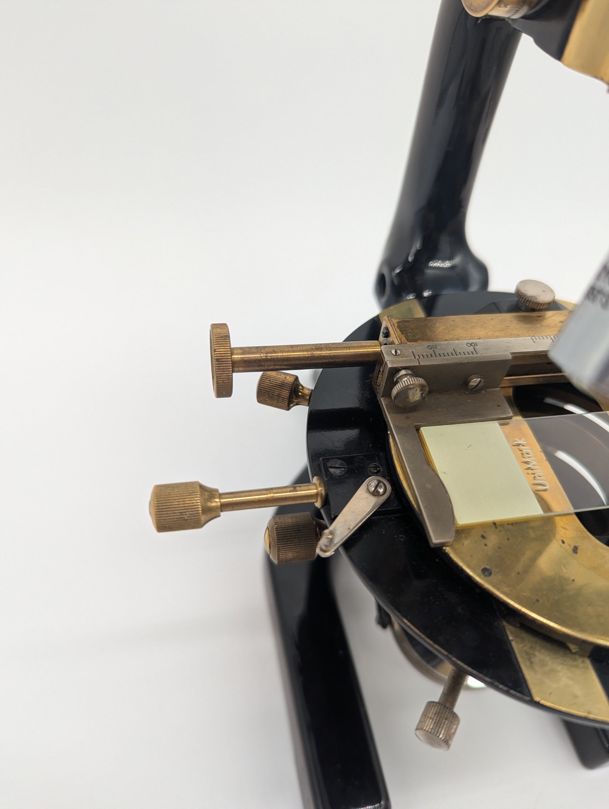 Das Mikroskop ist mit einem drehbaren Objektivrevolver ausgestattet, bestückt mit mehreren Objektiven (u. a. Jena und Lomo), die verschiedene Vergrößerungen ermöglichen. Ein stabiler Kreuztisch mit Führungen sorgt für exakte Positionierung der Präparate, während ein Spiegel unterhalb des Tisches zur Beleuchtung dient. Die Feineinstellung erfolgt über seitliche Stellräder, die eine präzise Scharfstellung ermöglichen.