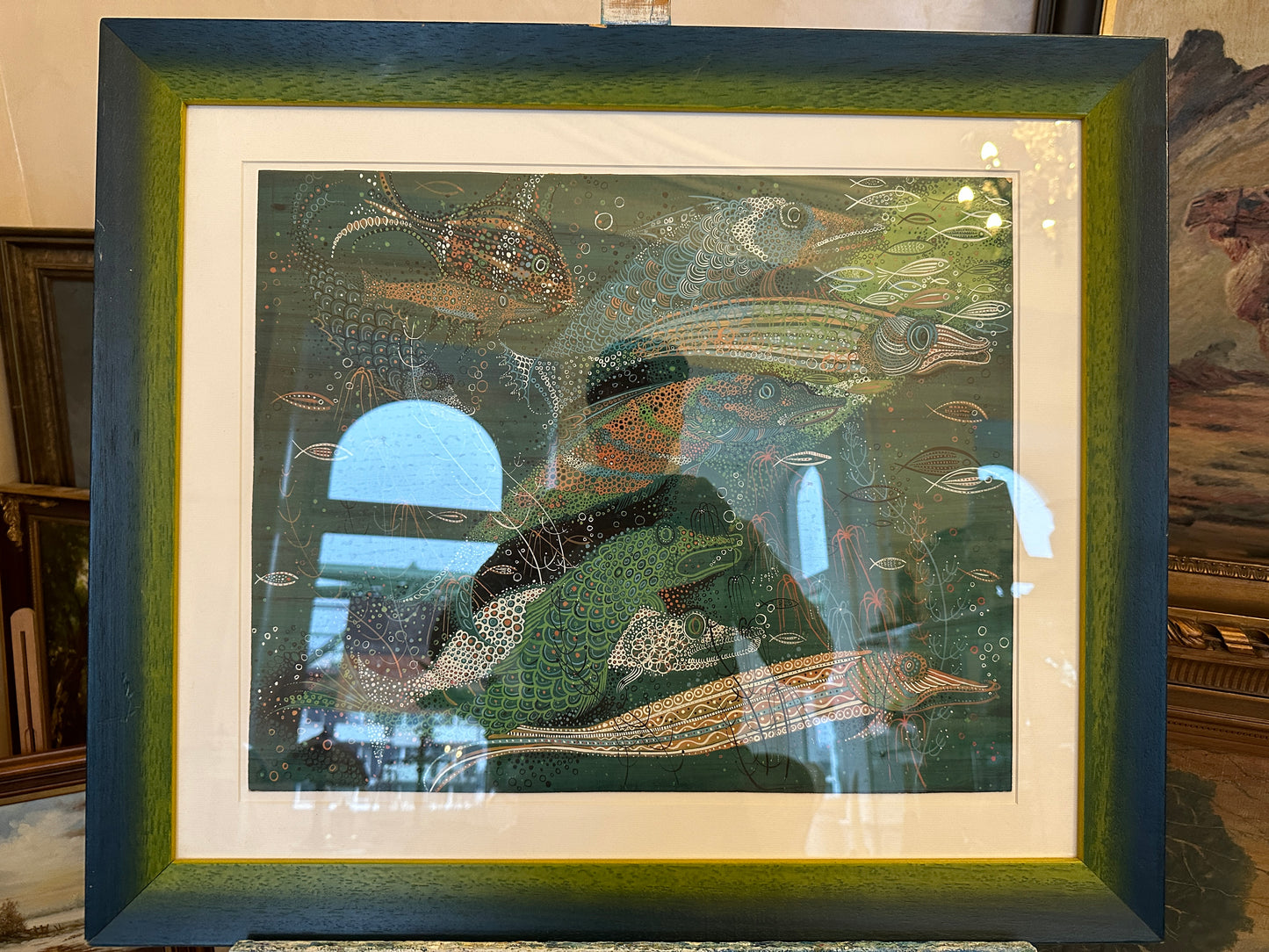 Beschreibung: Bringen Sie mit dieser modernen Grafik (XX) in Ihre Wohnräume Leben und Lebendigkeit. Das abstrakte Motiv einer Unterwasserwelt mit Fischen fasziniert und eignet sich perfekt für einen zeitgemäßen Haushalt. Das Kunstwerk befindet sich in einem sehr guten Zustand, wie auf den beigefügten Fotos dokumentiert.
