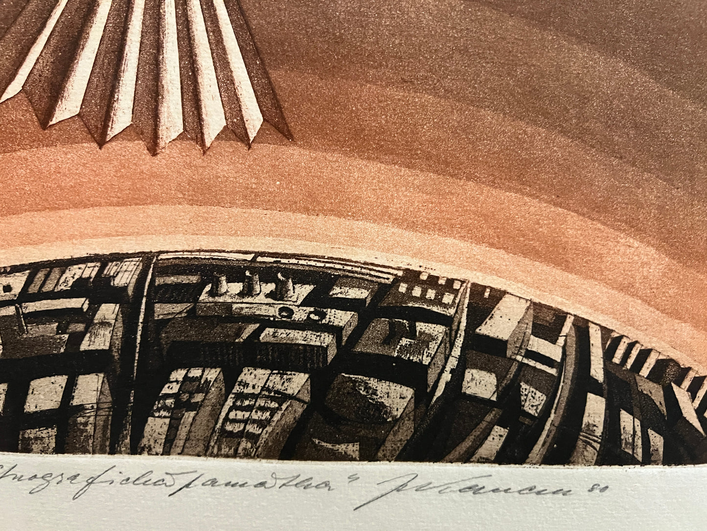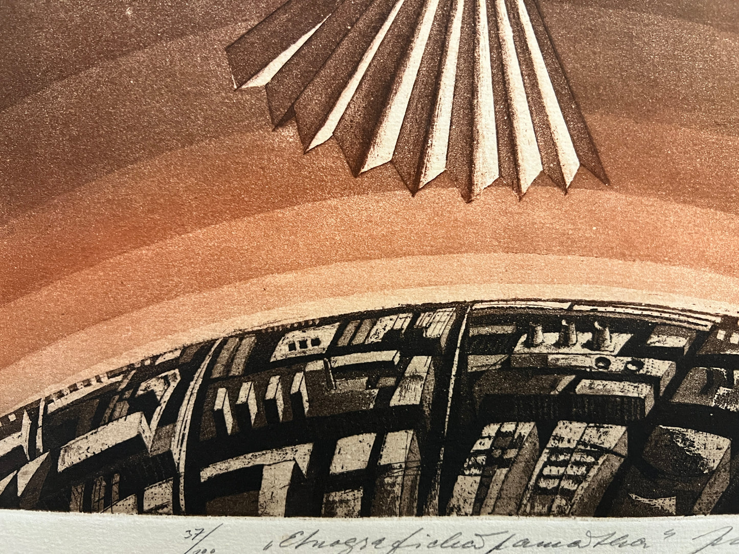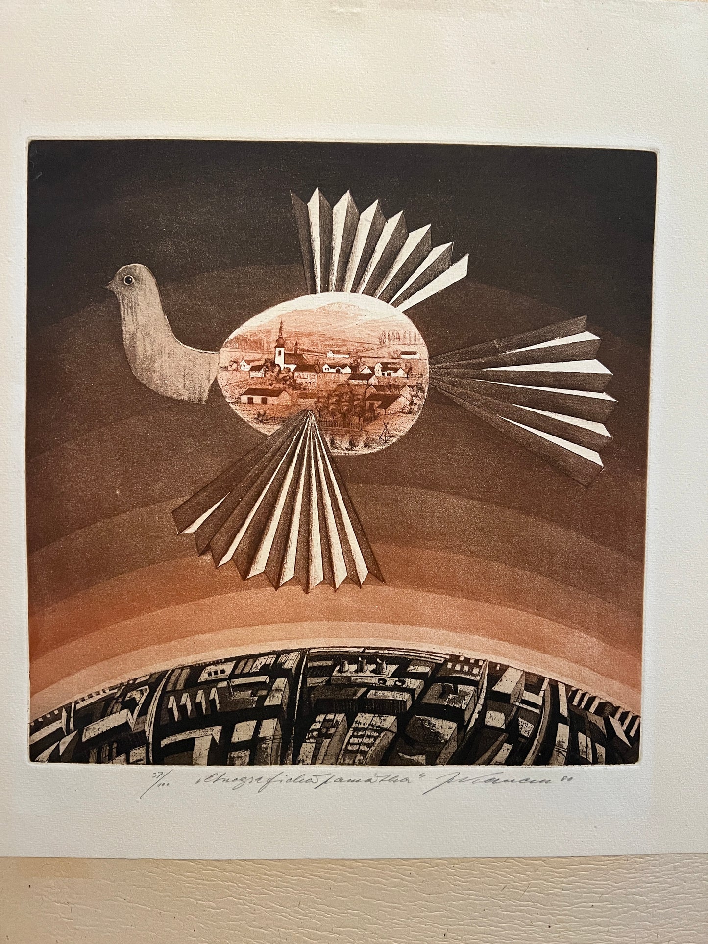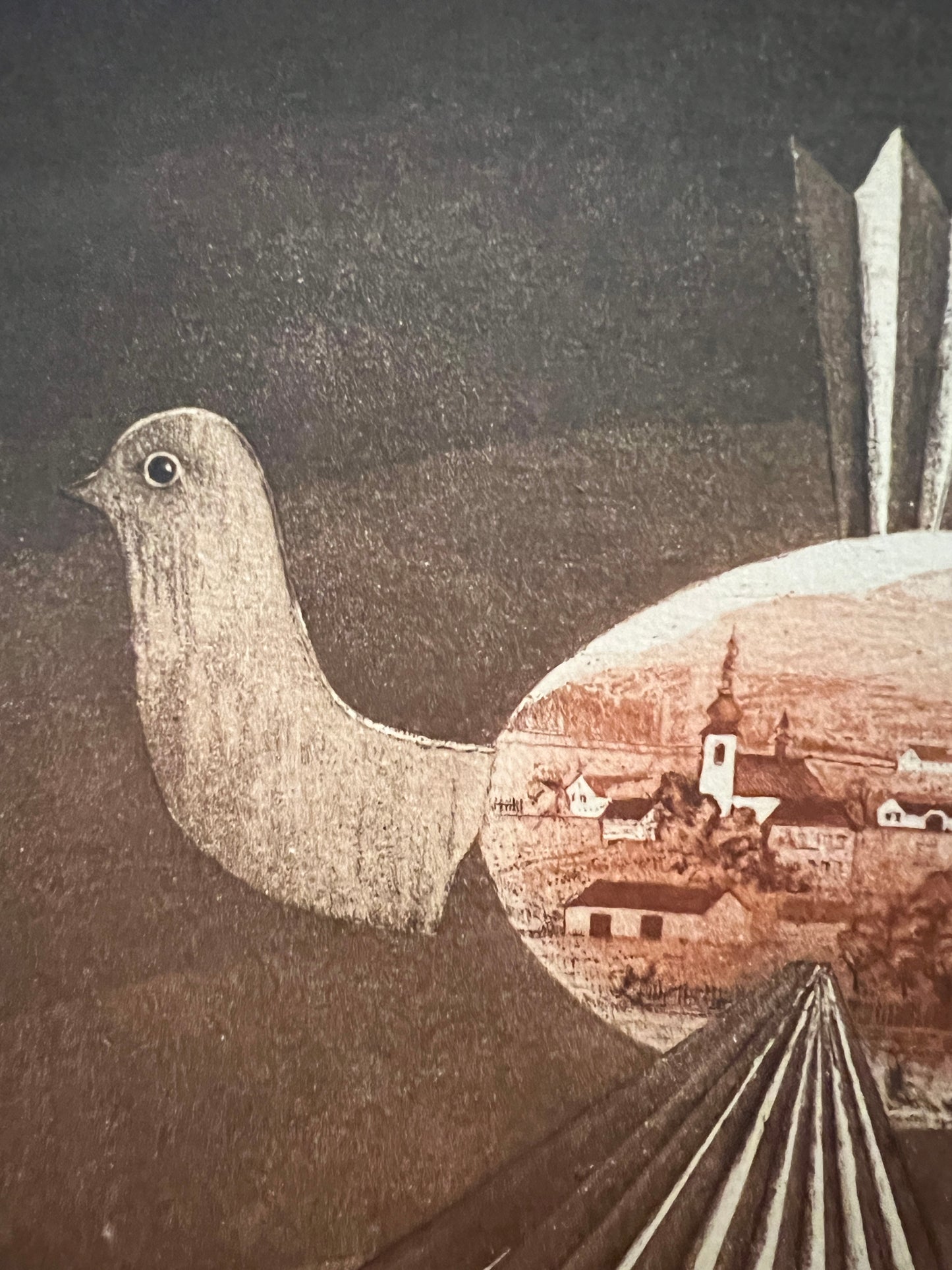 Beschreibung: Diese originale Farbradierung aus der modernen Malschule (XX) präsentiert eine faszinierende surrealistische Szene. Ein Vogel fliegt über eine Stadt, und im Bauch des Vogels ist ein verzerrtes Dorf zu erkennen. Die halbrunde Darstellung verleiht der Szene eine ungewöhnliche und surreale Atmosphäre. Das Werk ist handsigniert und trägt die Auflagennummer 37 von 100. Die Gesamtmaße betragen 55x45cm, wobei die Radierung selbst eine Größe von 30x30cm hat. Der Zustand des Kunstwerks ist gut, wie auf den beigefügten Fotos zu sehen ist.
