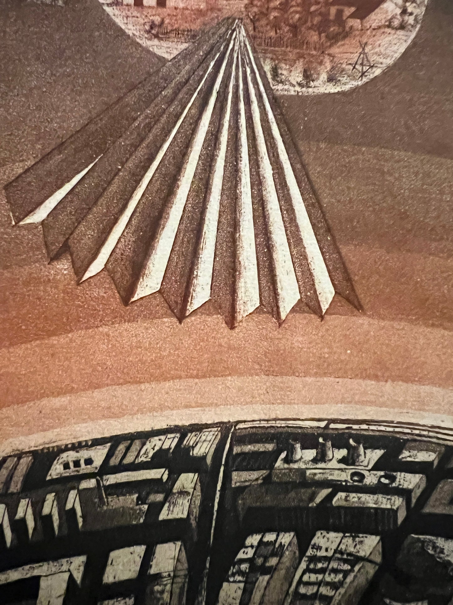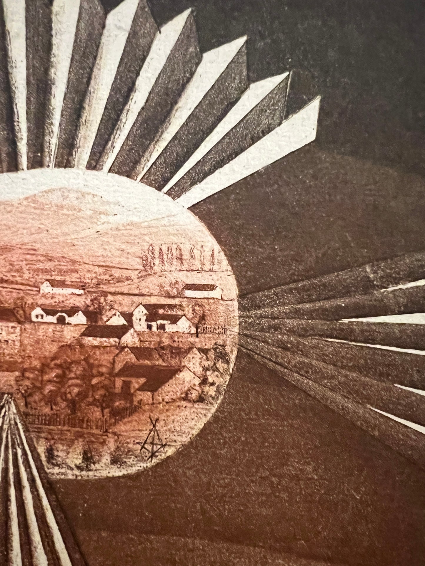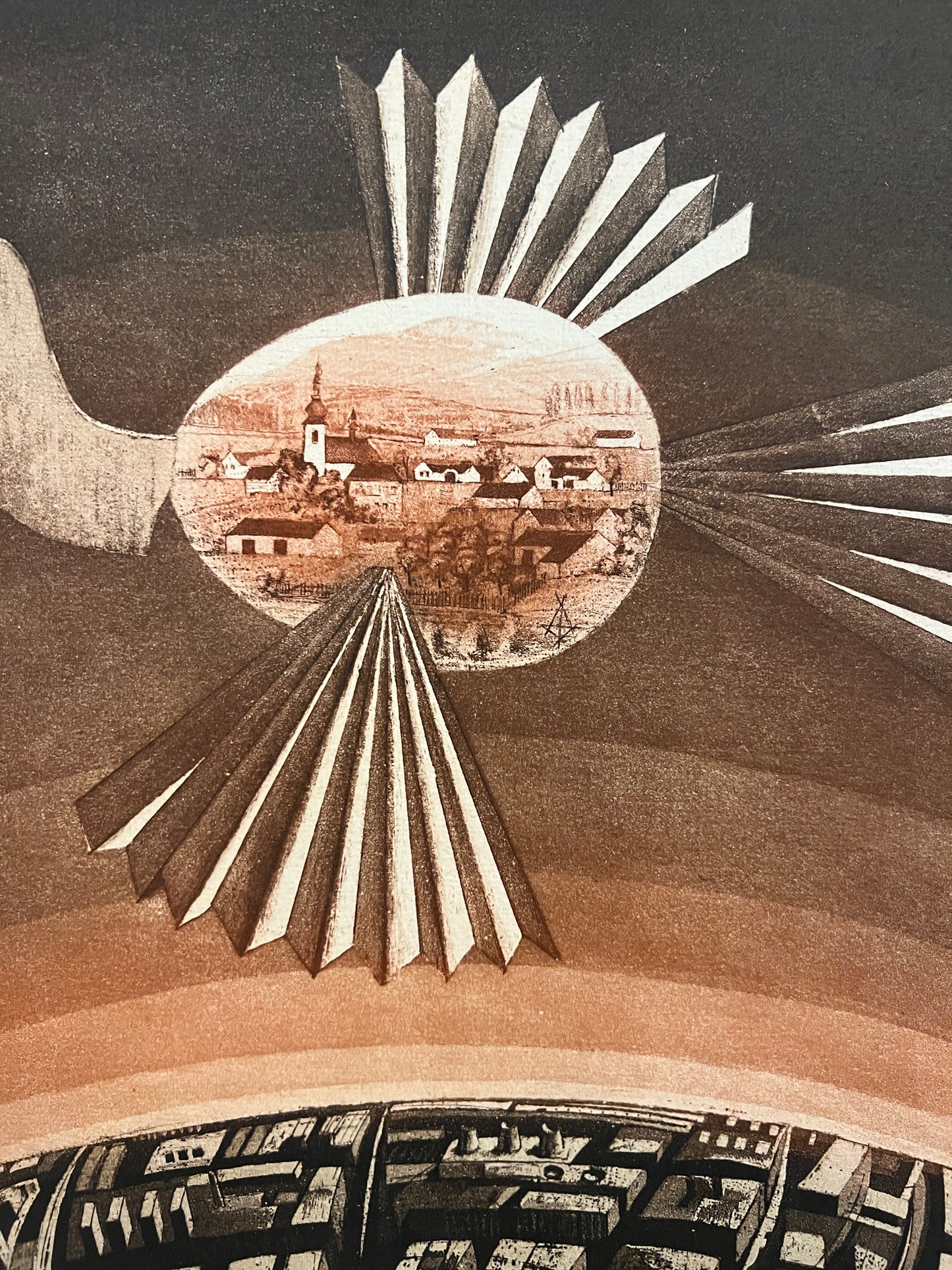 Beschreibung: Diese originale Farbradierung aus der modernen Malschule (XX) präsentiert eine faszinierende surrealistische Szene. Ein Vogel fliegt über eine Stadt, und im Bauch des Vogels ist ein verzerrtes Dorf zu erkennen. Die halbrunde Darstellung verleiht der Szene eine ungewöhnliche und surreale Atmosphäre. Das Werk ist handsigniert und trägt die Auflagennummer 37 von 100. Die Gesamtmaße betragen 55x45cm, wobei die Radierung selbst eine Größe von 30x30cm hat. Der Zustand des Kunstwerks ist gut, wie auf den beigefügten Fotos zu sehen ist.