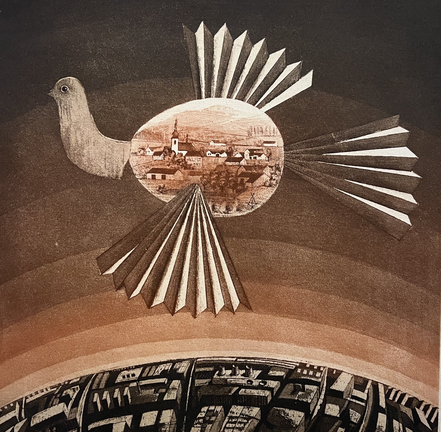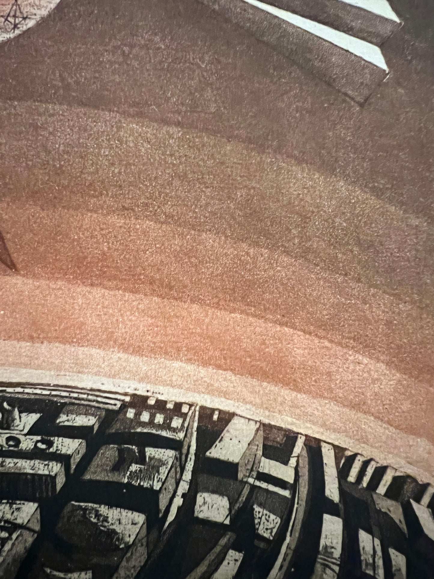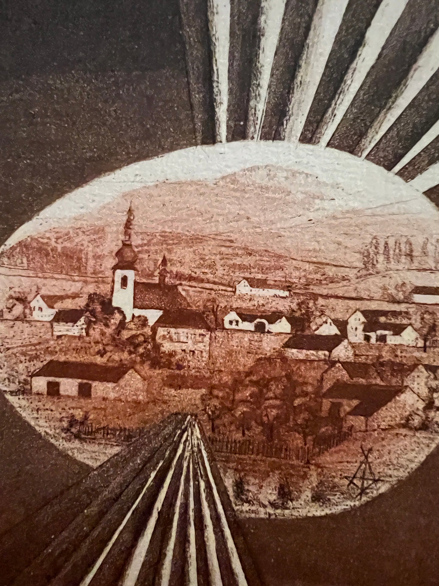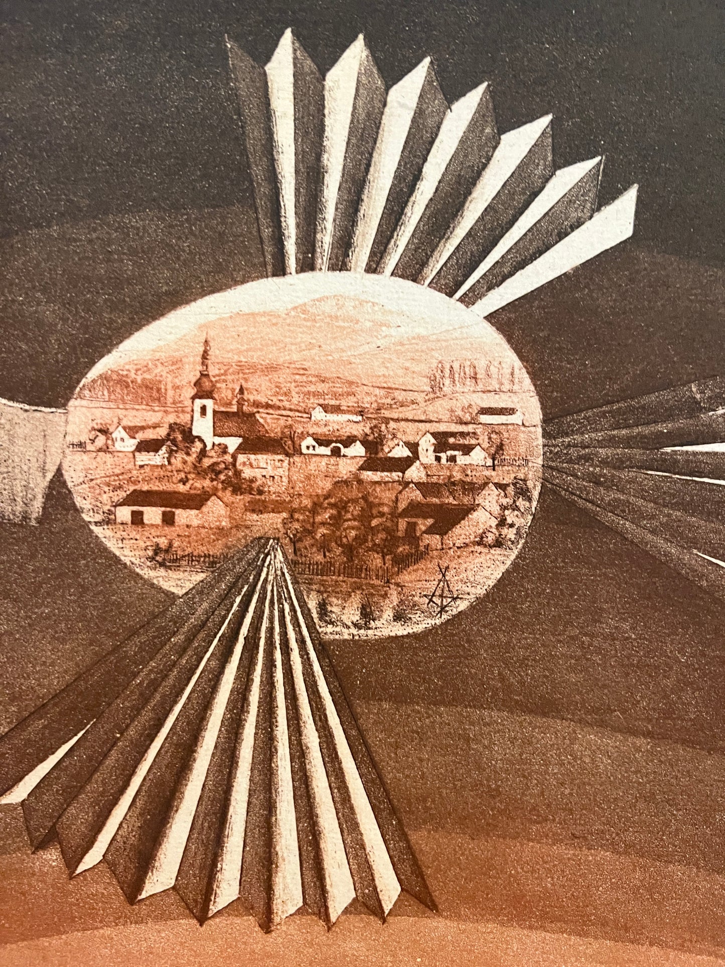 Beschreibung: Diese originale Farbradierung aus der modernen Malschule (XX) präsentiert eine faszinierende surrealistische Szene. Ein Vogel fliegt über eine Stadt, und im Bauch des Vogels ist ein verzerrtes Dorf zu erkennen. Die halbrunde Darstellung verleiht der Szene eine ungewöhnliche und surreale Atmosphäre. Das Werk ist handsigniert und trägt die Auflagennummer 37 von 100. Die Gesamtmaße betragen 55x45cm, wobei die Radierung selbst eine Größe von 30x30cm hat. Der Zustand des Kunstwerks ist gut, wie auf den beigefügten Fotos zu sehen ist.