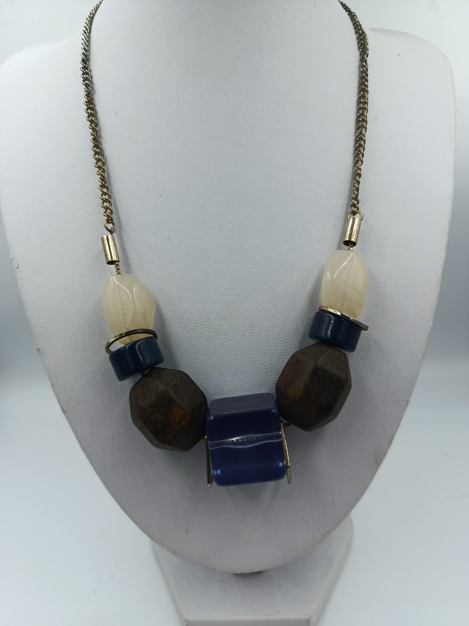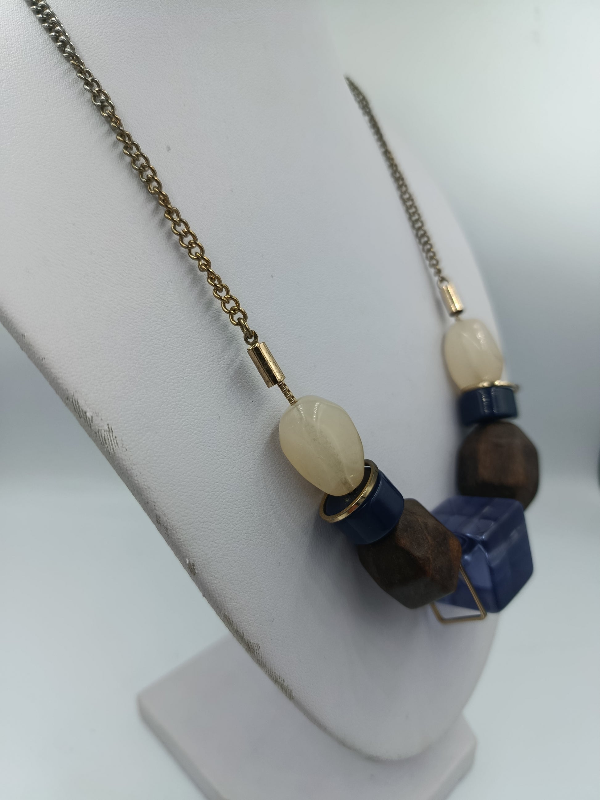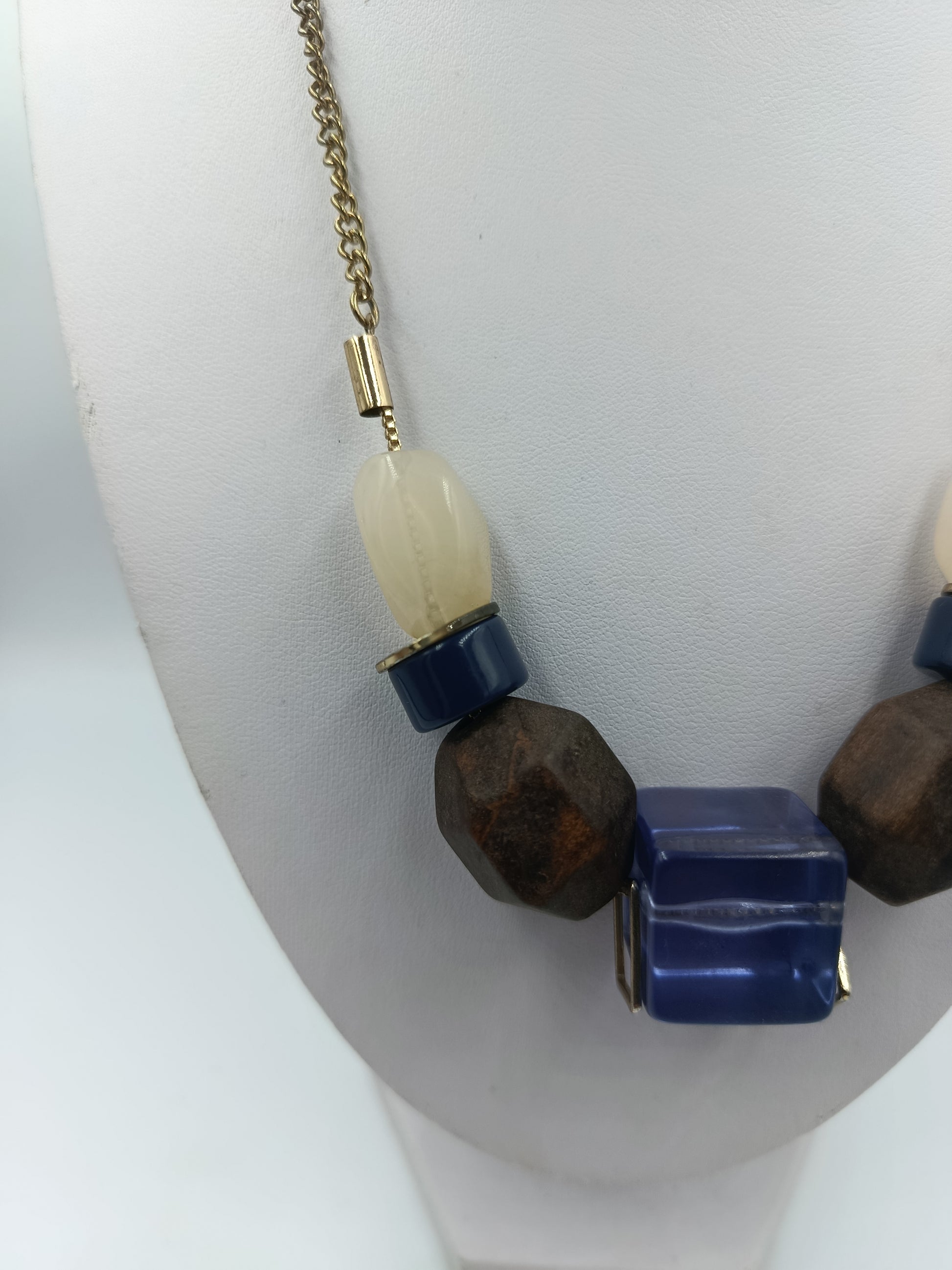 Auffällige Statement-Halskette mit großen, geometrisch geformten Perlen aus Holz und Kunststoff in Blau, Creme und Braun. Die Kette kombiniert moderne Formen mit natürlichen Materialien – perfekt, um schlichte Outfits stilvoll aufzuwerten.