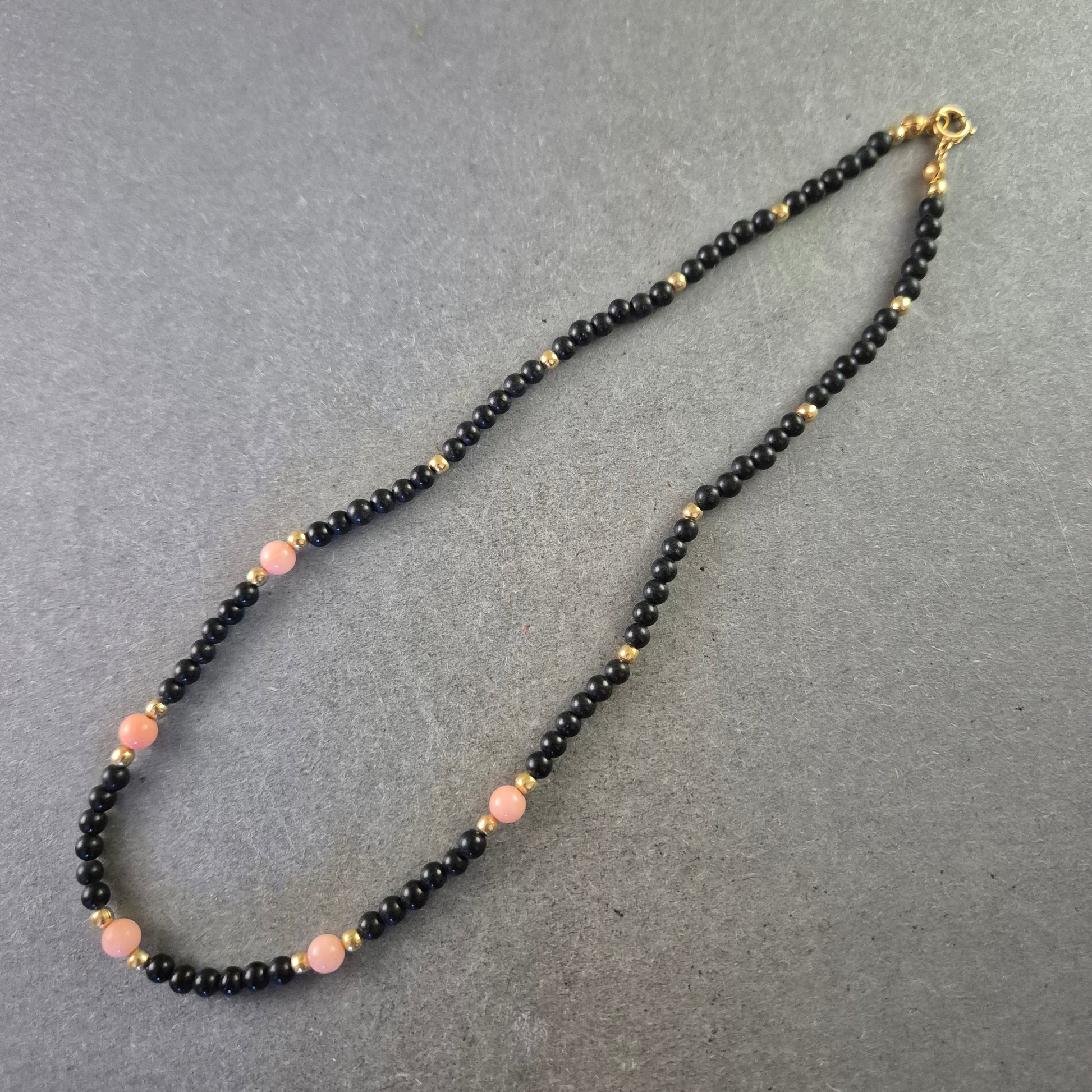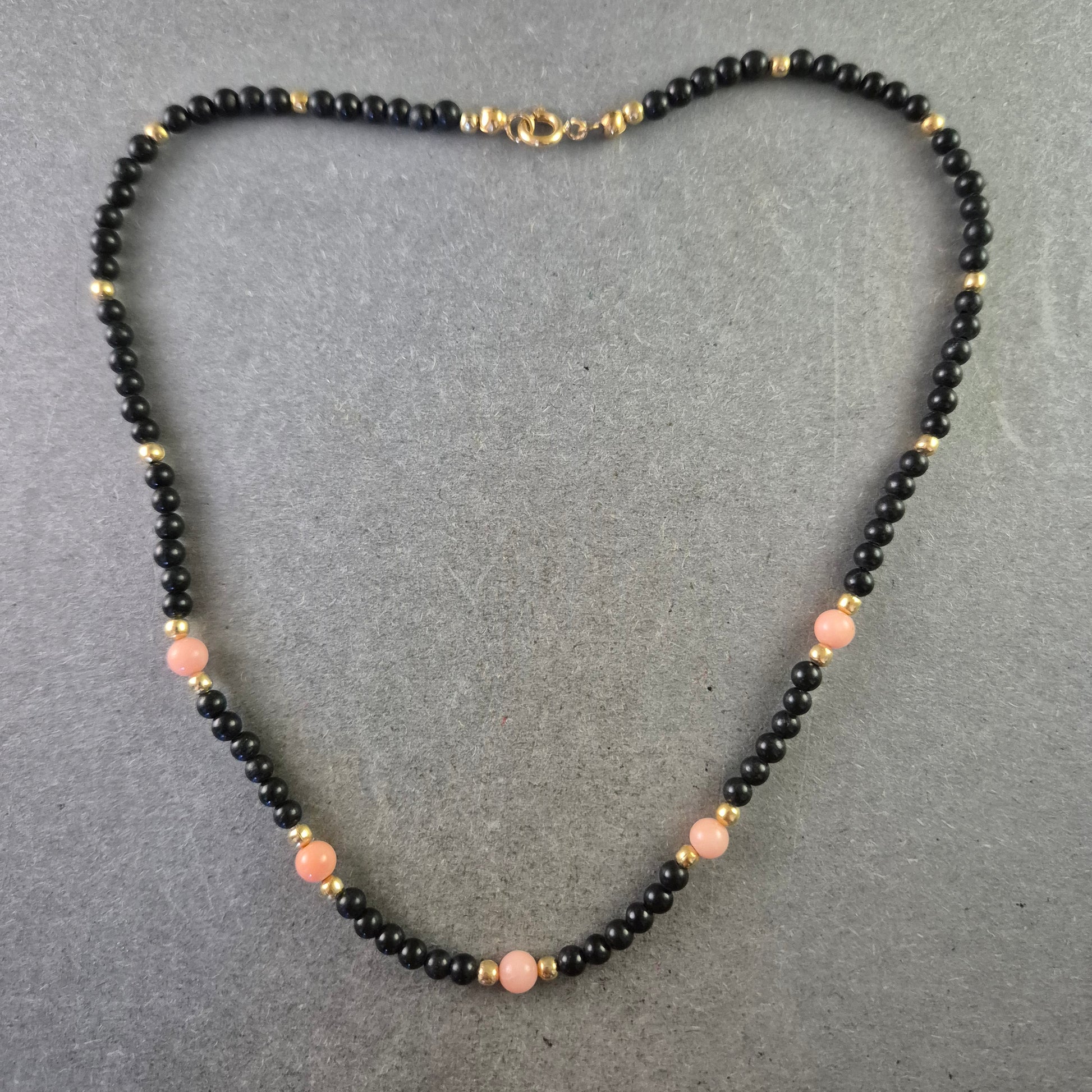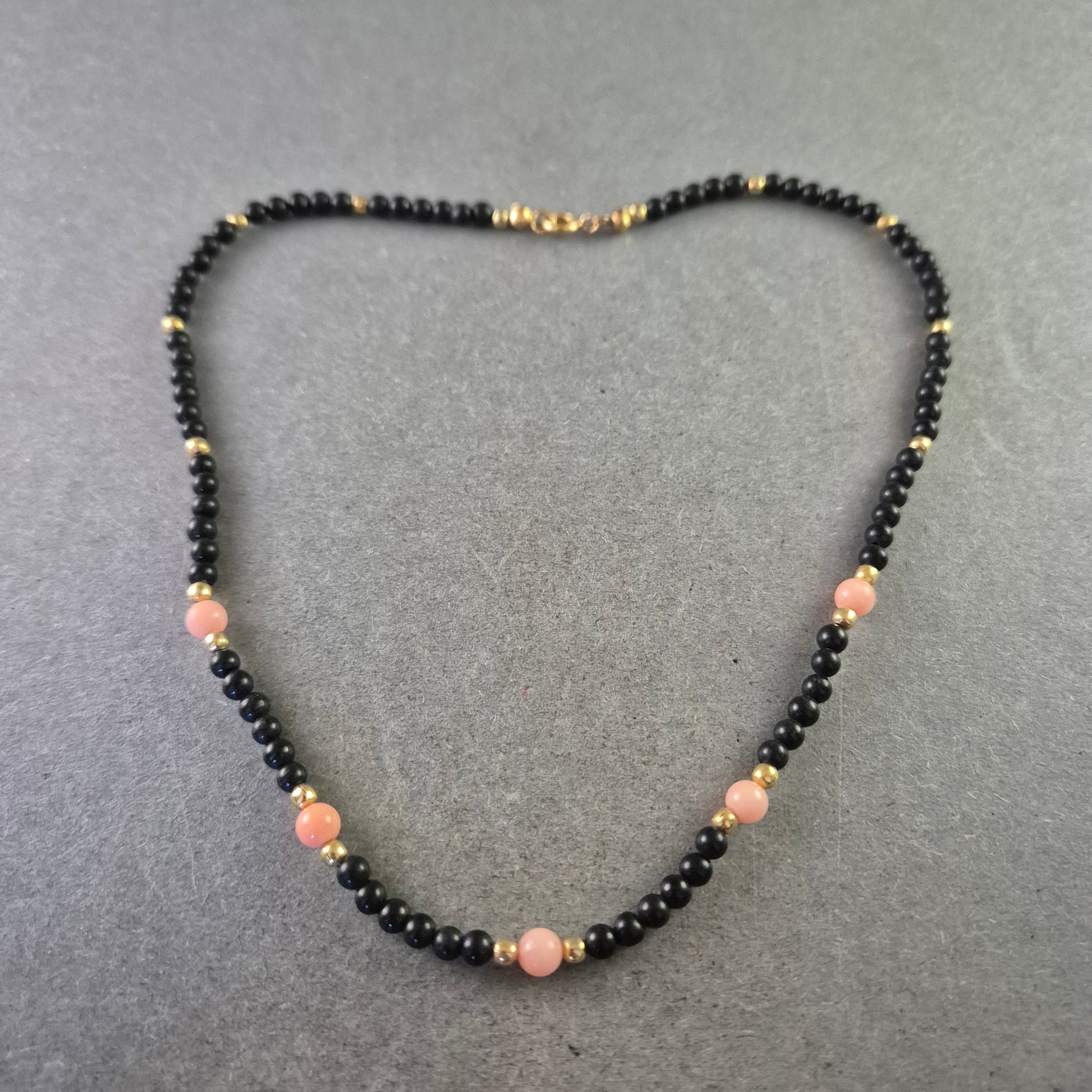 Eine stilvolle Halskette, die tiefschwarzen Onyx mit zarten Korallenrosa-Perlen kombiniert. Kleine goldfarbene Akzentperlen lockern das Design auf und verleihen ihm einen edlen Touch. Perfekt für einen modernen, aber dennoch eleganten Look.