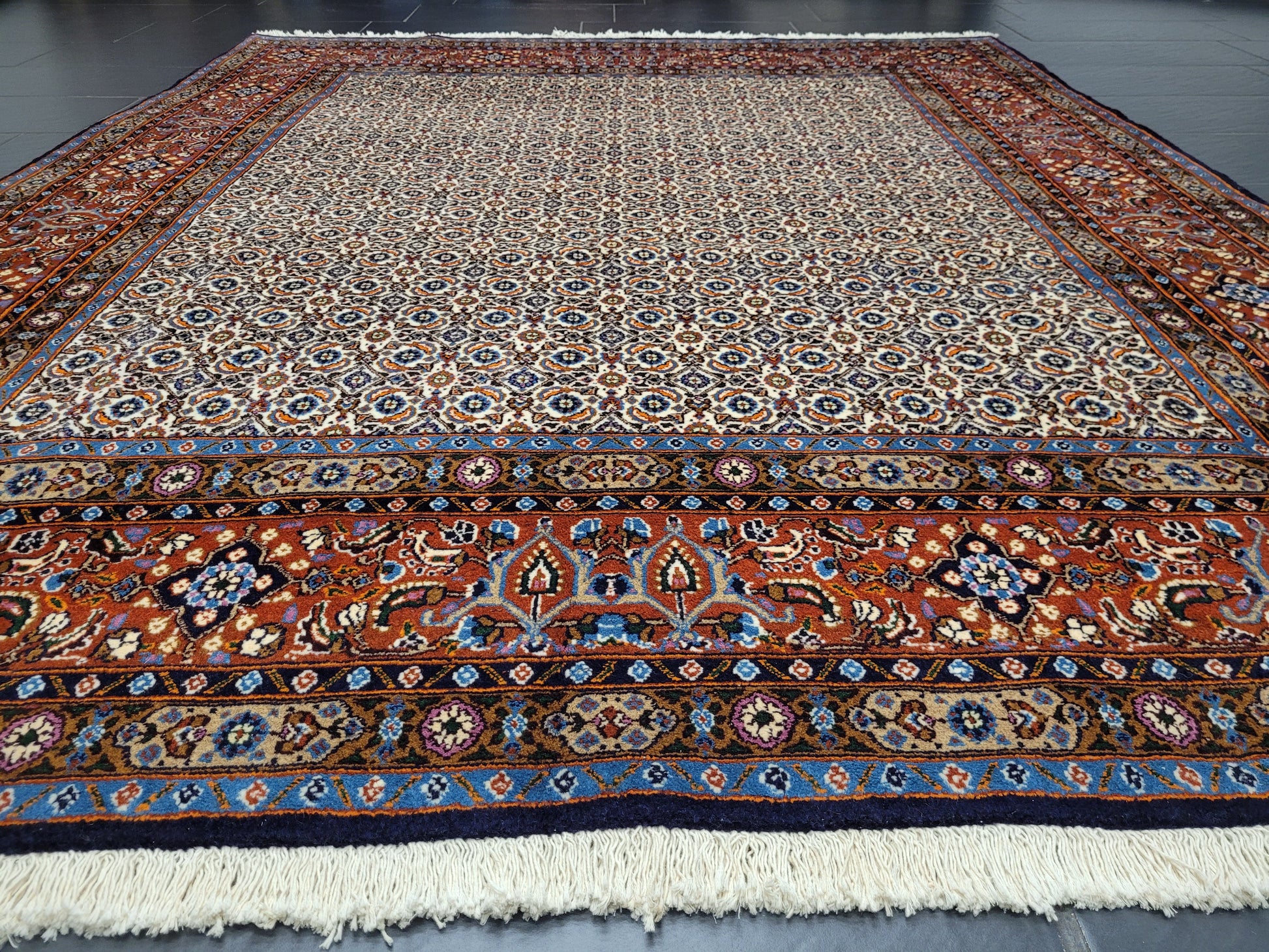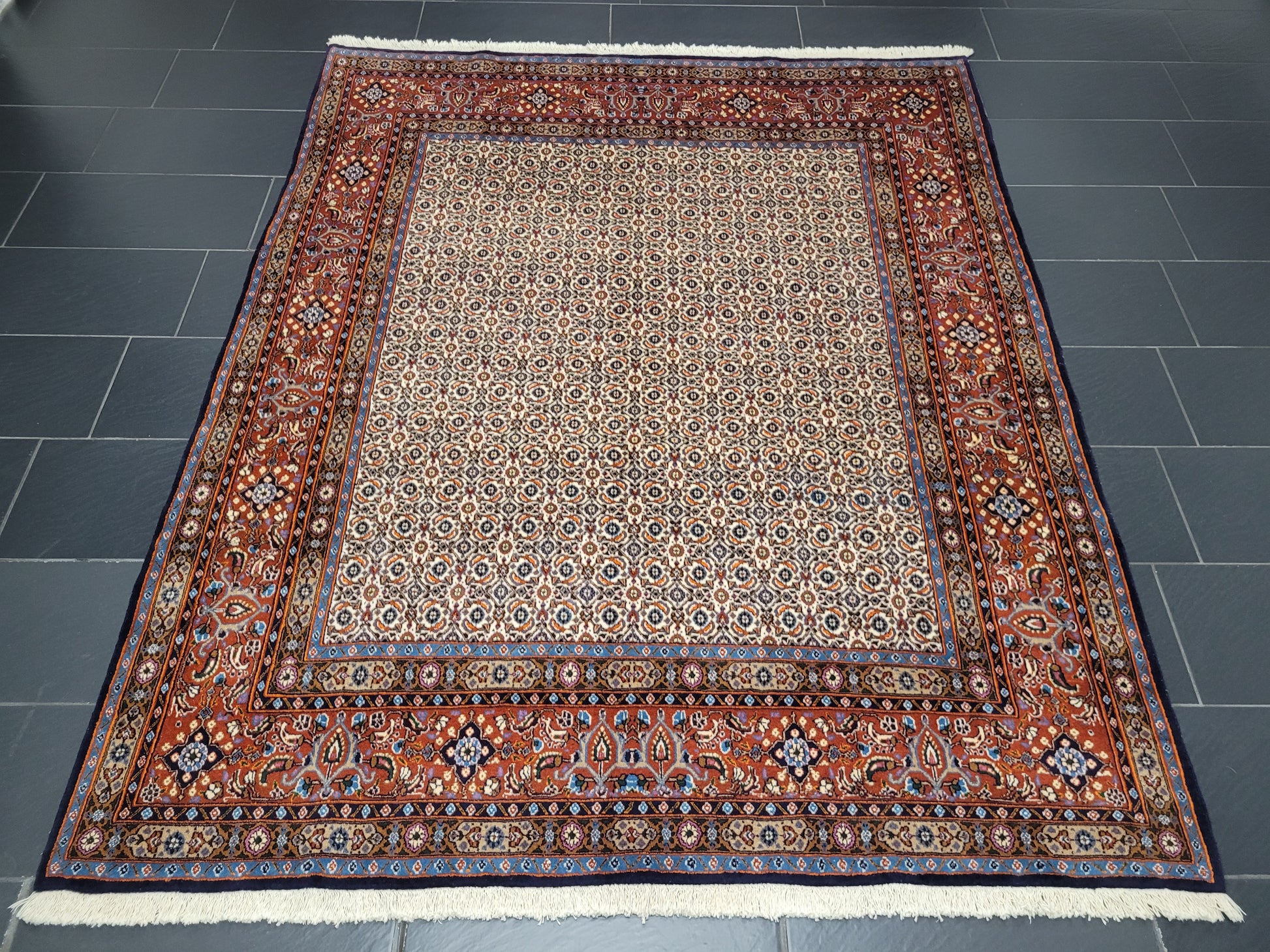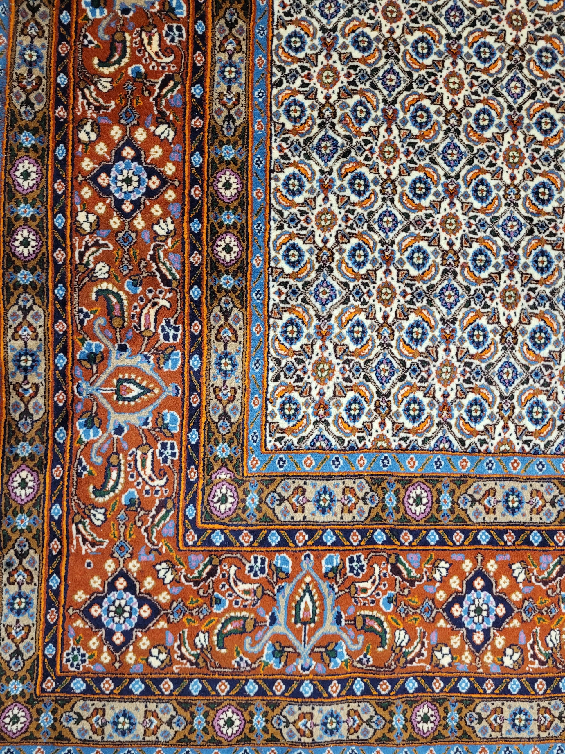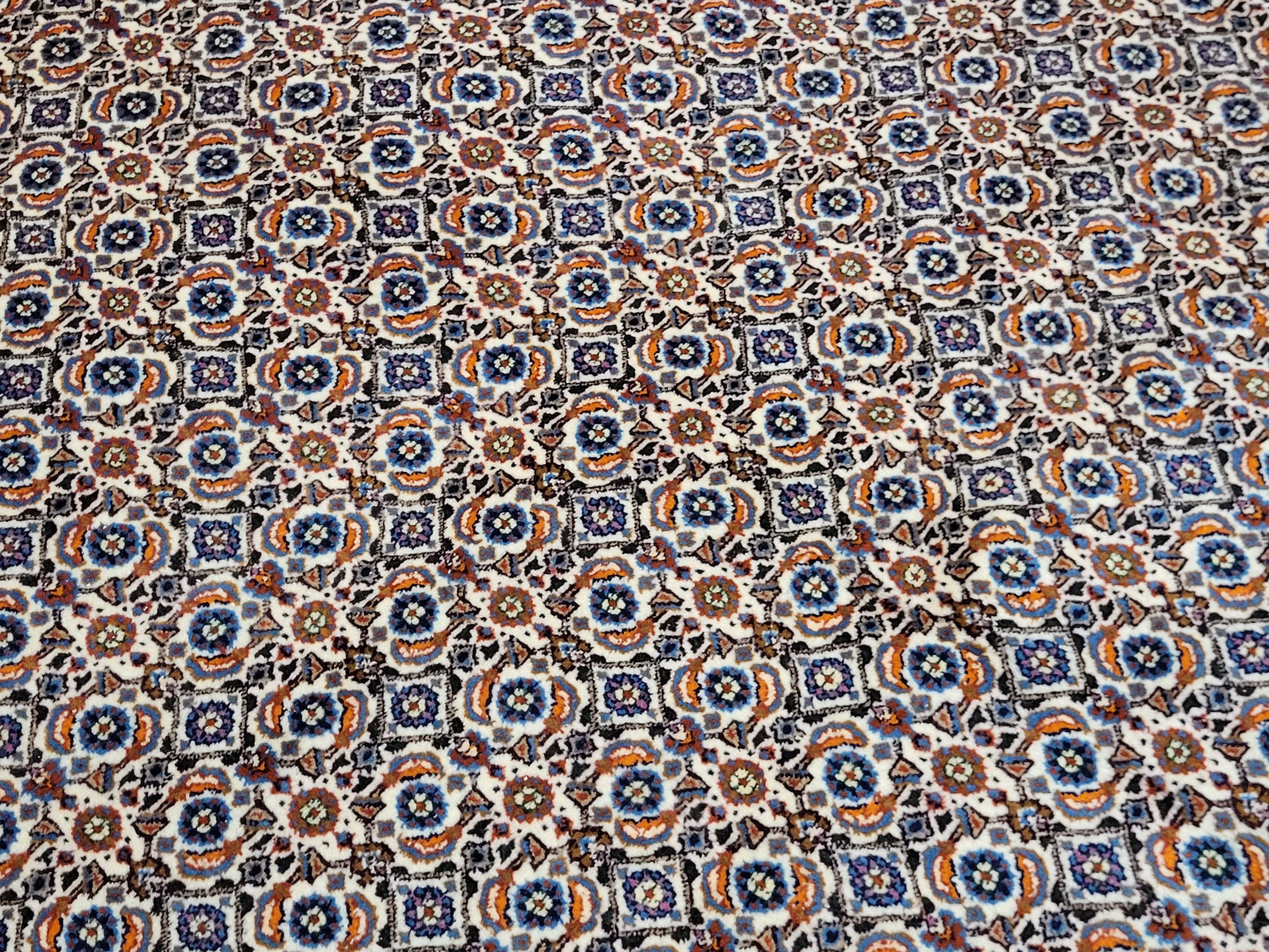 angeboten wird ein klassischer Moud Teppich, handgeknüpft aus feiner Wolle mit dichter und präziser Knüpfung. Das helle Mittelfeld zeigt ein fein gegliedertes Allover-Muster aus stilisierten Blütenrosetten und Ranken, harmonisch eingerahmt von einer ziegelroten Hauptbordüre mit floraler Ornamentik. Die charakteristische Farbkomposition aus Creme, Blau und Rot verleiht diesem Teppich seine elegante und ruhige Ausstrahlung.