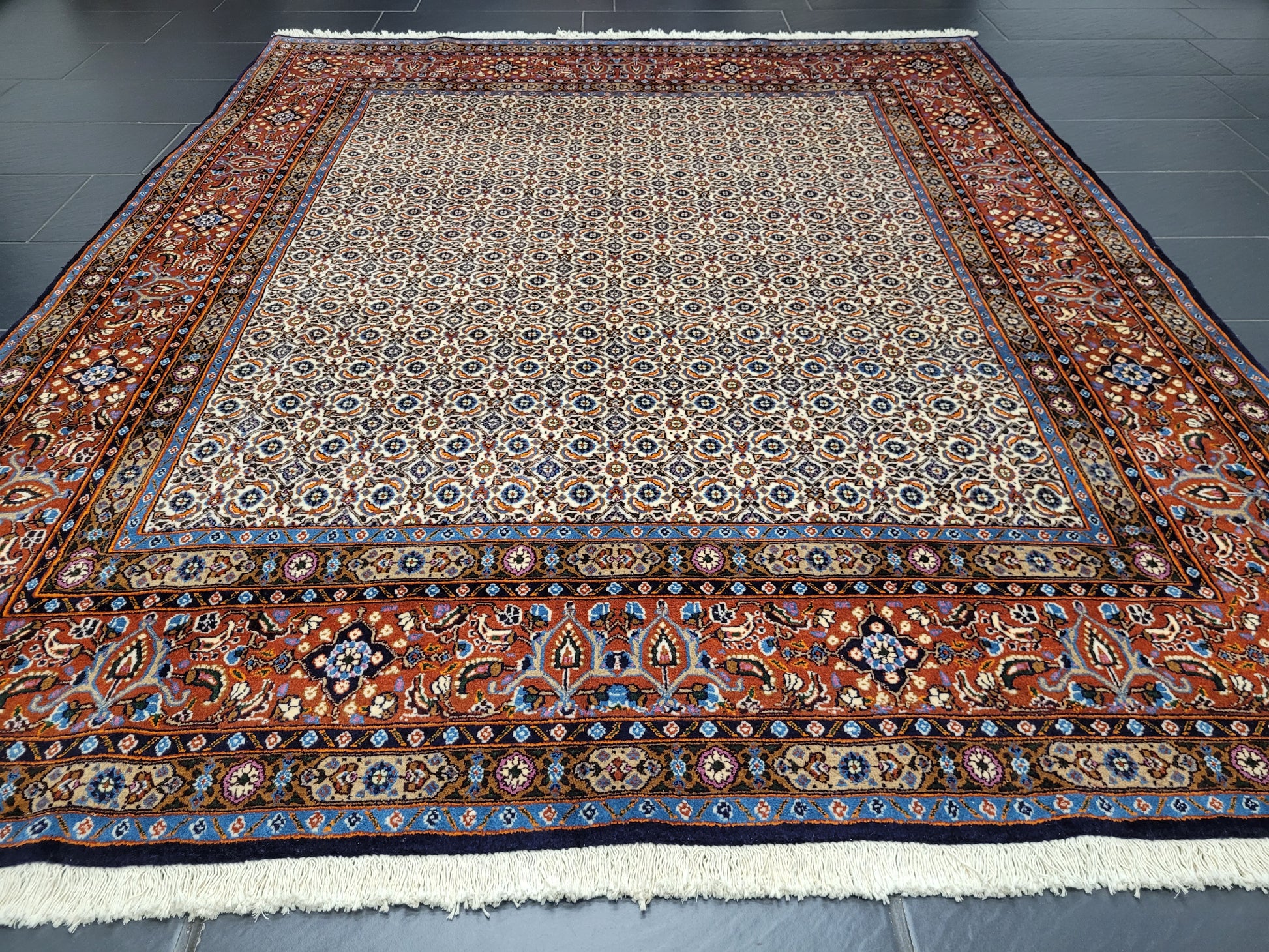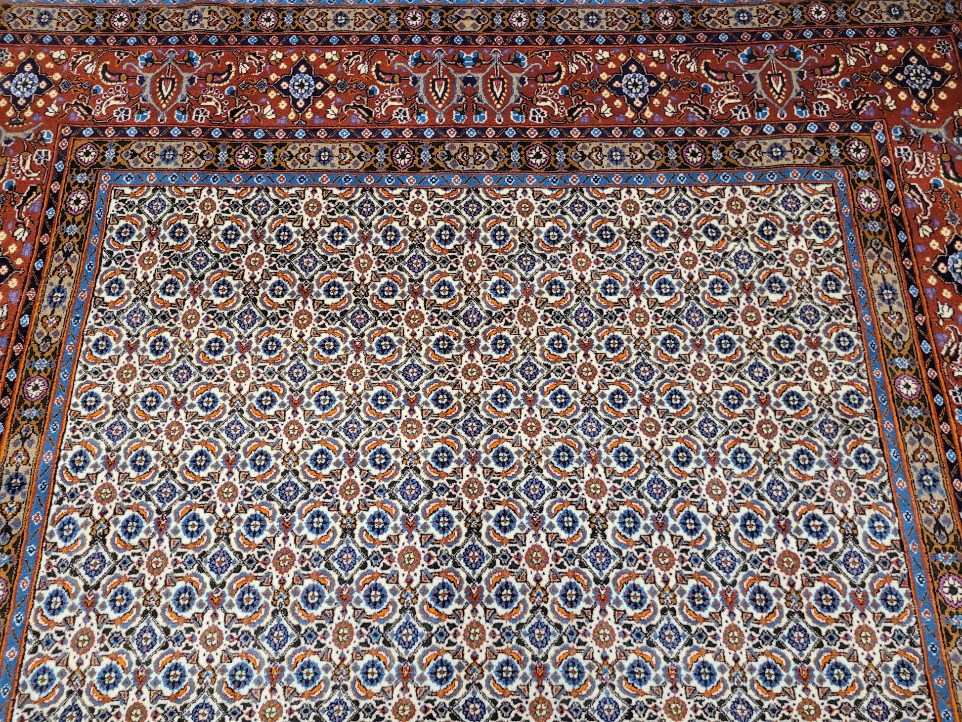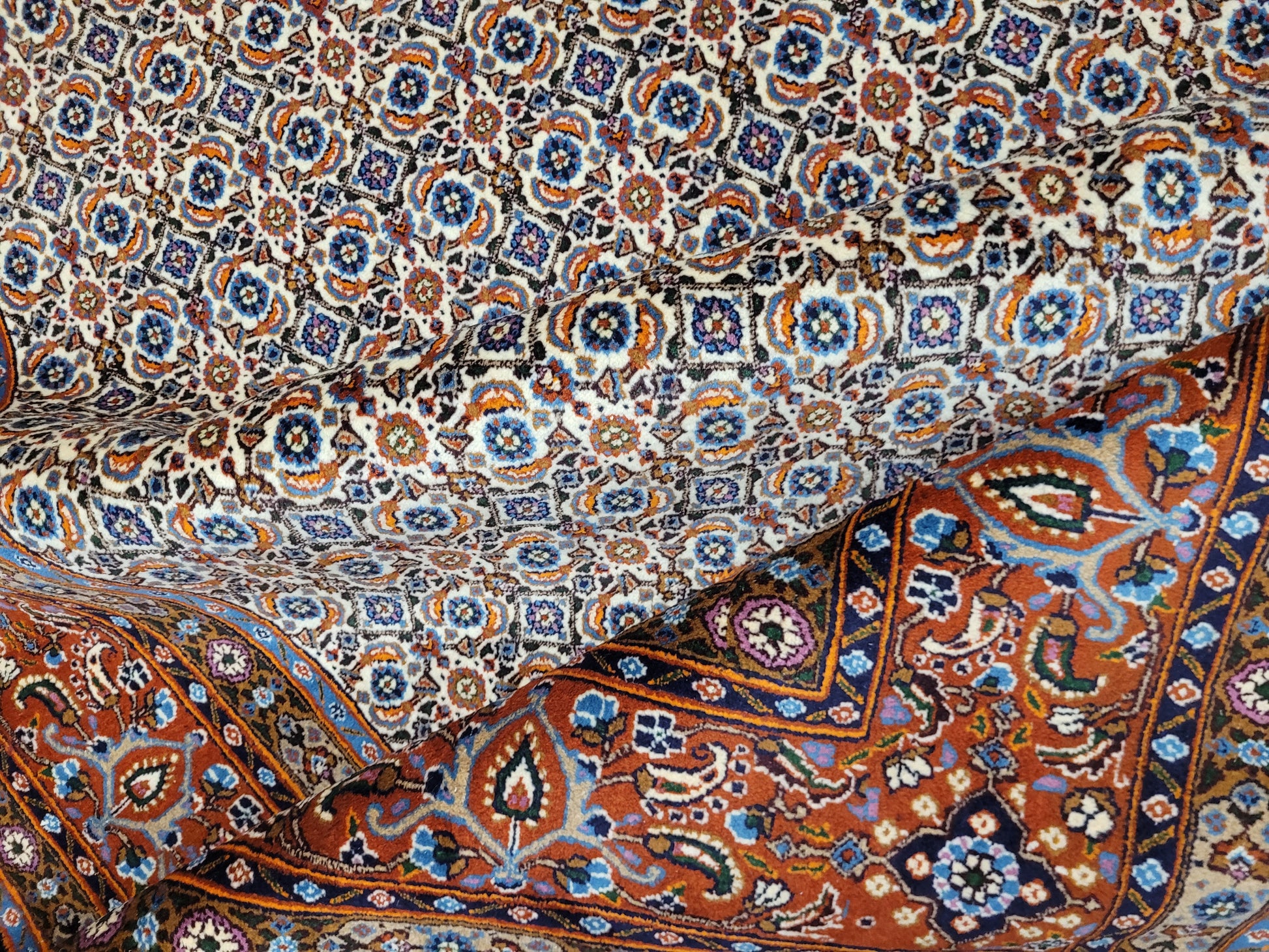 angeboten wird ein klassischer Moud Teppich, handgeknüpft aus feiner Wolle mit dichter und präziser Knüpfung. Das helle Mittelfeld zeigt ein fein gegliedertes Allover-Muster aus stilisierten Blütenrosetten und Ranken, harmonisch eingerahmt von einer ziegelroten Hauptbordüre mit floraler Ornamentik. Die charakteristische Farbkomposition aus Creme, Blau und Rot verleiht diesem Teppich seine elegante und ruhige Ausstrahlung.