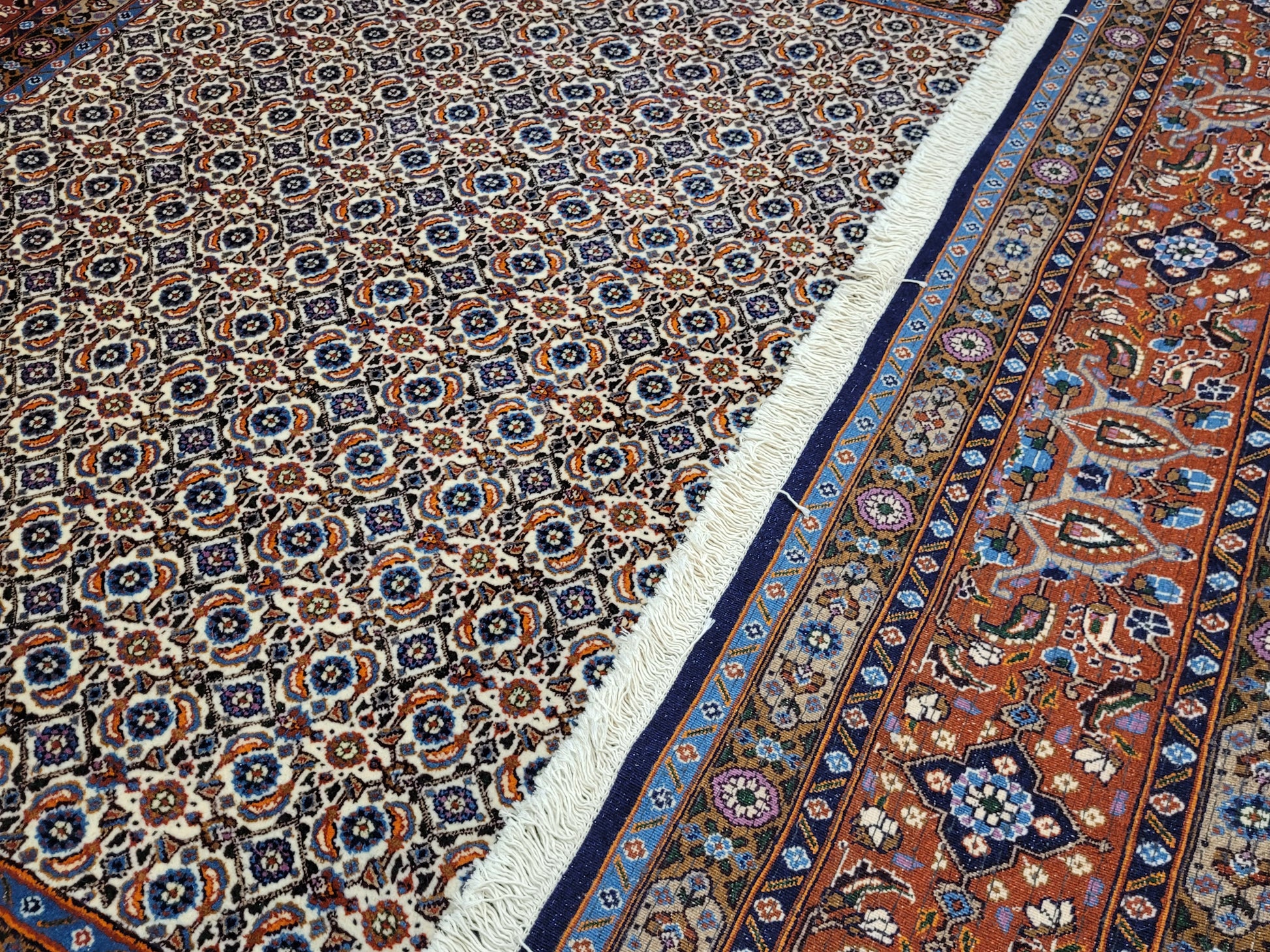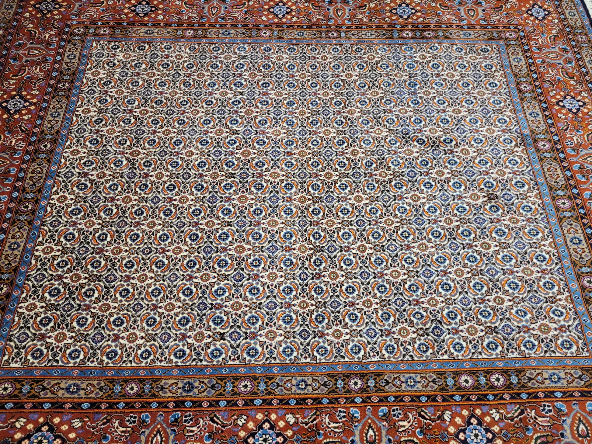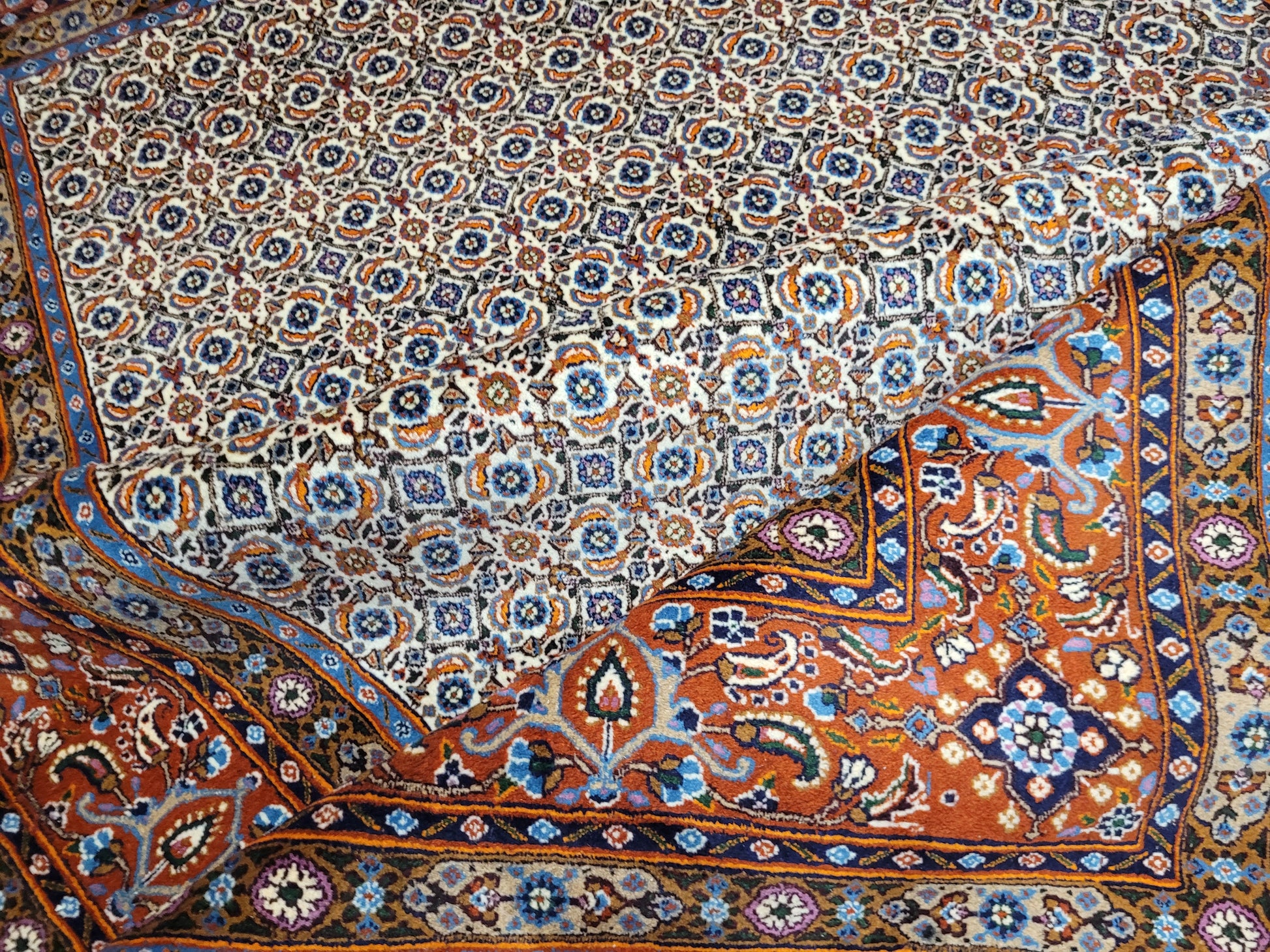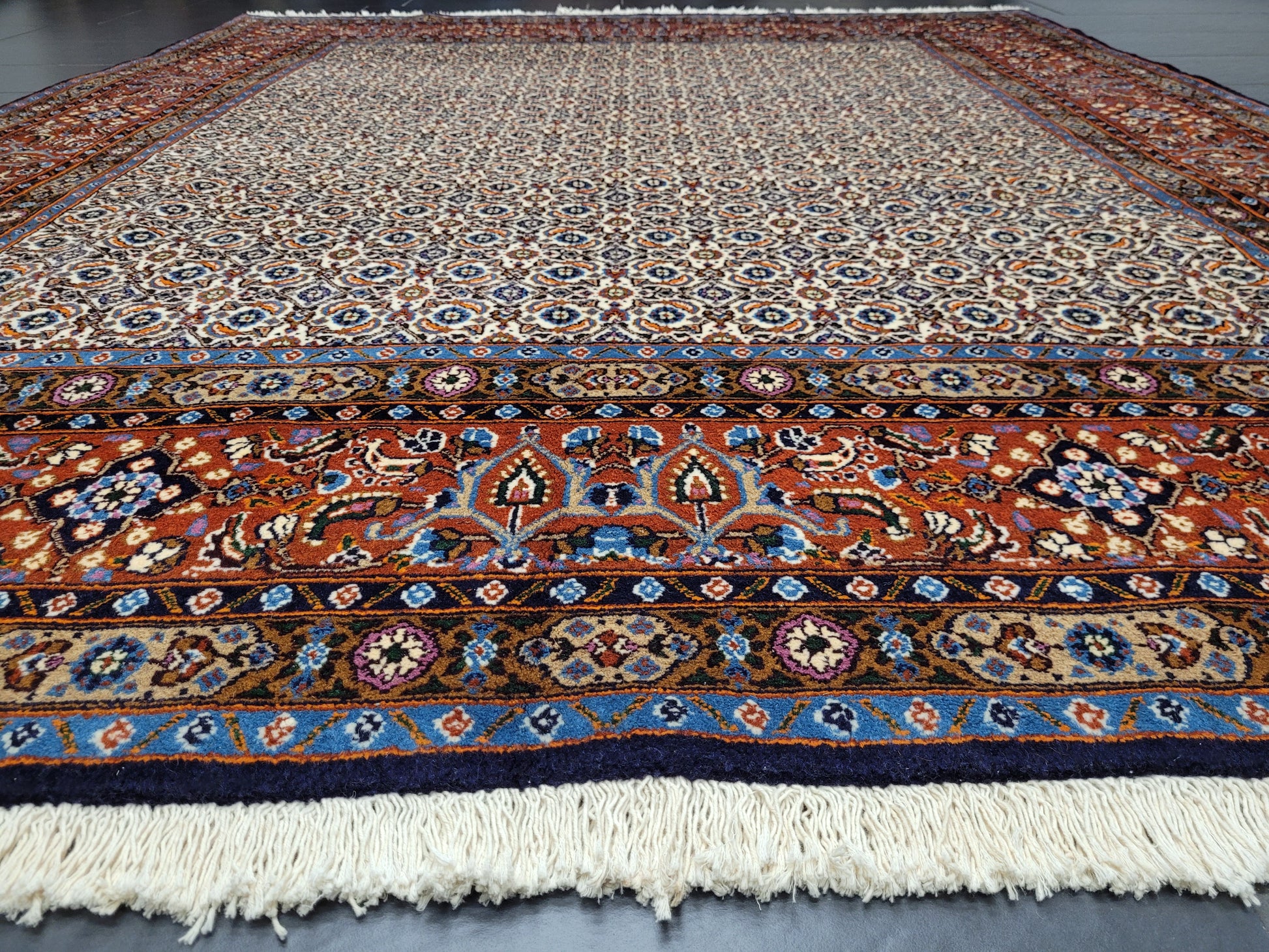 angeboten wird ein klassischer Moud Teppich, handgeknüpft aus feiner Wolle mit dichter und präziser Knüpfung. Das helle Mittelfeld zeigt ein fein gegliedertes Allover-Muster aus stilisierten Blütenrosetten und Ranken, harmonisch eingerahmt von einer ziegelroten Hauptbordüre mit floraler Ornamentik. Die charakteristische Farbkomposition aus Creme, Blau und Rot verleiht diesem Teppich seine elegante und ruhige Ausstrahlung.