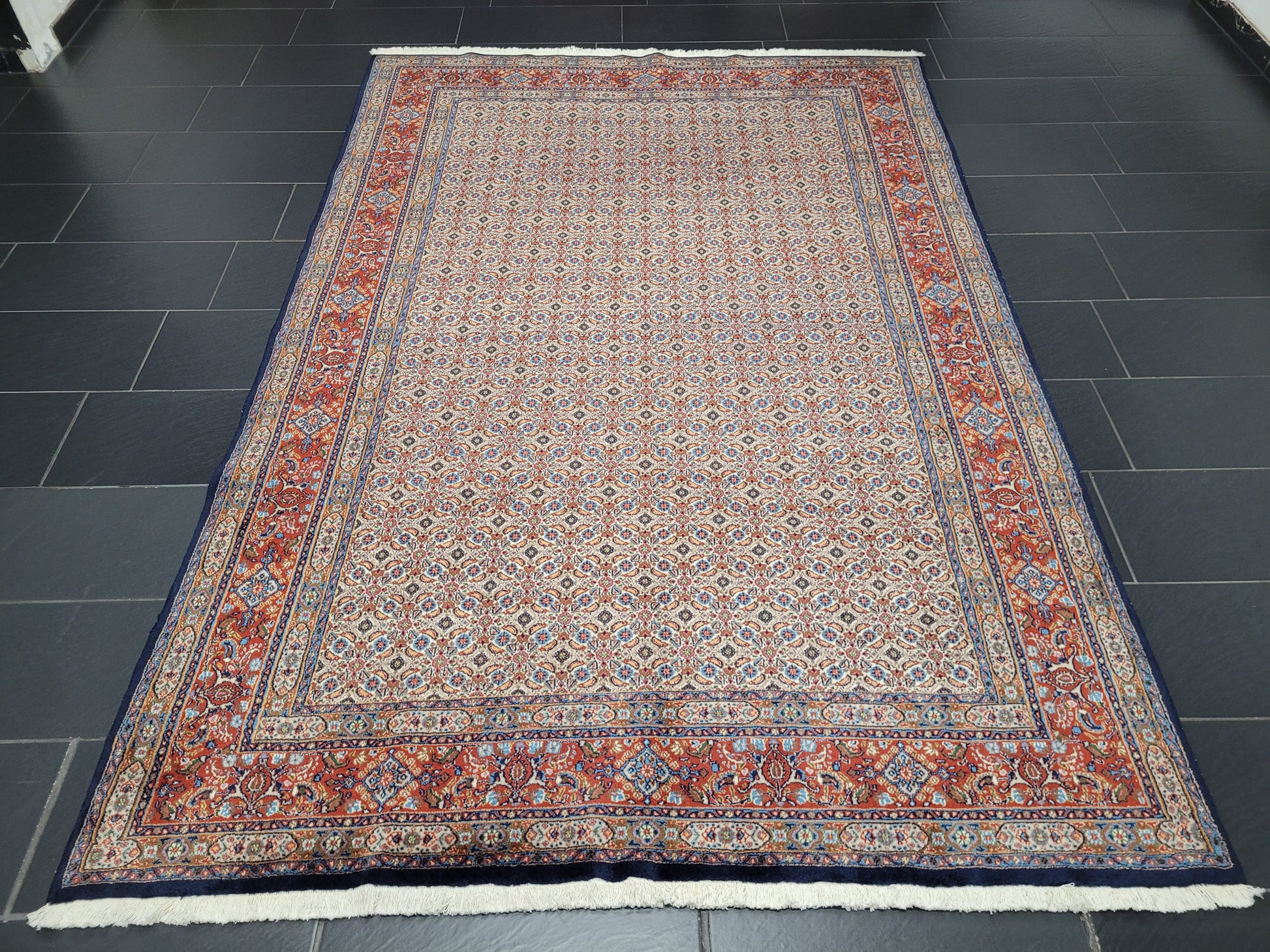 Sehr guter, gepflegter Zustand. Der Flor ist gleichmäßig, Fransen und Kanten sind sauber und stabil. Die Fotos sind Bestandteil der Zustandsbeschreibung.