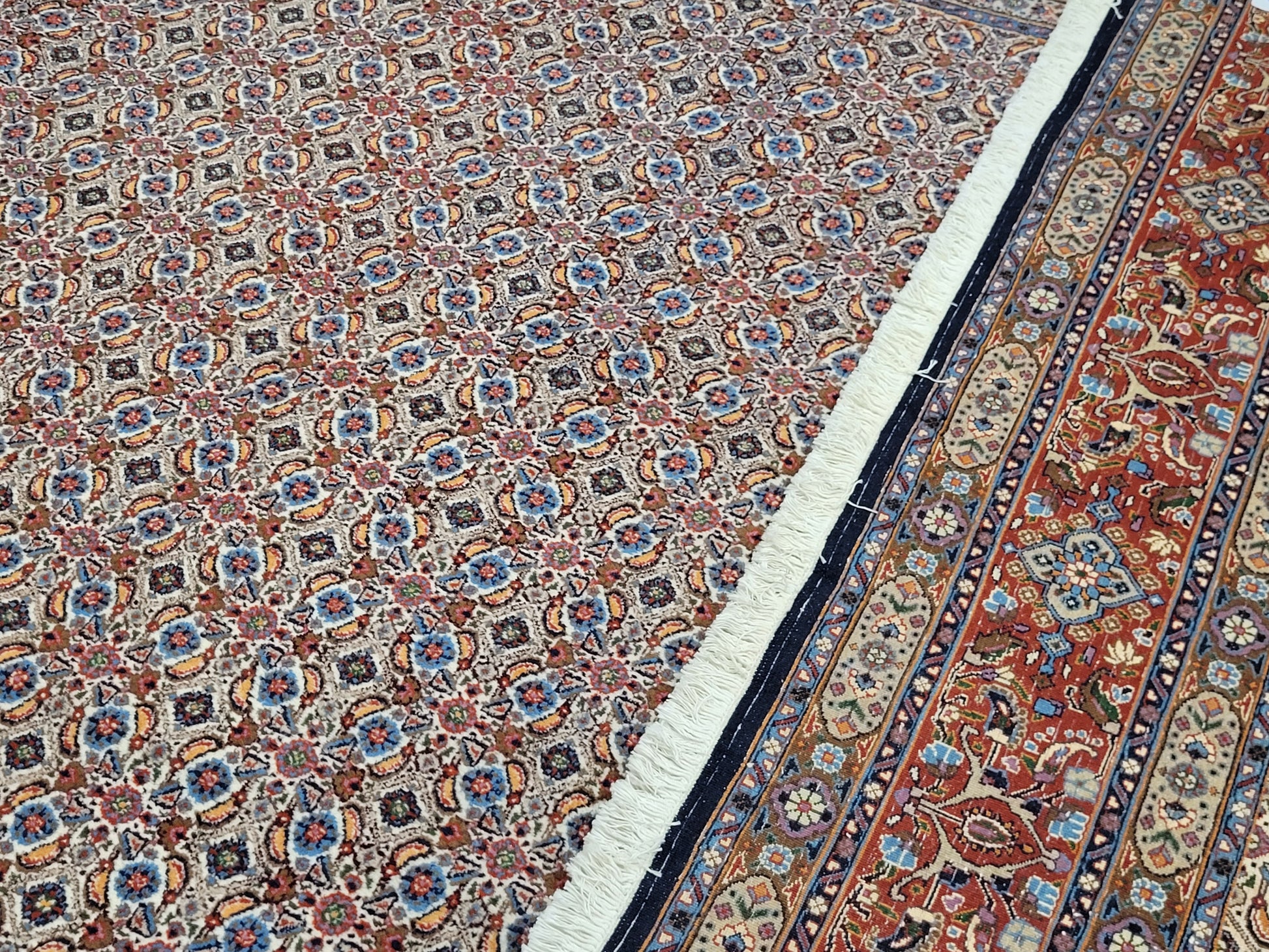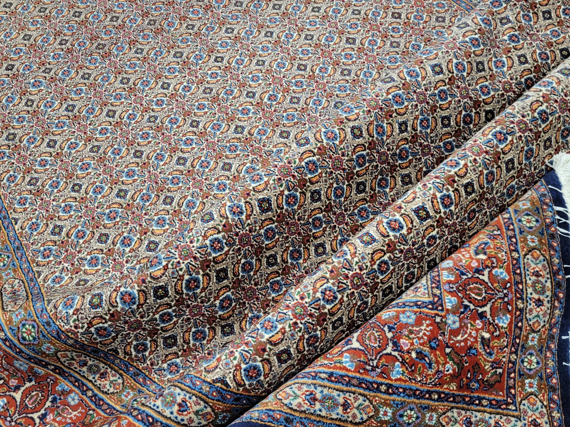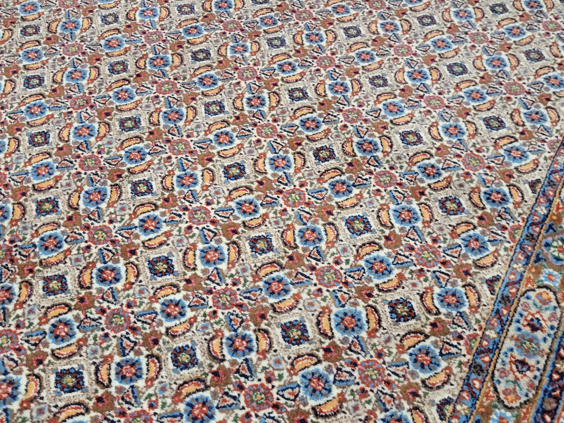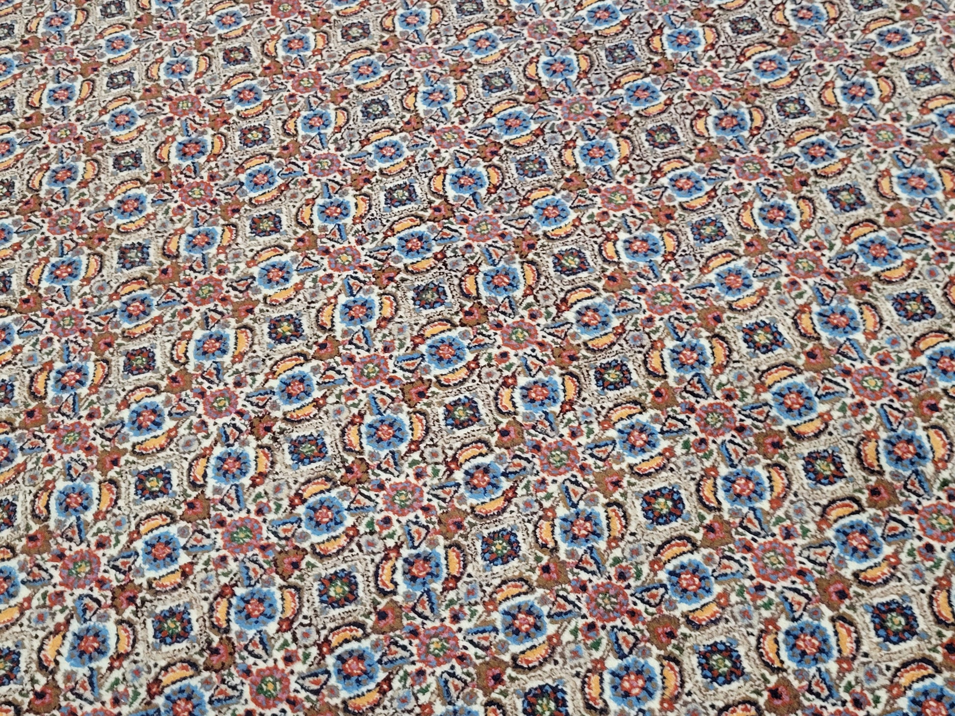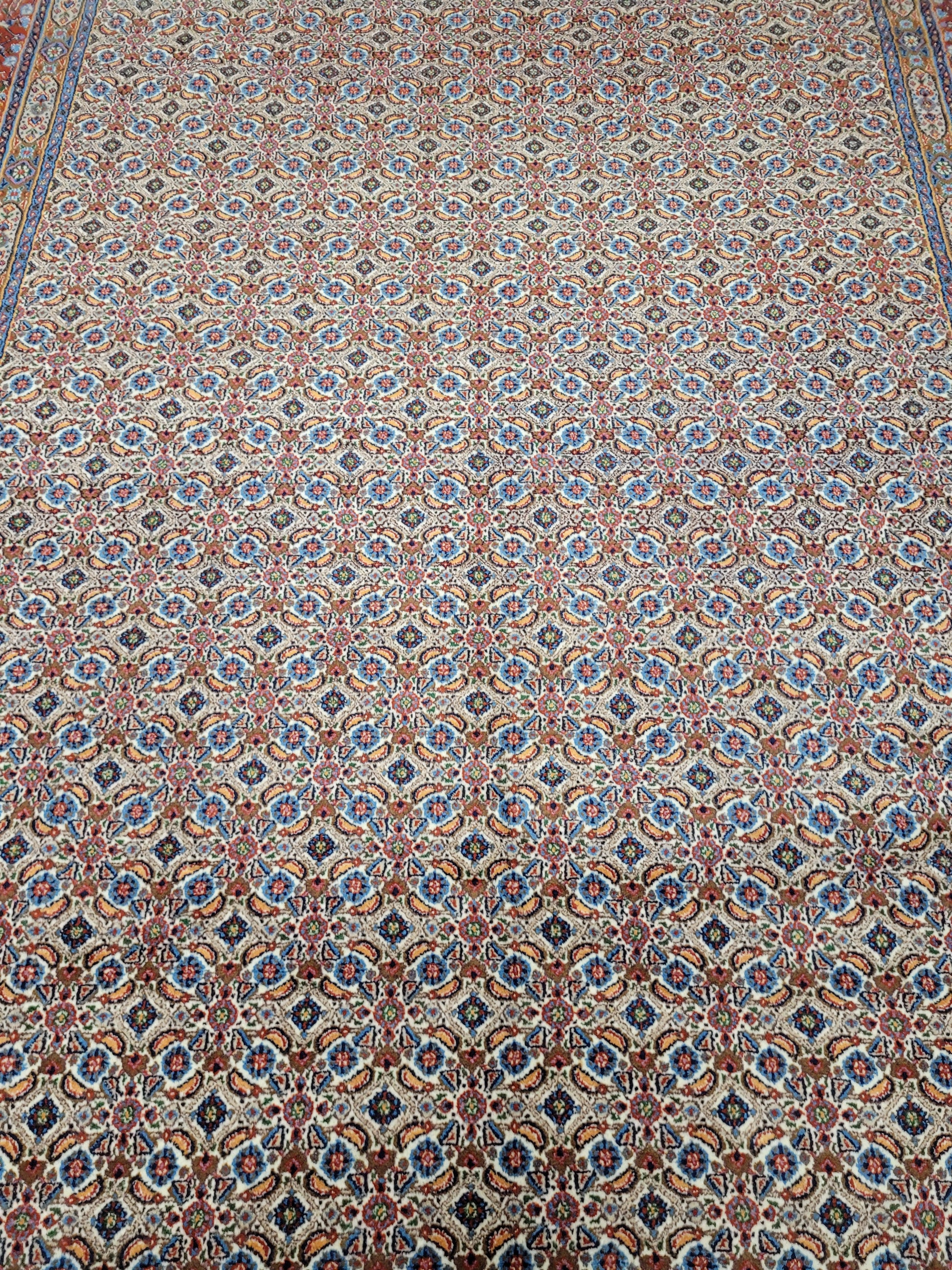 angeboten wird ein klassischer handgeknüpfter Moud Teppich aus 100 % feiner Wolle. Dieses Werk traditioneller Knüpfkunst zeigt ein detailreiches Allover-Muster aus unzähligen kleinen Blüten- und Rautenmotiven, kunstvoll in harmonischer Symmetrie angeordnet. Die Farbgebung in sanften Naturtönen mit Akzenten in Blau, Rot und Beige verleiht dem Teppich eine elegante und zugleich warme Ausstrahlung.