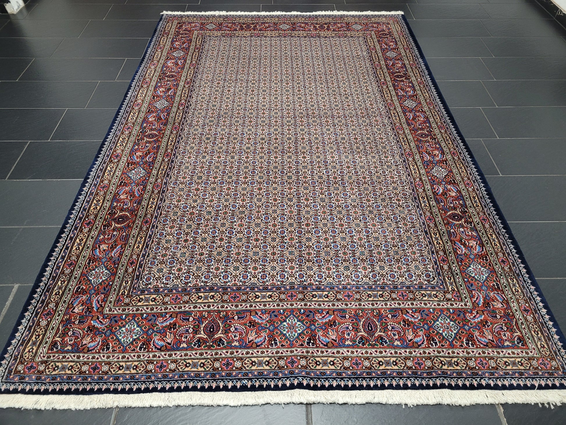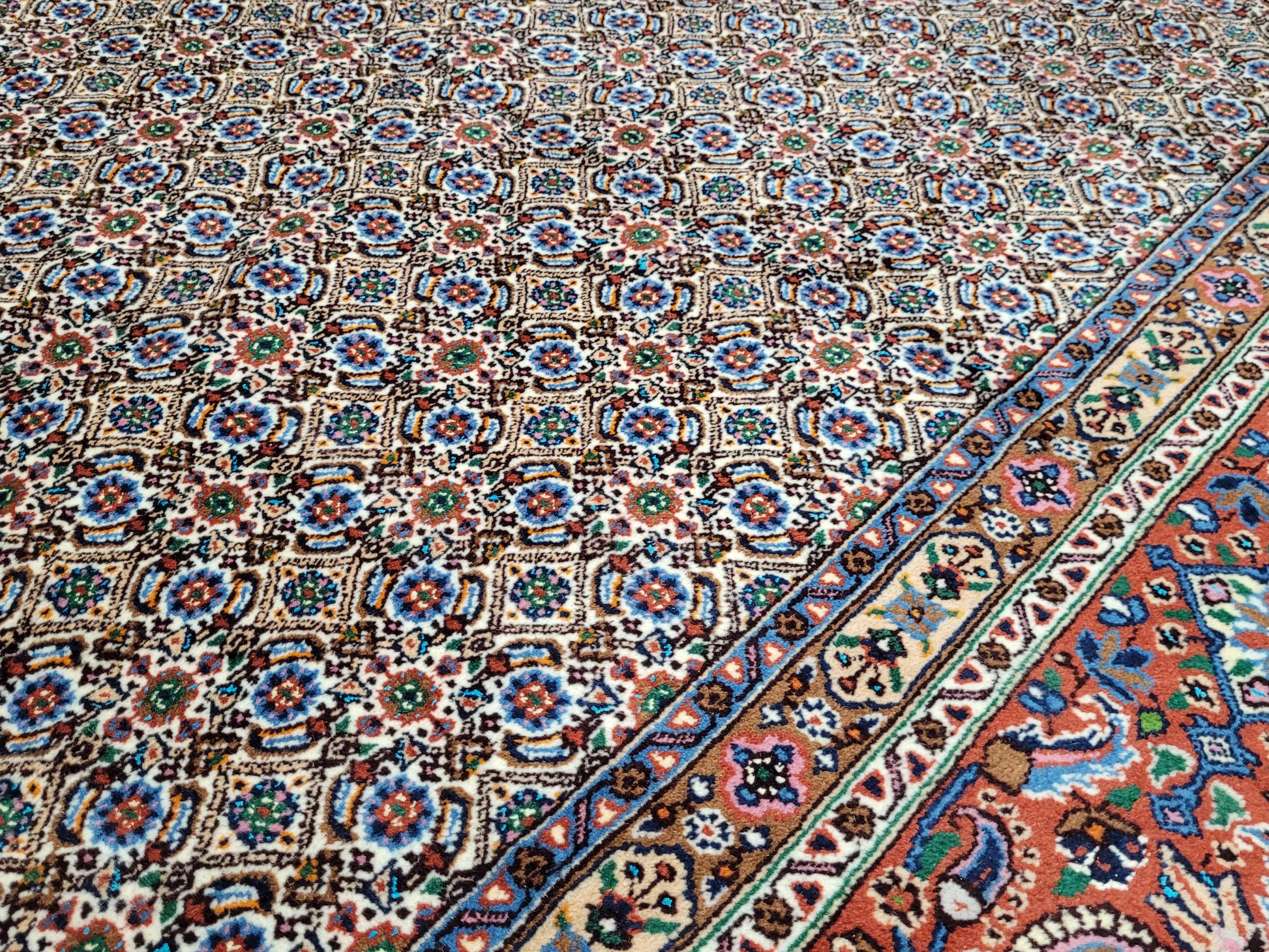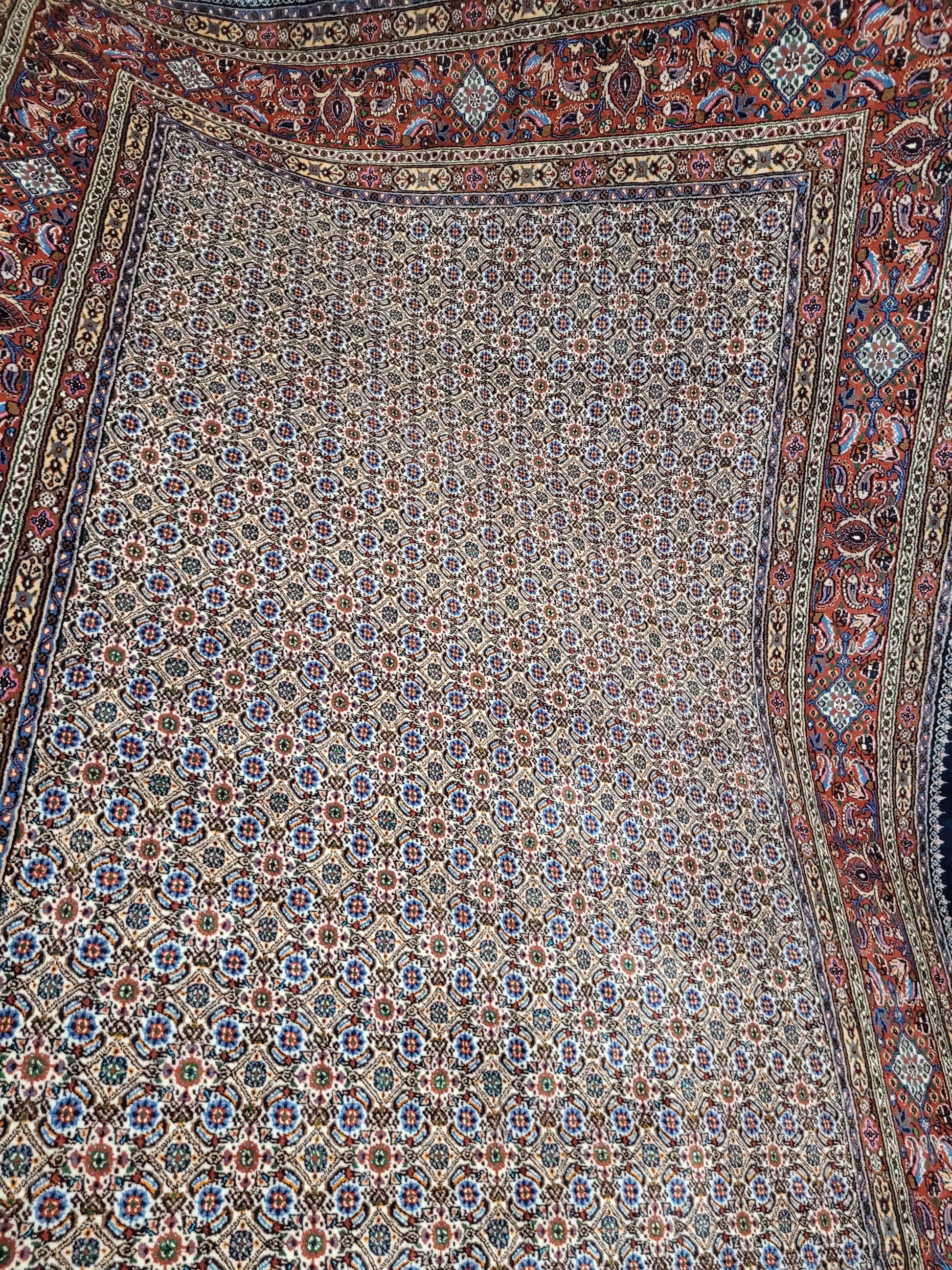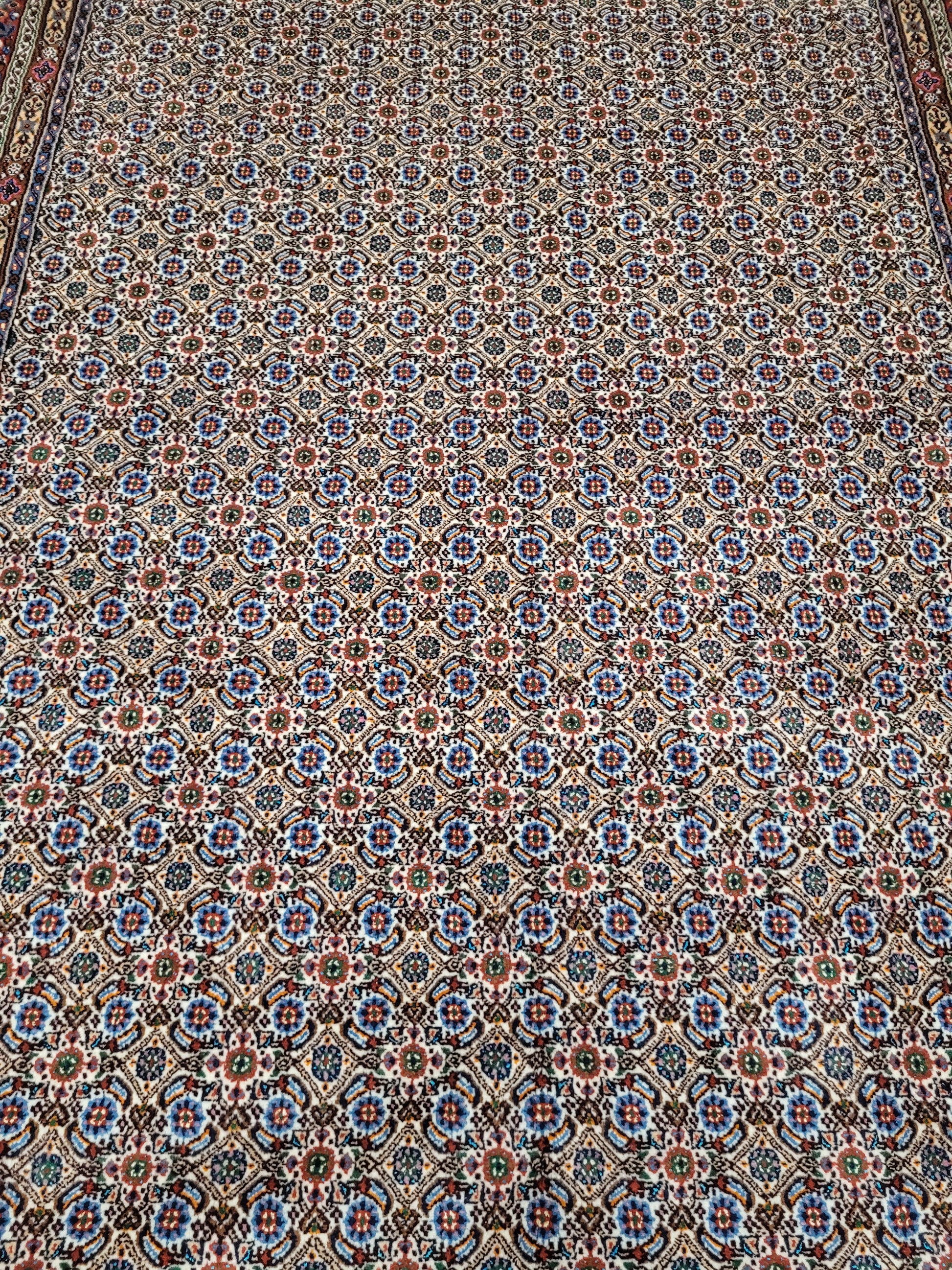angeboten wird ein hochwertiger handgeknüpfter Moud Teppich aus feiner Wolle mit Seidenanteil. Dieses klassische Stück besticht durch sein aufwendig gestaltetes Allover-Muster aus kleinen, symmetrisch angeordneten Blüten- und Rautenmotiven. Die feine Knüpfung, die harmonische Farbkomposition und die seidig schimmernden Akzente verleihen dem Teppich eine elegante und edle Ausstrahlung.