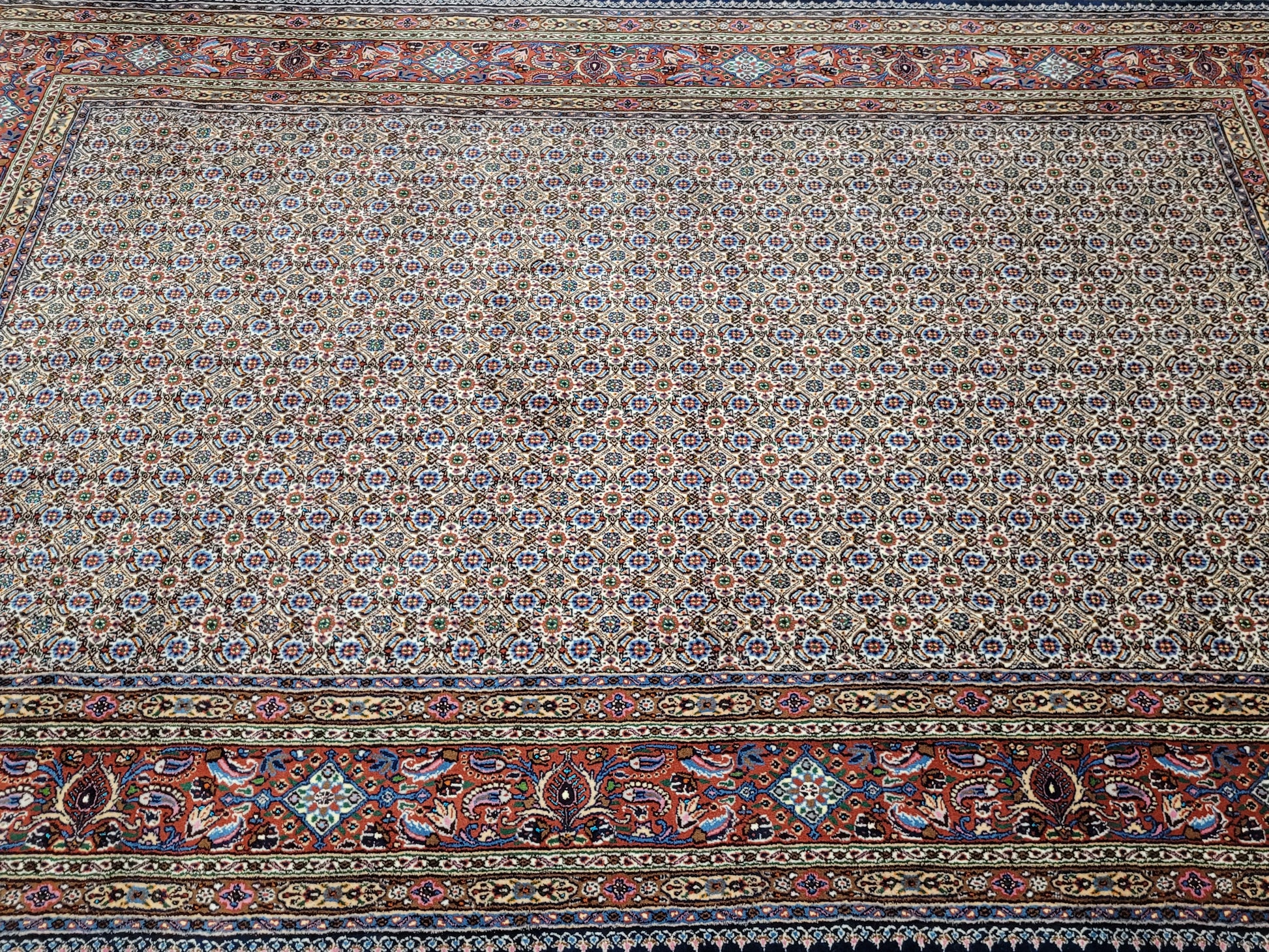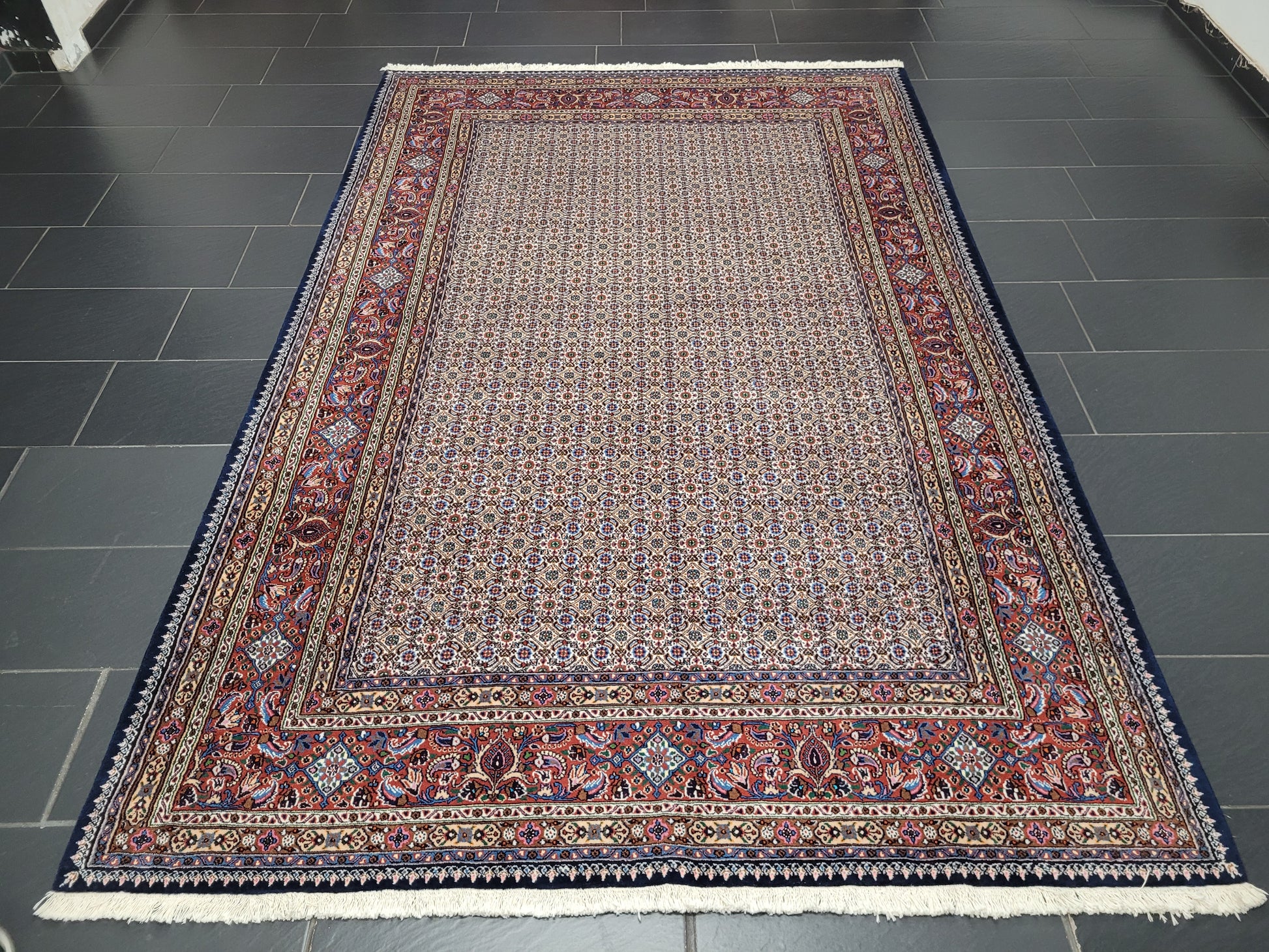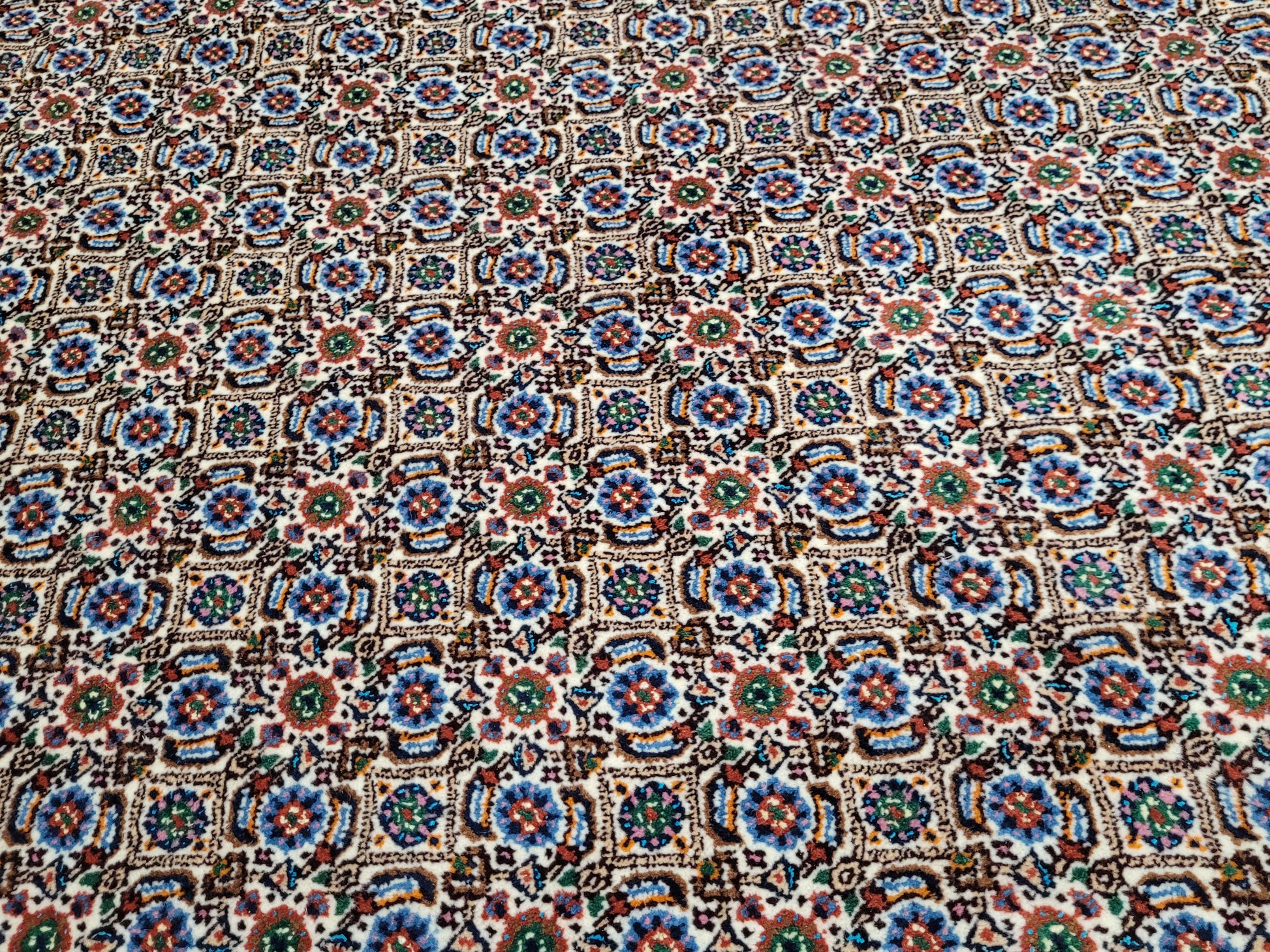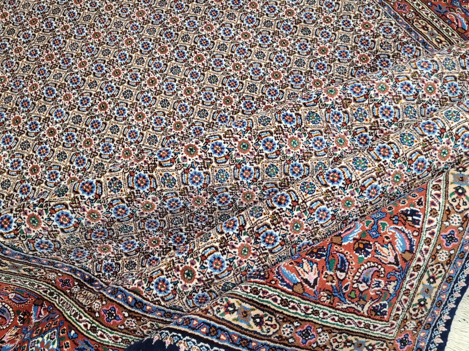 angeboten wird ein hochwertiger handgeknüpfter Moud Teppich aus feiner Wolle mit Seidenanteil. Dieses klassische Stück besticht durch sein aufwendig gestaltetes Allover-Muster aus kleinen, symmetrisch angeordneten Blüten- und Rautenmotiven. Die feine Knüpfung, die harmonische Farbkomposition und die seidig schimmernden Akzente verleihen dem Teppich eine elegante und edle Ausstrahlung.