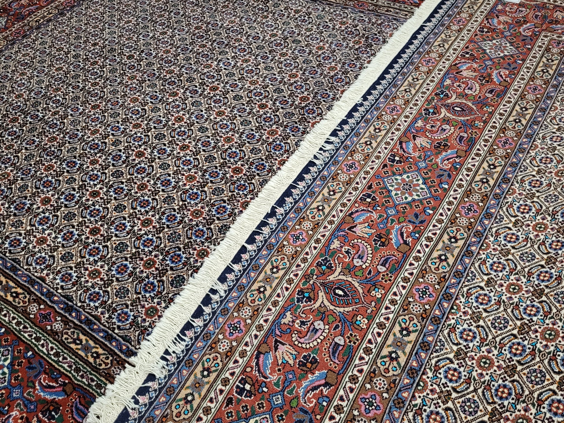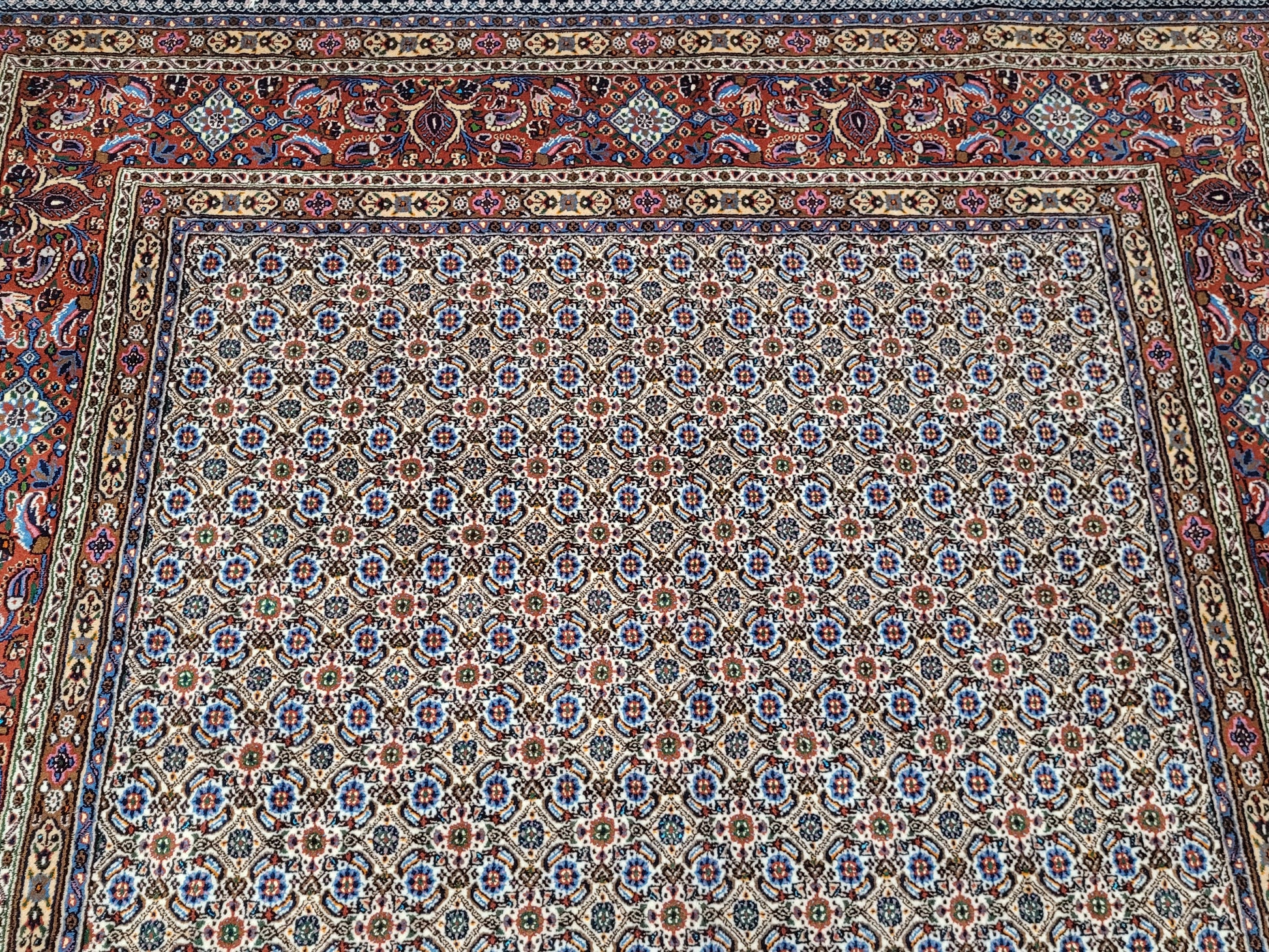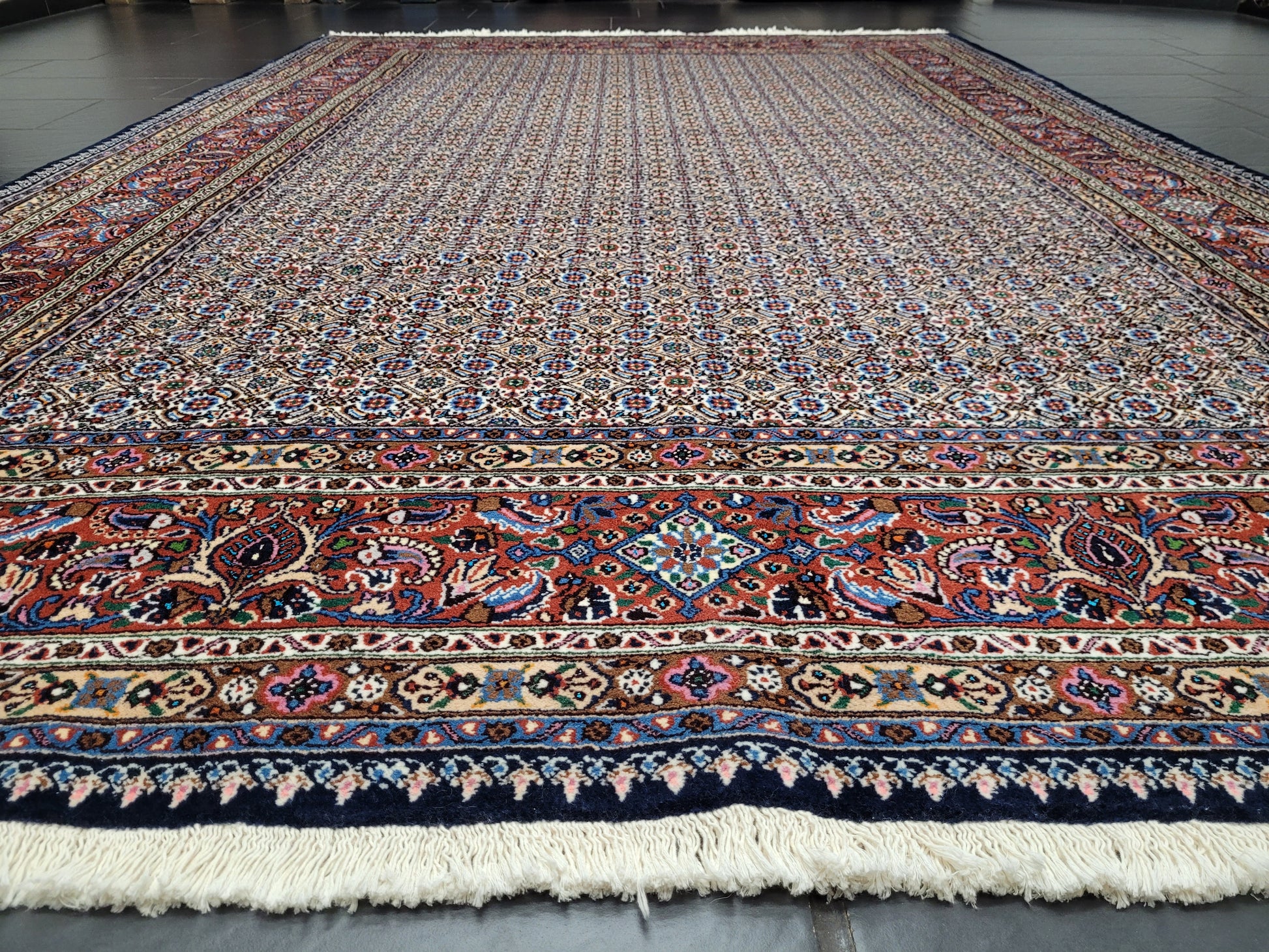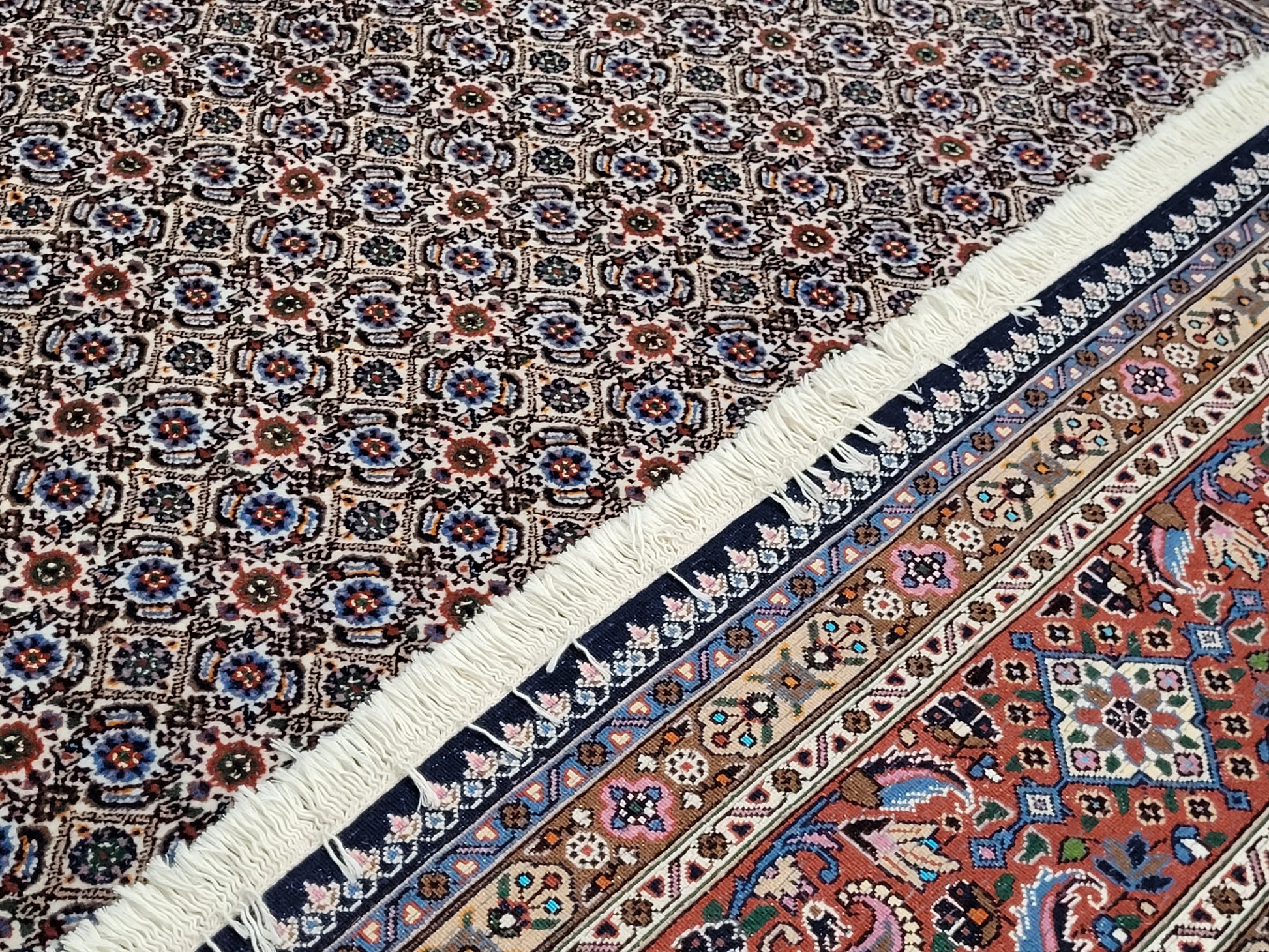 angeboten wird ein hochwertiger handgeknüpfter Moud Teppich aus feiner Wolle mit Seidenanteil. Dieses klassische Stück besticht durch sein aufwendig gestaltetes Allover-Muster aus kleinen, symmetrisch angeordneten Blüten- und Rautenmotiven. Die feine Knüpfung, die harmonische Farbkomposition und die seidig schimmernden Akzente verleihen dem Teppich eine elegante und edle Ausstrahlung.
