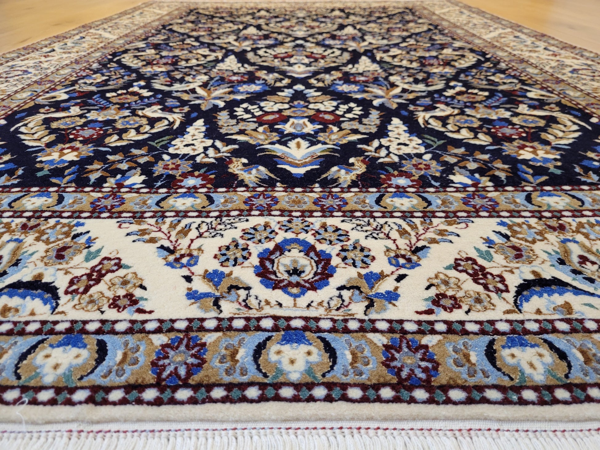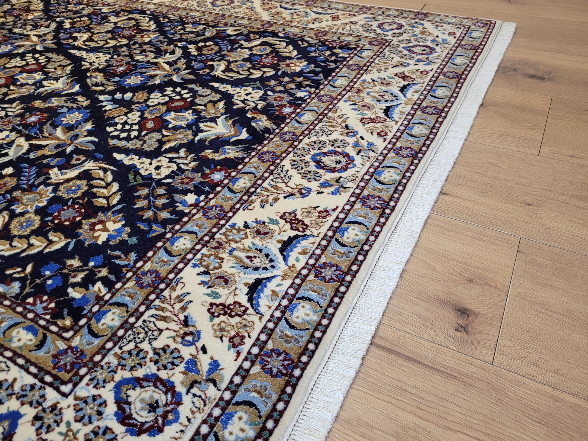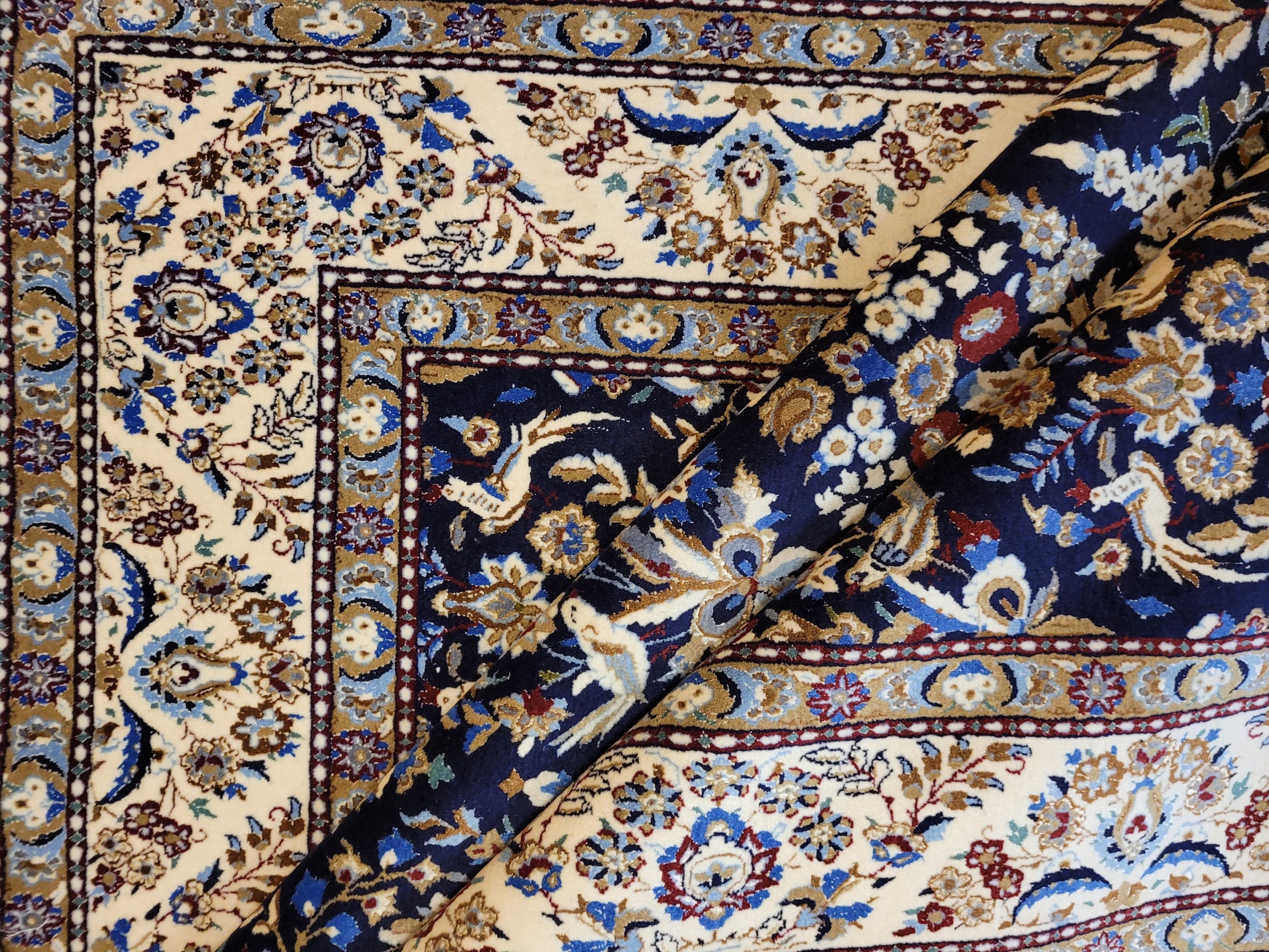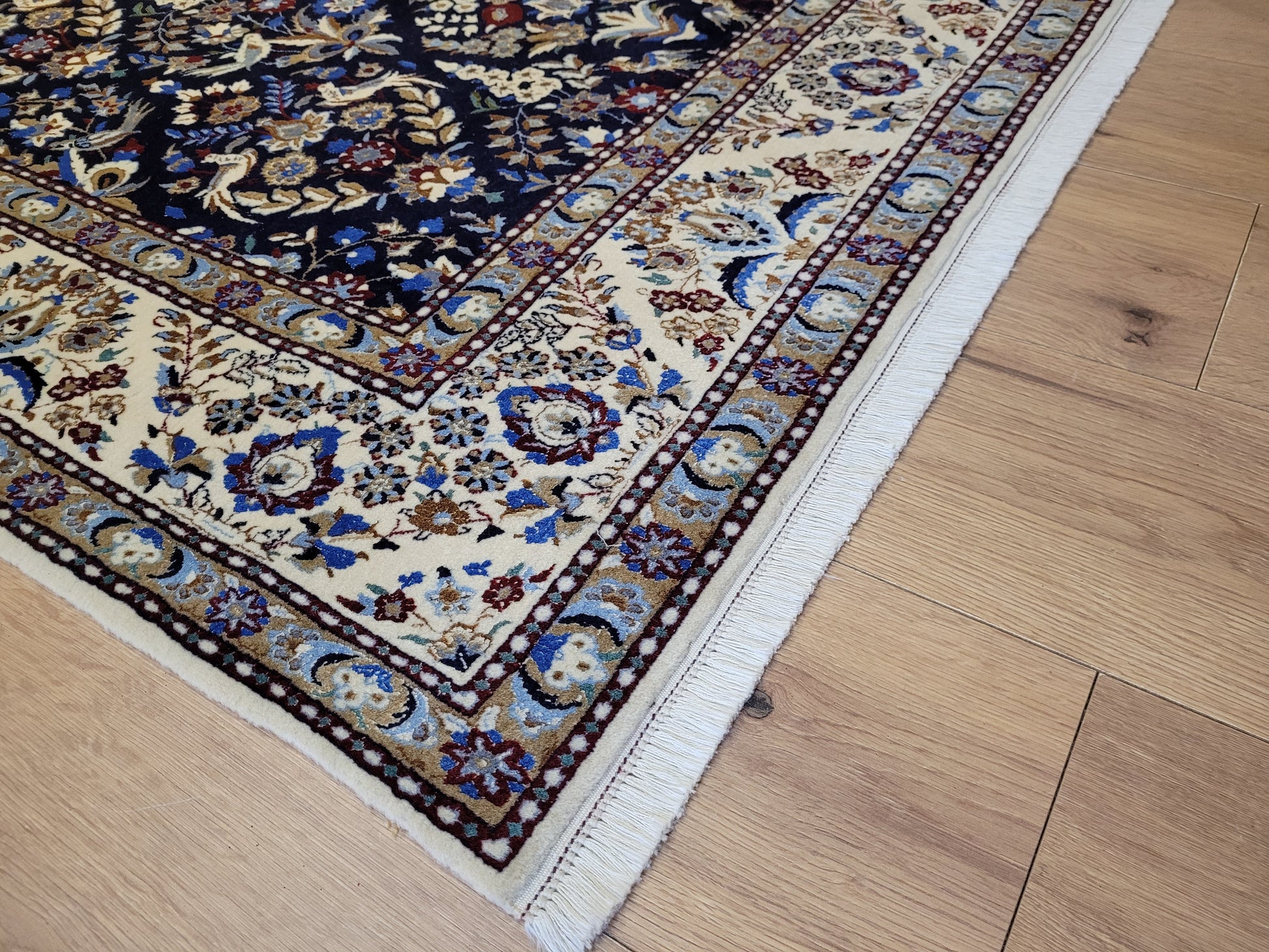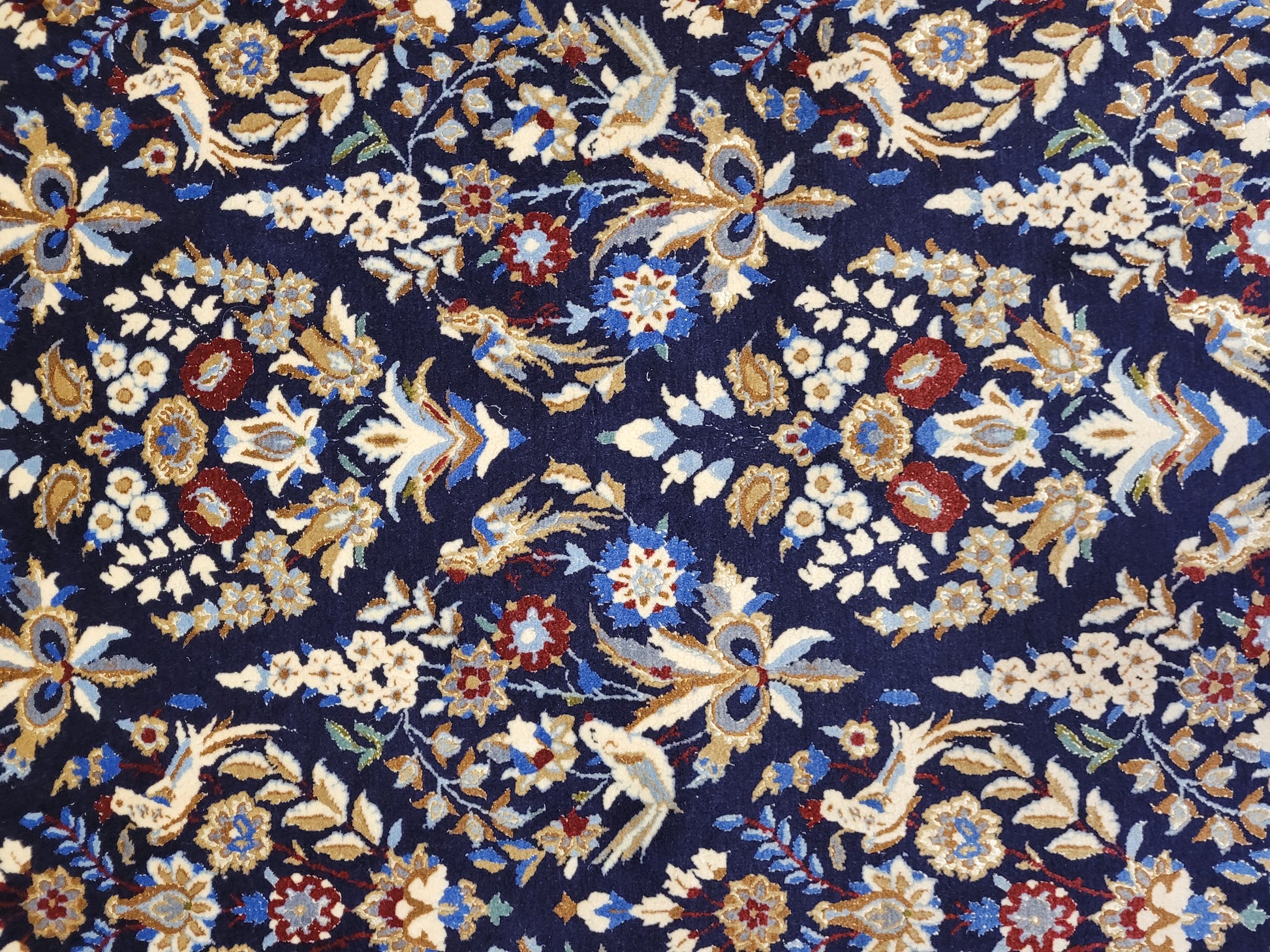 angeboten wird ein prachtvoller Nain Teppich aus feinster Korkwolle mit eingearbeiteter Seide. Dieses Meisterwerk der Knüpfkunst beeindruckt durch sein reich verziertes Felddesign mit floralen Ranken, Blüten und Vogelmotiven, die kunstvoll auf dunkelblauem Grund arrangiert sind. Die Seideneinsätze sorgen für schimmernde Akzente und verleihen dem Teppich eine elegante Tiefe.