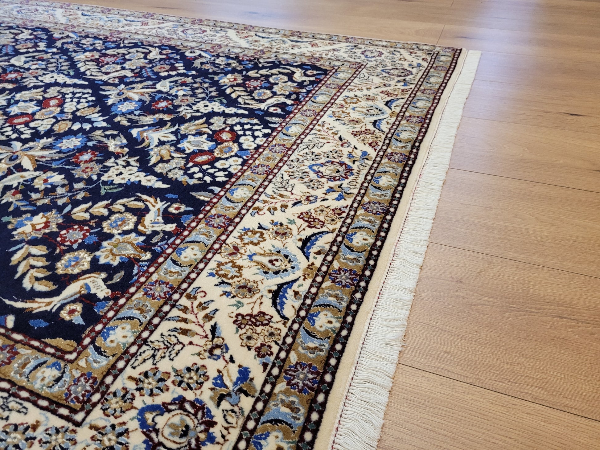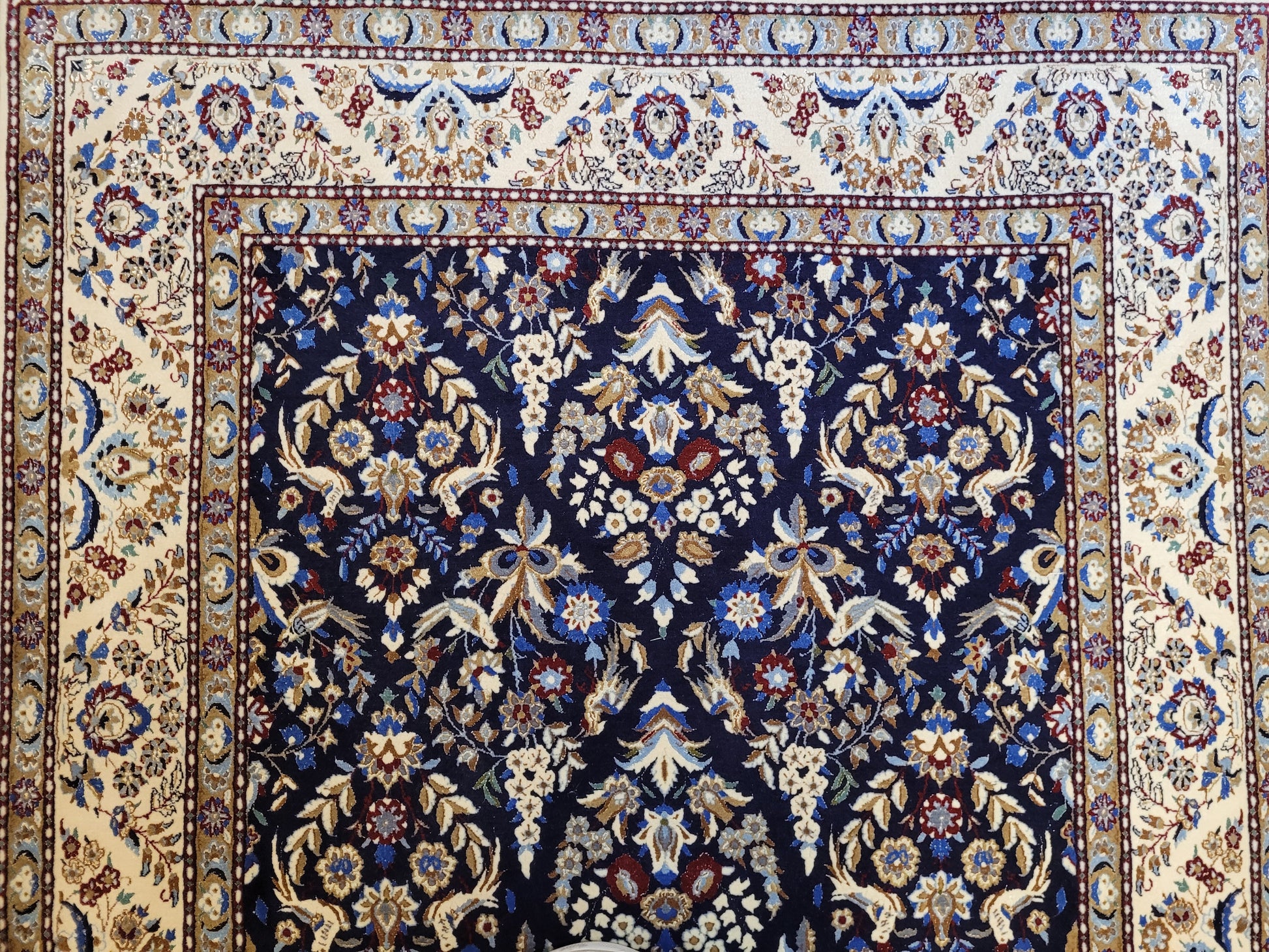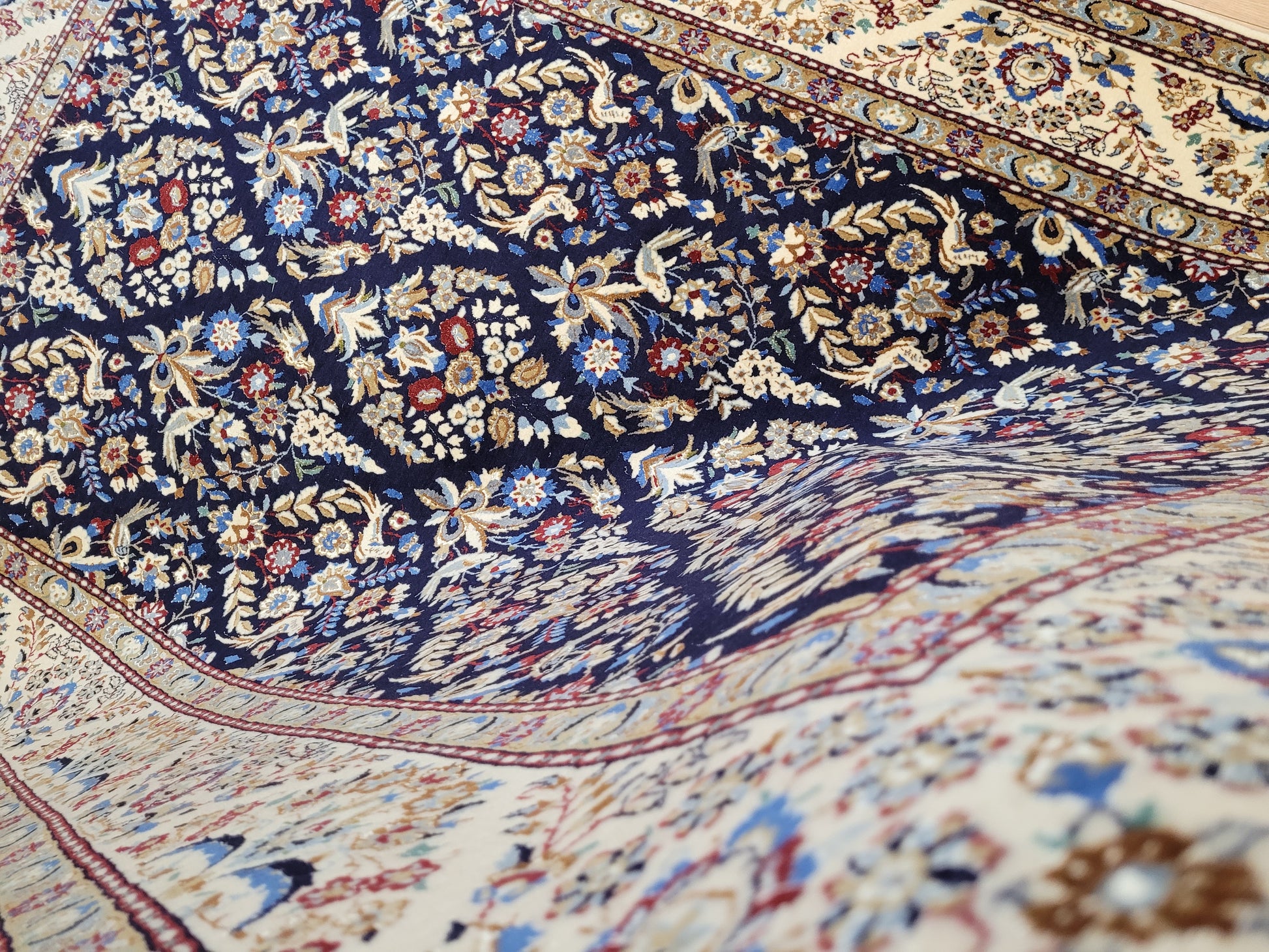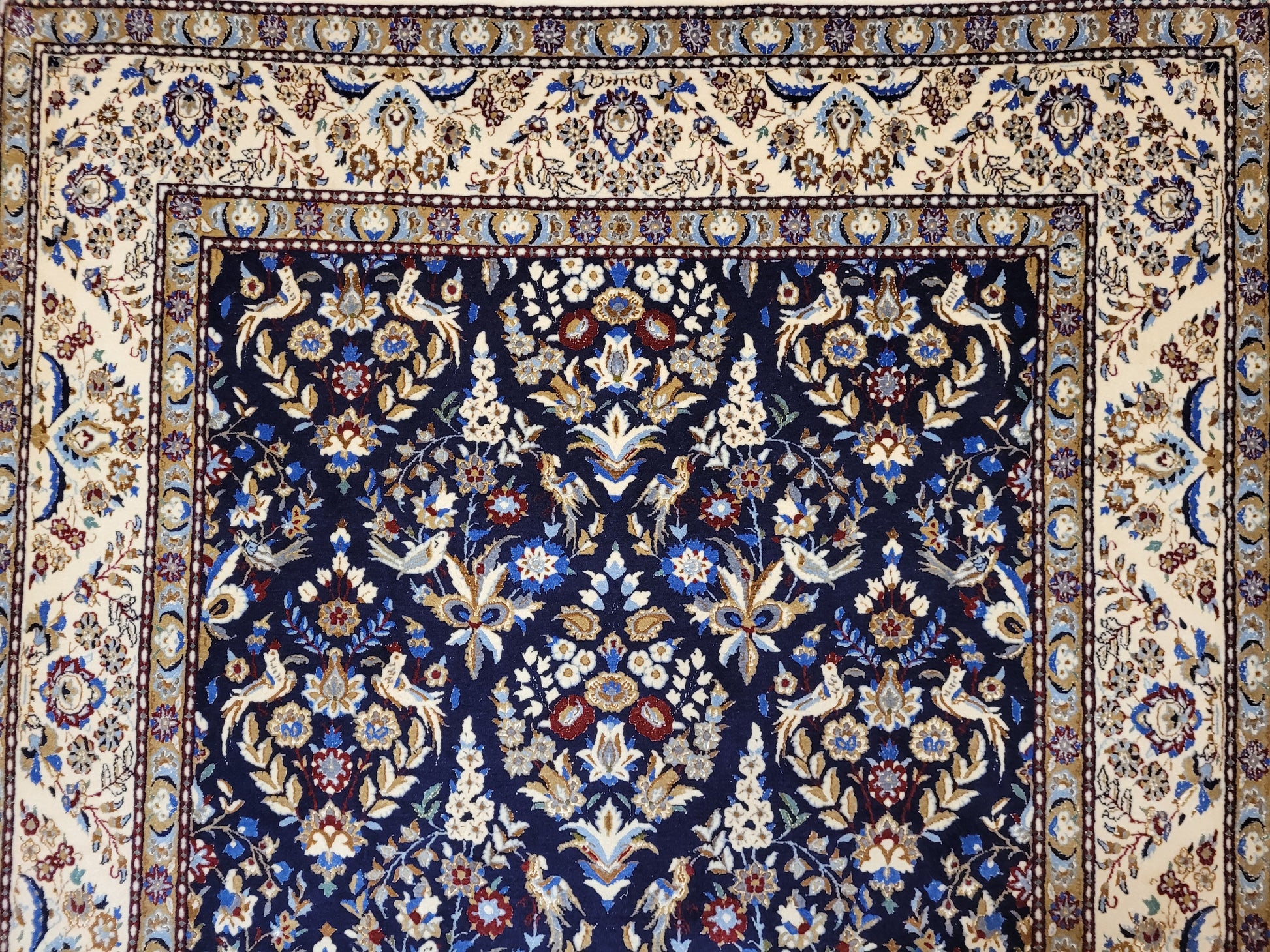 angeboten wird ein prachtvoller Nain Teppich aus feinster Korkwolle mit eingearbeiteter Seide. Dieses Meisterwerk der Knüpfkunst beeindruckt durch sein reich verziertes Felddesign mit floralen Ranken, Blüten und Vogelmotiven, die kunstvoll auf dunkelblauem Grund arrangiert sind. Die Seideneinsätze sorgen für schimmernde Akzente und verleihen dem Teppich eine elegante Tiefe.