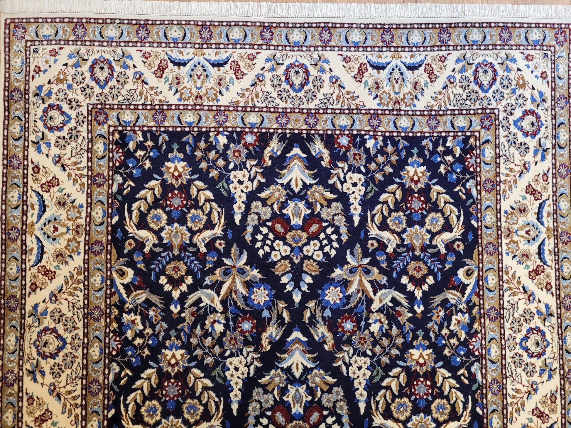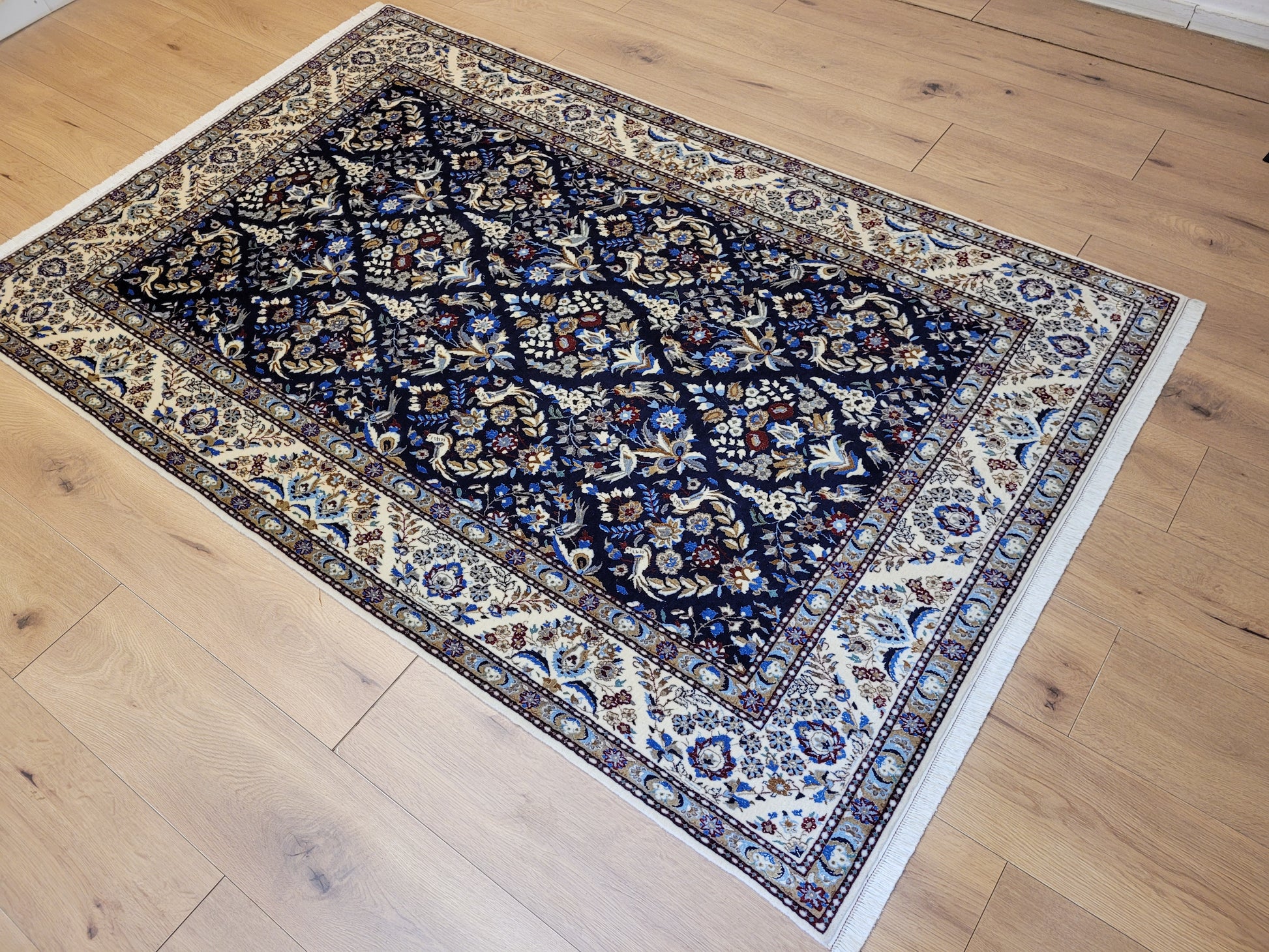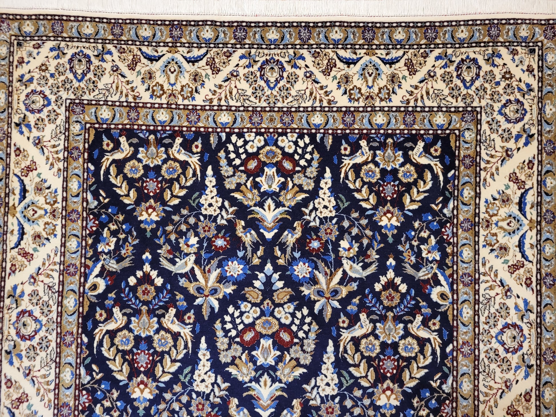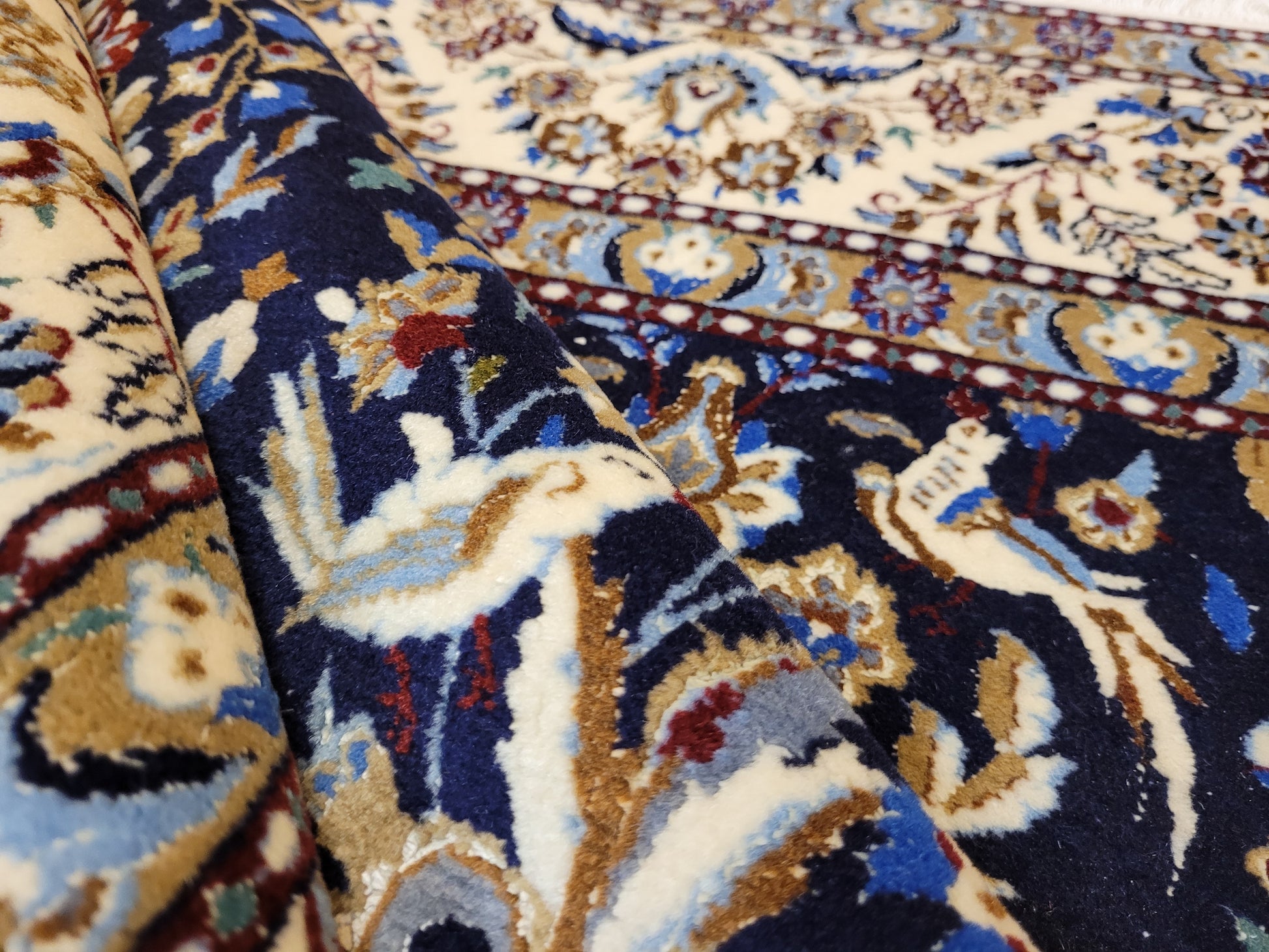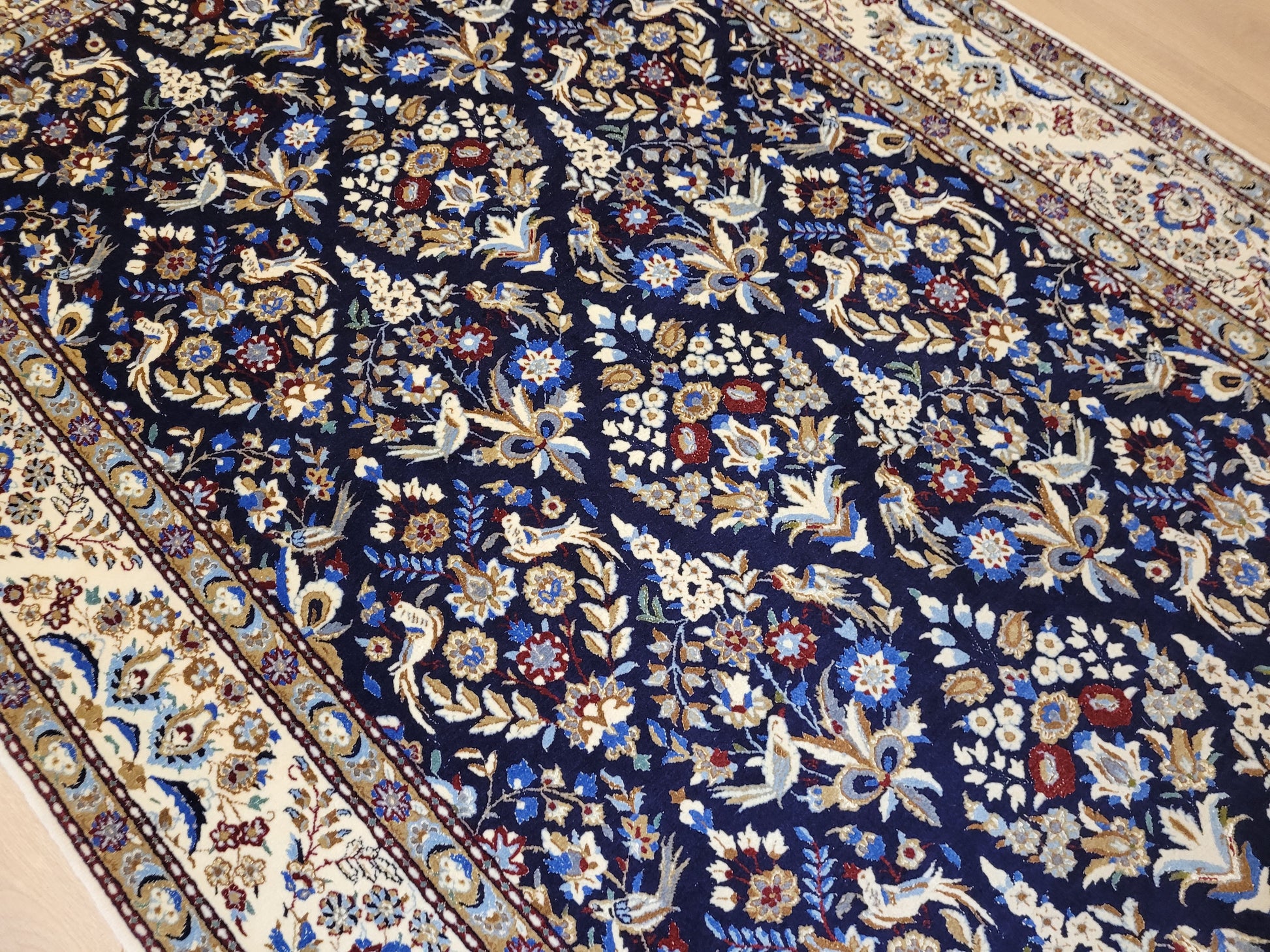 angeboten wird ein prachtvoller Nain Teppich aus feinster Korkwolle mit eingearbeiteter Seide. Dieses Meisterwerk der Knüpfkunst beeindruckt durch sein reich verziertes Felddesign mit floralen Ranken, Blüten und Vogelmotiven, die kunstvoll auf dunkelblauem Grund arrangiert sind. Die Seideneinsätze sorgen für schimmernde Akzente und verleihen dem Teppich eine elegante Tiefe.