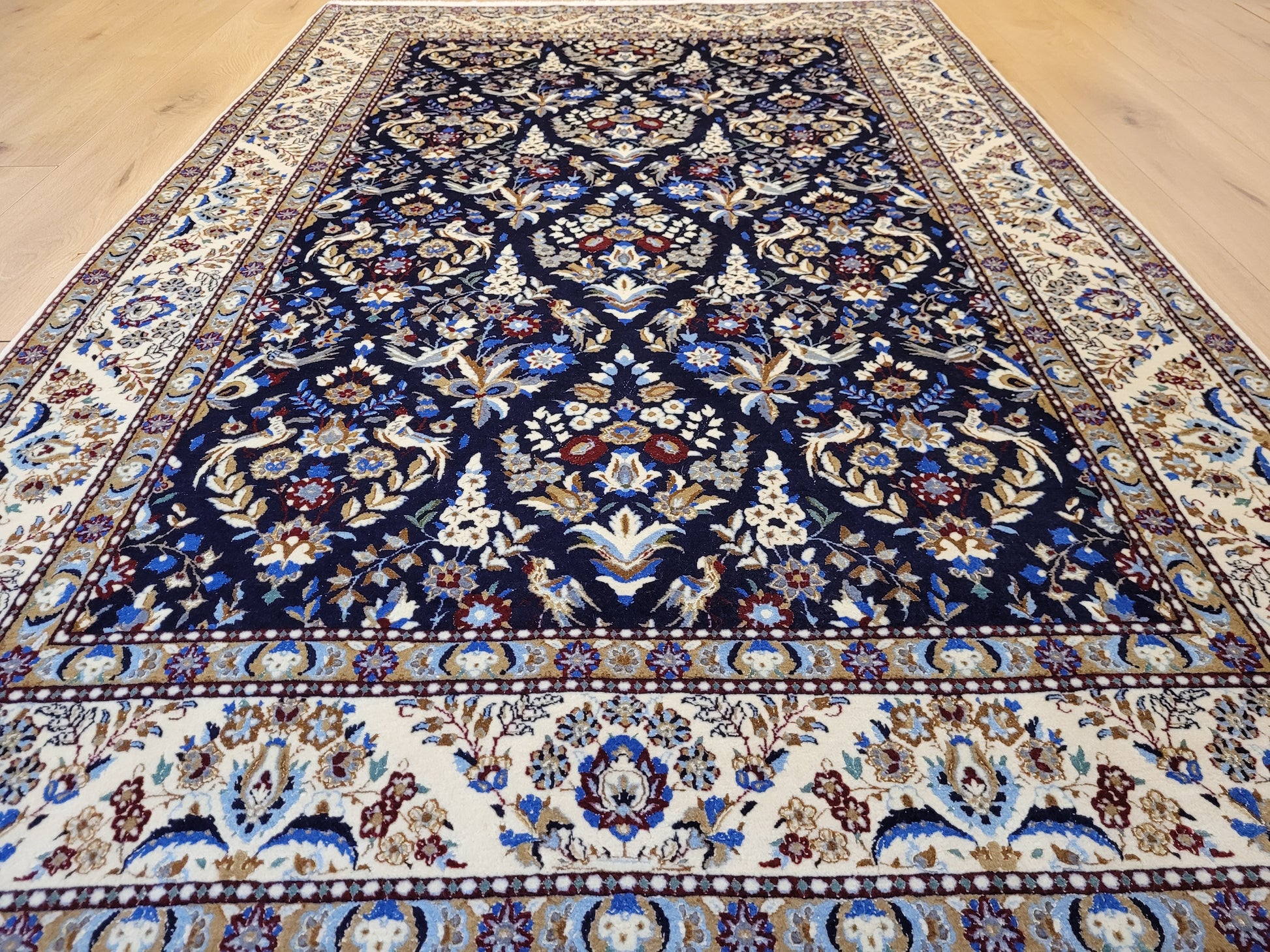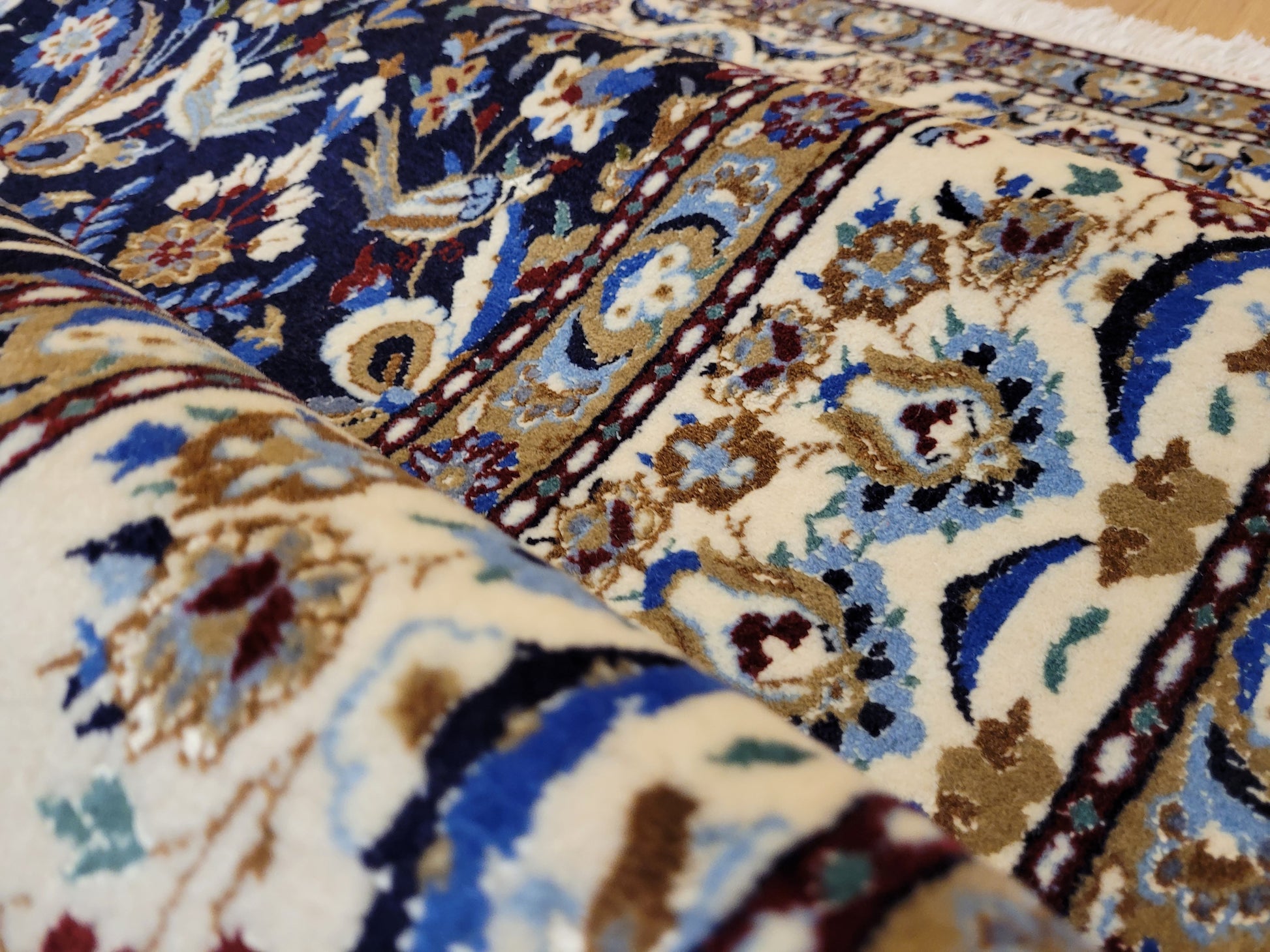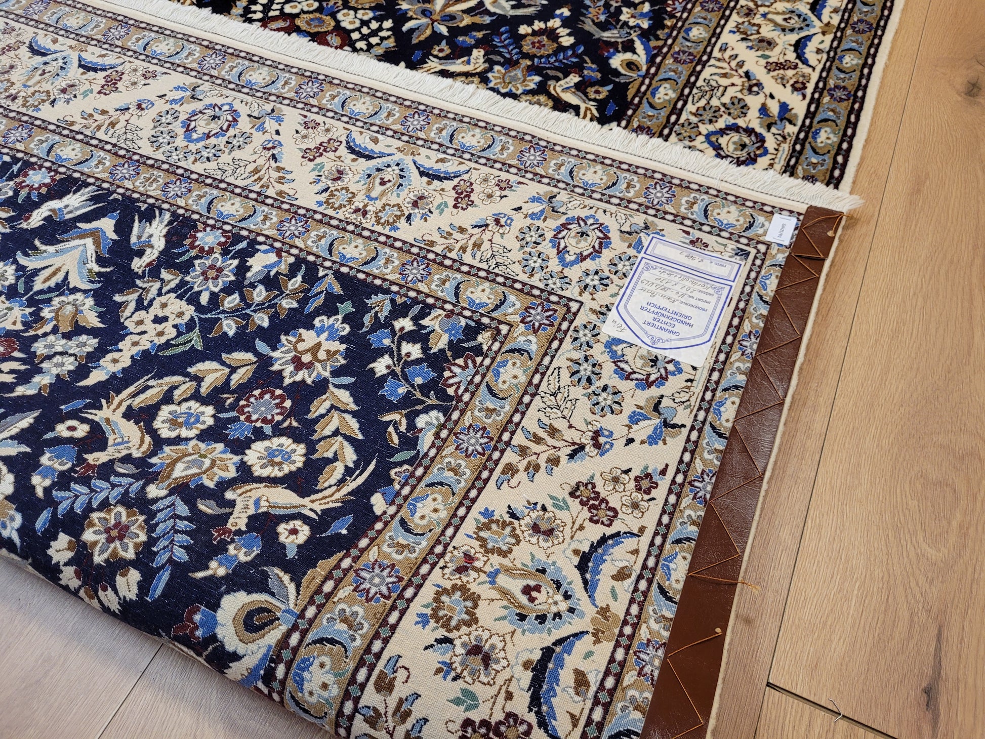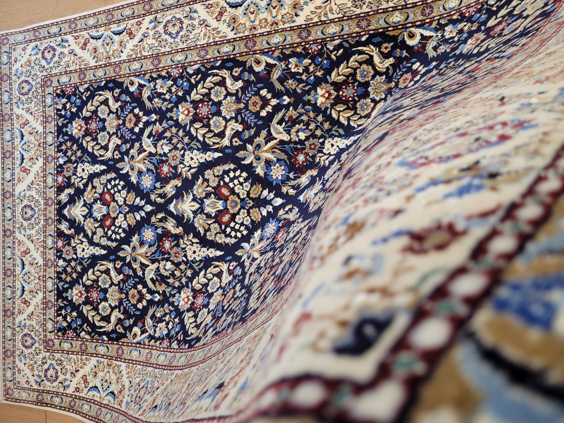 angeboten wird ein prachtvoller Nain Teppich aus feinster Korkwolle mit eingearbeiteter Seide. Dieses Meisterwerk der Knüpfkunst beeindruckt durch sein reich verziertes Felddesign mit floralen Ranken, Blüten und Vogelmotiven, die kunstvoll auf dunkelblauem Grund arrangiert sind. Die Seideneinsätze sorgen für schimmernde Akzente und verleihen dem Teppich eine elegante Tiefe.