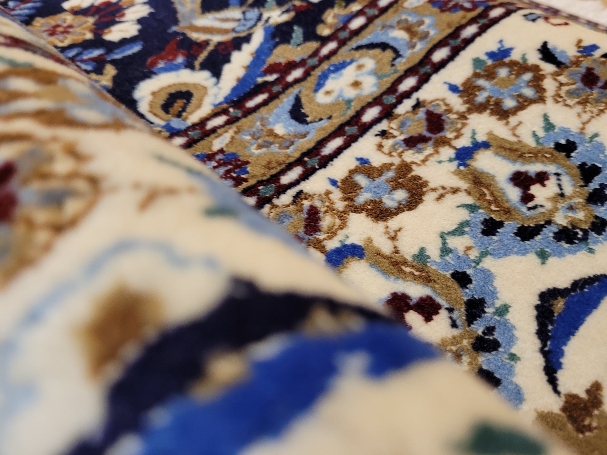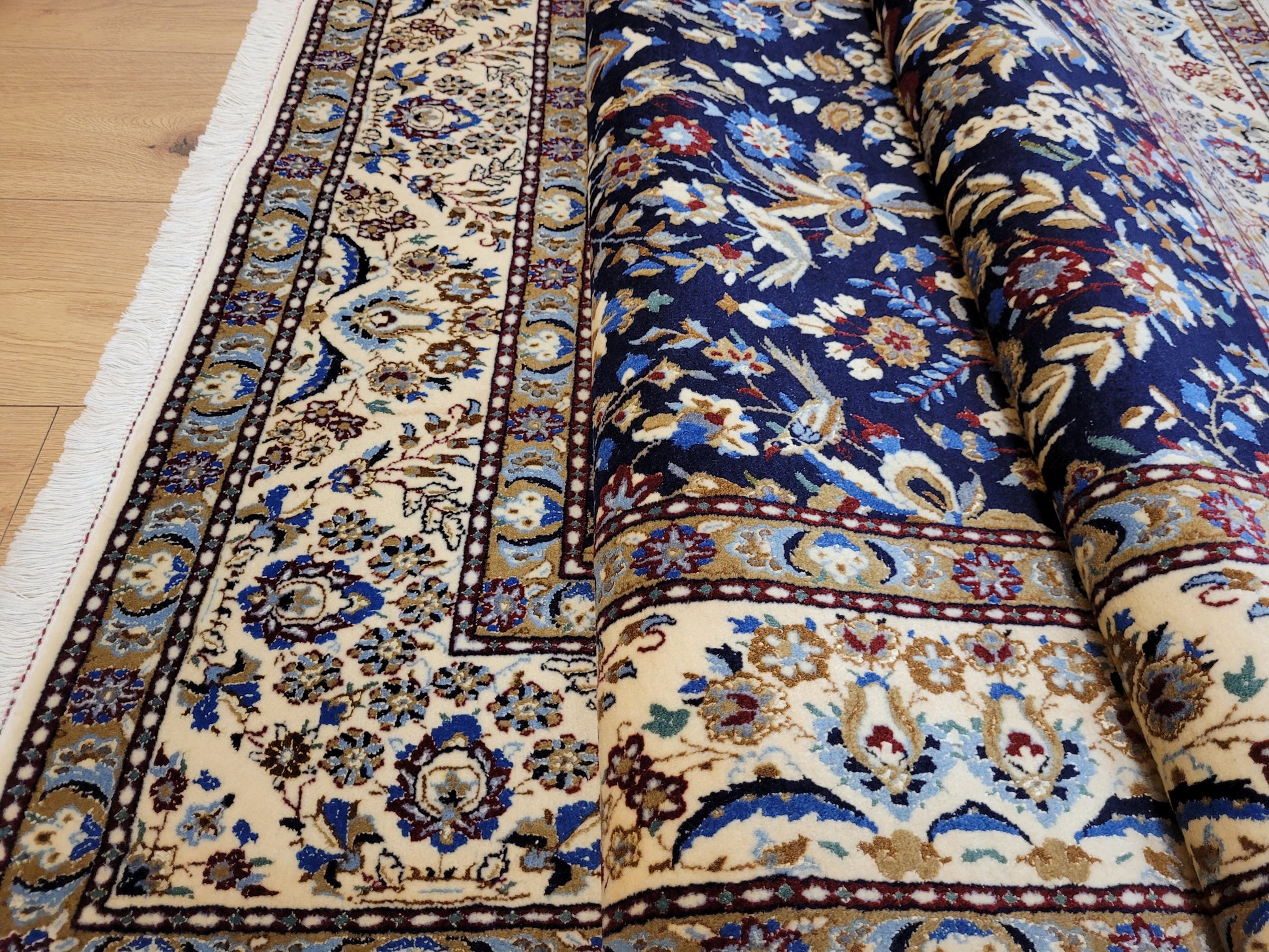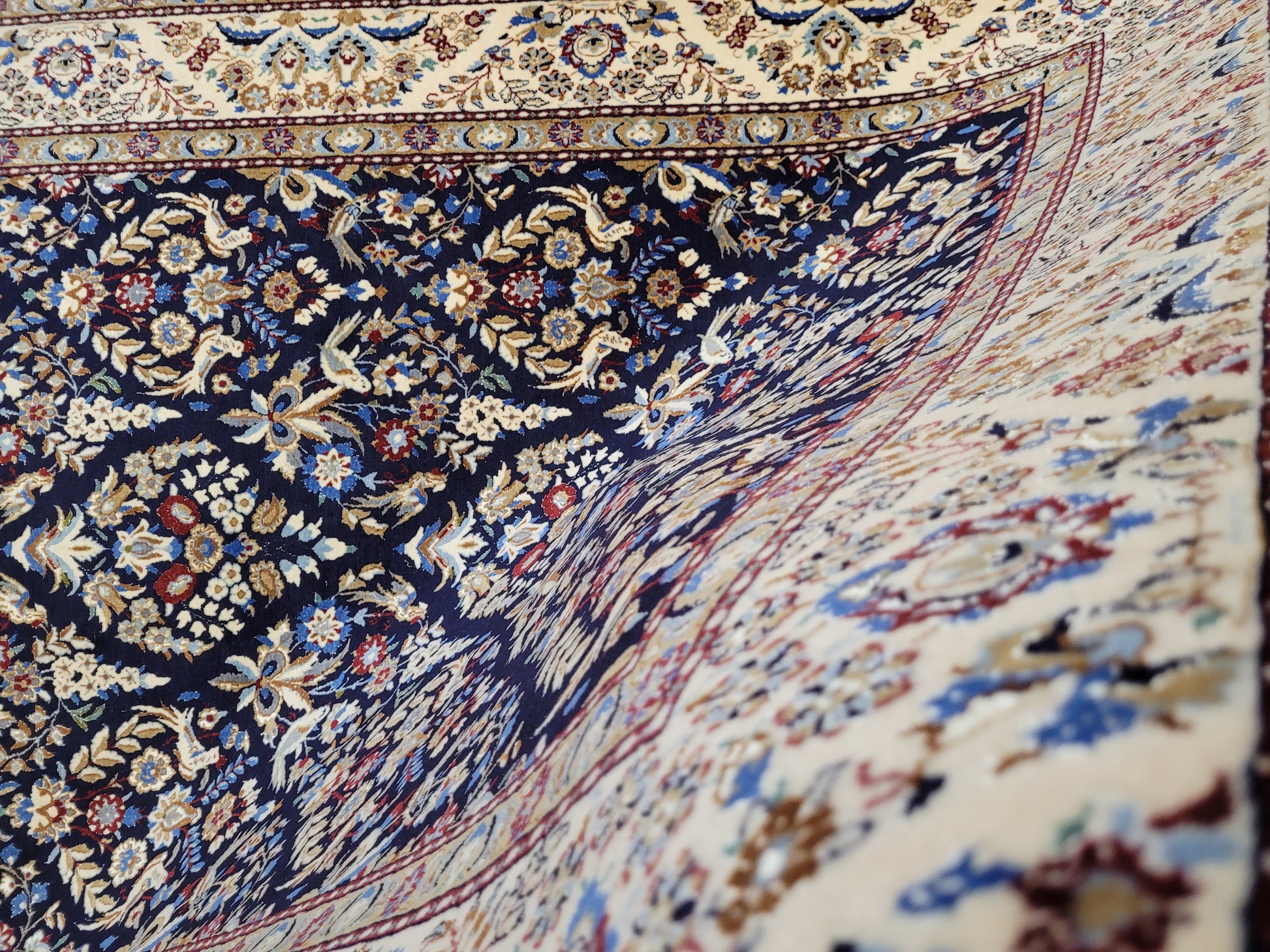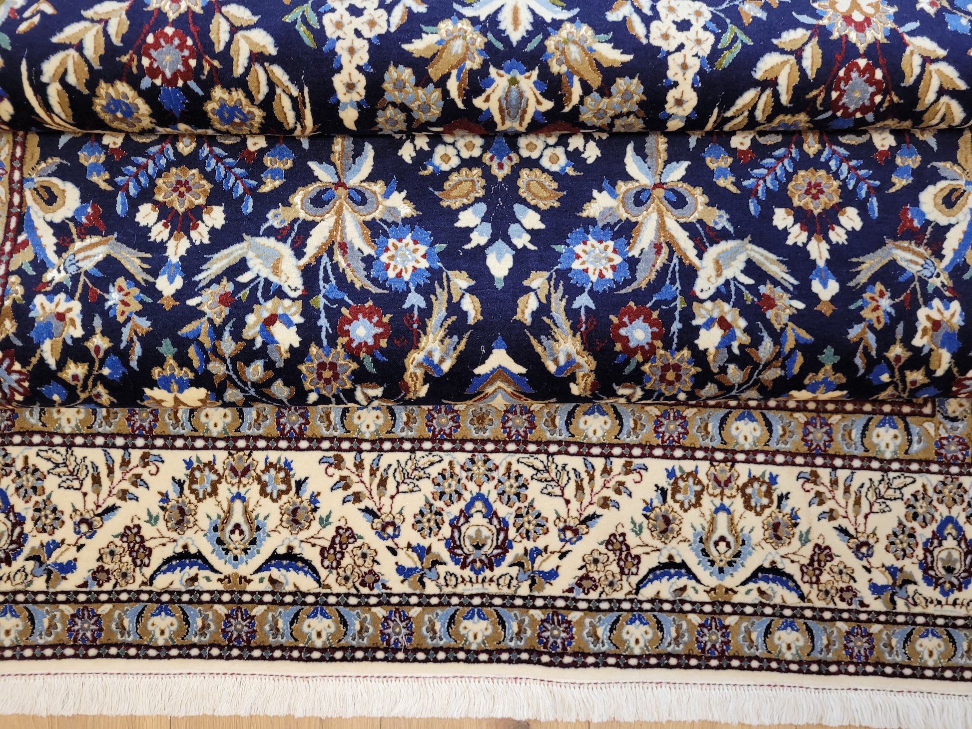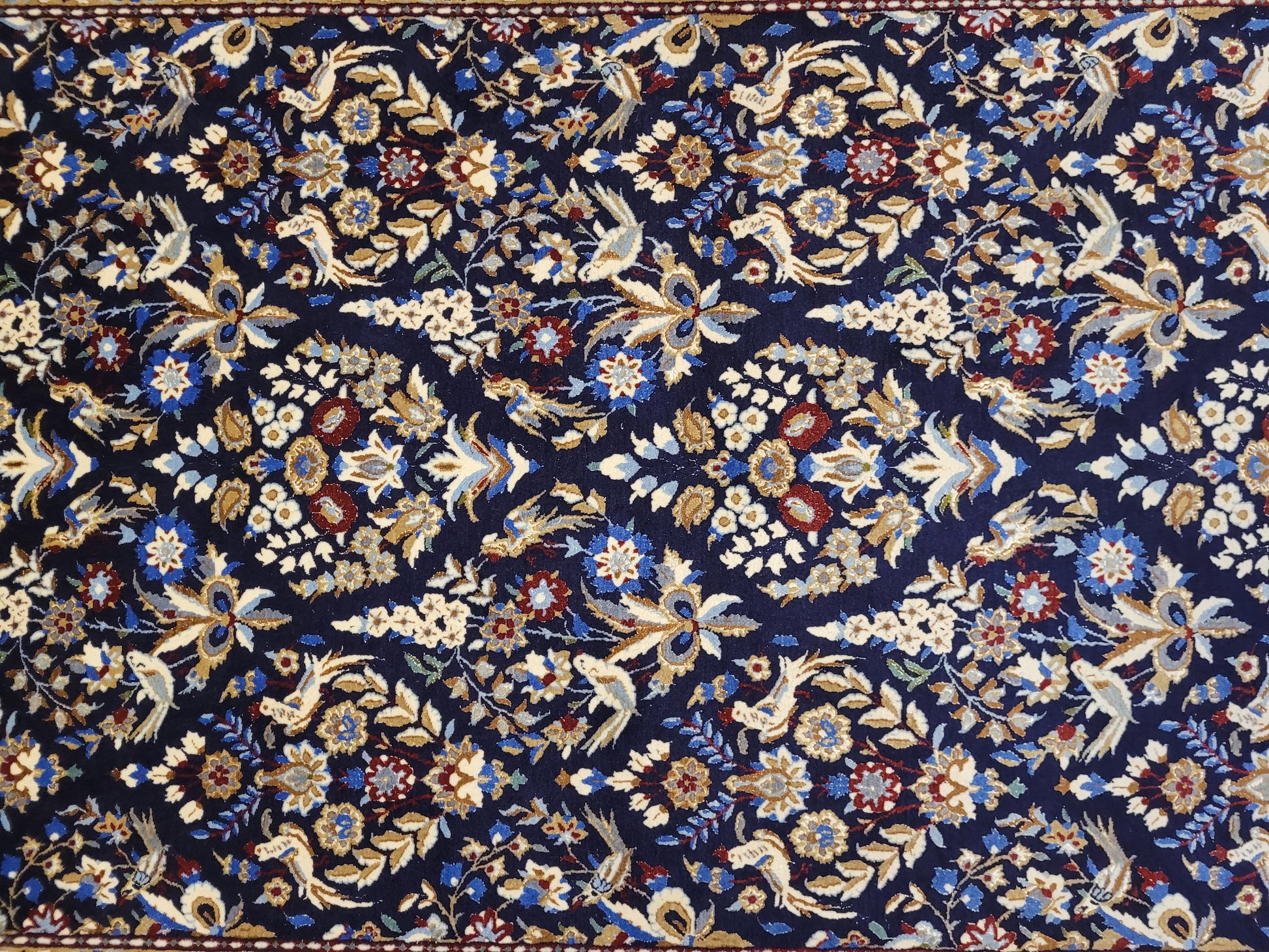 angeboten wird ein prachtvoller Nain Teppich aus feinster Korkwolle mit eingearbeiteter Seide. Dieses Meisterwerk der Knüpfkunst beeindruckt durch sein reich verziertes Felddesign mit floralen Ranken, Blüten und Vogelmotiven, die kunstvoll auf dunkelblauem Grund arrangiert sind. Die Seideneinsätze sorgen für schimmernde Akzente und verleihen dem Teppich eine elegante Tiefe.