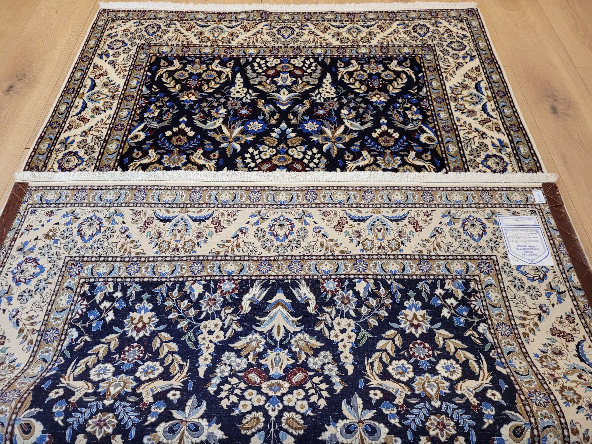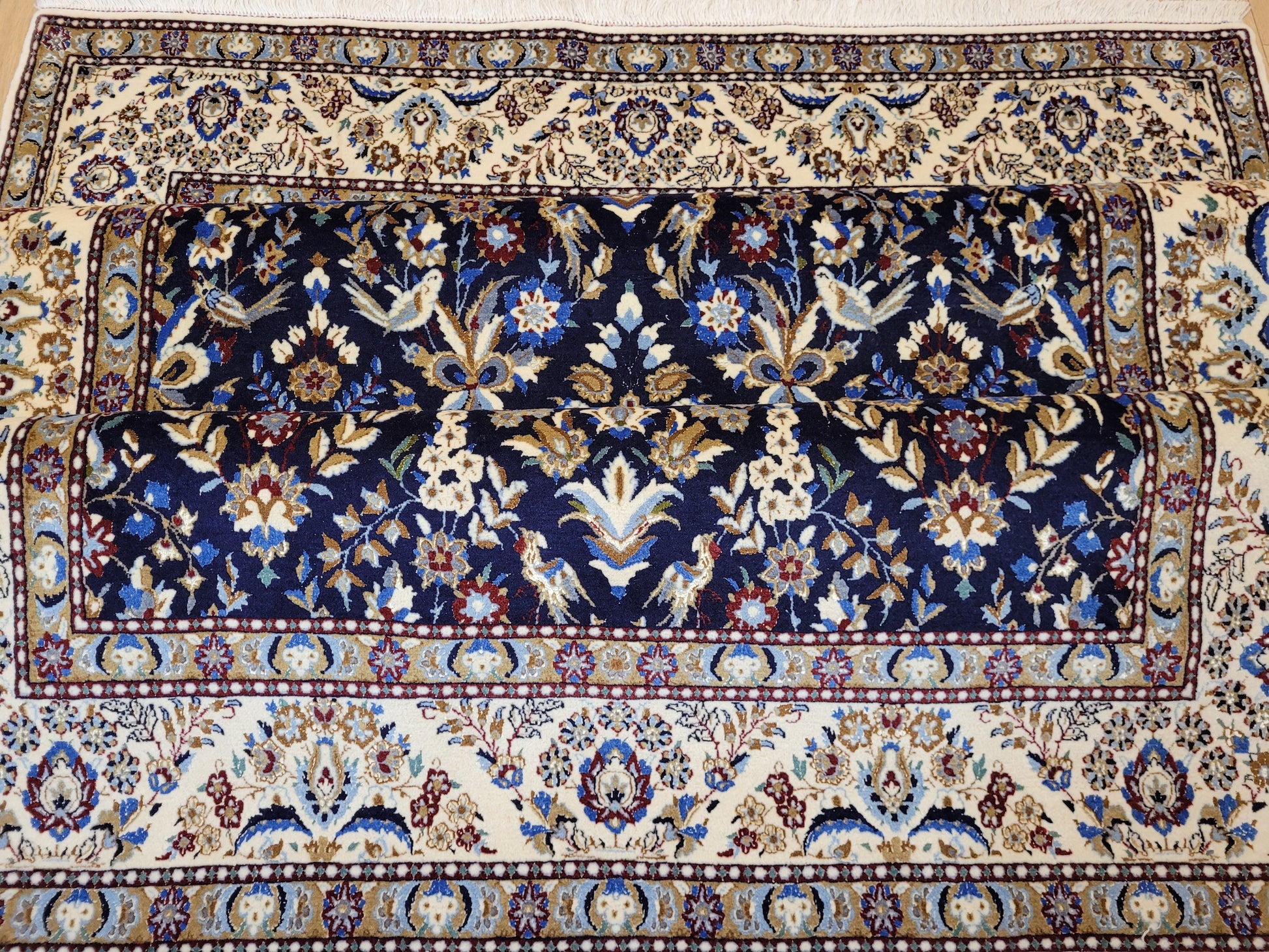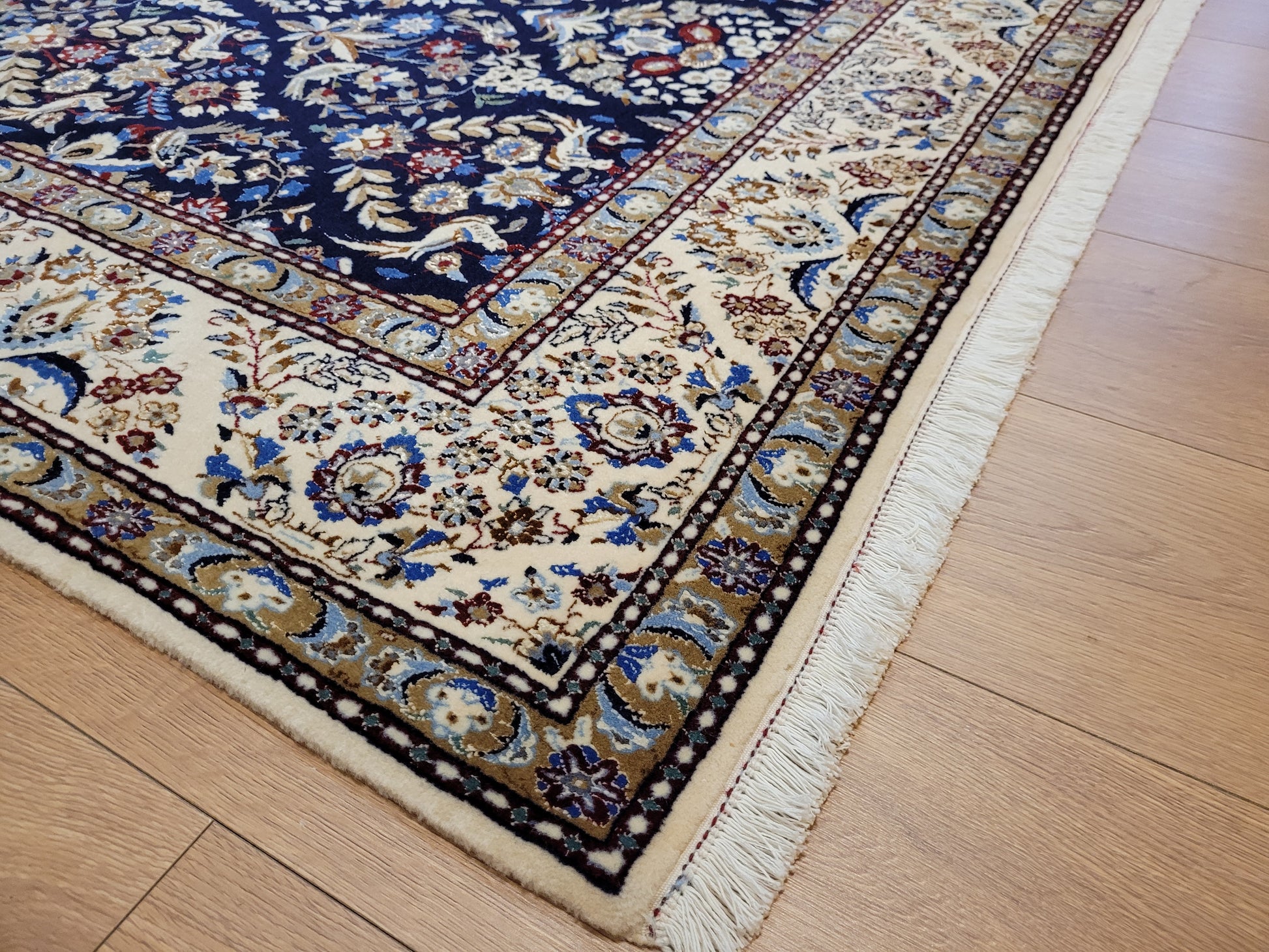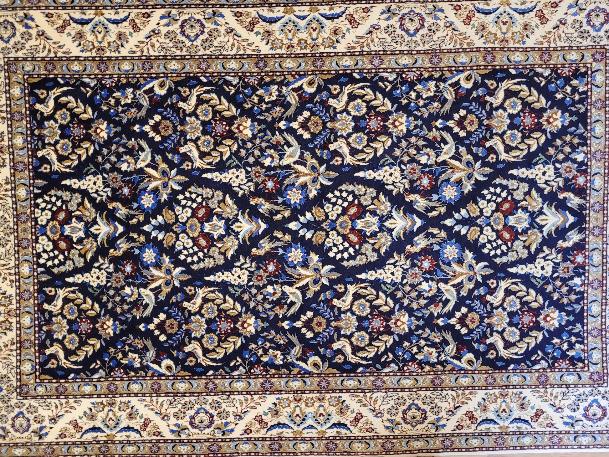 angeboten wird ein prachtvoller Nain Teppich aus feinster Korkwolle mit eingearbeiteter Seide. Dieses Meisterwerk der Knüpfkunst beeindruckt durch sein reich verziertes Felddesign mit floralen Ranken, Blüten und Vogelmotiven, die kunstvoll auf dunkelblauem Grund arrangiert sind. Die Seideneinsätze sorgen für schimmernde Akzente und verleihen dem Teppich eine elegante Tiefe.
