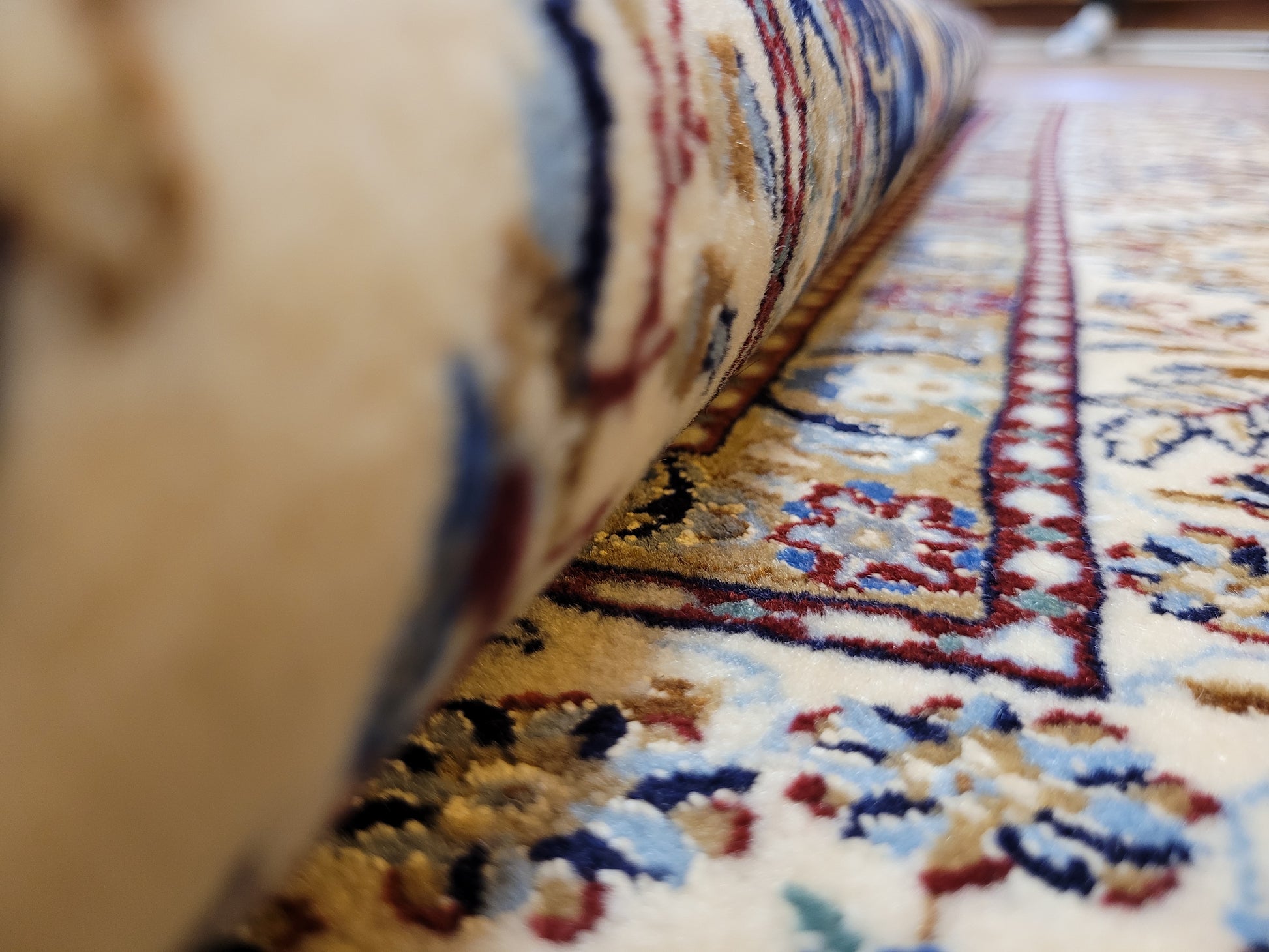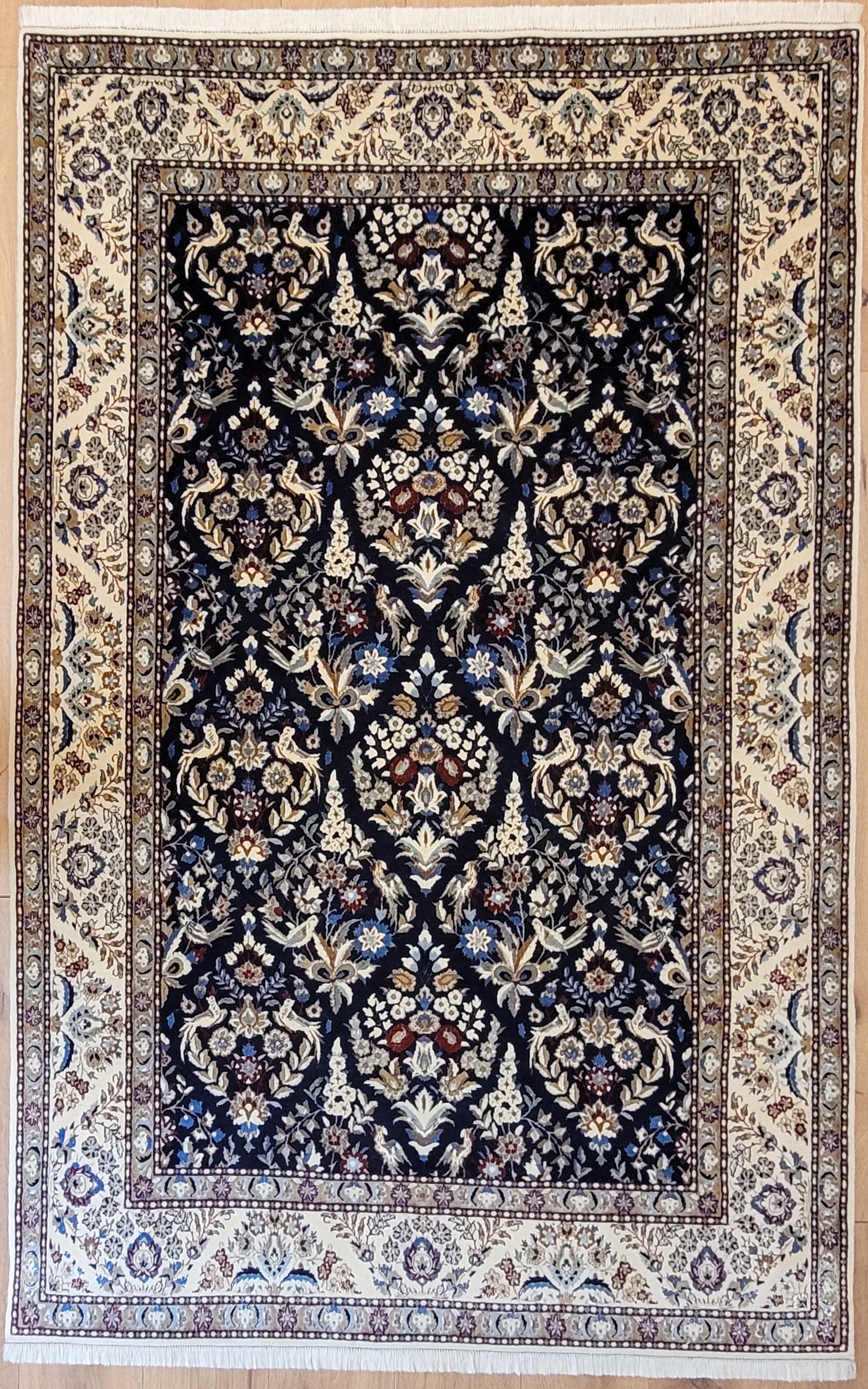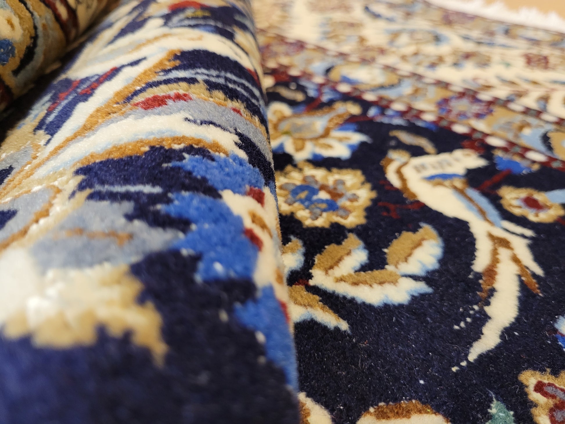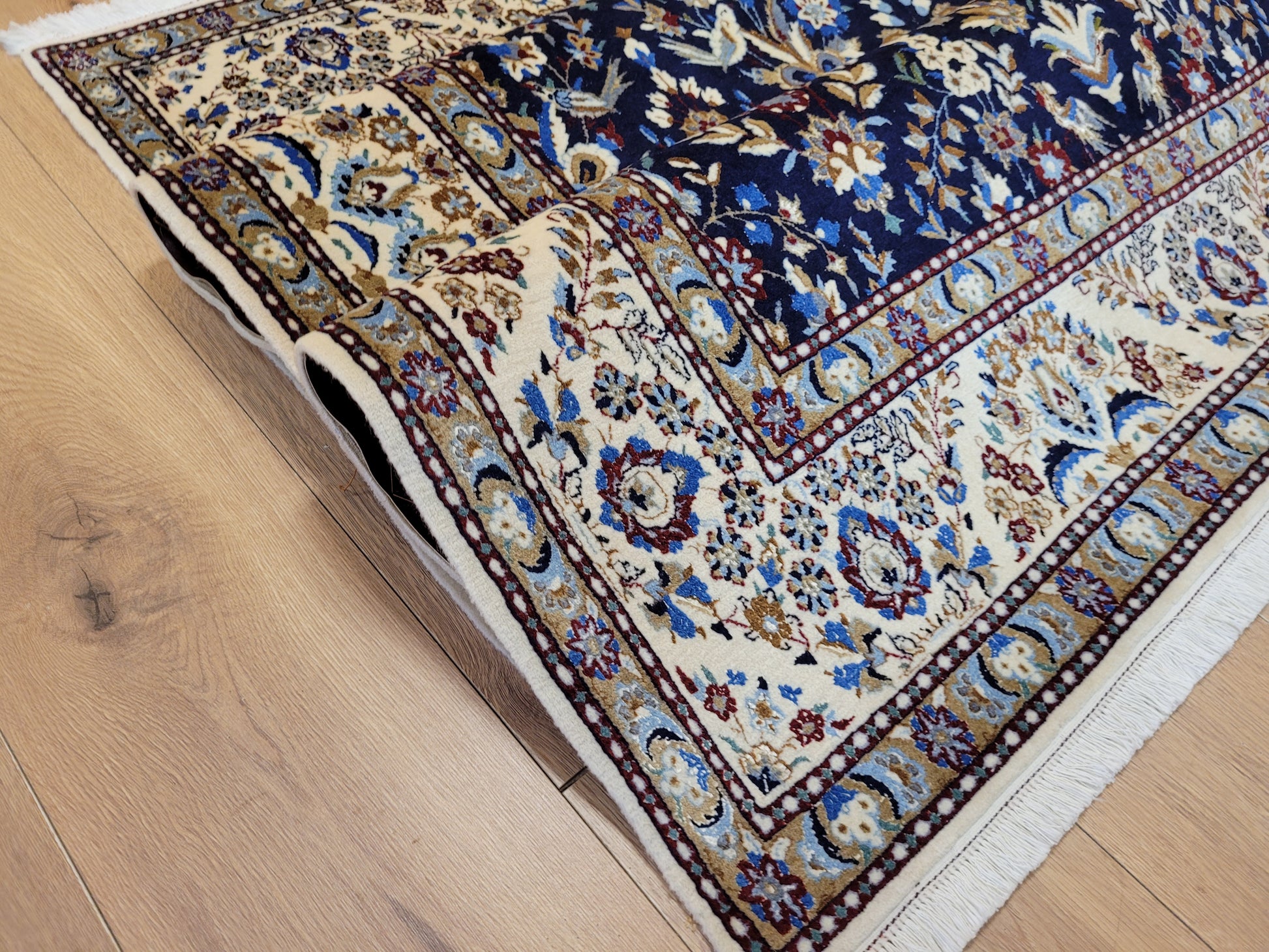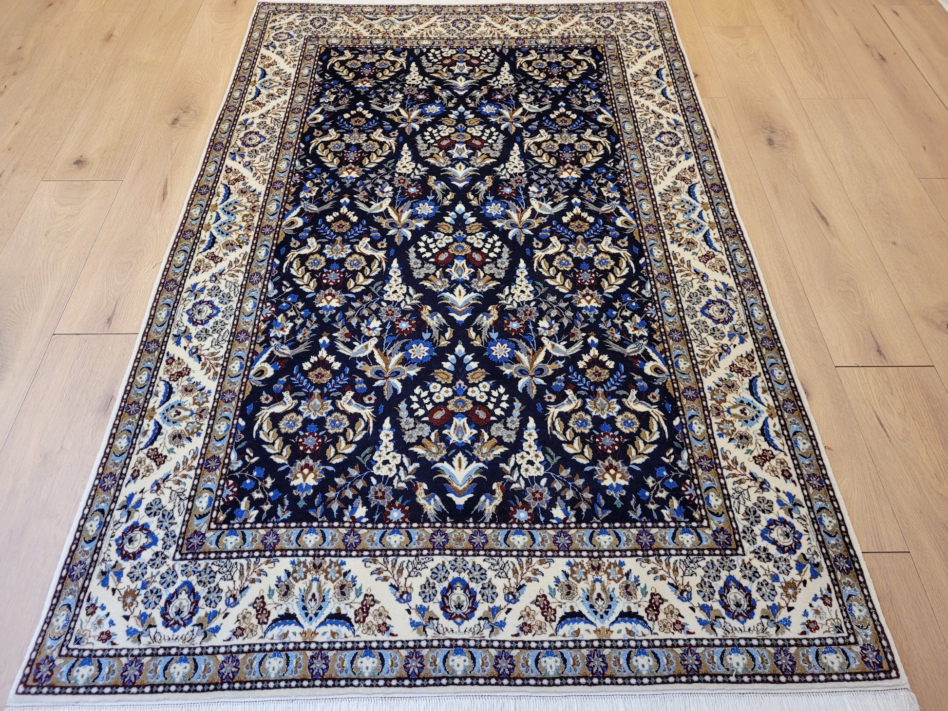 angeboten wird ein prachtvoller Nain Teppich aus feinster Korkwolle mit eingearbeiteter Seide. Dieses Meisterwerk der Knüpfkunst beeindruckt durch sein reich verziertes Felddesign mit floralen Ranken, Blüten und Vogelmotiven, die kunstvoll auf dunkelblauem Grund arrangiert sind. Die Seideneinsätze sorgen für schimmernde Akzente und verleihen dem Teppich eine elegante Tiefe.