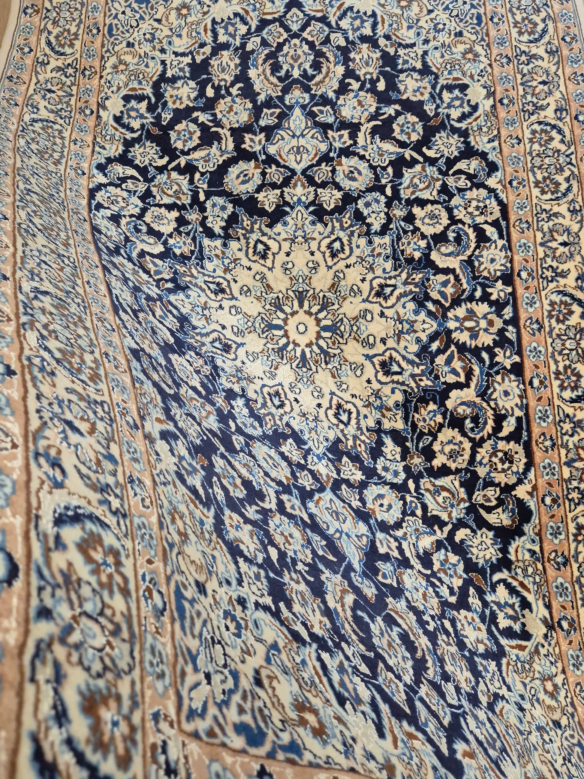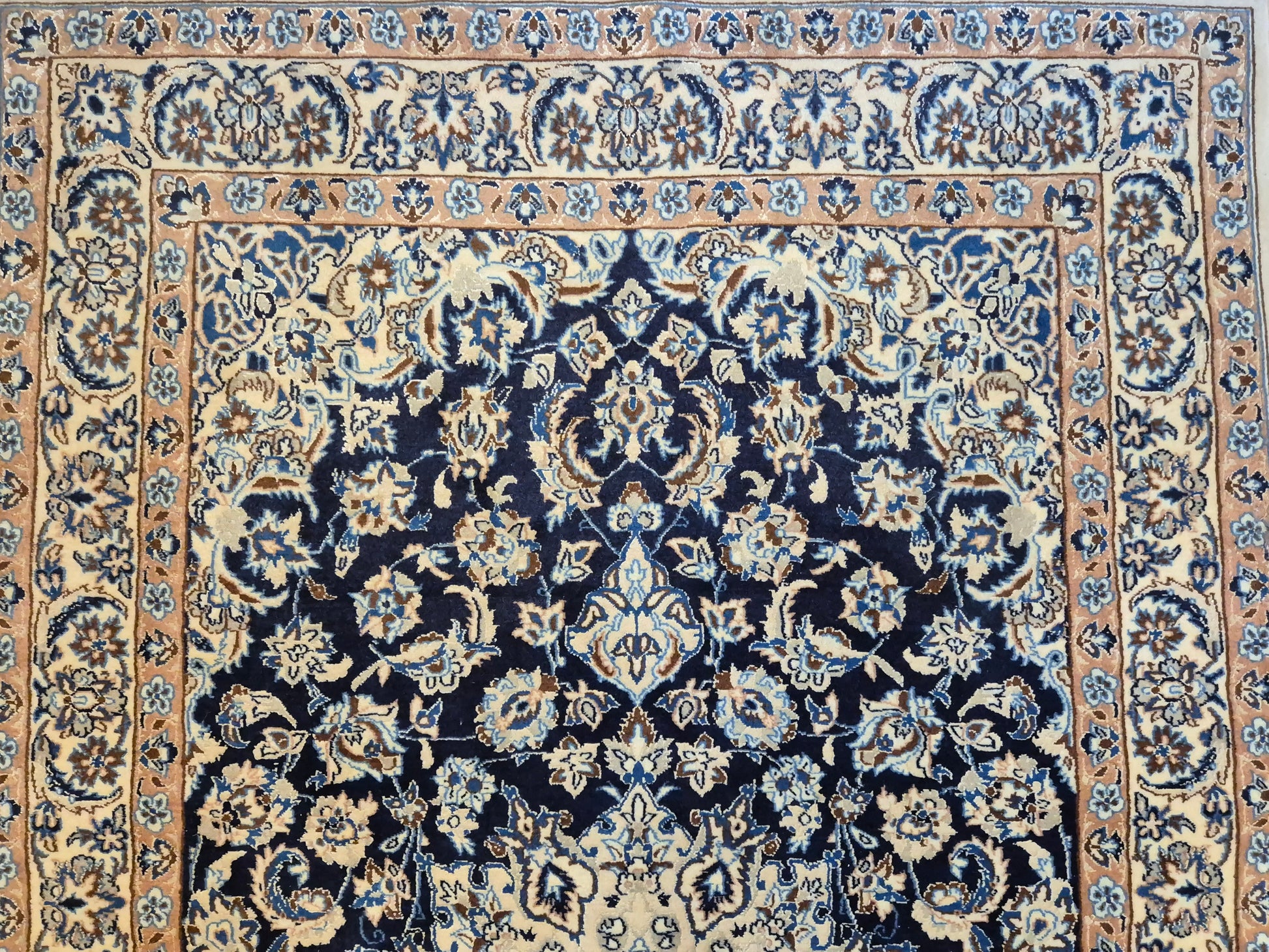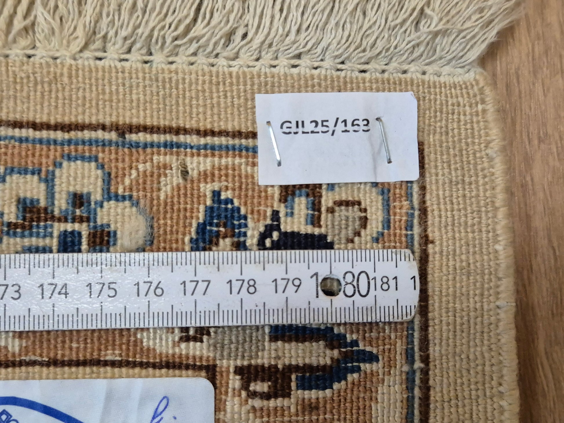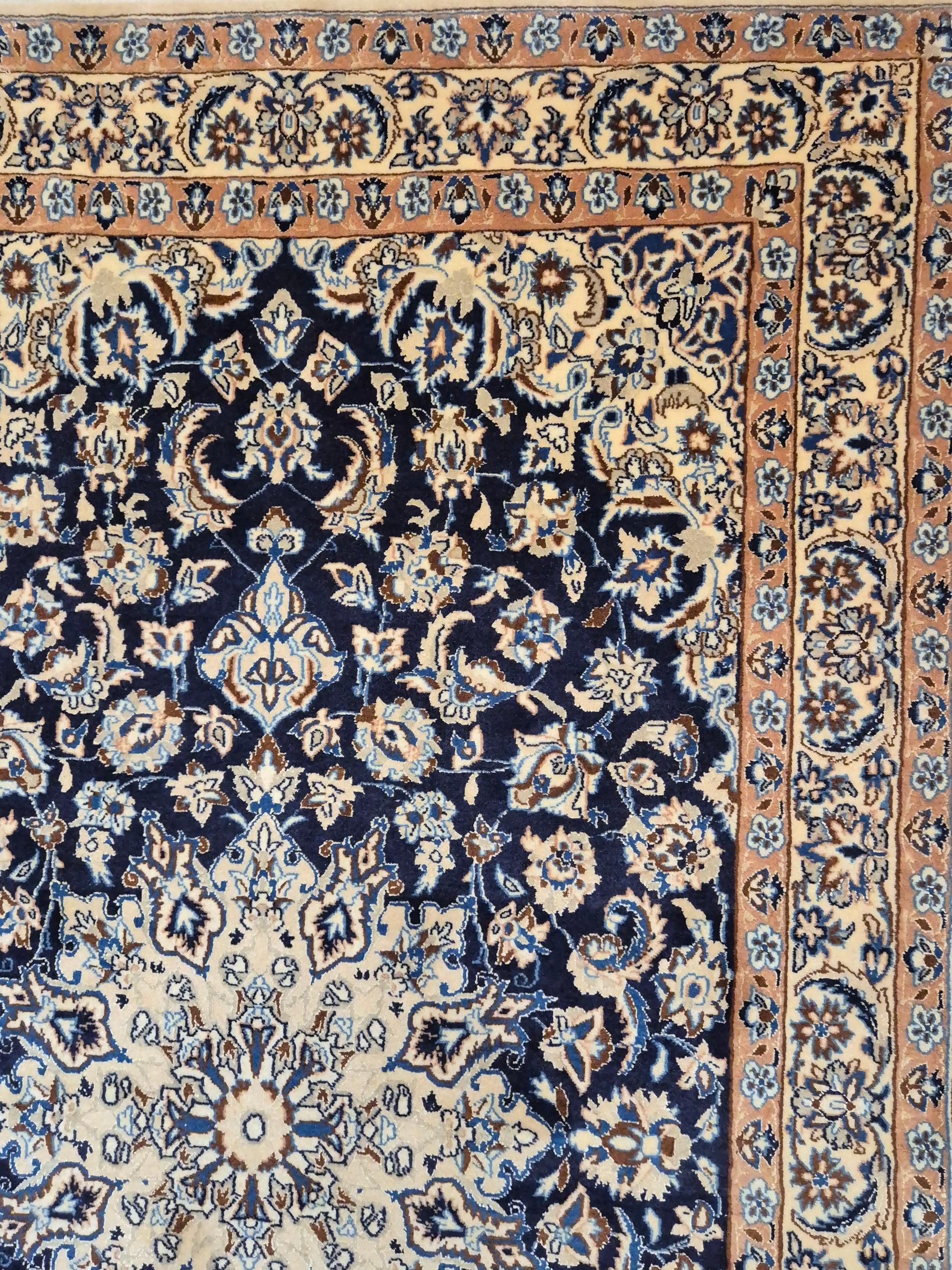 angeboten wird ein erlesener Nain Teppich aus Korkwolle mit Seide, handgeknüpft in feiner Knüpftechnik. Im Zentrum befindet sich ein strahlendes Medaillon, das von geschwungenen floralen Ornamenten und Rankenmustern umgeben ist. Seidenakzente verleihen den Details besonderen Glanz und unterstreichen die elegante Wirkung dieses klassischen Teppichs.