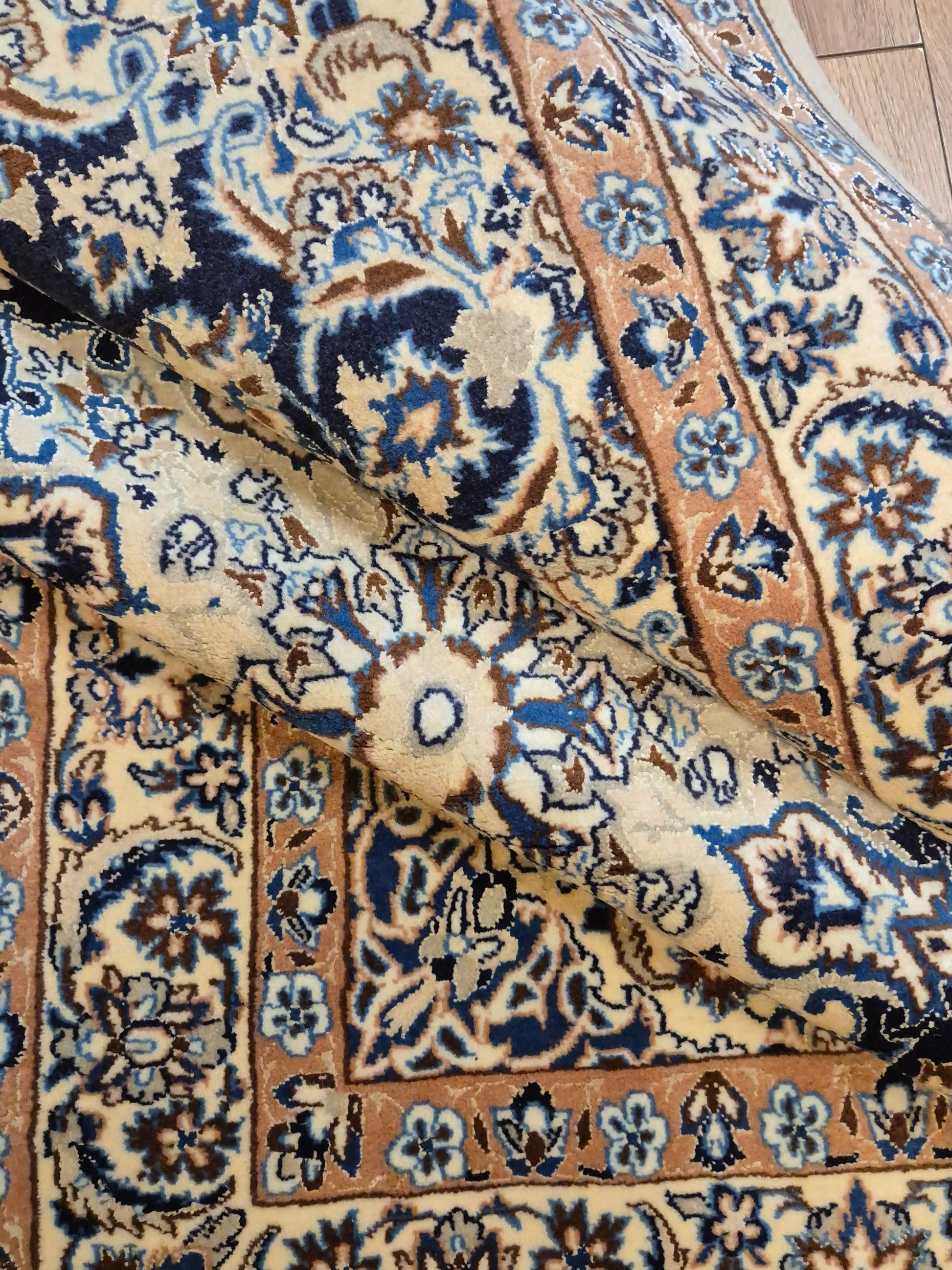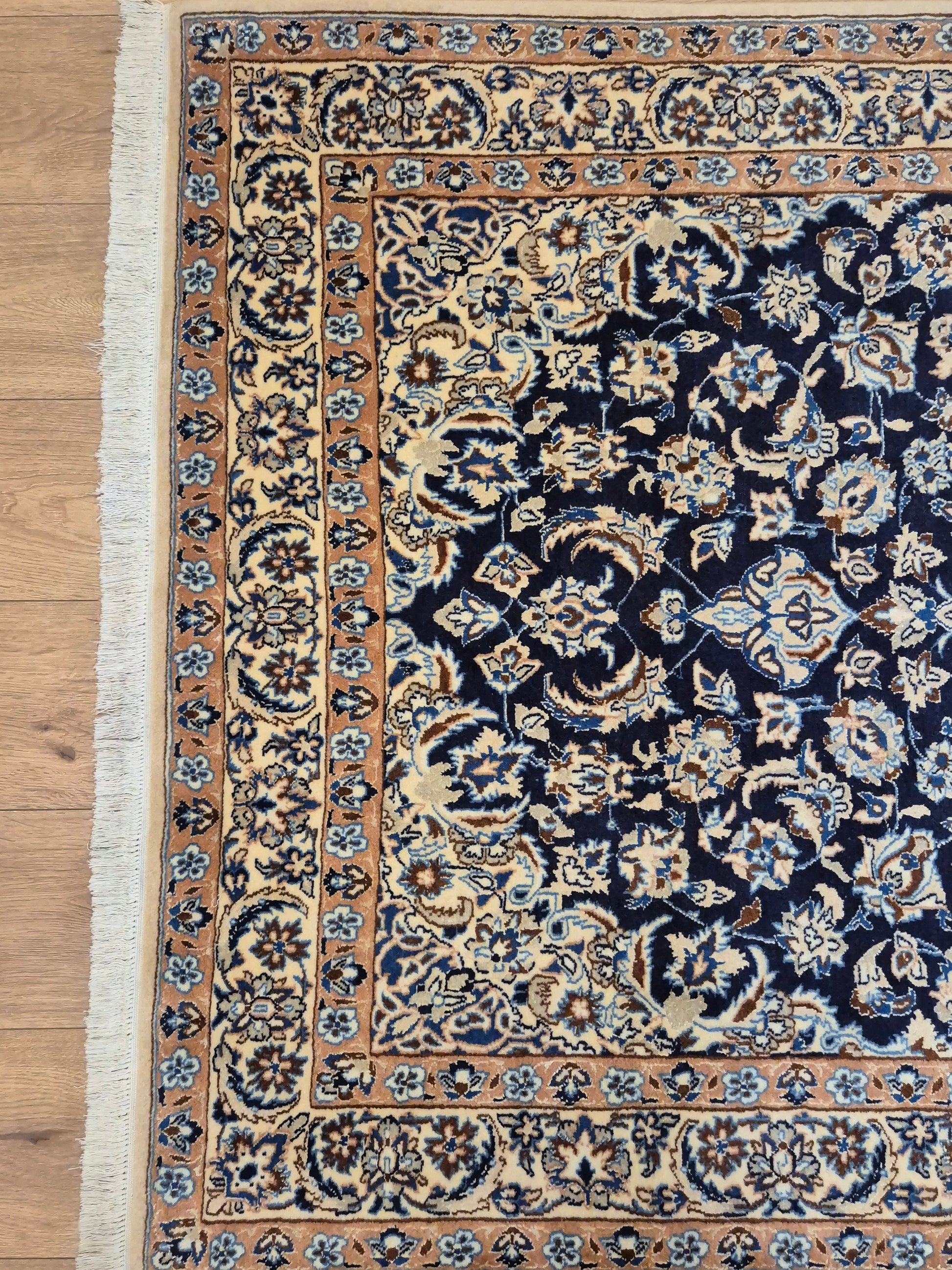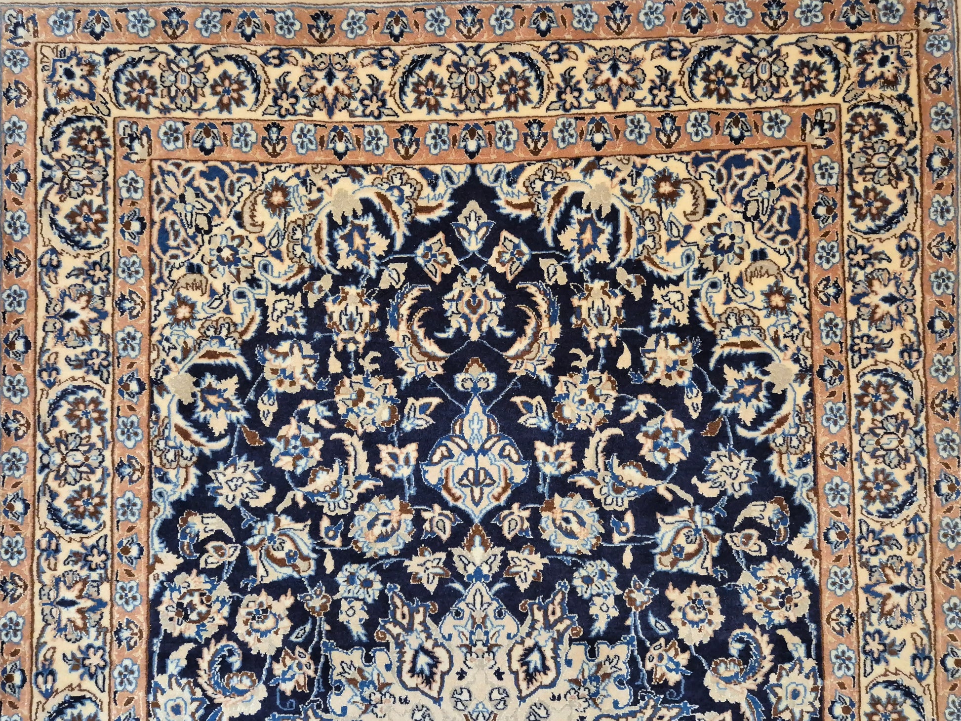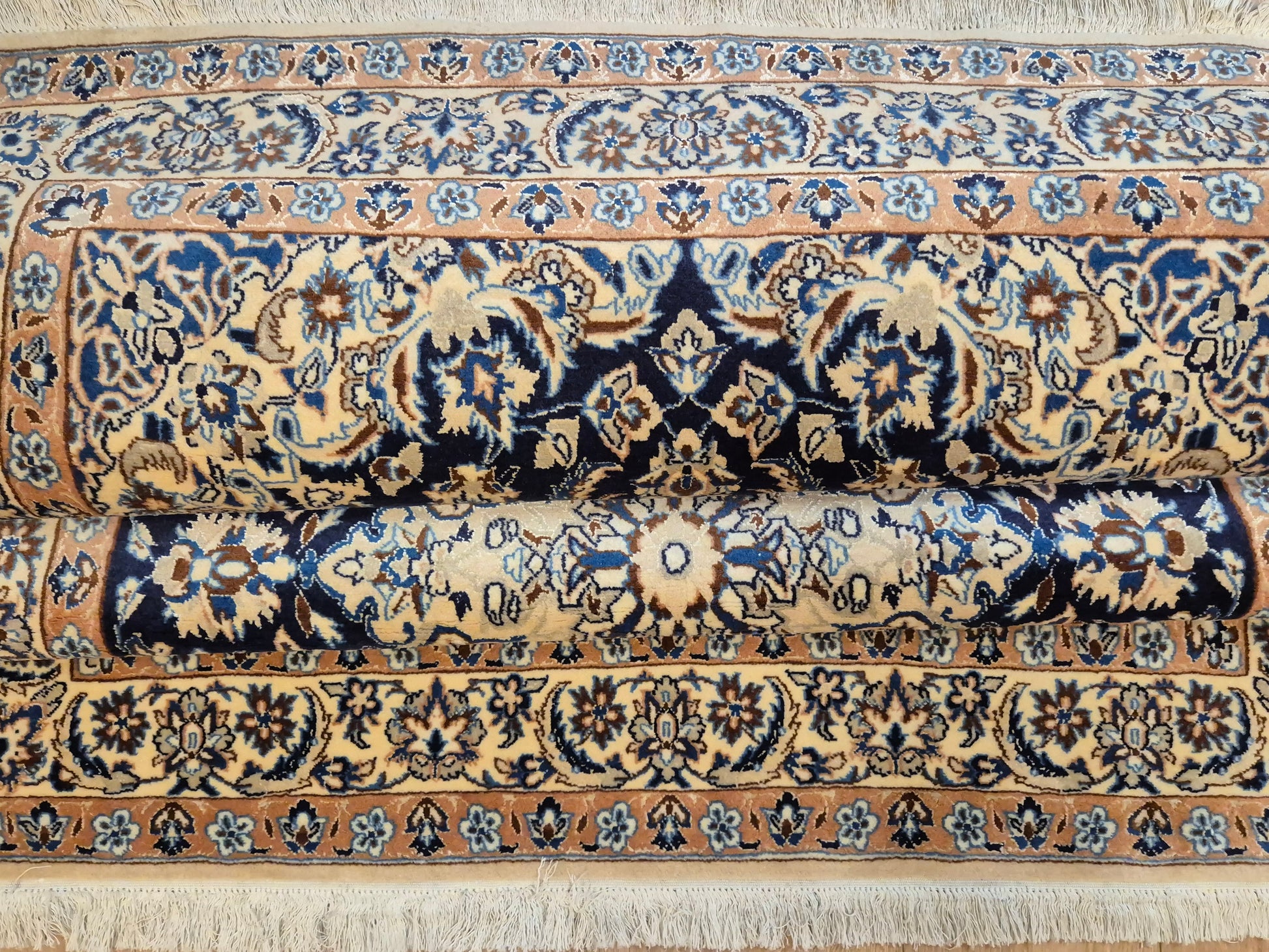 angeboten wird ein erlesener Nain Teppich aus Korkwolle mit Seide, handgeknüpft in feiner Knüpftechnik. Im Zentrum befindet sich ein strahlendes Medaillon, das von geschwungenen floralen Ornamenten und Rankenmustern umgeben ist. Seidenakzente verleihen den Details besonderen Glanz und unterstreichen die elegante Wirkung dieses klassischen Teppichs.