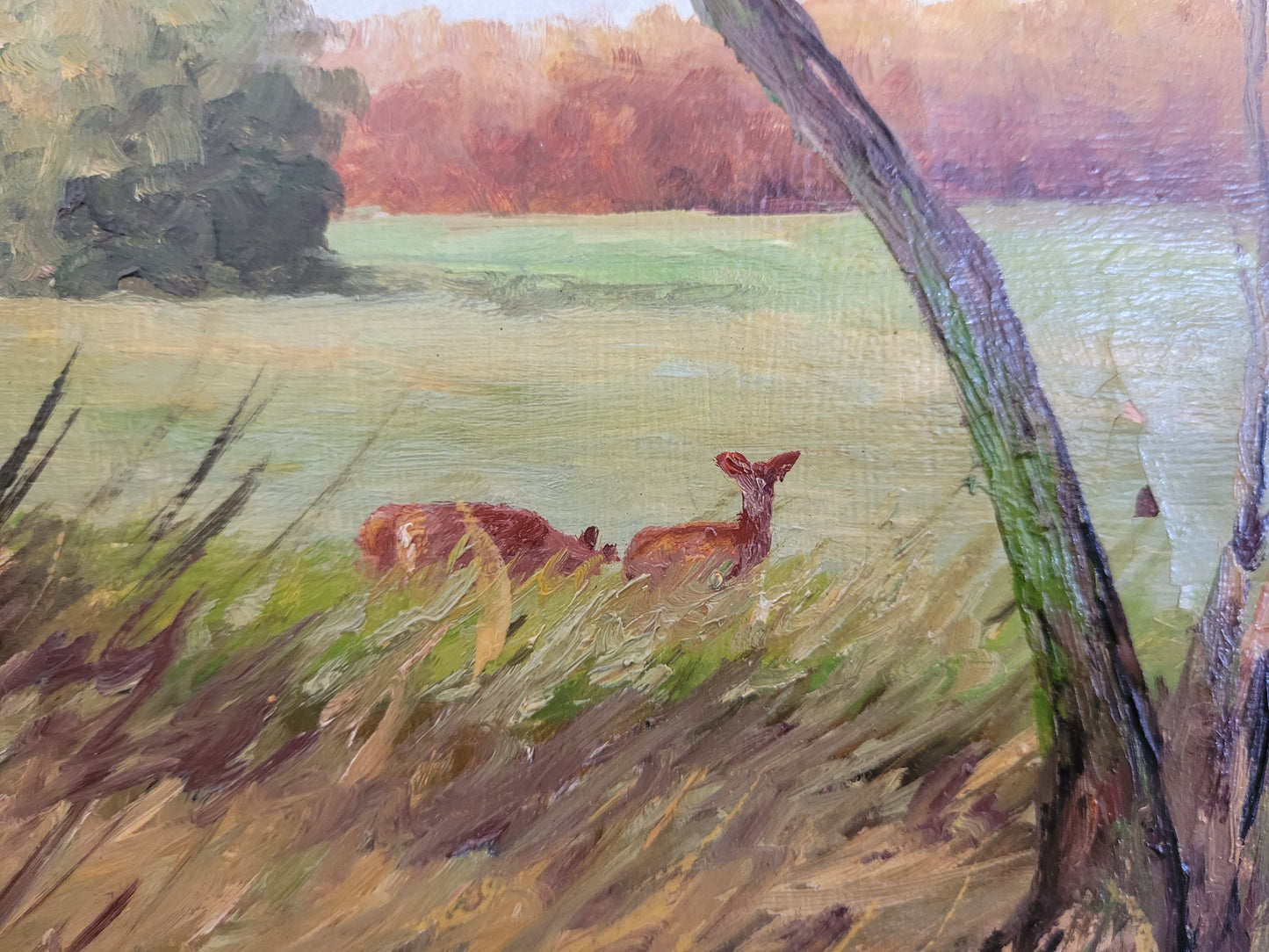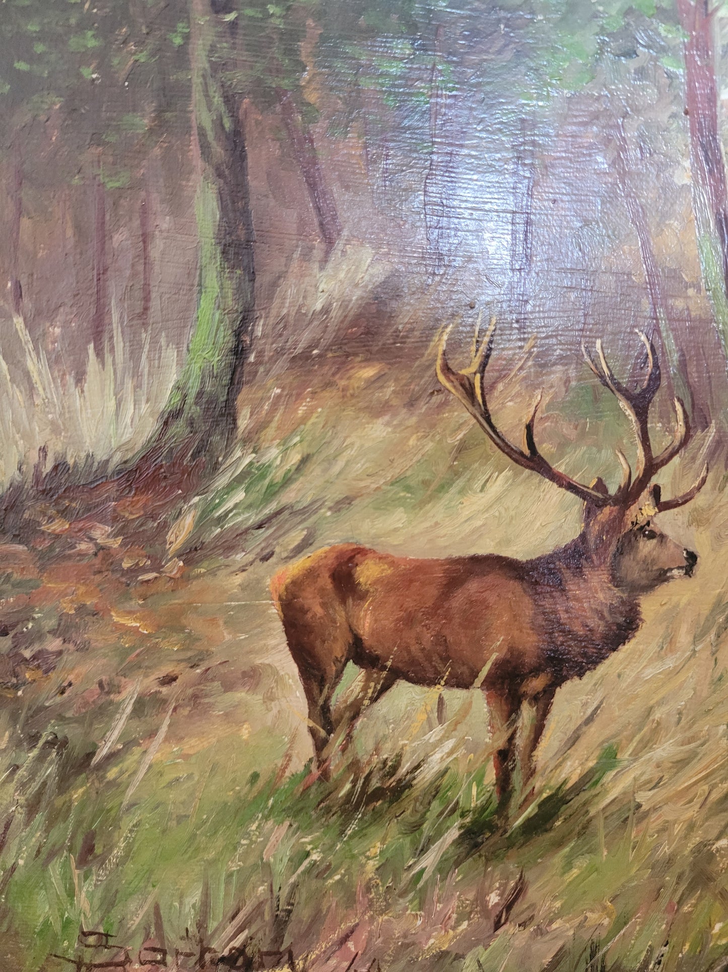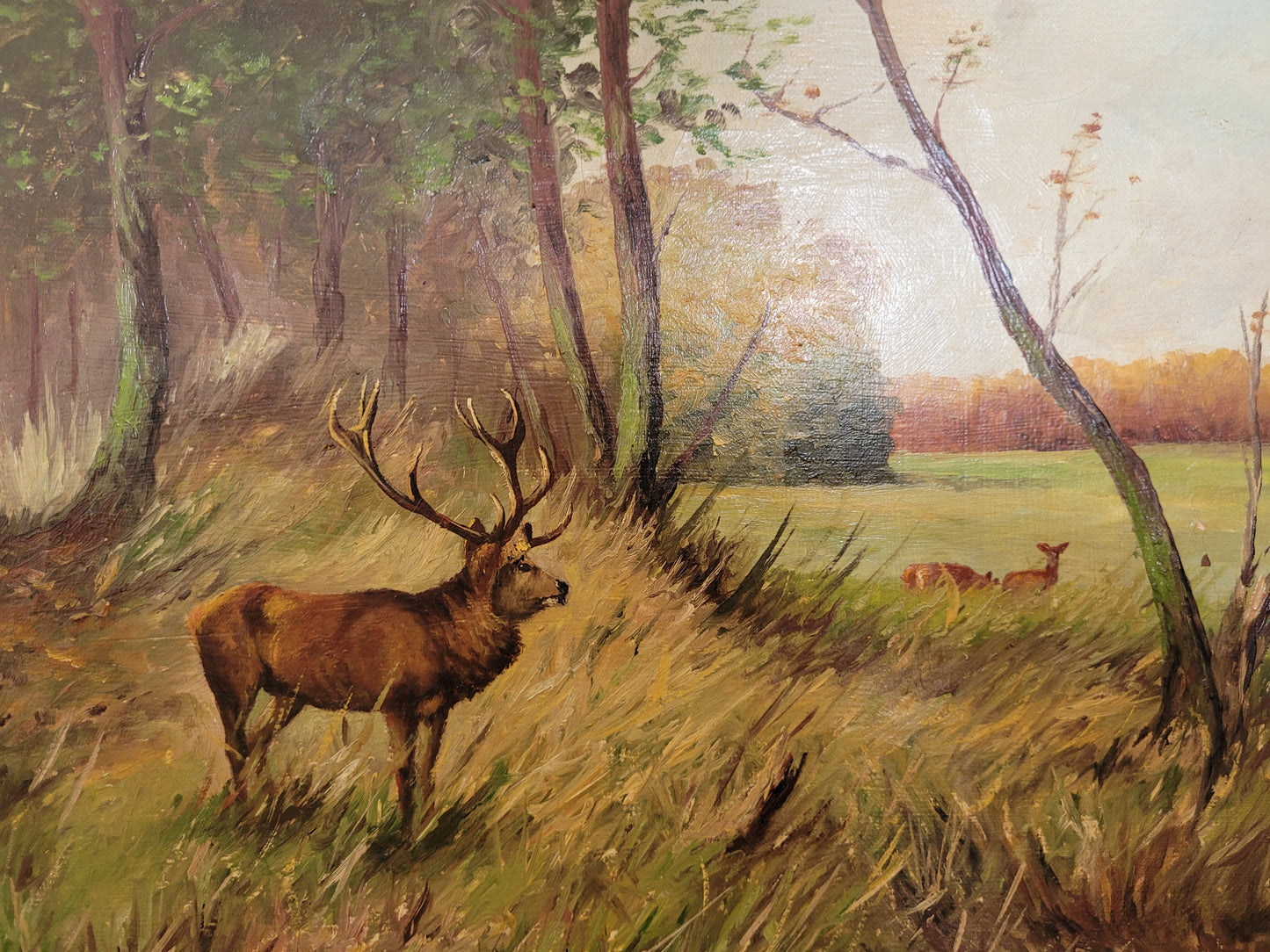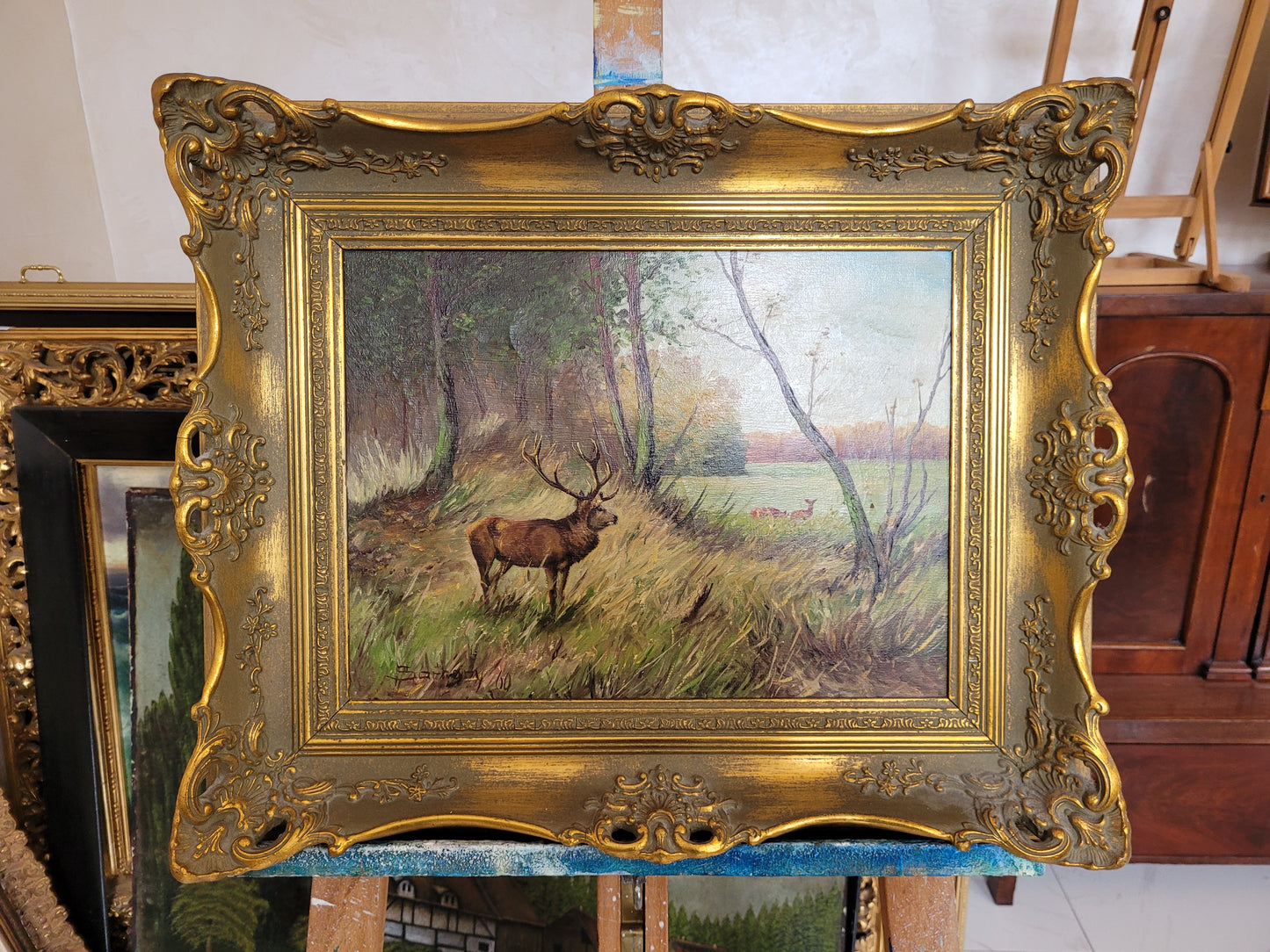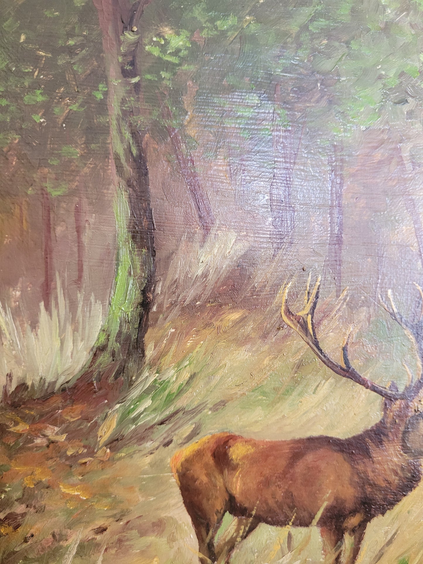 Europäische Schule (XX) Ölgemälde Waldlandschaft mit Hirsch