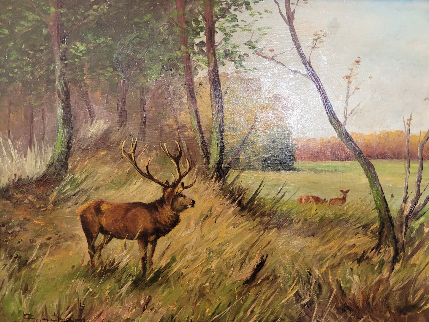 Beschreibung: Dieses bezaubernde Ölgemälde zeigt eine friedliche Landschaft, in der eine Herde Rentiere und ein majestätischer Elch inmitten einer weitläufigen, stillen Natur verweilen. Die Tiere stehen ruhig auf einer sanften, grünen Wiese, umgeben von dichtem Wald und offener Natur, die in harmonischen Farbtönen gehalten ist. Die Szenerie strahlt eine tiefe Ruhe und Gelassenheit aus, die den Betrachter in eine Welt unberührter Wildnis versetzt. Das Gemälde misst 30x40 cm mit Rahmen und 27x57 cm ohne Rahmen und befindet sich in einem sehr guten Zustand. Es ist ein eindrucksvolles Werk für jeden, der die Schönheit der Natur liebt. Der Zustand des Gemäldes ist sehr gut, wie auf den beigefügten Fotos zu sehen.